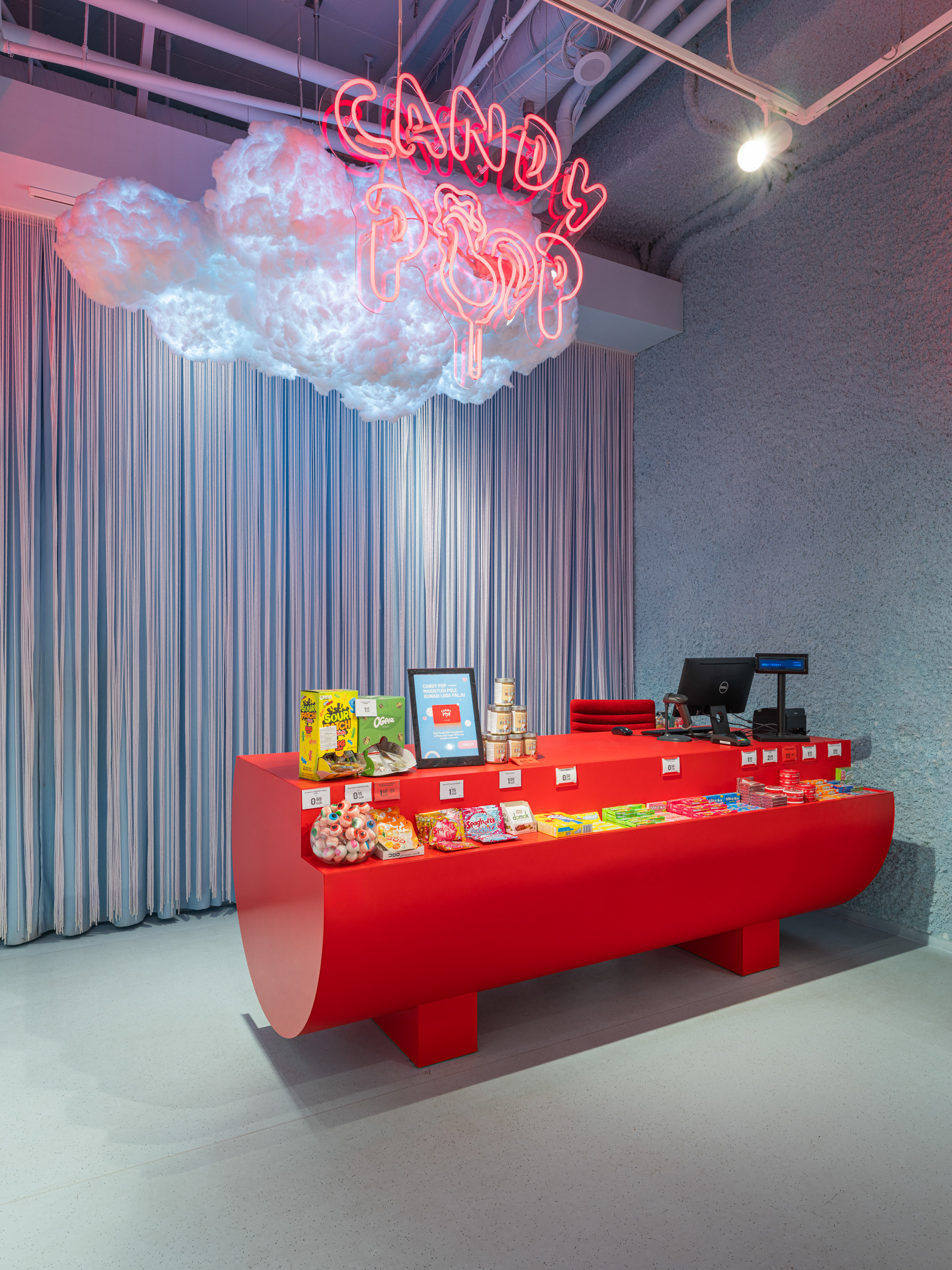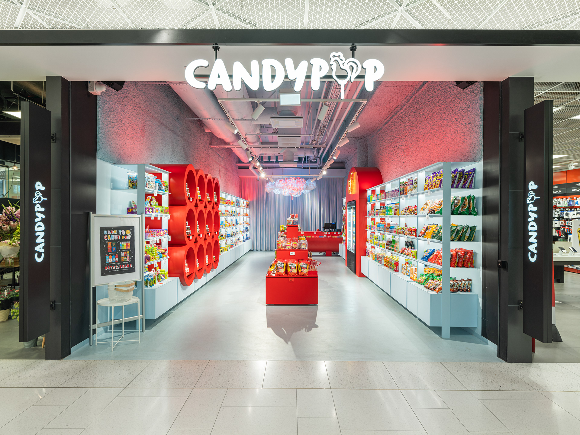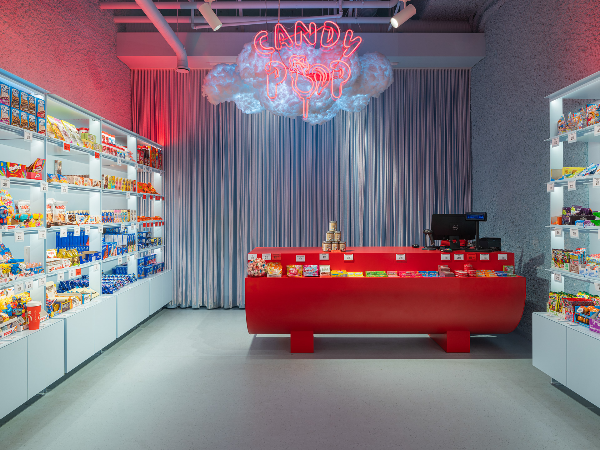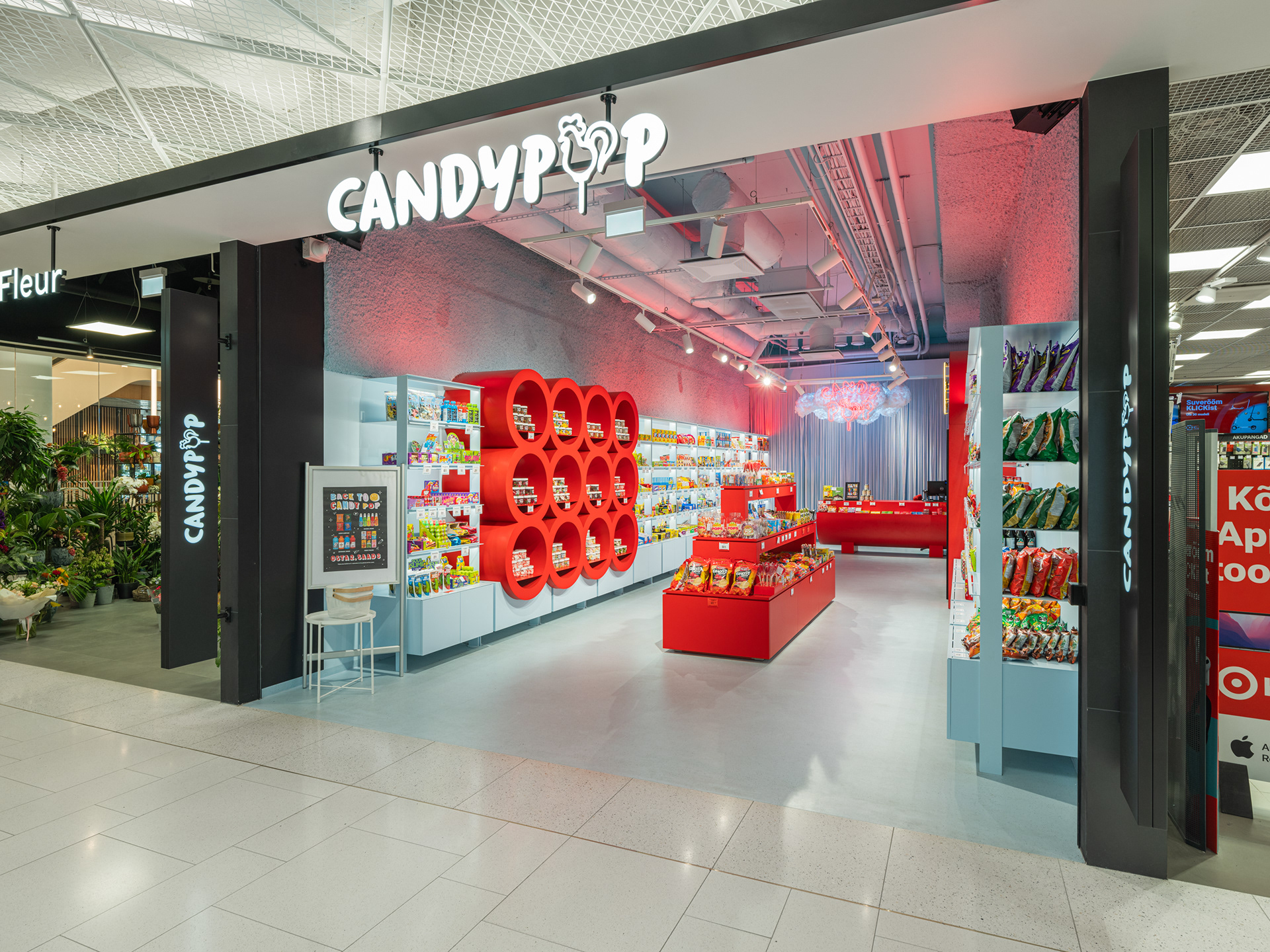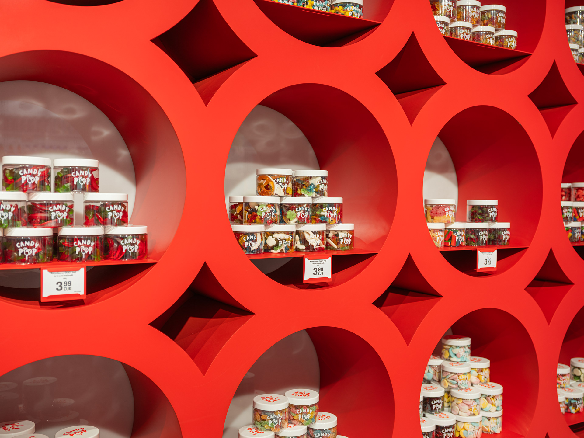 The interior of the Candy POP store in Tallinn. Despite its compact size, it radiates a colorful and varied world of different flavors. The brand's signature color scheme creates a nice contrast – soft-toned metal shelves provide a backdrop, accentuating elements of various bold shapes, giving a touch of acidity to the interior. The choice of metal in the furniture design introduces curved shapes, imparting a playfulness to the space. Additionally, the hanging cloud near the checkout evokes the likeness of a sweet tuft of cotton candy.