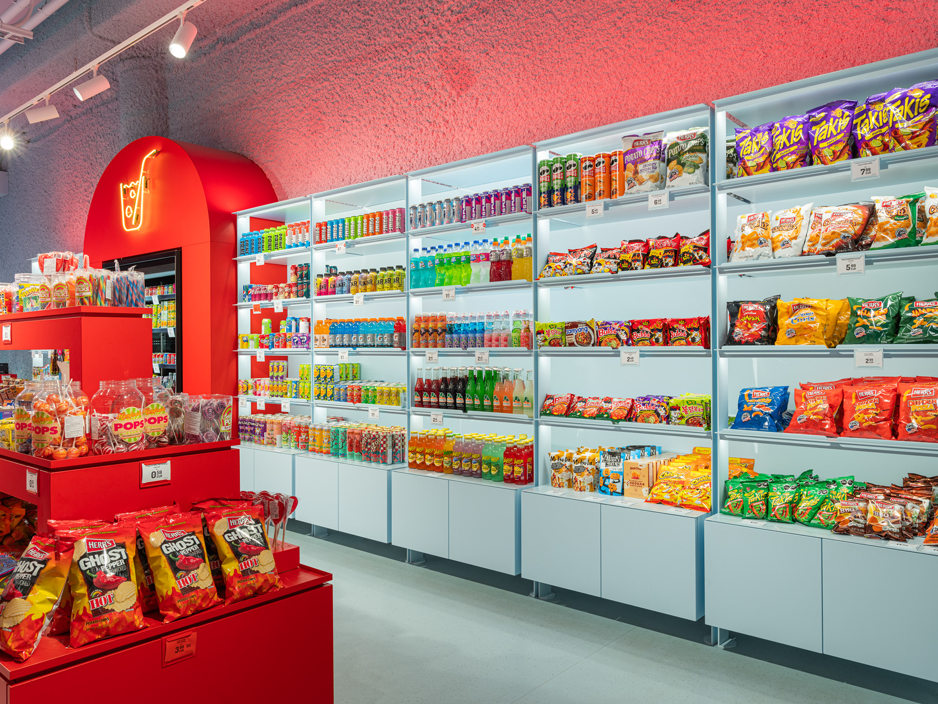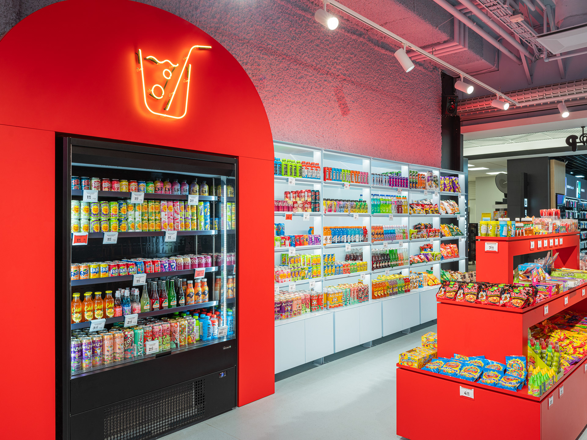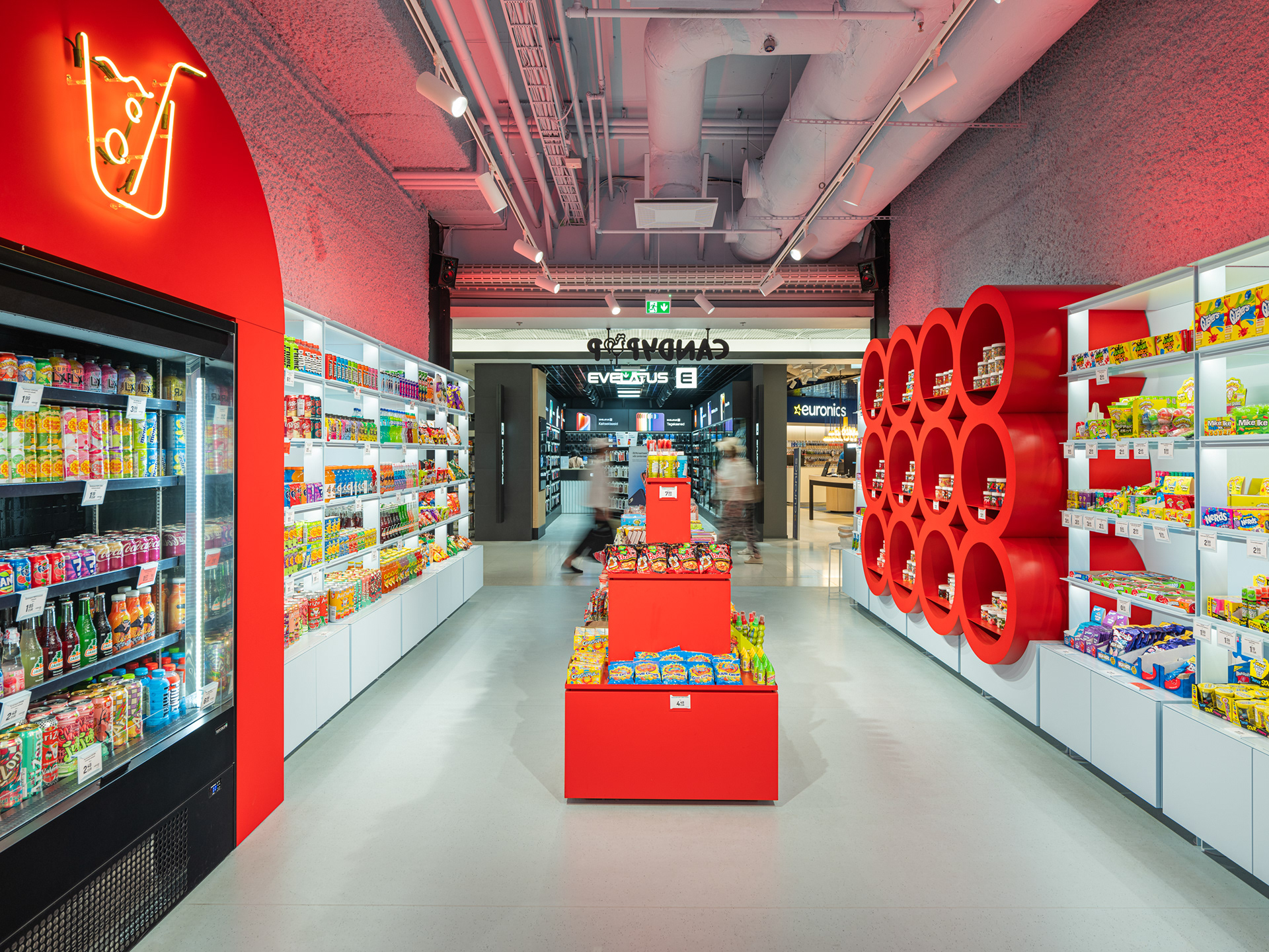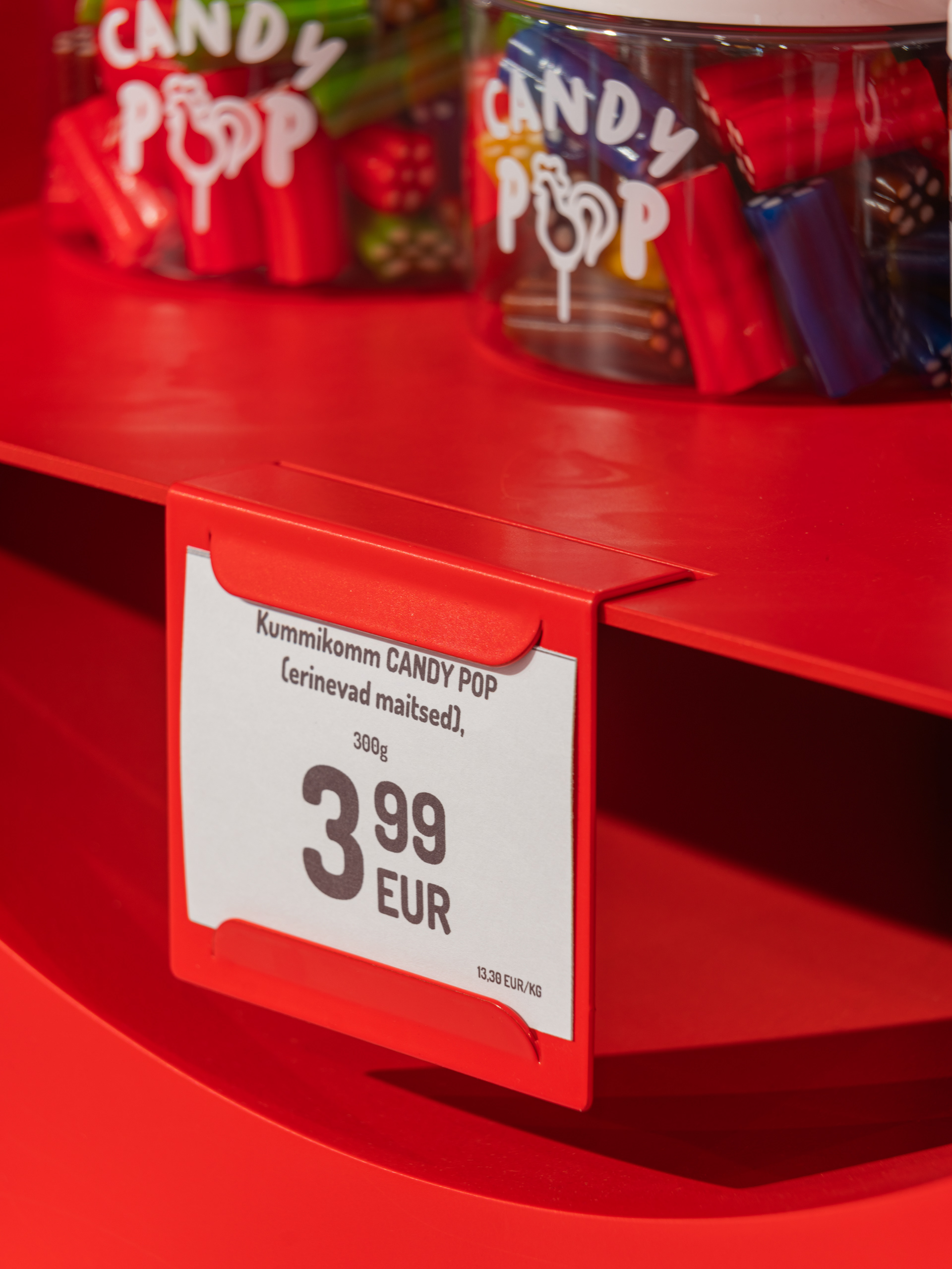 The interior of the Candy POP store in Tallinn. Despite its compact size, it radiates a colorful and varied world of different flavors. The brand's signature color scheme creates a nice contrast – soft-toned metal shelves provide a backdrop, accentuating elements of various bold shapes, giving a touch of acidity to the interior. The choice of metal in the furniture design introduces curved shapes, imparting a playfulness to the space. Additionally, the hanging cloud near the checkout evokes the likeness of a sweet tuft of cotton candy.