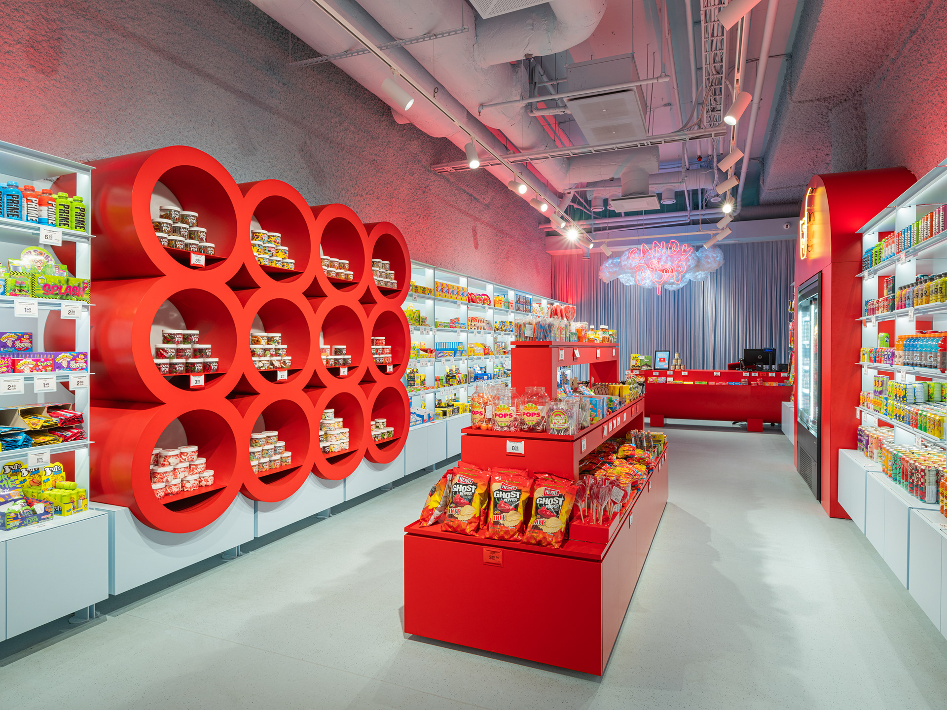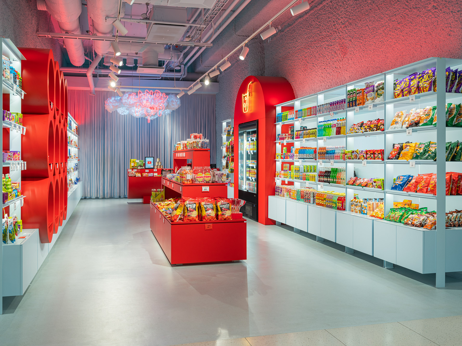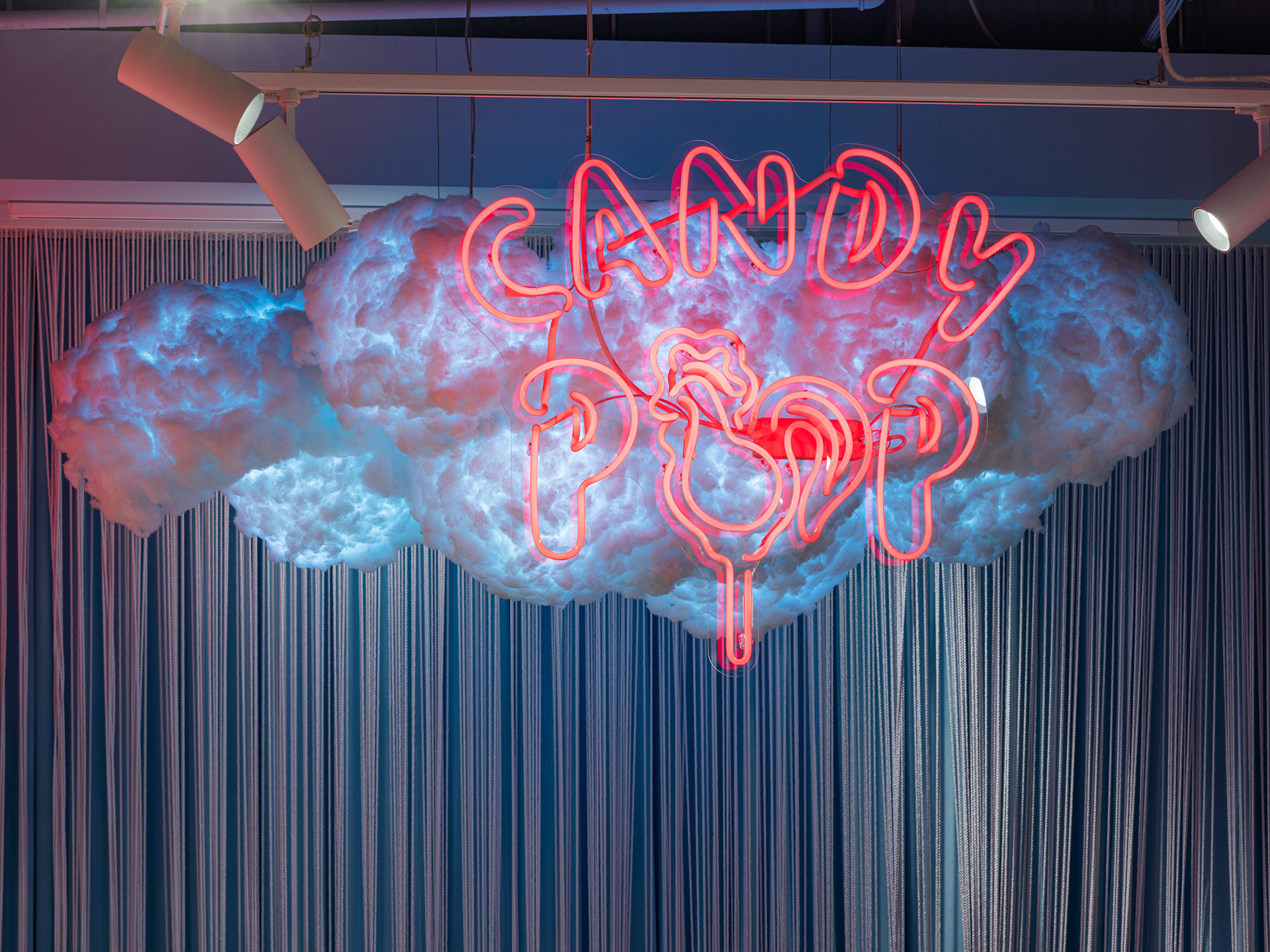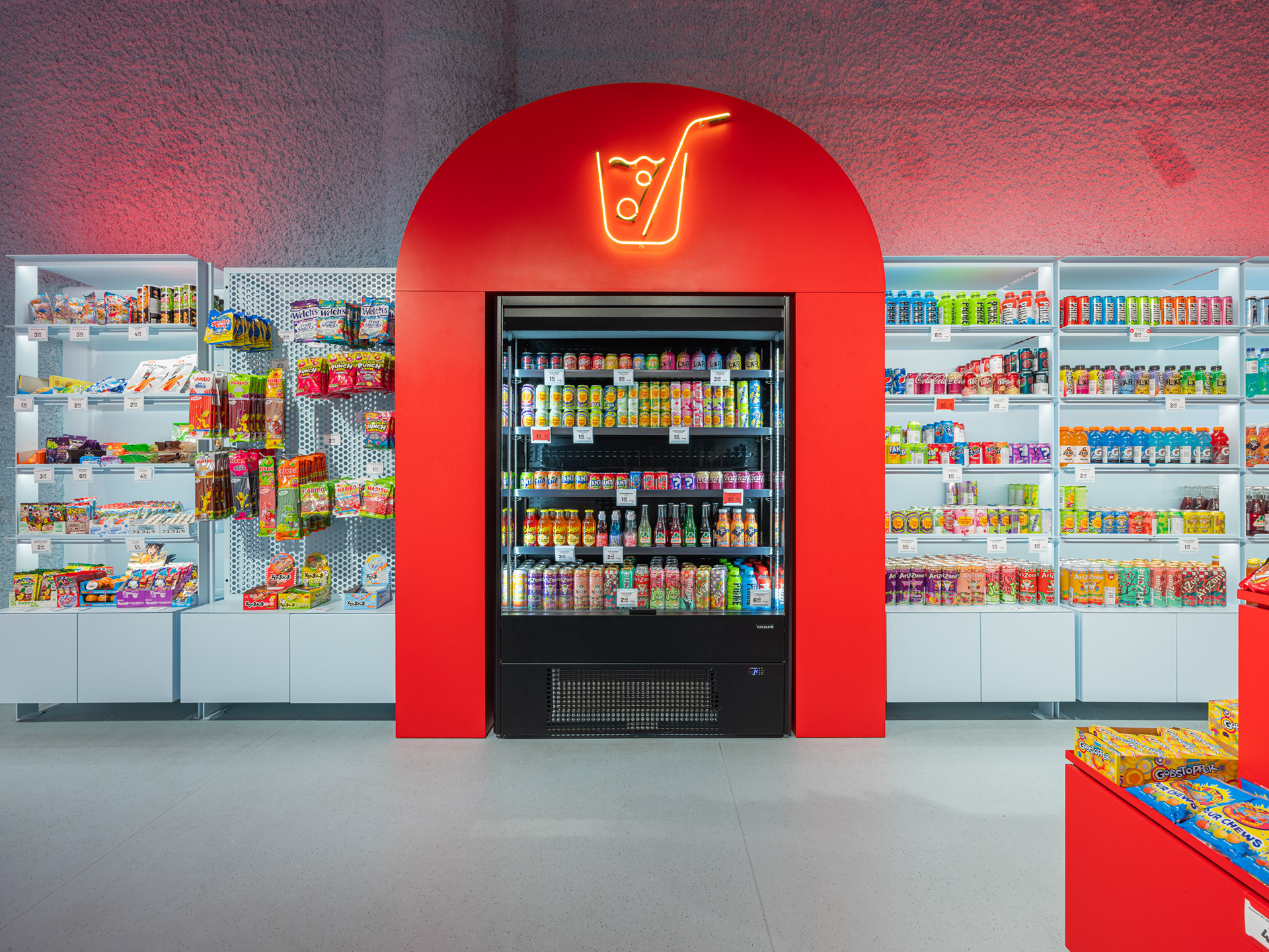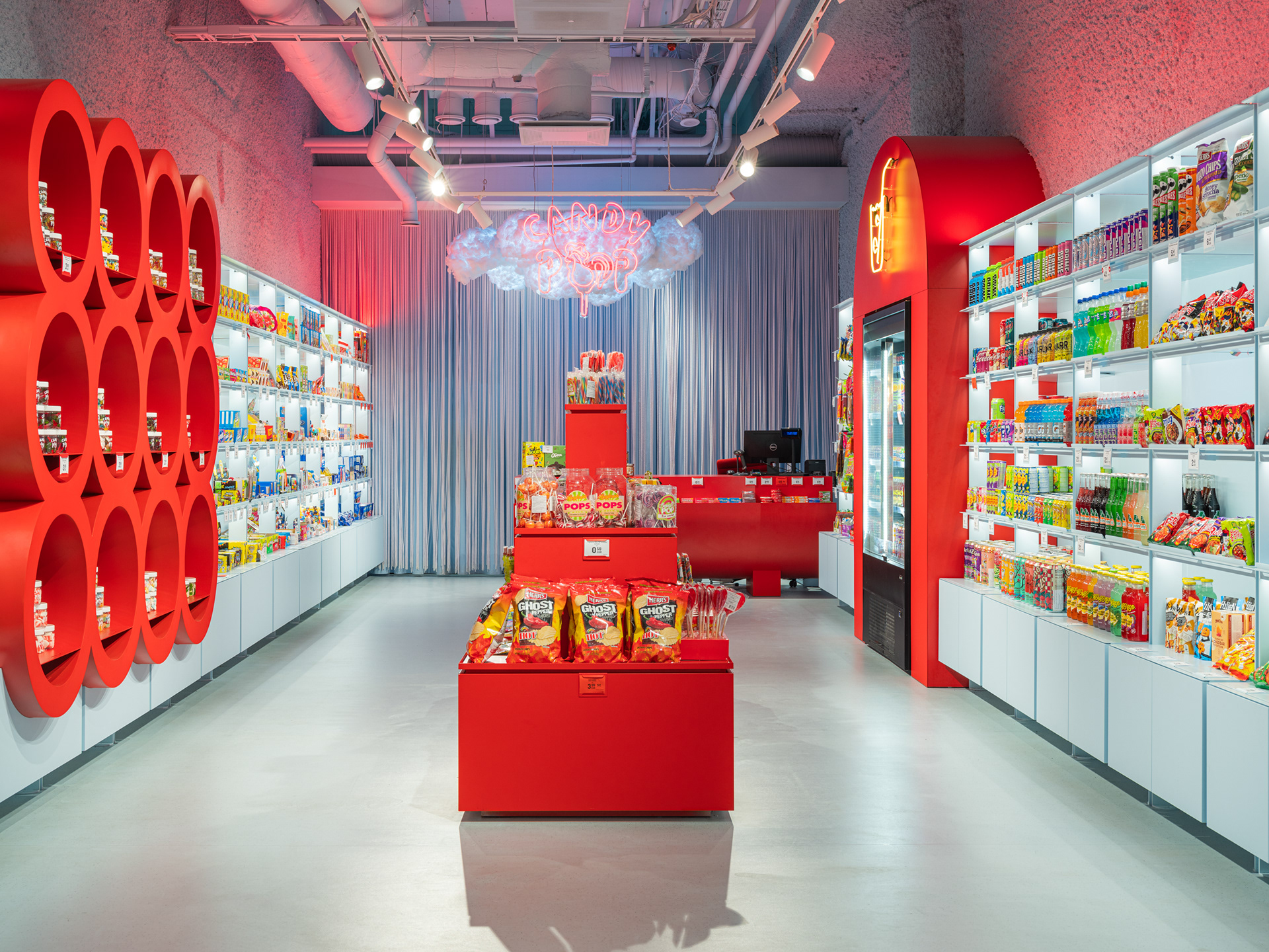 The interior of the Candy POP store in Tallinn. Despite its compact size, it radiates a colorful and varied world of different flavors. The brand's signature color scheme creates a nice contrast – soft-toned metal shelves provide a backdrop, accentuating elements of various bold shapes, giving a touch of acidity to the interior. The choice of metal in the furniture design introduces curved shapes, imparting a playfulness to the space. Additionally, the hanging cloud near the checkout evokes the likeness of a sweet tuft of cotton candy.