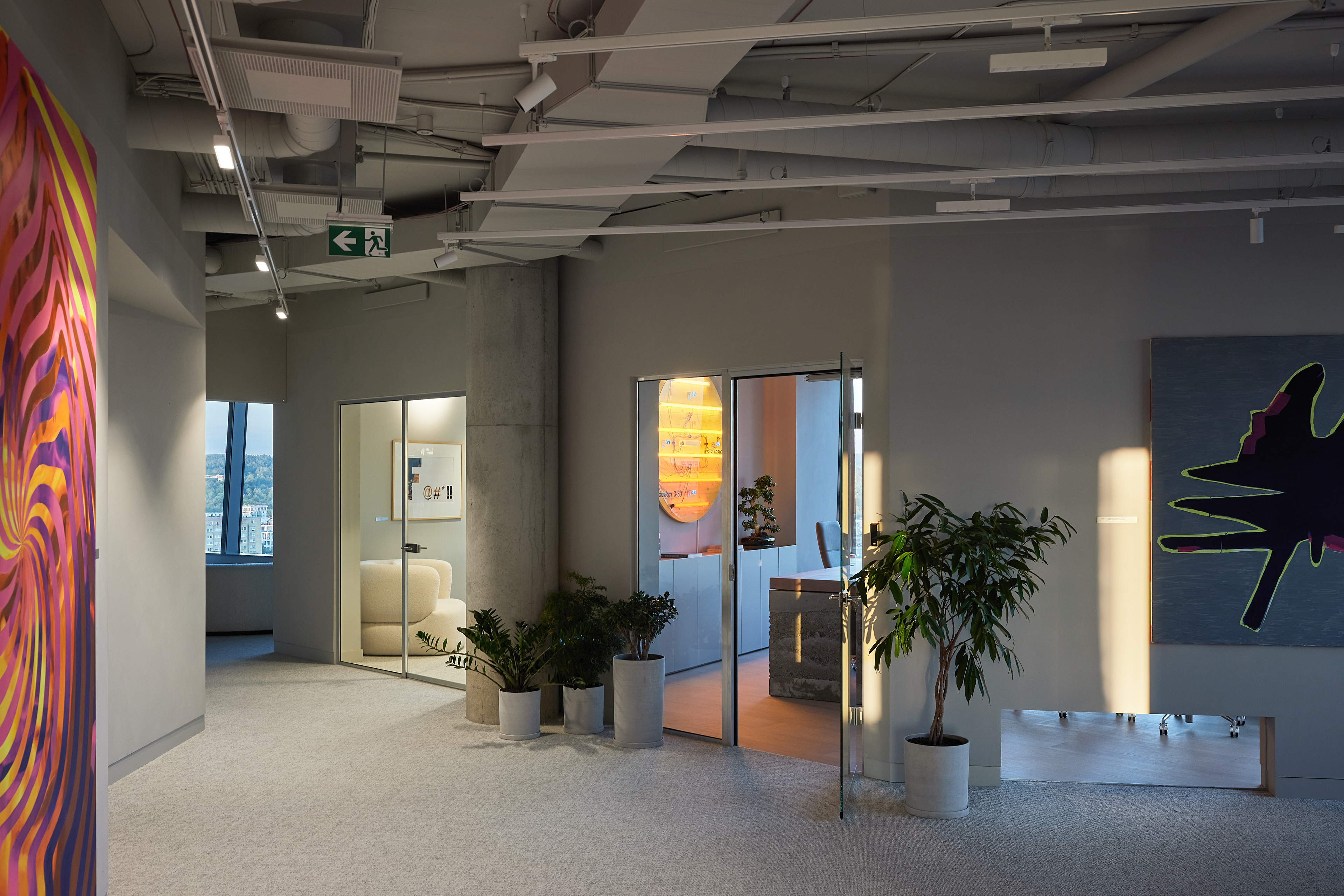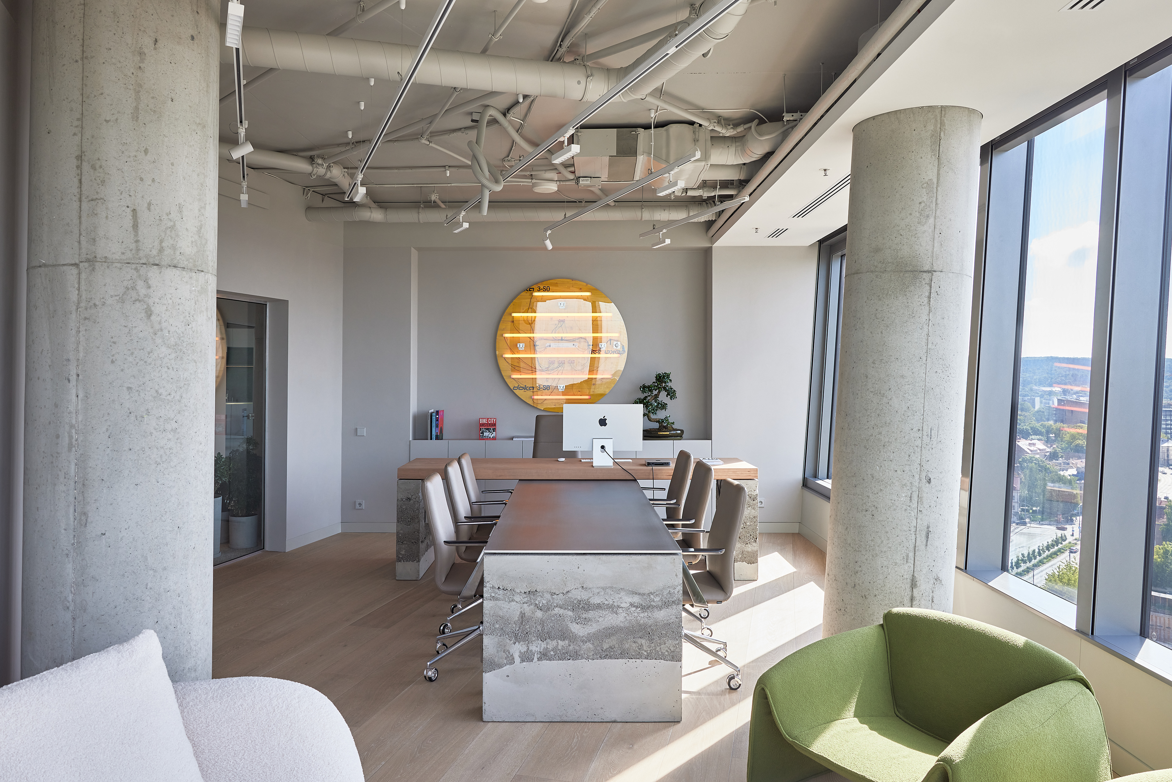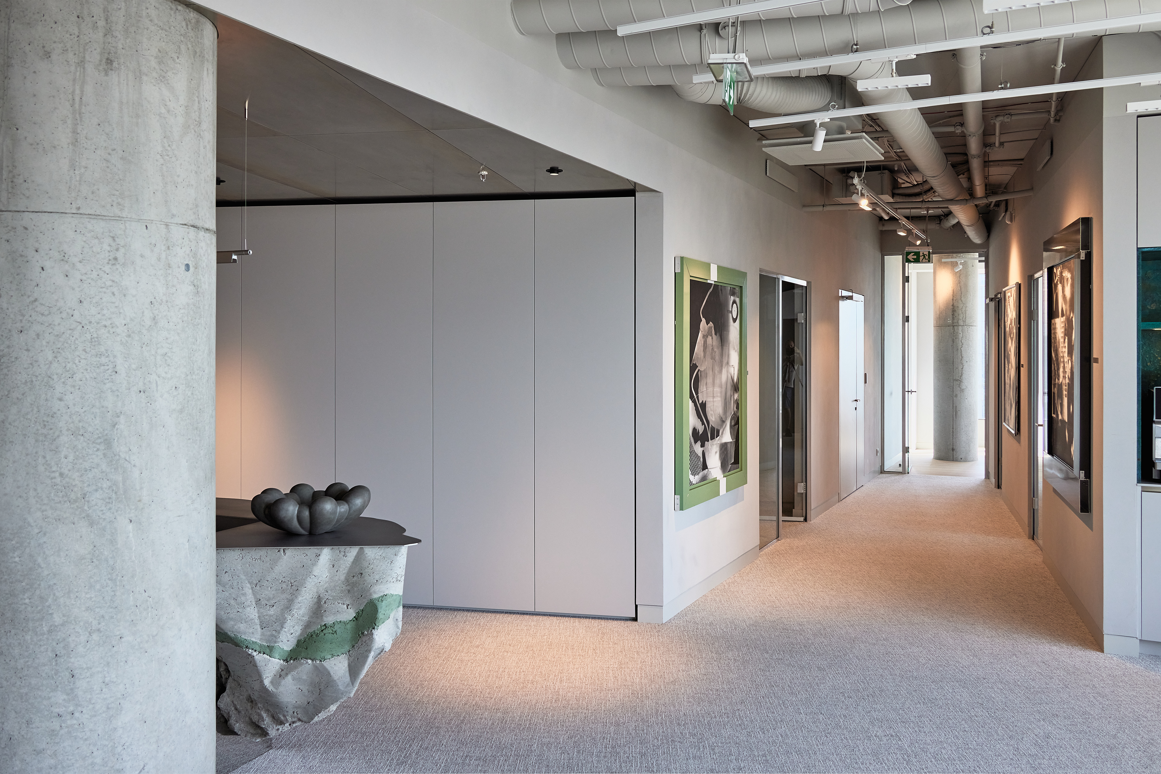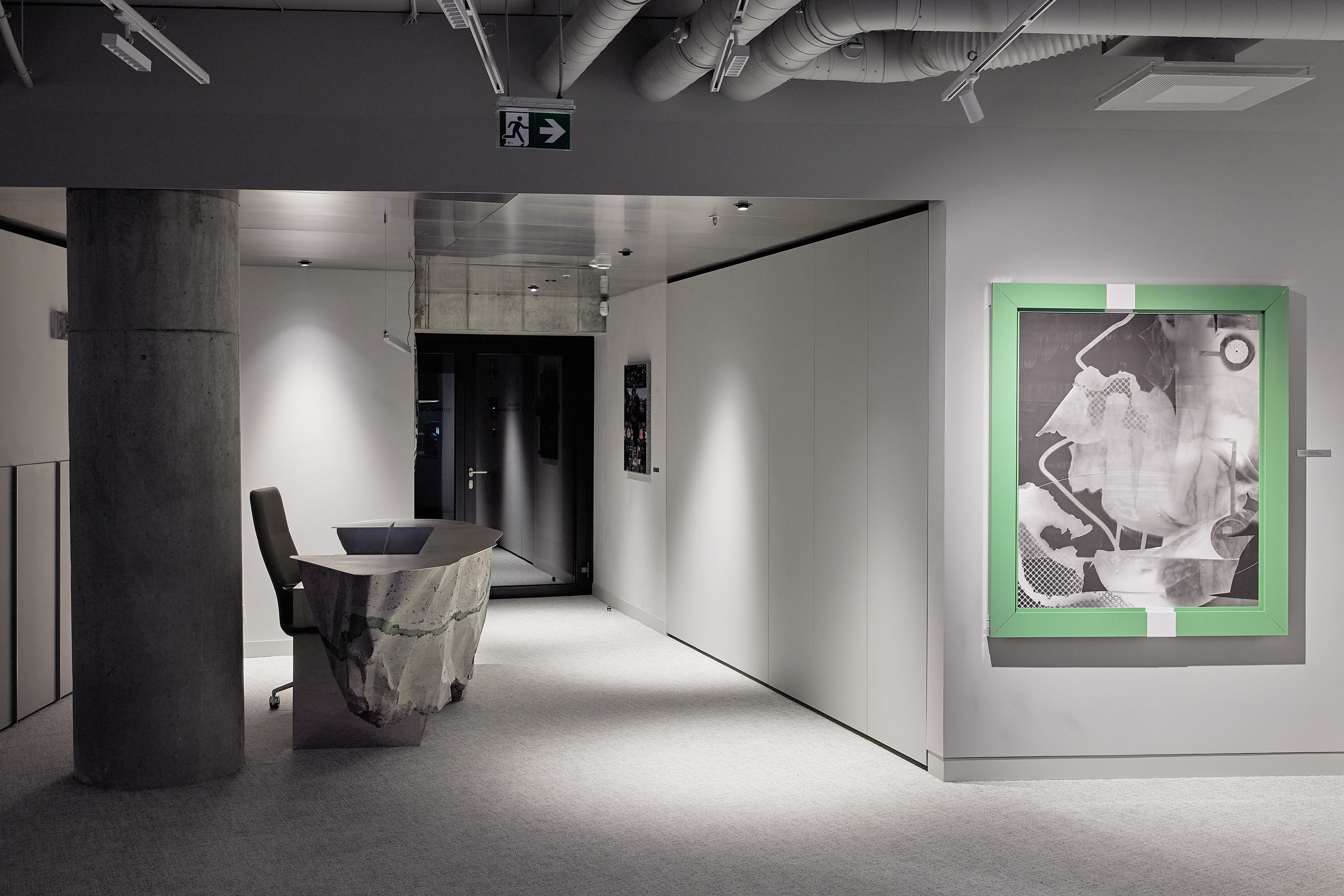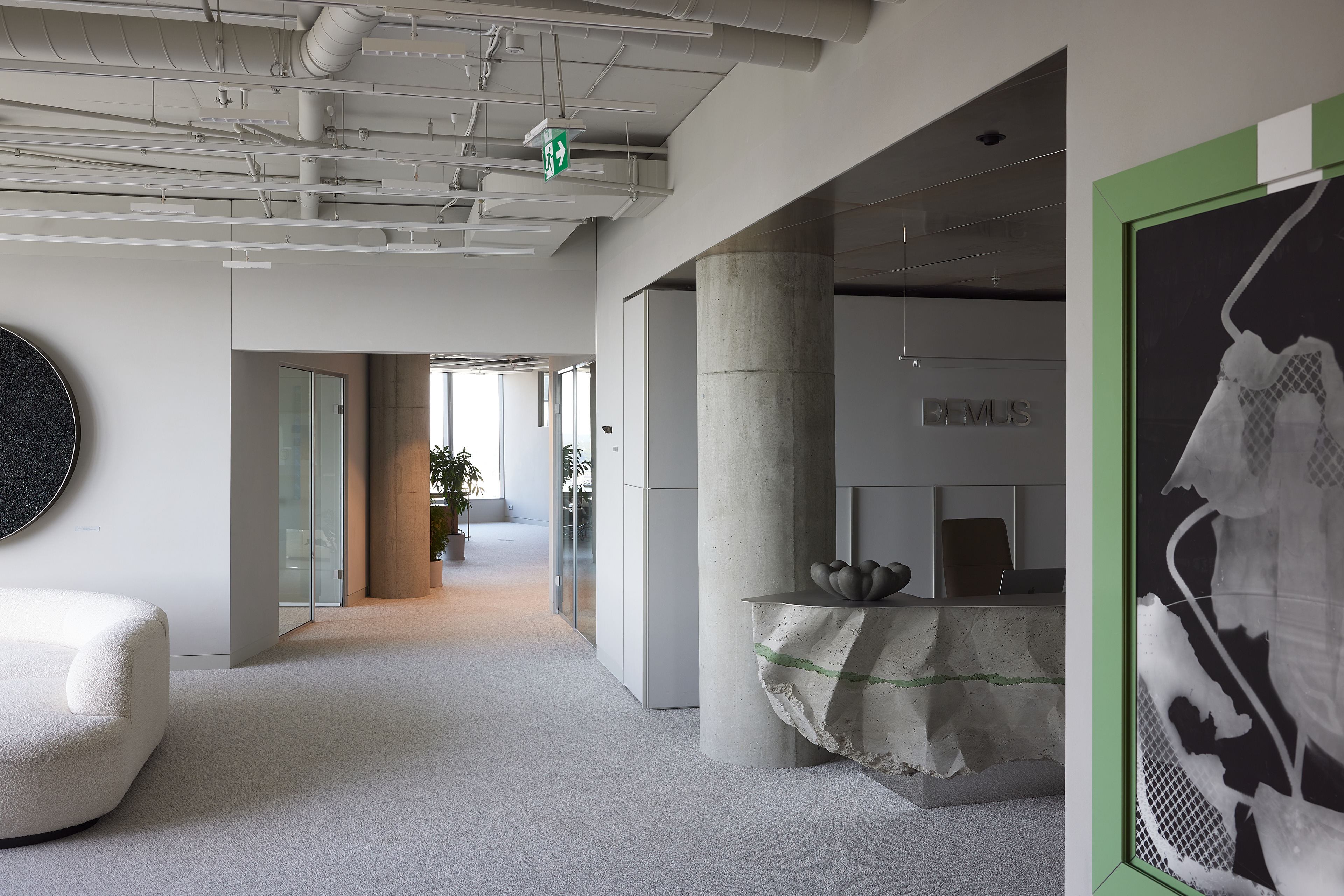 The interior of the Demus Asset Management office, designed by Heima architects, draws inspiration from an art gallery, combining concrete, stainless steel, and wood to create a refined and creative atmosphere. The spacious reception area, resembling a cozy living room, offers panoramic views of the capital, while most workstations are in private offices, with one open workspace connected to the reception. The sloping ARTERY building’s facade posed architectural challenges, resulting in asymmetrical spaces and artistic corridor designs, with small windows placed unpredictably to enhance natural light. Custom-designed furniture, including concrete tables, wooden chairs, and a monumental rock-like reception desk of concrete and stainless steel, reflects both functionality and artistic expression. In the director’s office, a 600 kg T-shaped table with laminated concrete legs, a cherry wood top, and a stainless-steel surface embodies craftsmanship and durability. Lighting highlights both artwork and workspaces, while light grey switches and sockets blend seamlessly into the minimalist design, creating a cohesive, sophisticated environment that aligns with the company’s vision.