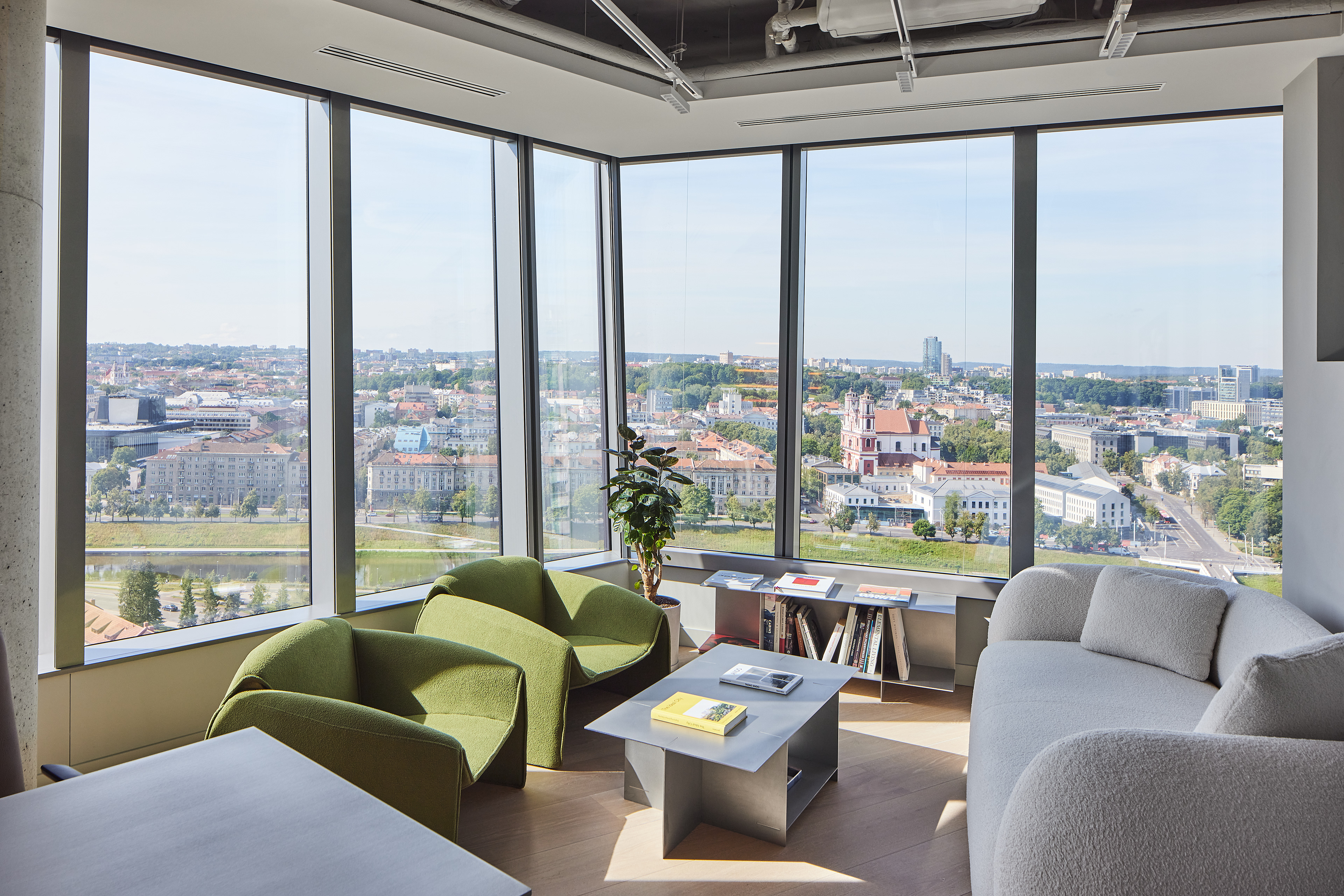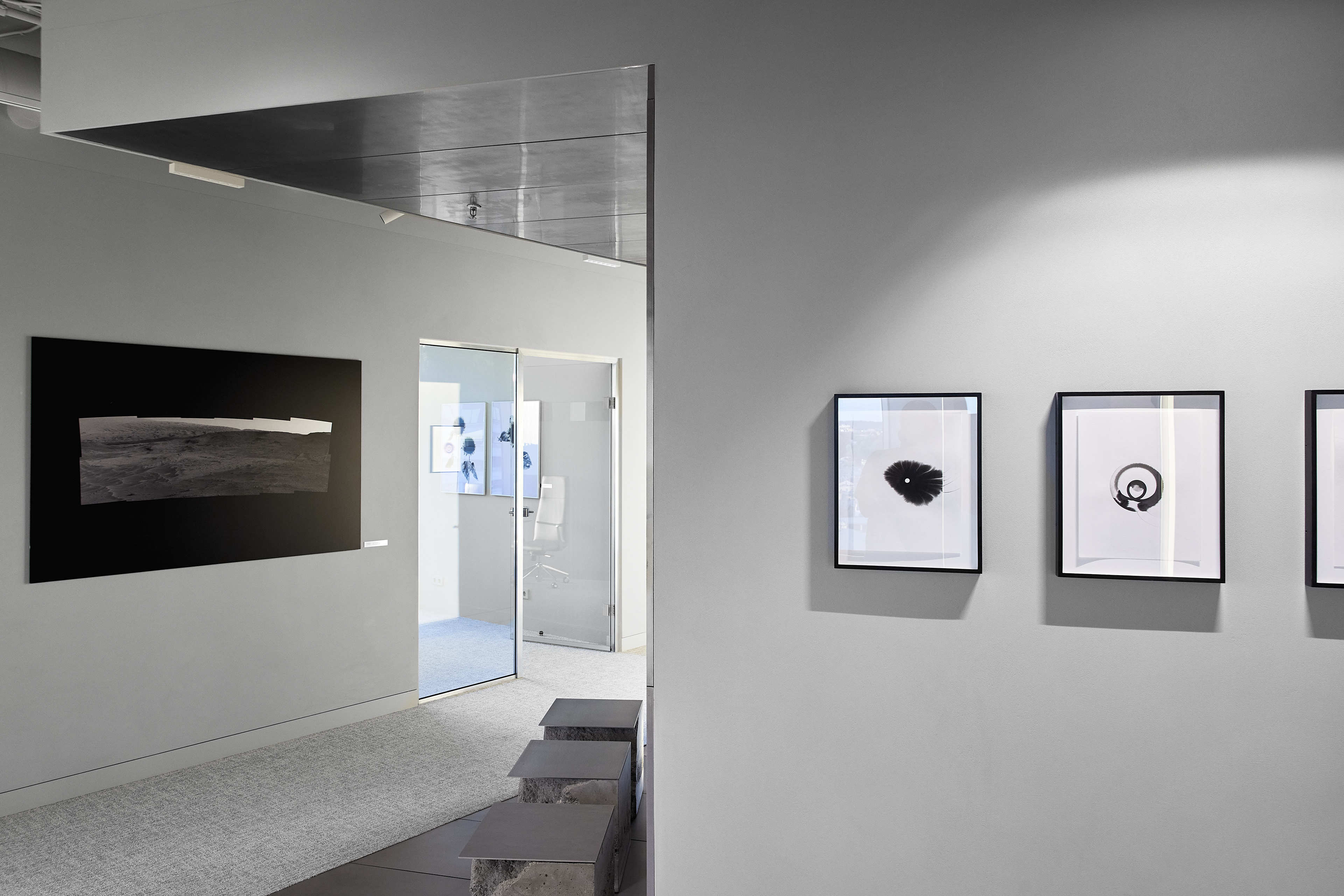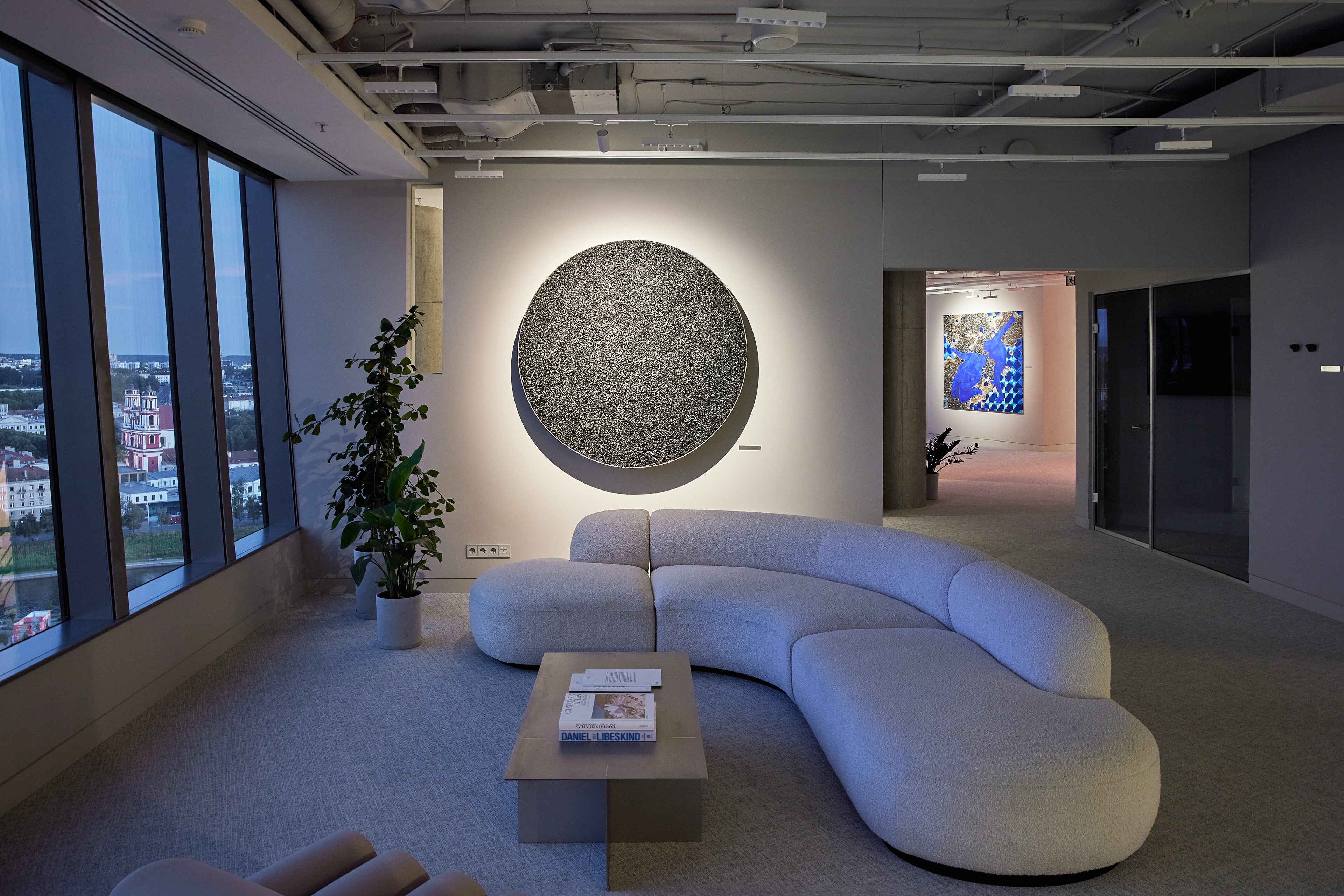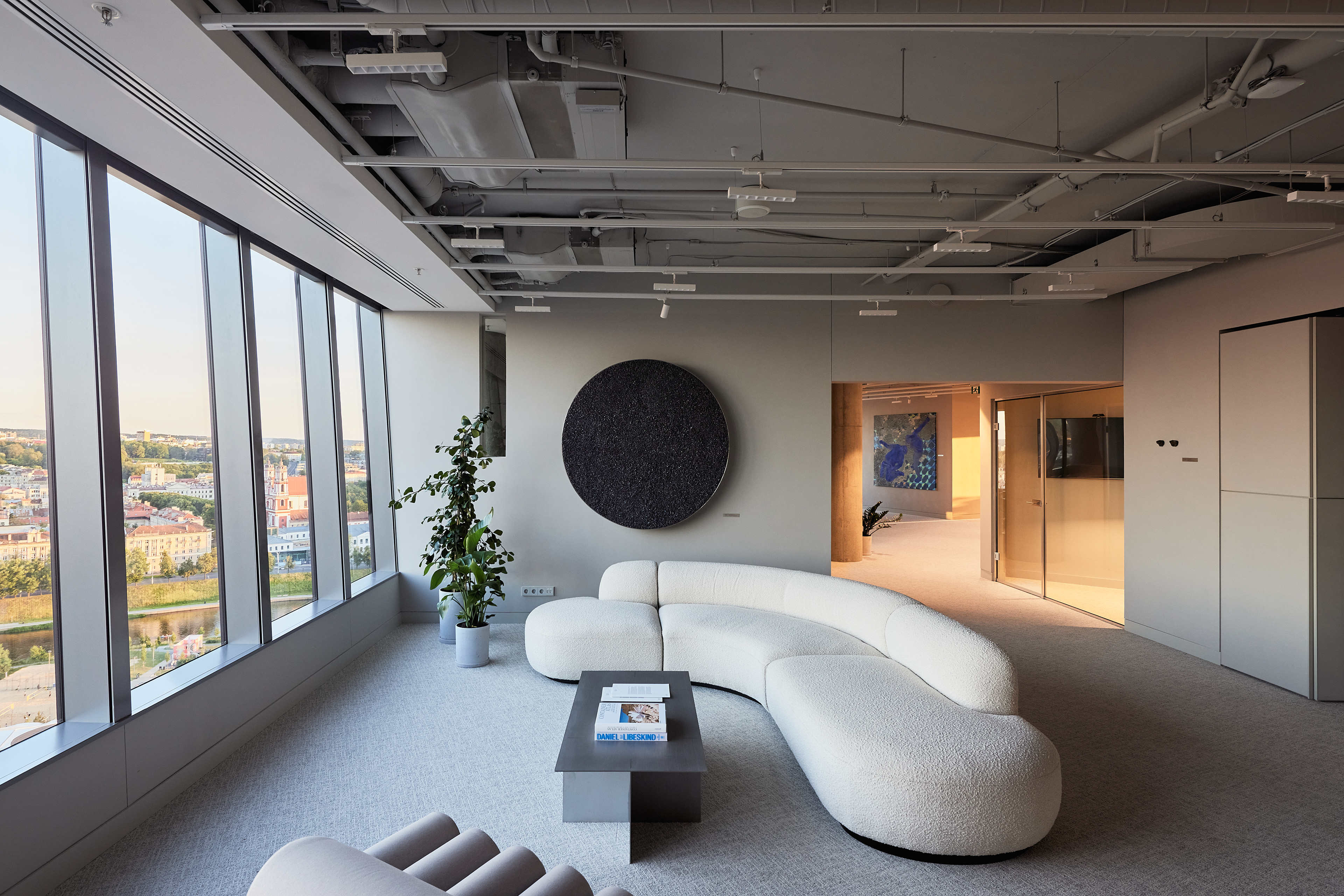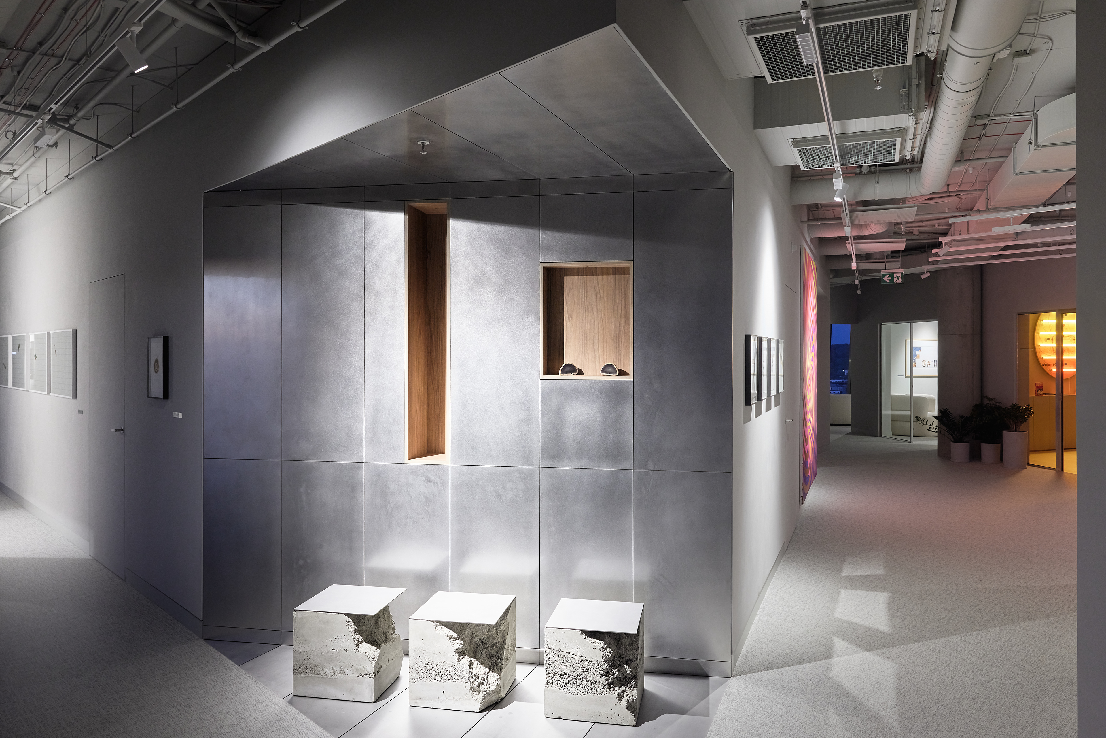 The interior of the Demus Asset Management office, designed by Heima architects, draws inspiration from an art gallery, combining concrete, stainless steel, and wood to create a refined and creative atmosphere. The spacious reception area, resembling a cozy living room, offers panoramic views of the capital, while most workstations are in private offices, with one open workspace connected to the reception. The sloping ARTERY building’s facade posed architectural challenges, resulting in asymmetrical spaces and artistic corridor designs, with small windows placed unpredictably to enhance natural light. Custom-designed furniture, including concrete tables, wooden chairs, and a monumental rock-like reception desk of concrete and stainless steel, reflects both functionality and artistic expression. In the director’s office, a 600 kg T-shaped table with laminated concrete legs, a cherry wood top, and a stainless-steel surface embodies craftsmanship and durability. Lighting highlights both artwork and workspaces, while light grey switches and sockets blend seamlessly into the minimalist design, creating a cohesive, sophisticated environment that aligns with the company’s vision.
