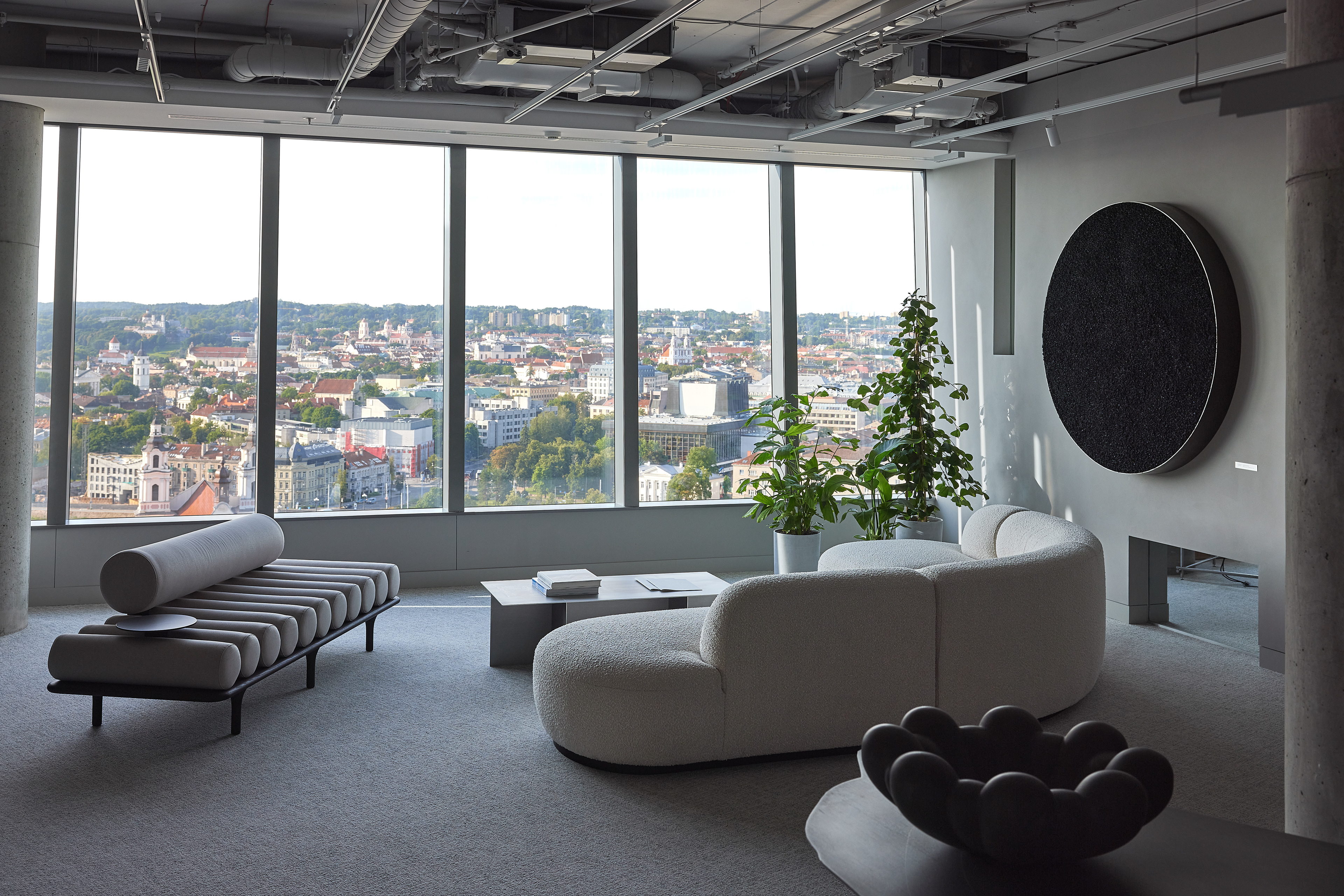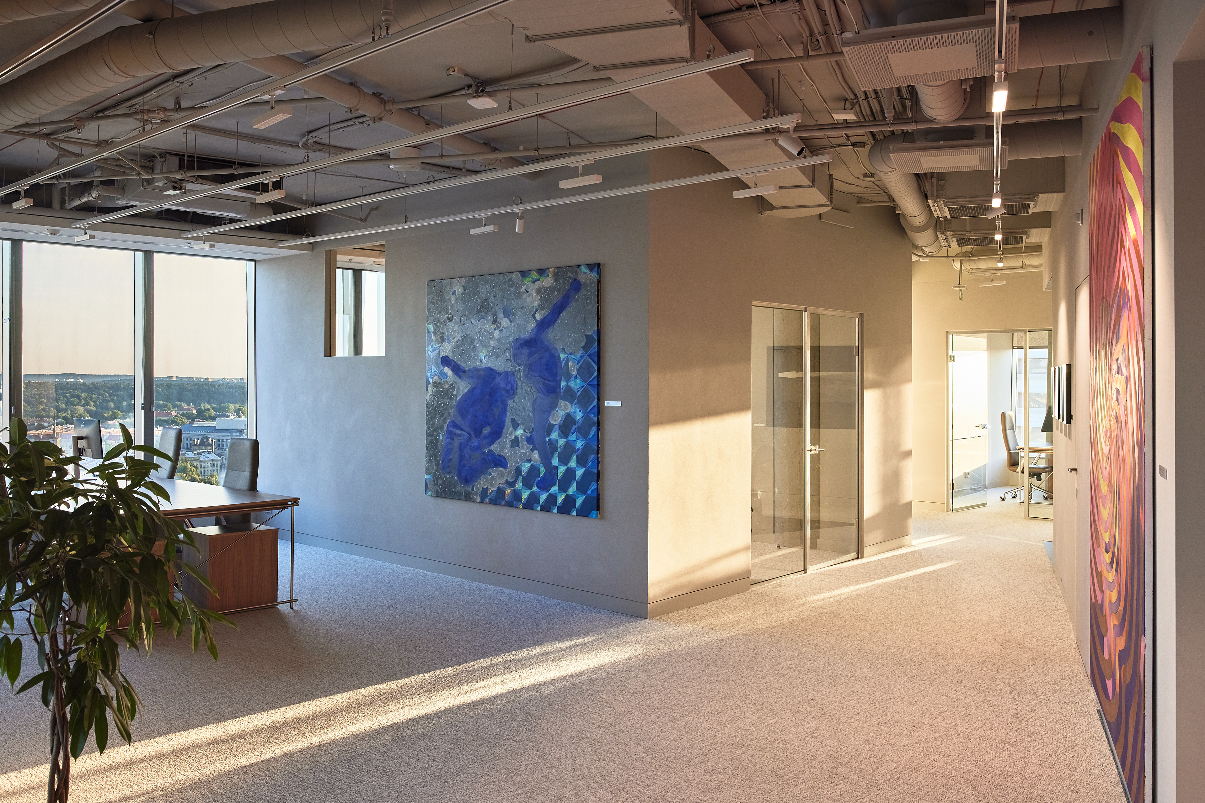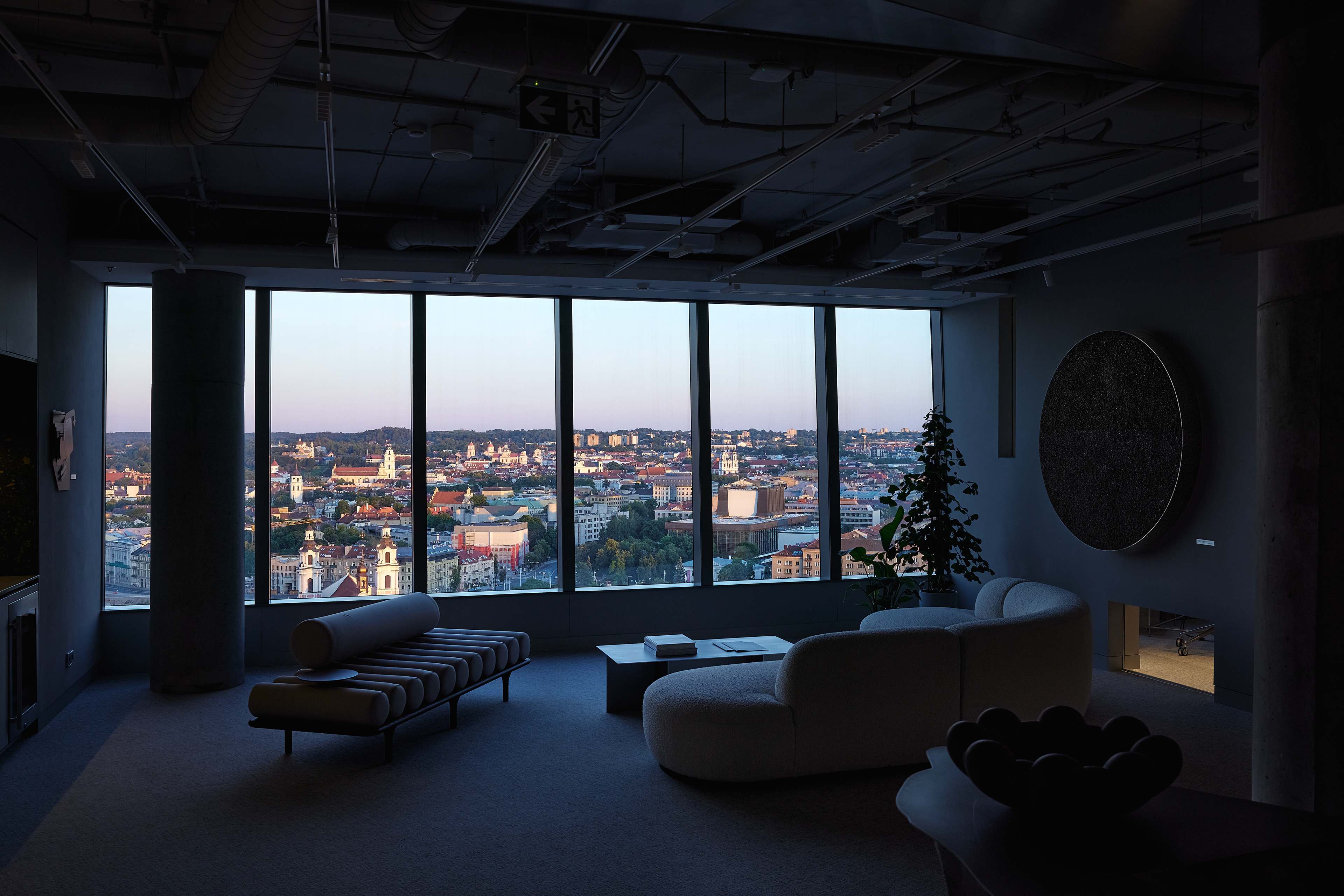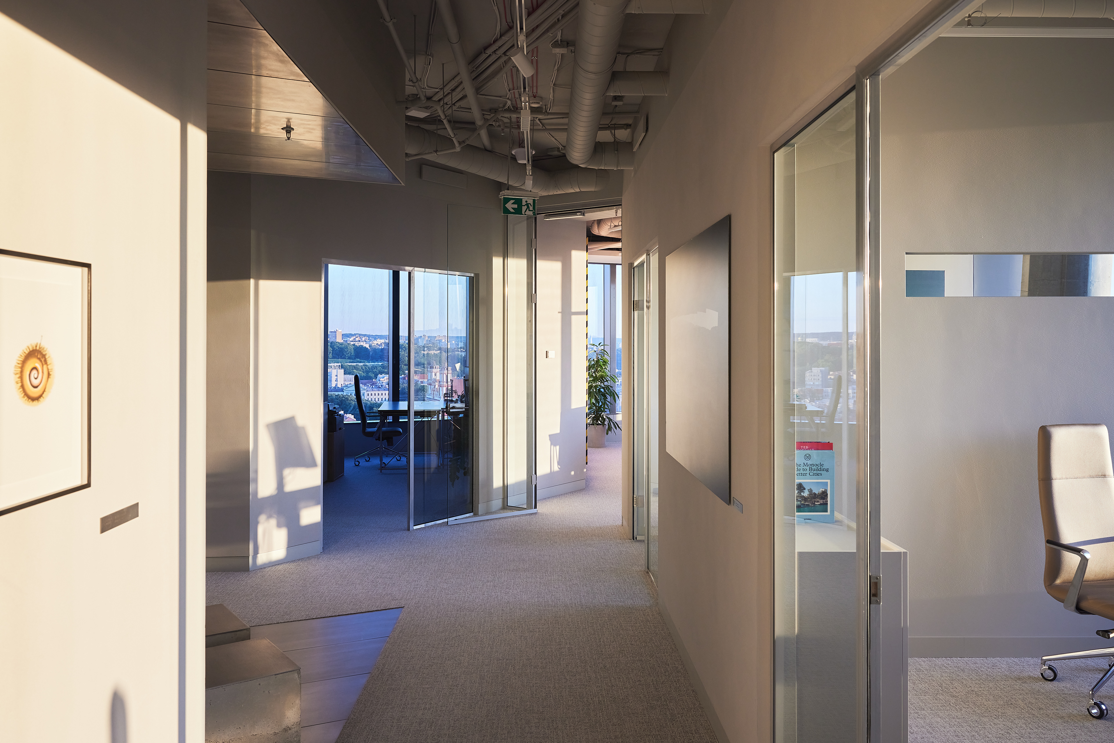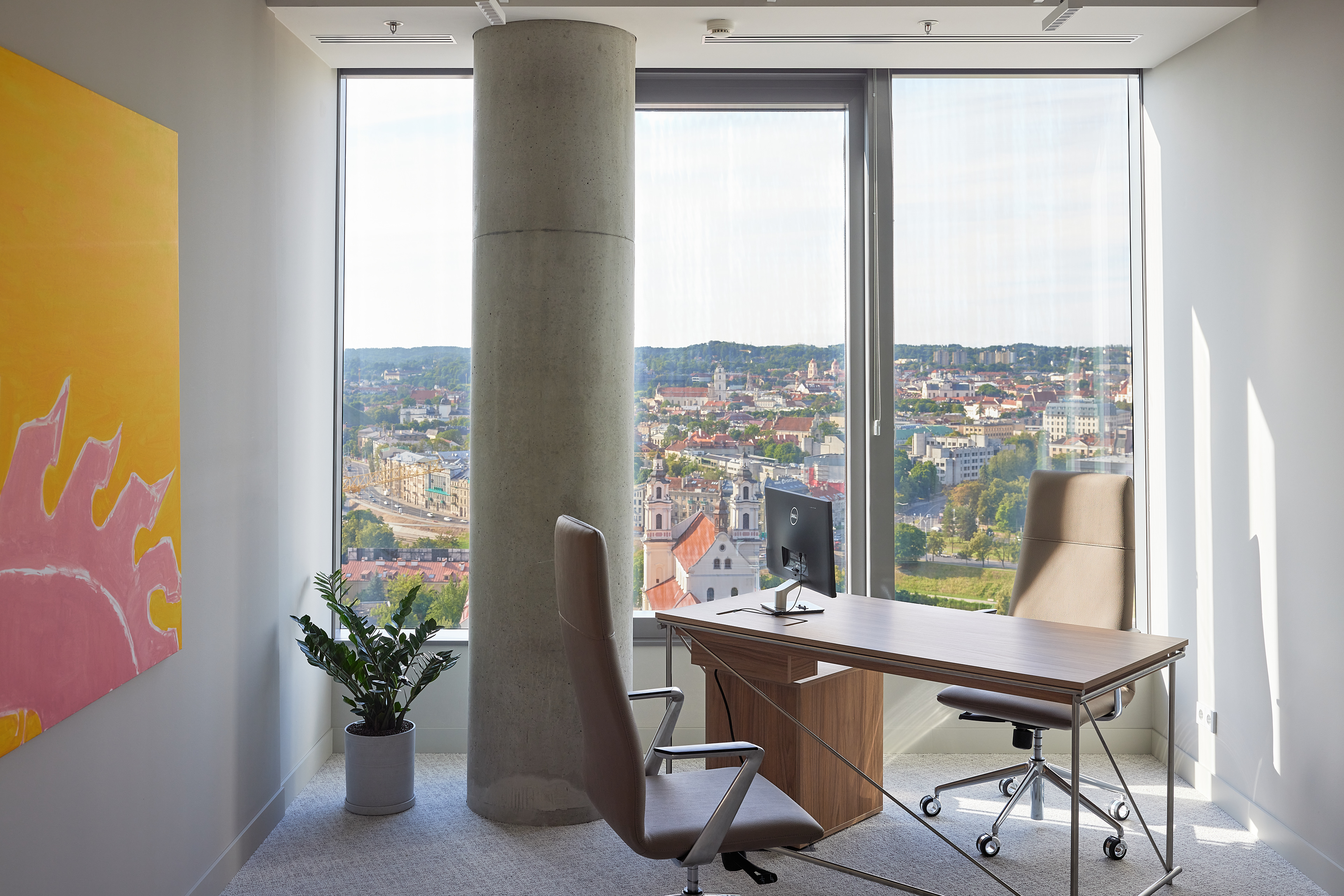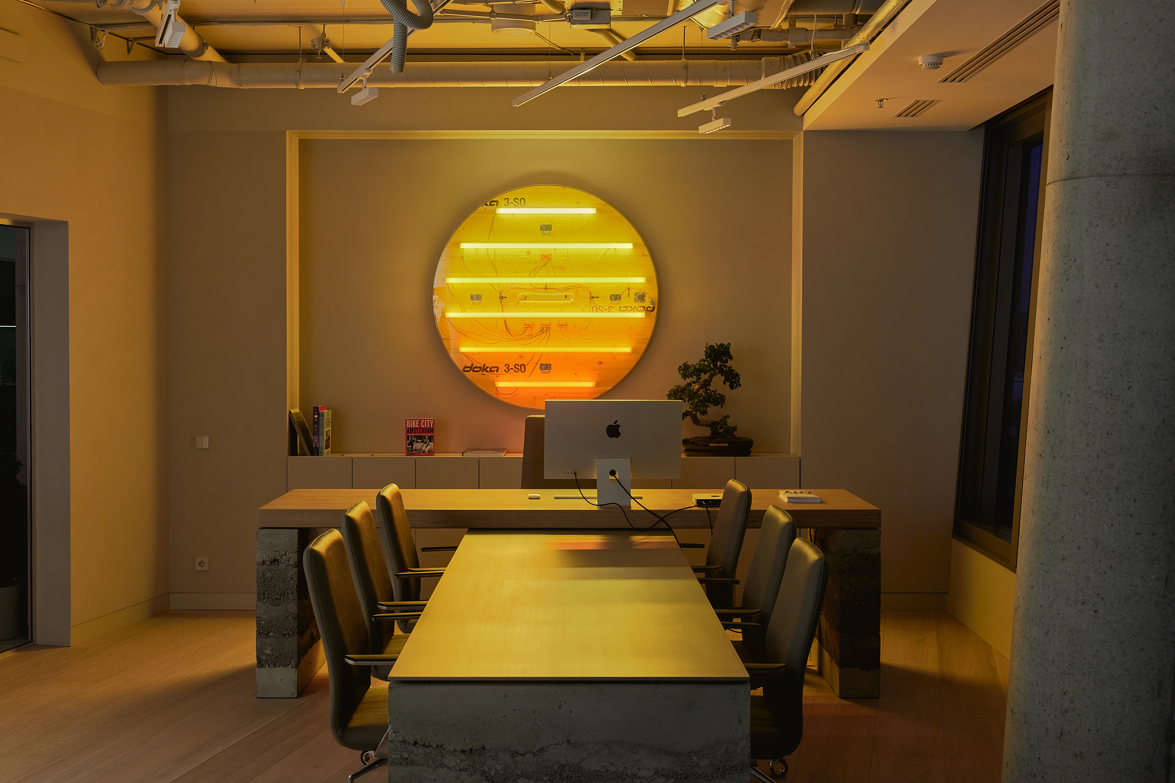 The interior of the Demus Asset Management office, designed by Heima architects, draws inspiration from an art gallery, combining concrete, stainless steel, and wood to create a refined and creative atmosphere. The spacious reception area, resembling a cozy living room, offers panoramic views of the capital, while most workstations are in private offices, with one open workspace connected to the reception. The sloping ARTERY building’s facade posed architectural challenges, resulting in asymmetrical spaces and artistic corridor designs, with small windows placed unpredictably to enhance natural light. Custom-designed furniture, including concrete tables, wooden chairs, and a monumental rock-like reception desk of concrete and stainless steel, reflects both functionality and artistic expression. In the director’s office, a 600 kg T-shaped table with laminated concrete legs, a cherry wood top, and a stainless-steel surface embodies craftsmanship and durability. Lighting highlights both artwork and workspaces, while light grey switches and sockets blend seamlessly into the minimalist design, creating a cohesive, sophisticated environment that aligns with the company’s vision.