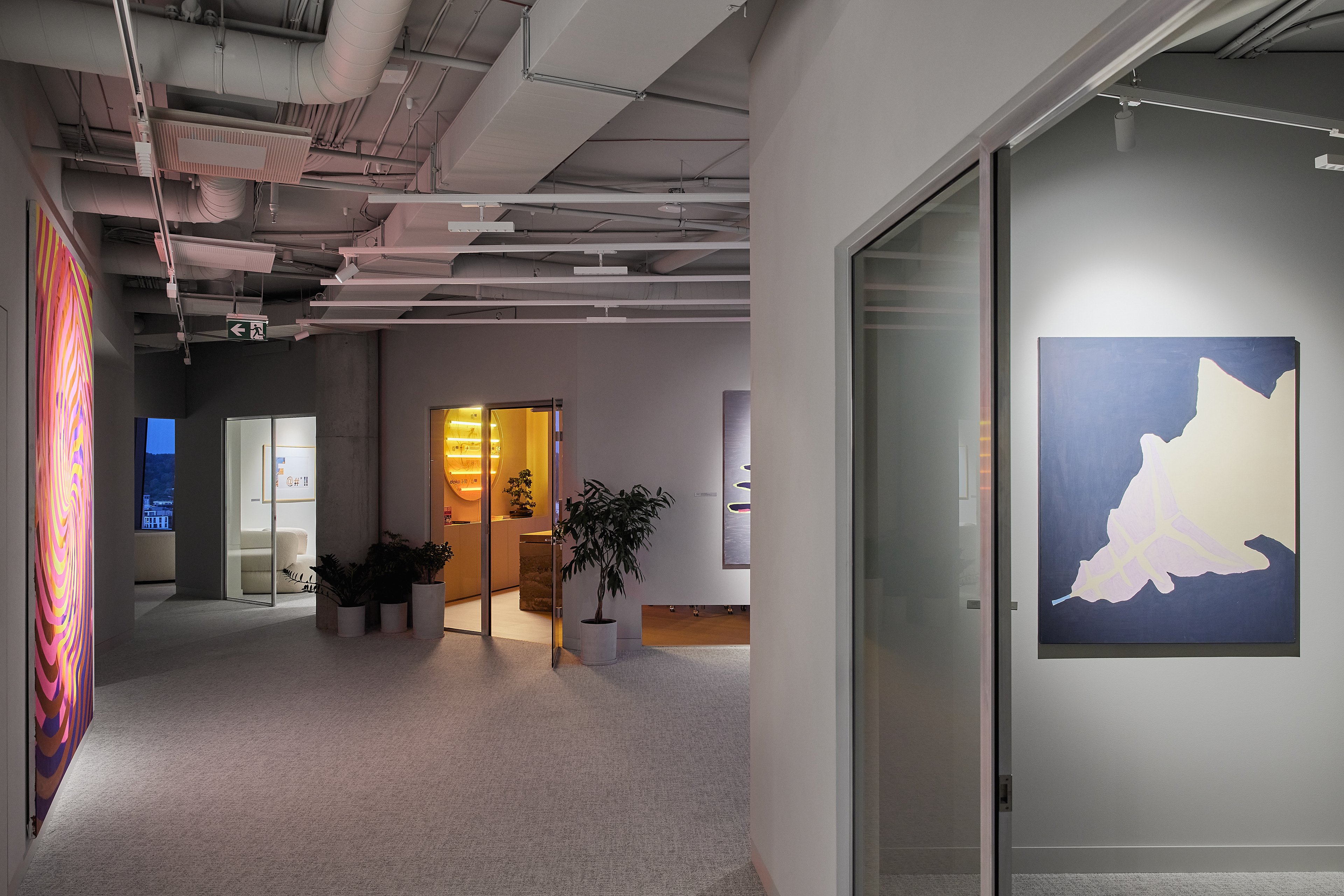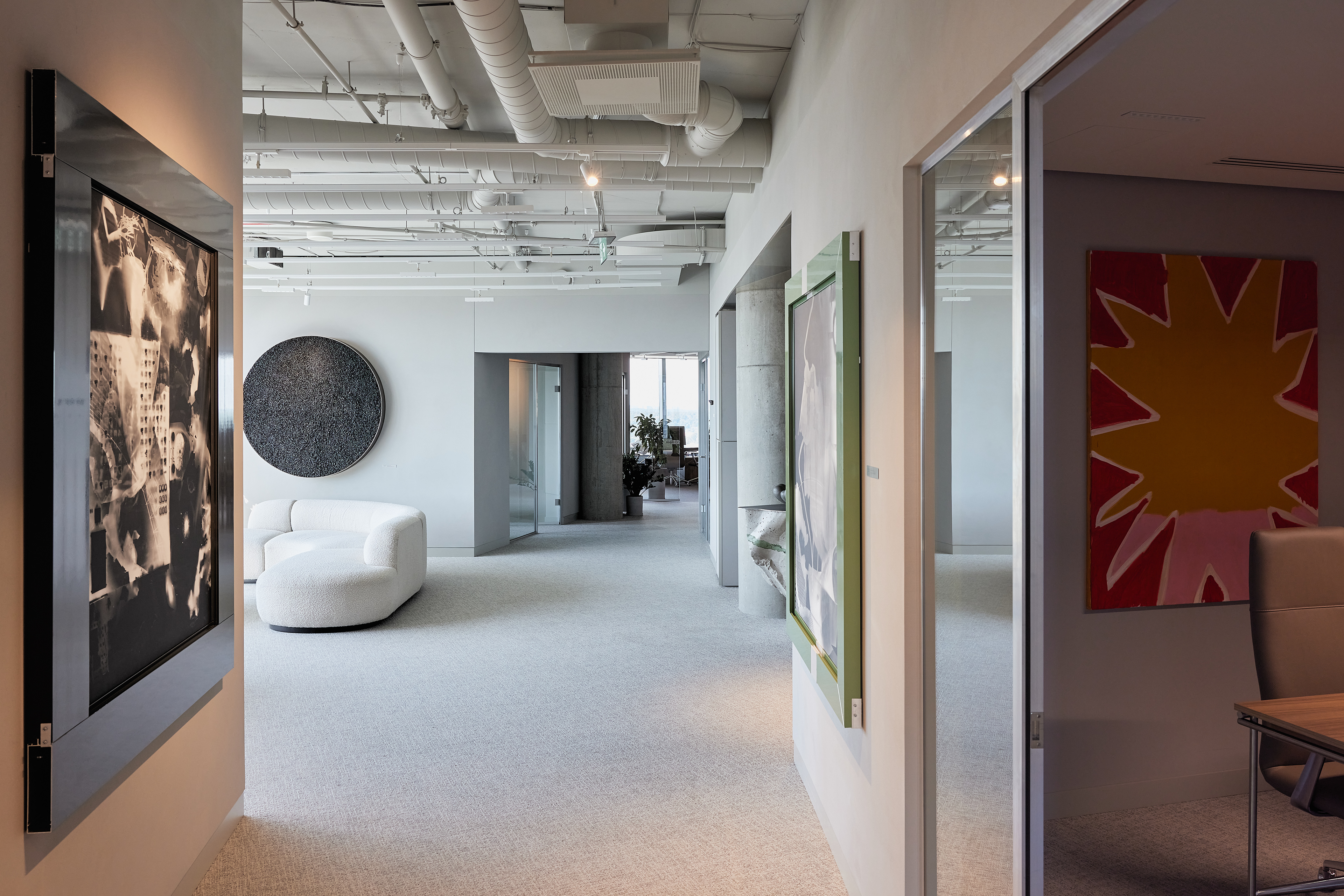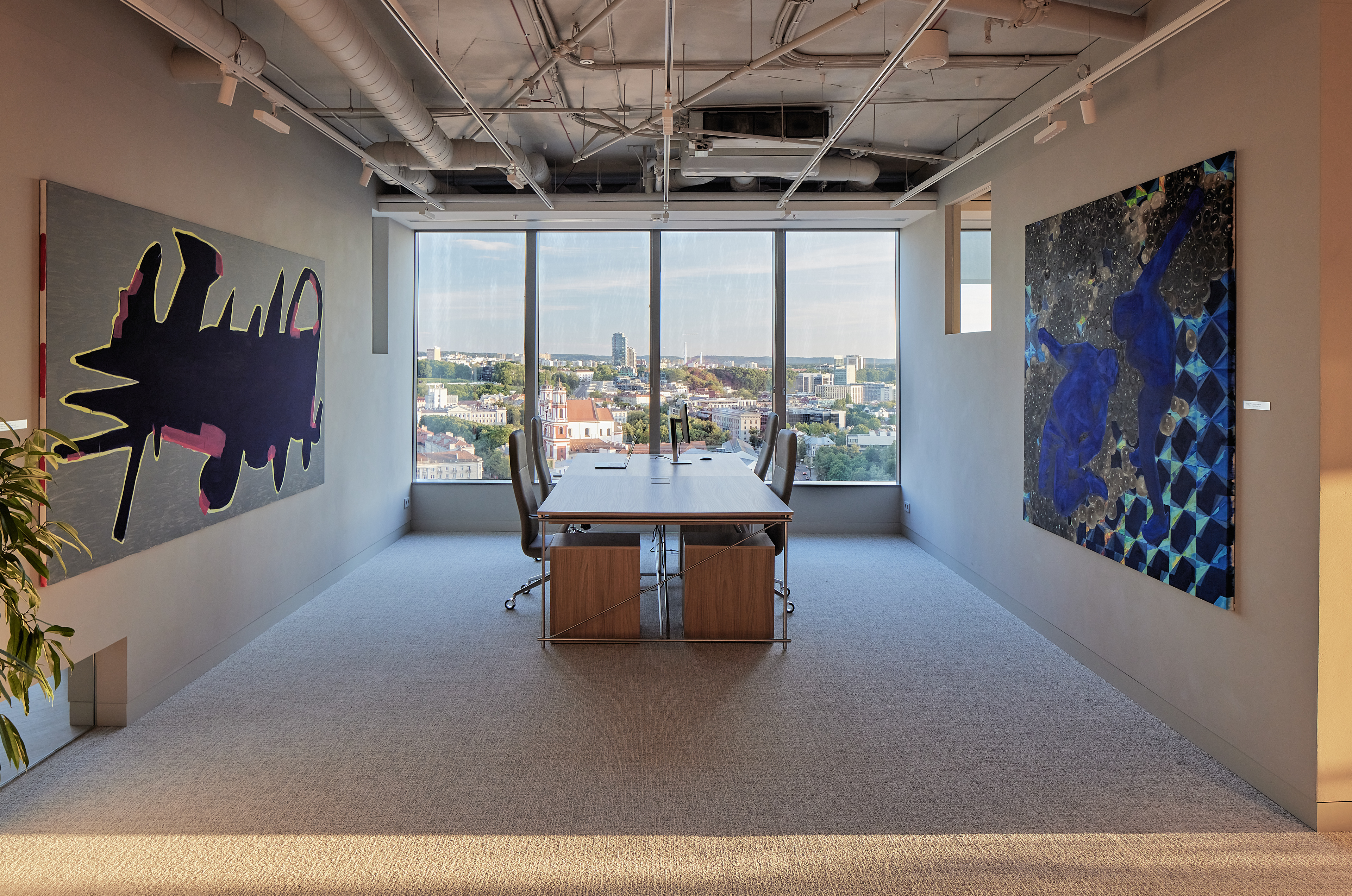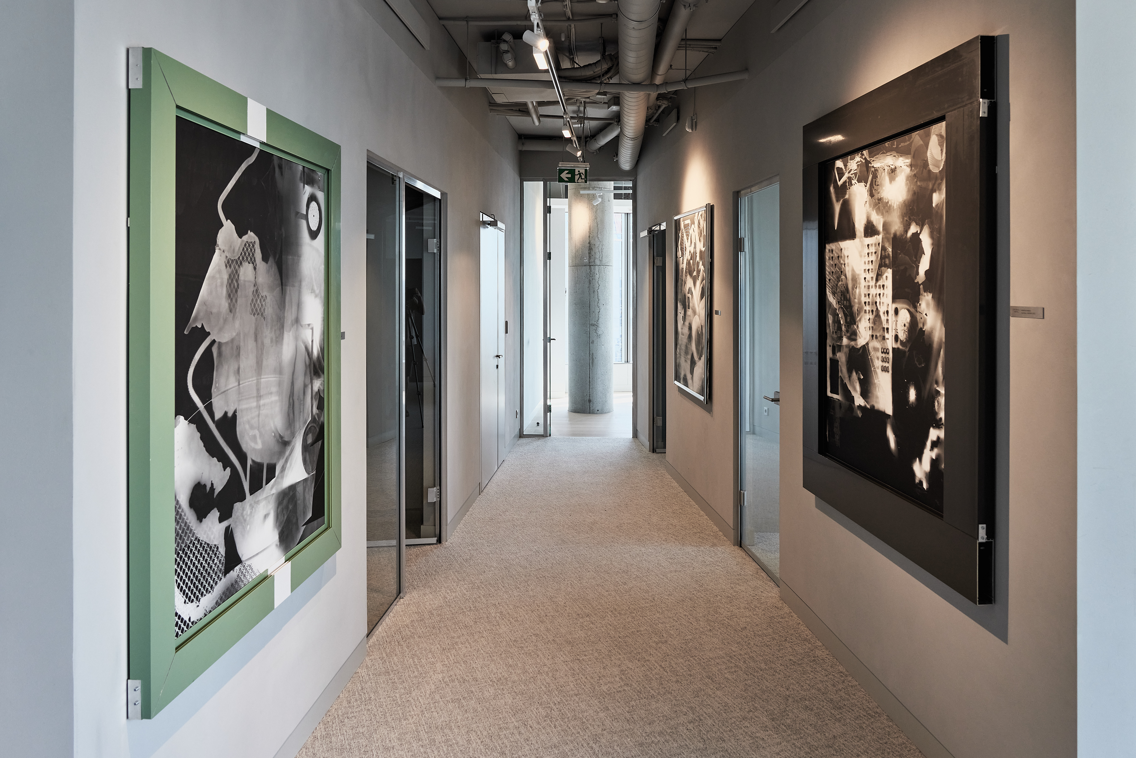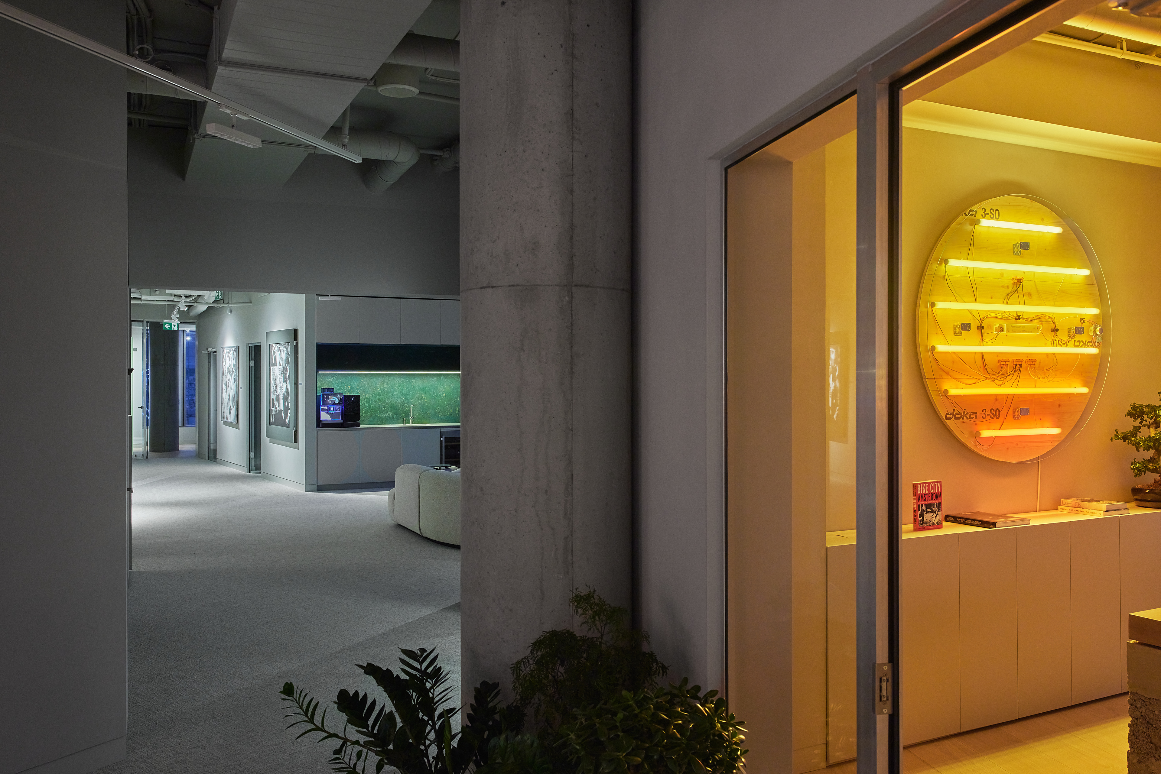 The interior of the Demus Asset Management office, designed by Heima architects, draws inspiration from an art gallery, combining concrete, stainless steel, and wood to create a refined and creative atmosphere. The spacious reception area, resembling a cozy living room, offers panoramic views of the capital, while most workstations are in private offices, with one open workspace connected to the reception. The sloping ARTERY building’s facade posed architectural challenges, resulting in asymmetrical spaces and artistic corridor designs, with small windows placed unpredictably to enhance natural light. Custom-designed furniture, including concrete tables, wooden chairs, and a monumental rock-like reception desk of concrete and stainless steel, reflects both functionality and artistic expression. In the director’s office, a 600 kg T-shaped table with laminated concrete legs, a cherry wood top, and a stainless-steel surface embodies craftsmanship and durability. Lighting highlights both artwork and workspaces, while light grey switches and sockets blend seamlessly into the minimalist design, creating a cohesive, sophisticated environment that aligns with the company’s vision.