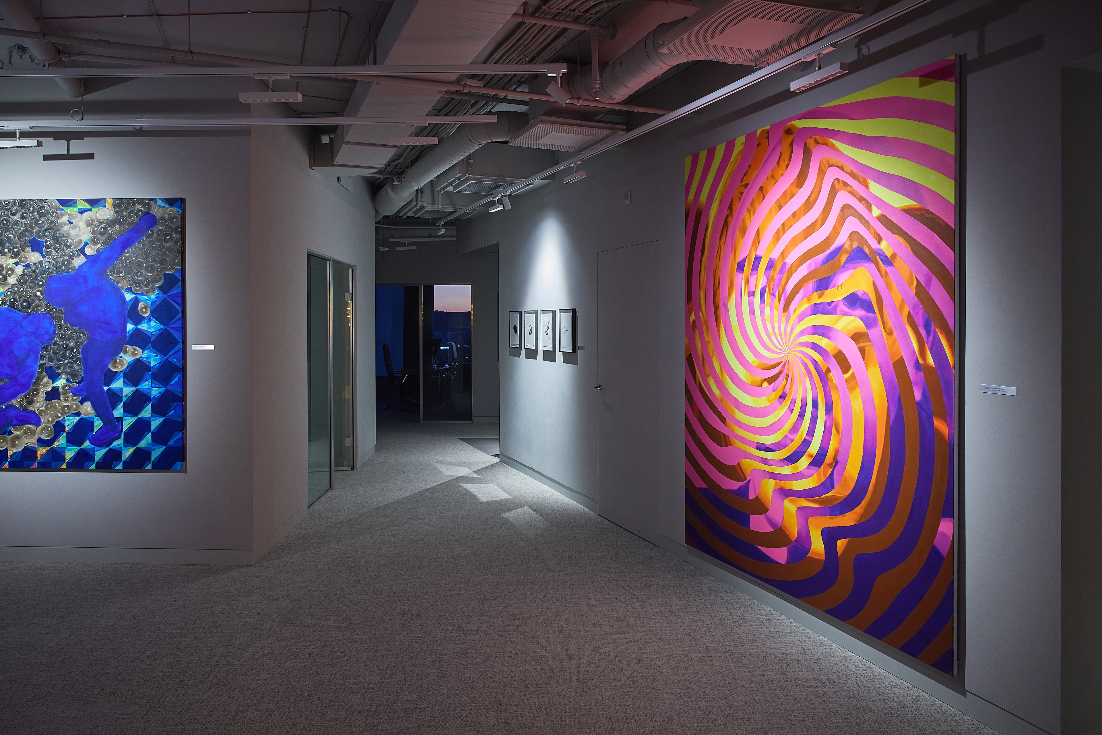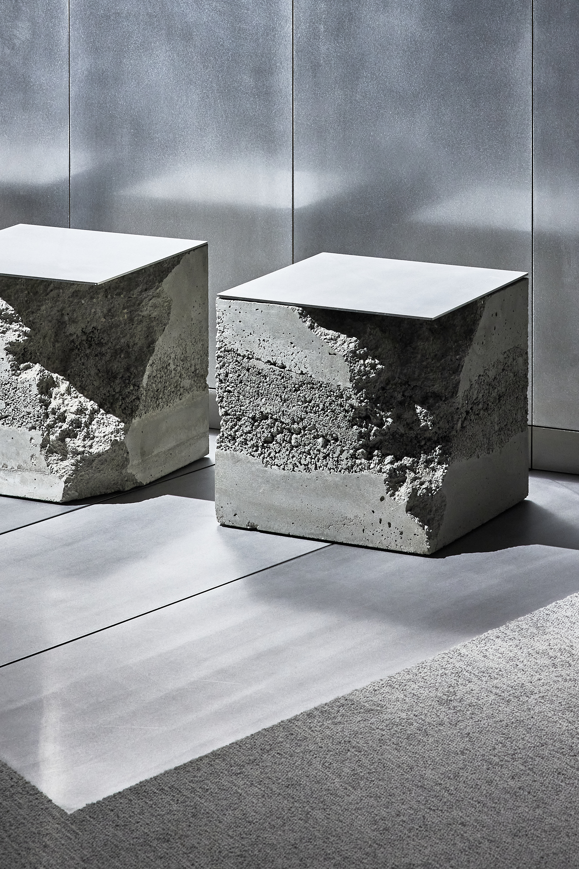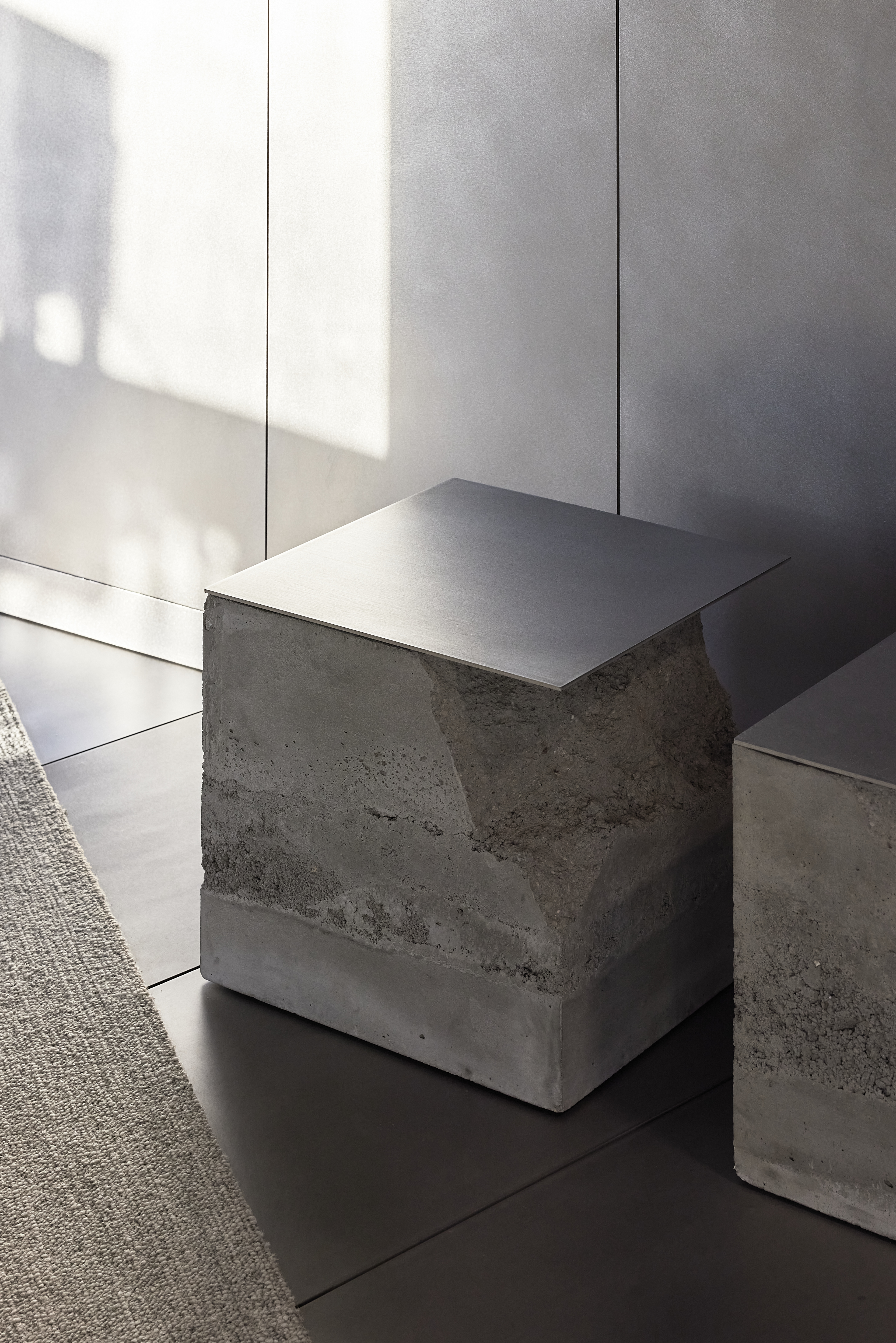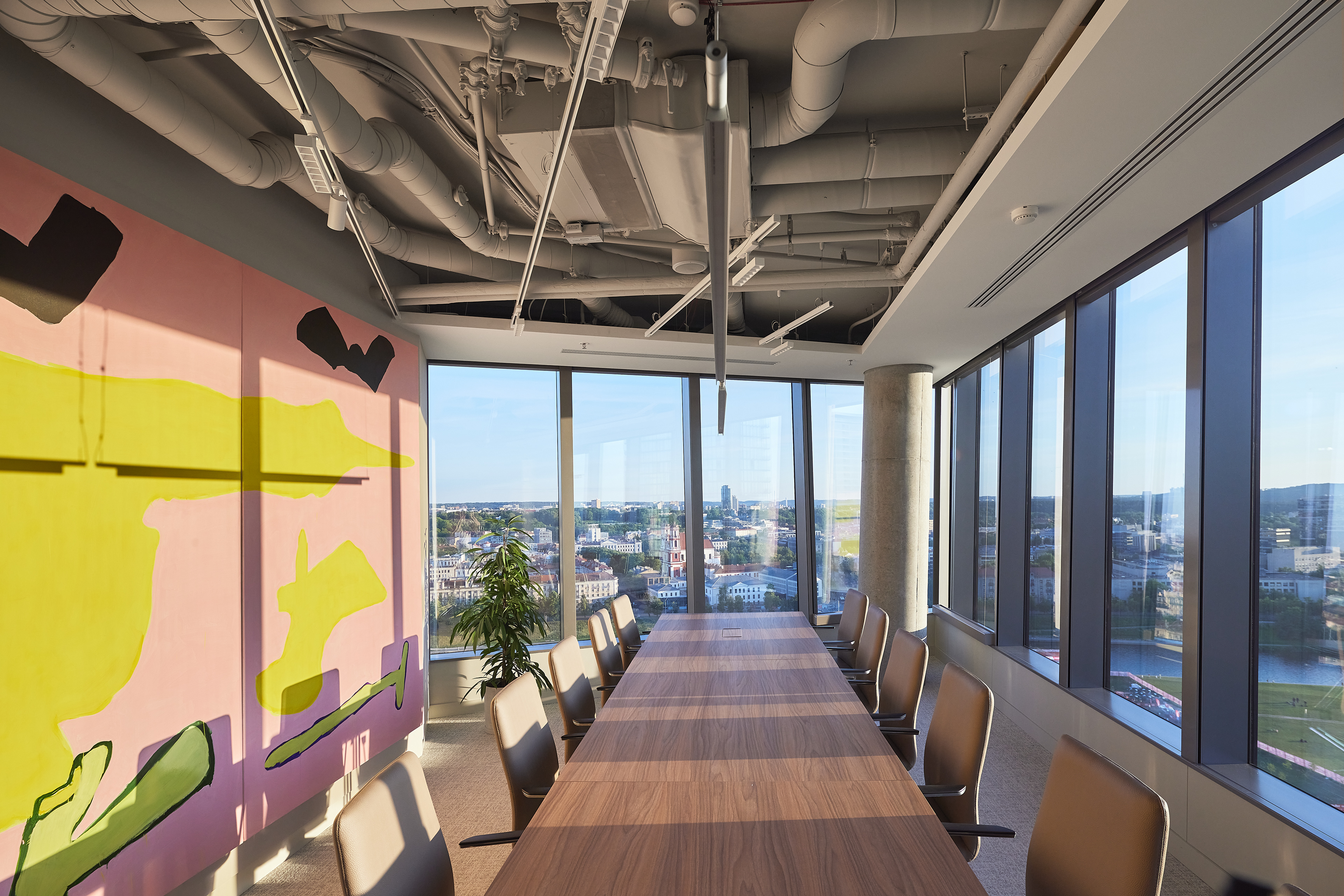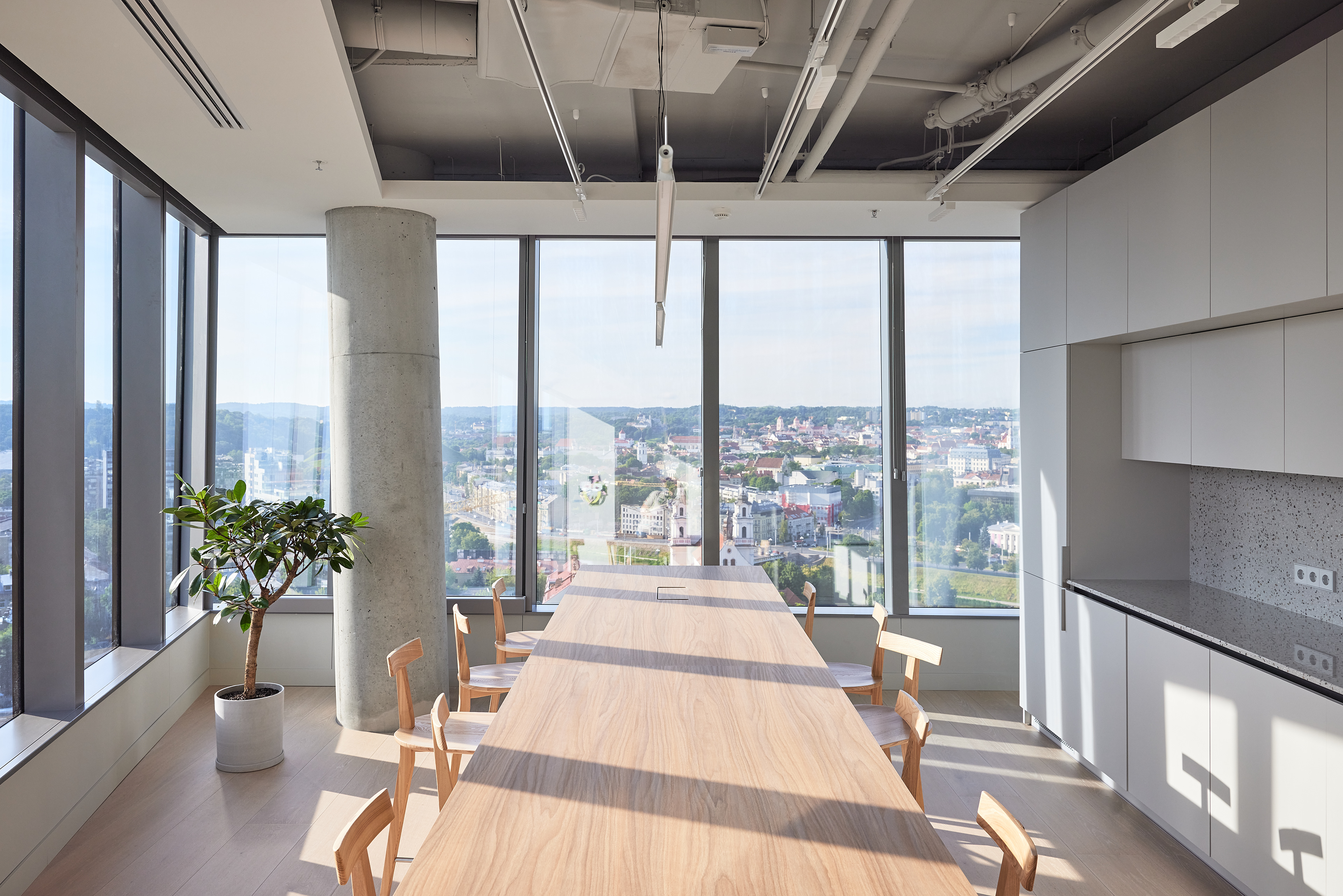 The interior of the Demus Asset Management office, designed by Heima architects, draws inspiration from an art gallery, combining concrete, stainless steel, and wood to create a refined and creative atmosphere. The spacious reception area, resembling a cozy living room, offers panoramic views of the capital, while most workstations are in private offices, with one open workspace connected to the reception. The sloping ARTERY building’s facade posed architectural challenges, resulting in asymmetrical spaces and artistic corridor designs, with small windows placed unpredictably to enhance natural light. Custom-designed furniture, including concrete tables, wooden chairs, and a monumental rock-like reception desk of concrete and stainless steel, reflects both functionality and artistic expression. In the director’s office, a 600 kg T-shaped table with laminated concrete legs, a cherry wood top, and a stainless-steel surface embodies craftsmanship and durability. Lighting highlights both artwork and workspaces, while light grey switches and sockets blend seamlessly into the minimalist design, creating a cohesive, sophisticated environment that aligns with the company’s vision.