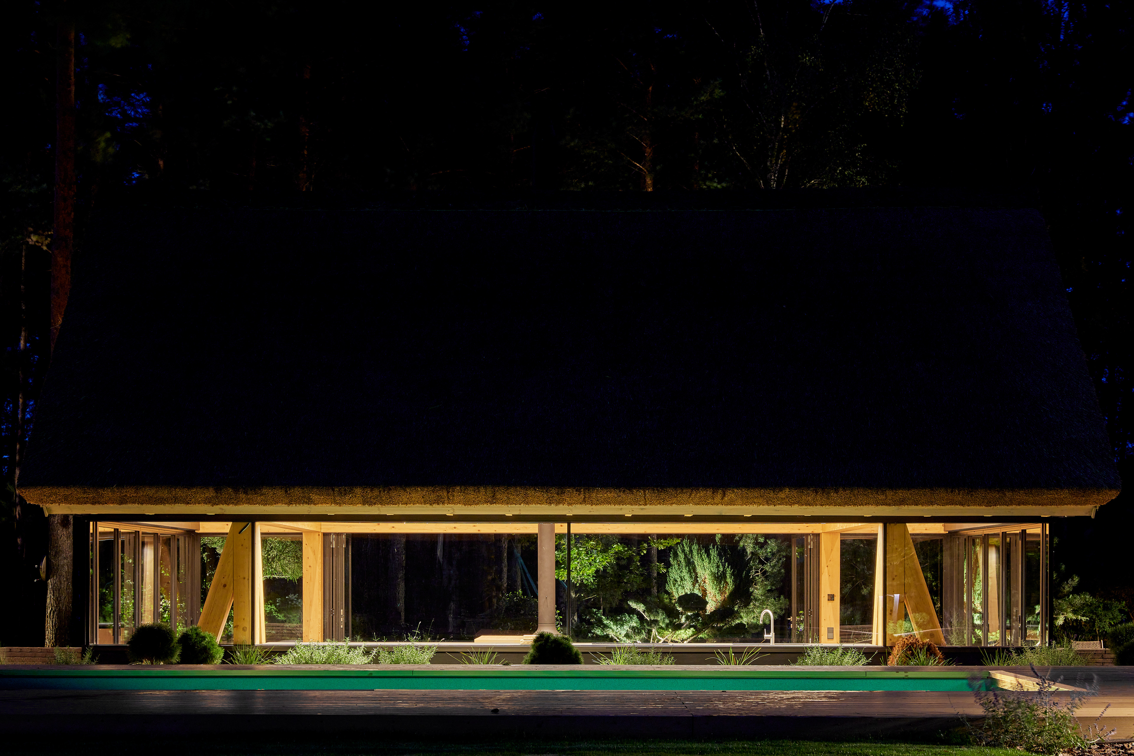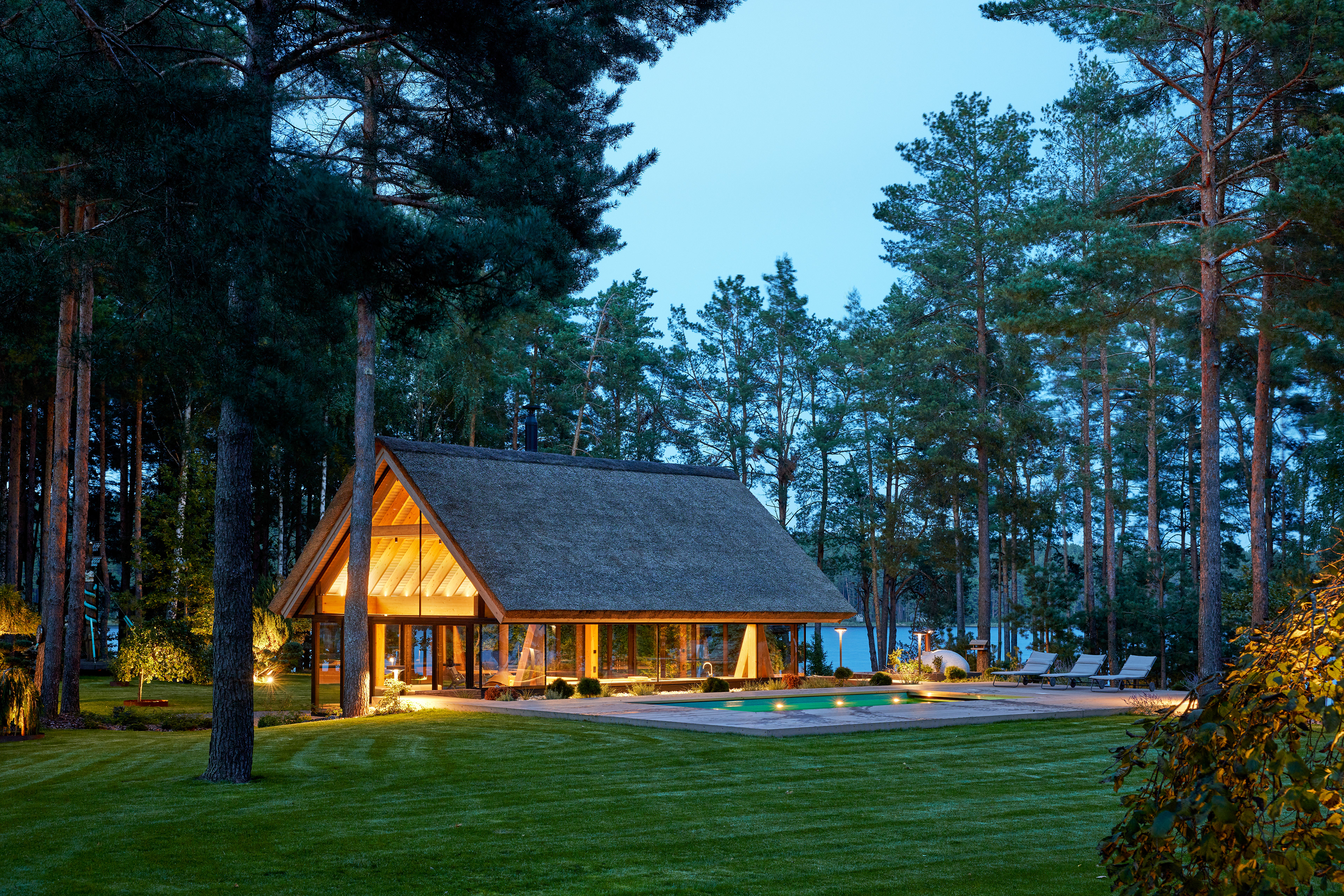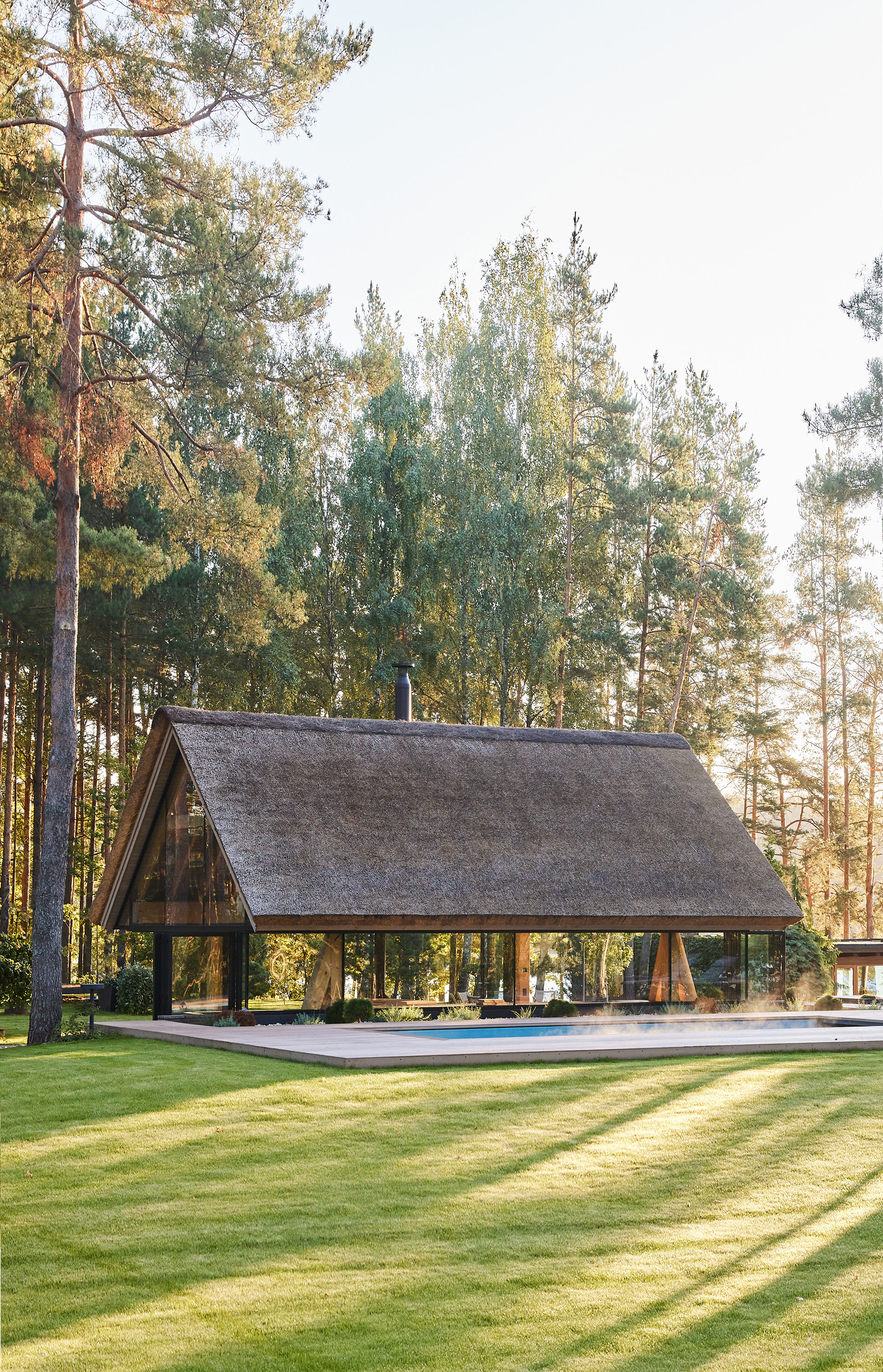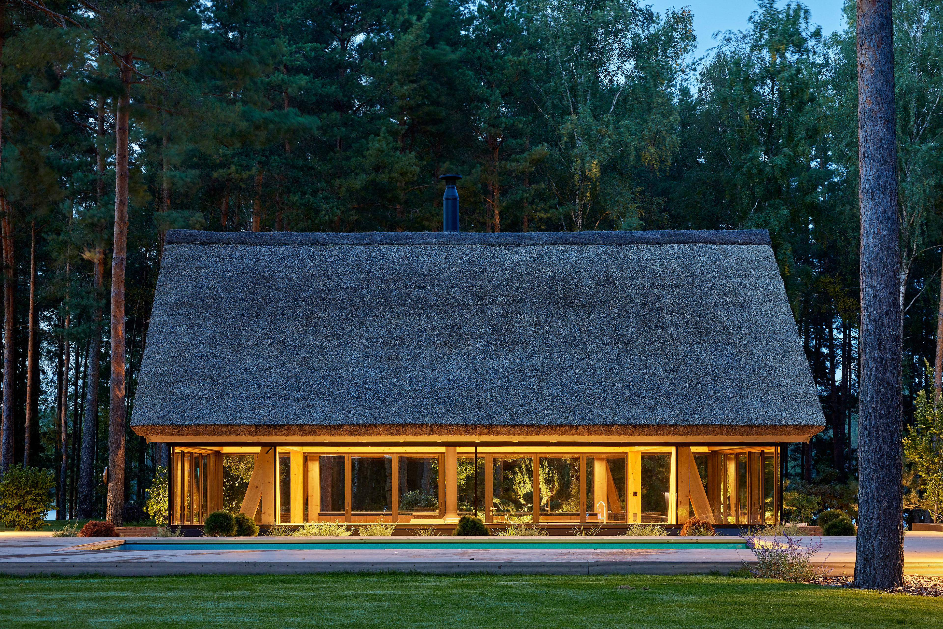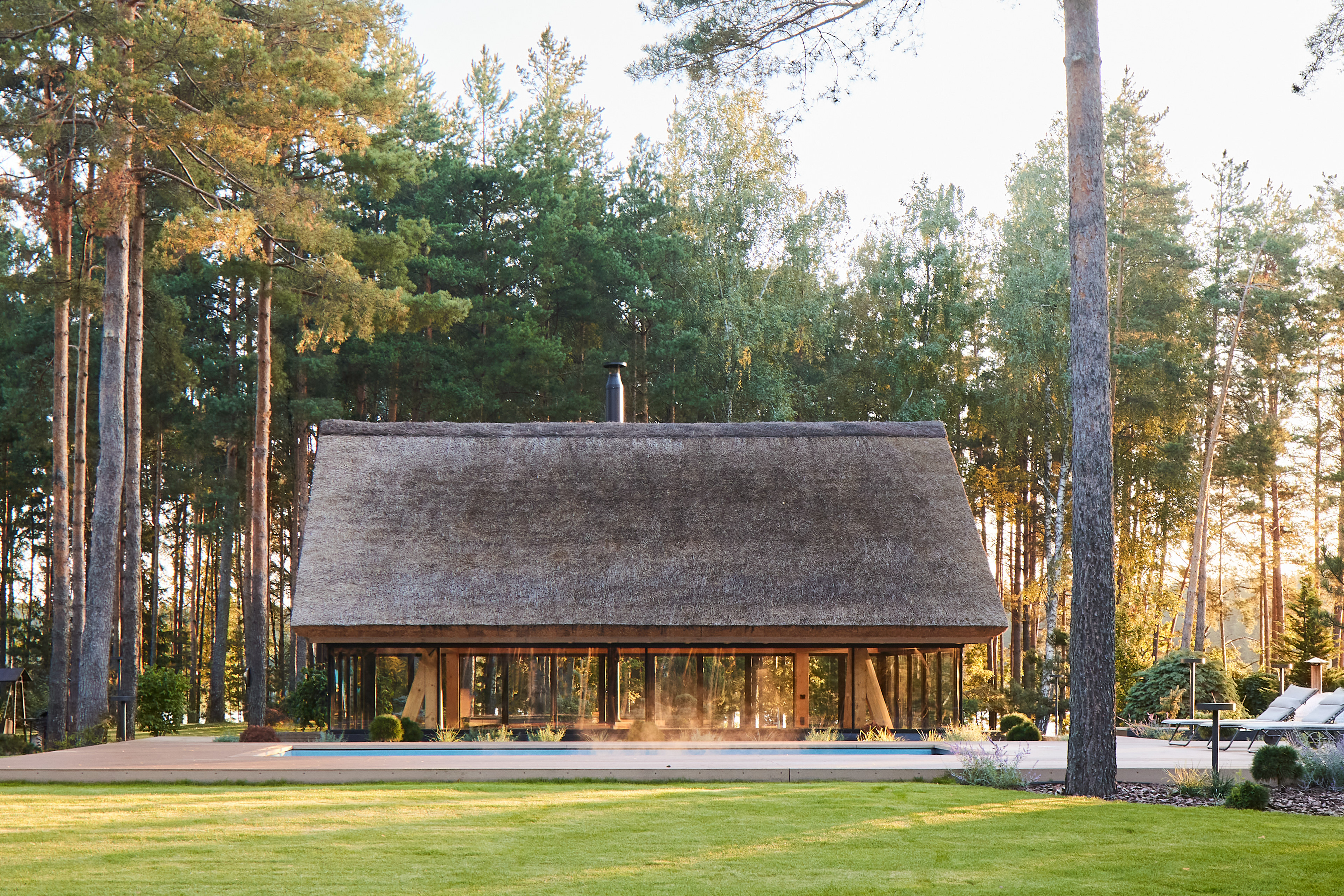 Surrounded by forest, a pool house is built near the lake. It complements the existing complex of several houses. The surrounding landscape clearly dictates the architectural form of the Lithuanian rural hut. The archetypal double sloped roof acts as an interior element and contrasts with the large windows that create a sense of transparency. The compact rectangular perimeter blends naturally into the landscape, respecting the surrounding environment. Two different silhouettes of this building can be seen throughout the day and night. The goal of the day vision is to blend this space into the context of surrounding nature as smoothly as possible. Night vision reveals the contemporary inside of the building. The dark outside contrast with illuminated see-through interior spaces emphasizing furniture shapes and textures. The exterior is formed via natural materials and colors - reed roof, paths of granite and wooden space surrounding the pool. The grey-brown color palette of the building follows “no-boundary with nature” idea. Internal spaces contrasting with the modest external shapes are revealed through a modern interior that follows the same color-material motif. On the one hand, the close-to-the-nature wood theme and large wide-opening windows let the line between outside and inside fade, on the other – creates a glassy, weightlessness, openness feeling that is more common to modern interiors. Glass partitions are also useful during seasonal changes. People can enjoy using the pool house all year round. One of the most unique elements of the pool house is the exposed wooden structure, which dominates the interior space. Massive tripod columns, 60-centimetre height beams and repetitive roof trusses not only create an atmosphere for the inside but also remind of ethnic Lithuanian house building tradition. The adjacent swimming pool complements the construction of the house. The higher poolside horizon line creates an empty space feeling as none of the furniture elements can be seen while swimming.