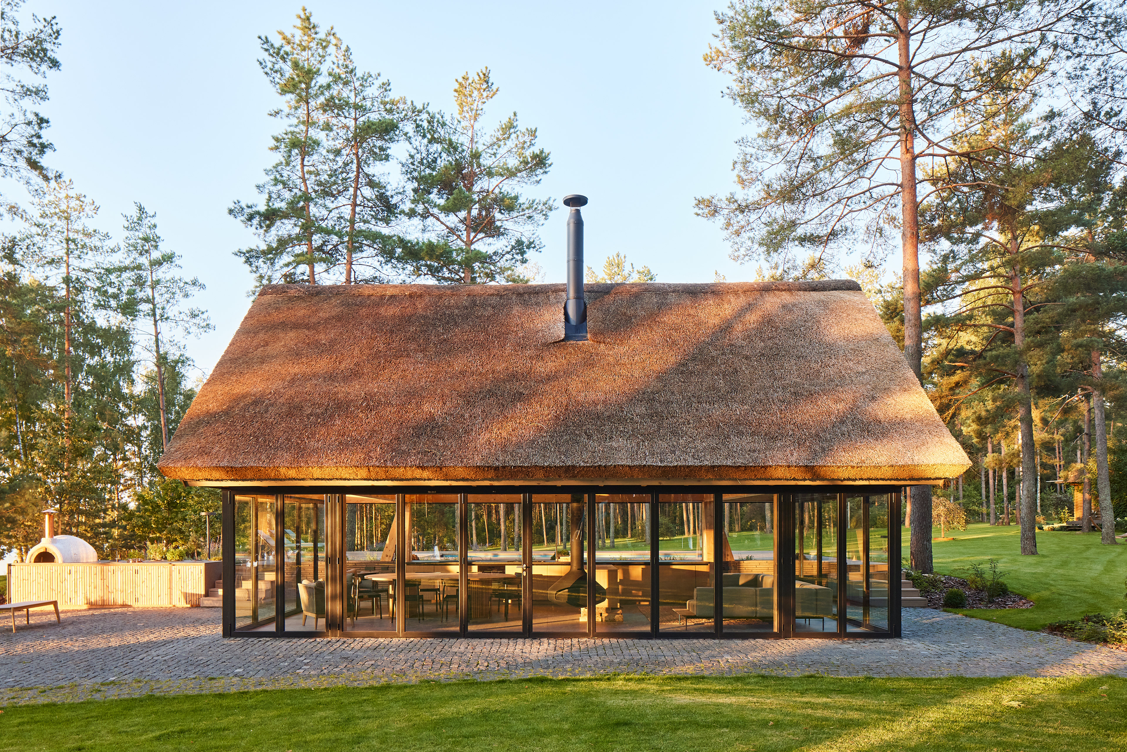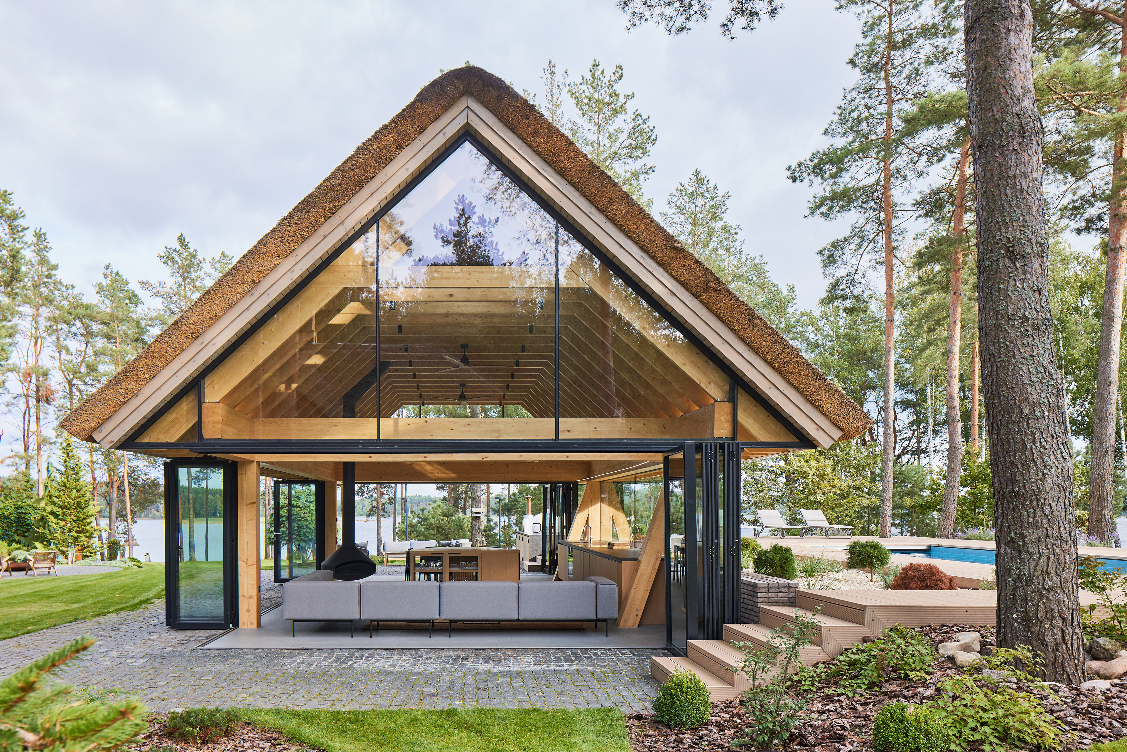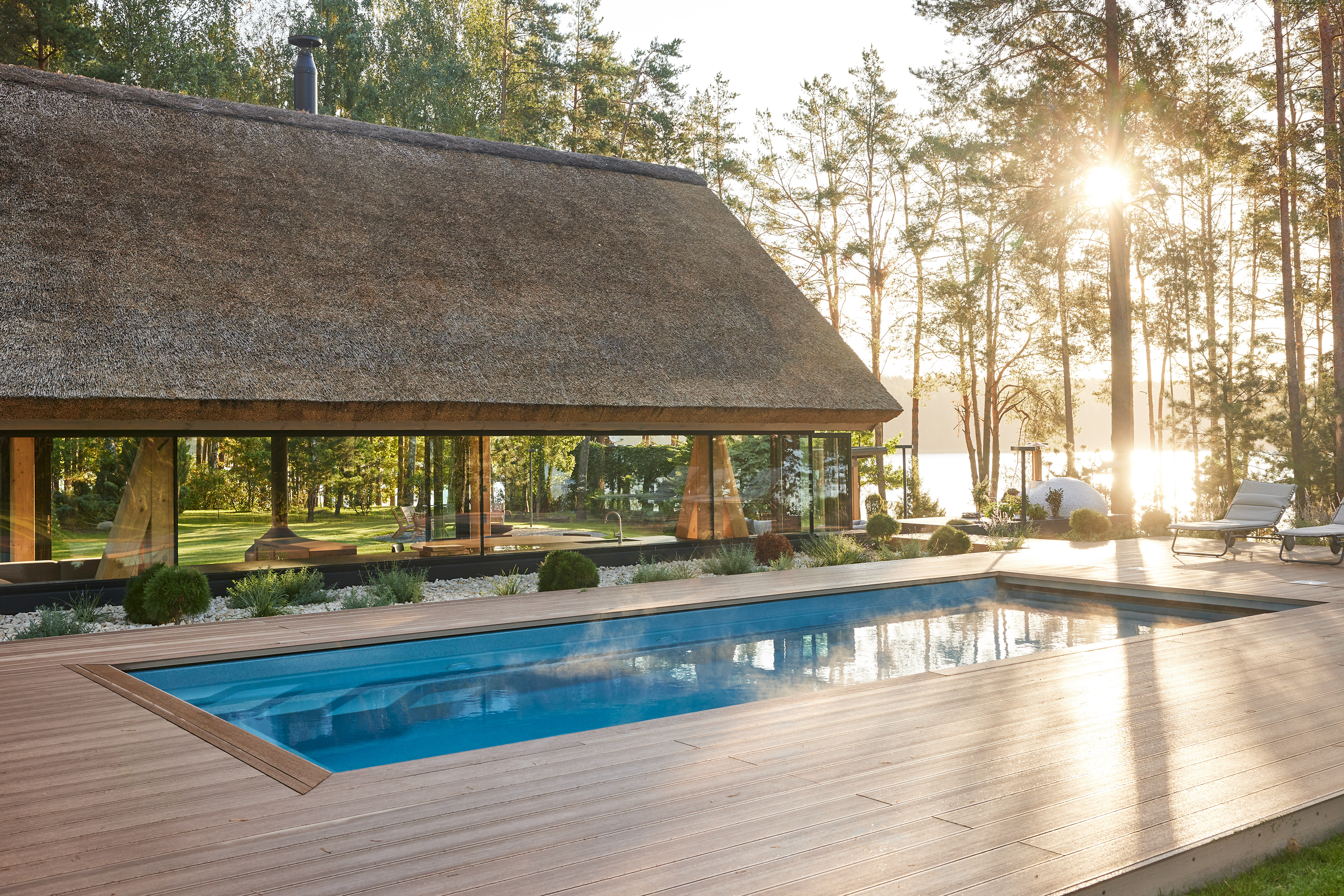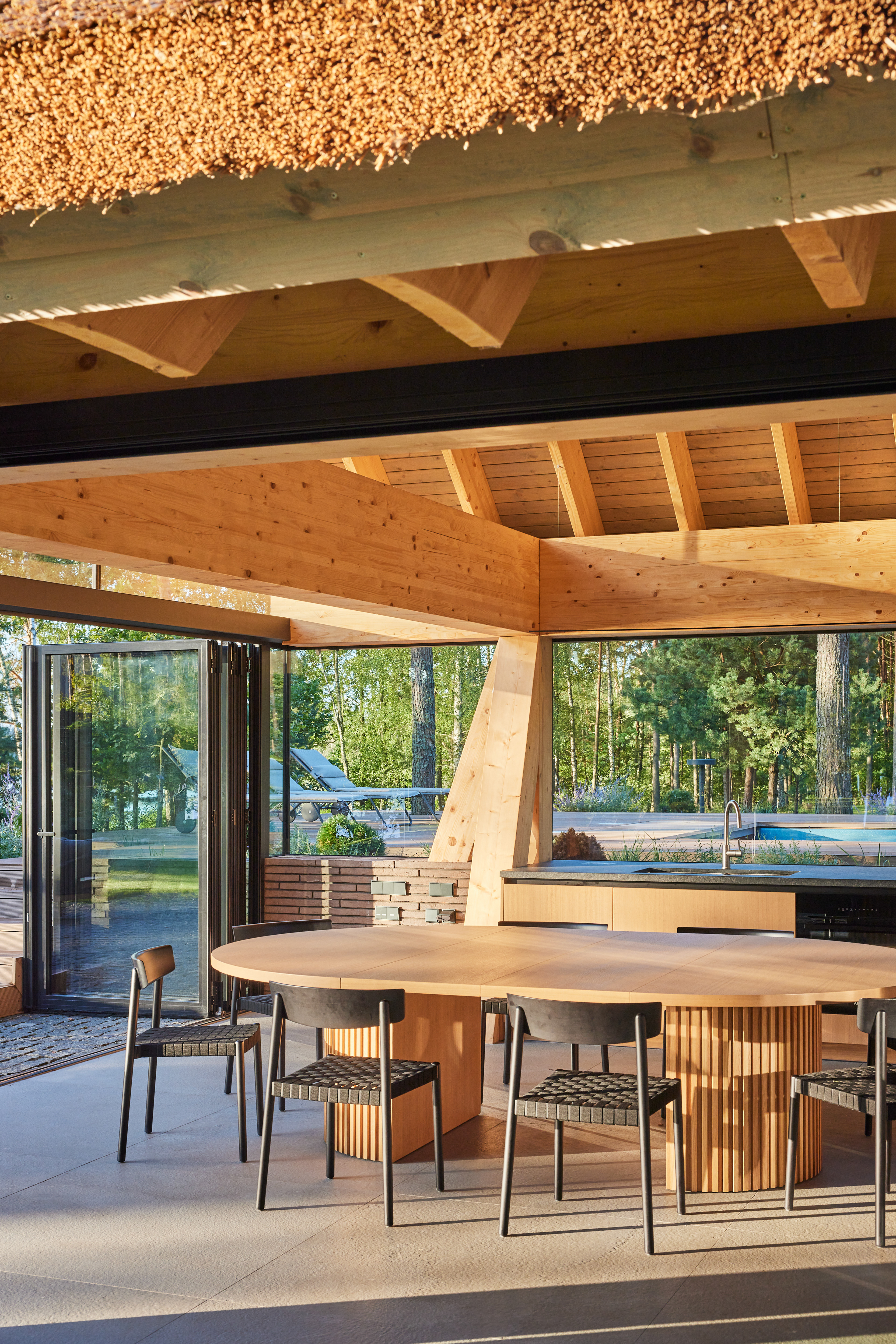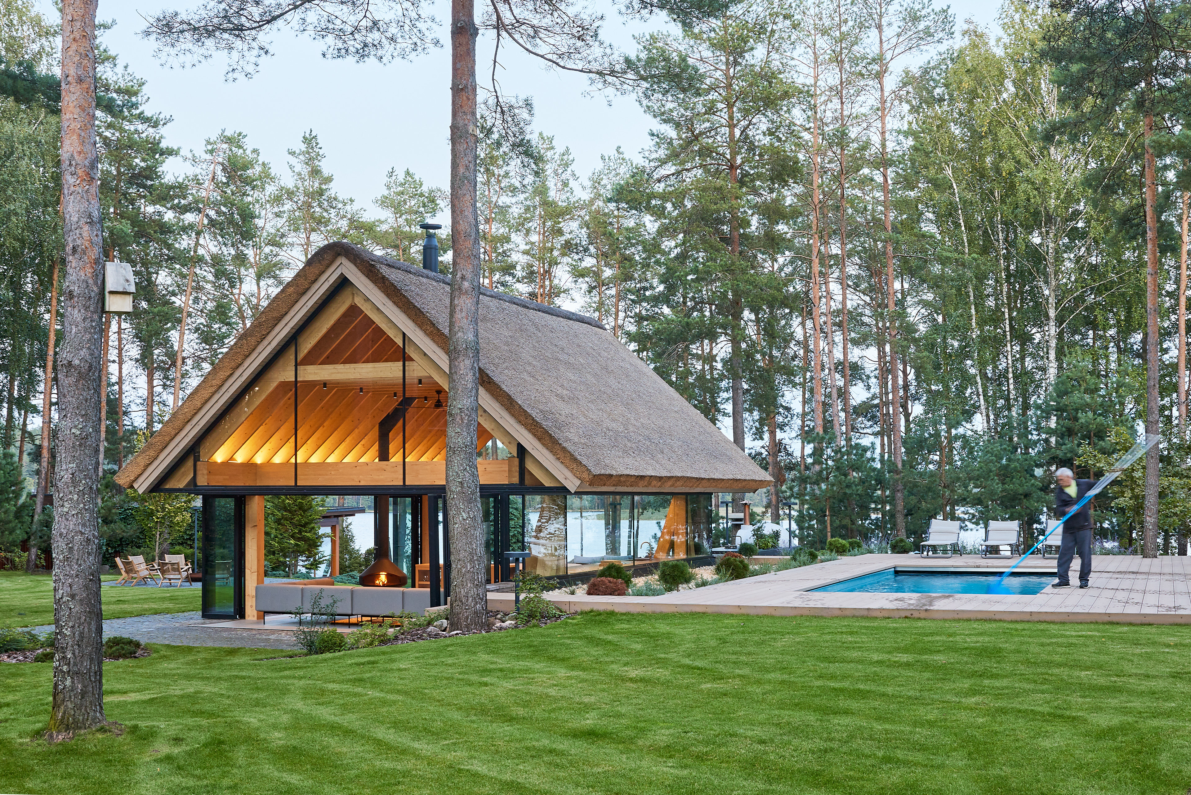 Surrounded by forest, a pool house is built near the lake. It complements the existing complex of several houses. The surrounding landscape clearly dictates the architectural form of the Lithuanian rural hut. The archetypal double sloped roof acts as an interior element and contrasts with the large windows that create a sense of transparency. The compact rectangular perimeter blends naturally into the landscape, respecting the surrounding environment. Two different silhouettes of this building can be seen throughout the day and night. The goal of the day vision is to blend this space into the context of surrounding nature as smoothly as possible. Night vision reveals the contemporary inside of the building. The dark outside contrast with illuminated see-through interior spaces emphasizing furniture shapes and textures. The exterior is formed via natural materials and colors - reed roof, paths of granite and wooden space surrounding the pool. The grey-brown color palette of the building follows “no-boundary with nature” idea. Internal spaces contrasting with the modest external shapes are revealed through a modern interior that follows the same color-material motif. On the one hand, the close-to-the-nature wood theme and large wide-opening windows let the line between outside and inside fade, on the other – creates a glassy, weightlessness, openness feeling that is more common to modern interiors. Glass partitions are also useful during seasonal changes. People can enjoy using the pool house all year round. One of the most unique elements of the pool house is the exposed wooden structure, which dominates the interior space. Massive tripod columns, 60-centimetre height beams and repetitive roof trusses not only create an atmosphere for the inside but also remind of ethnic Lithuanian house building tradition. The adjacent swimming pool complements the construction of the house. The higher poolside horizon line creates an empty space feeling as none of the furniture elements can be seen while swimming.