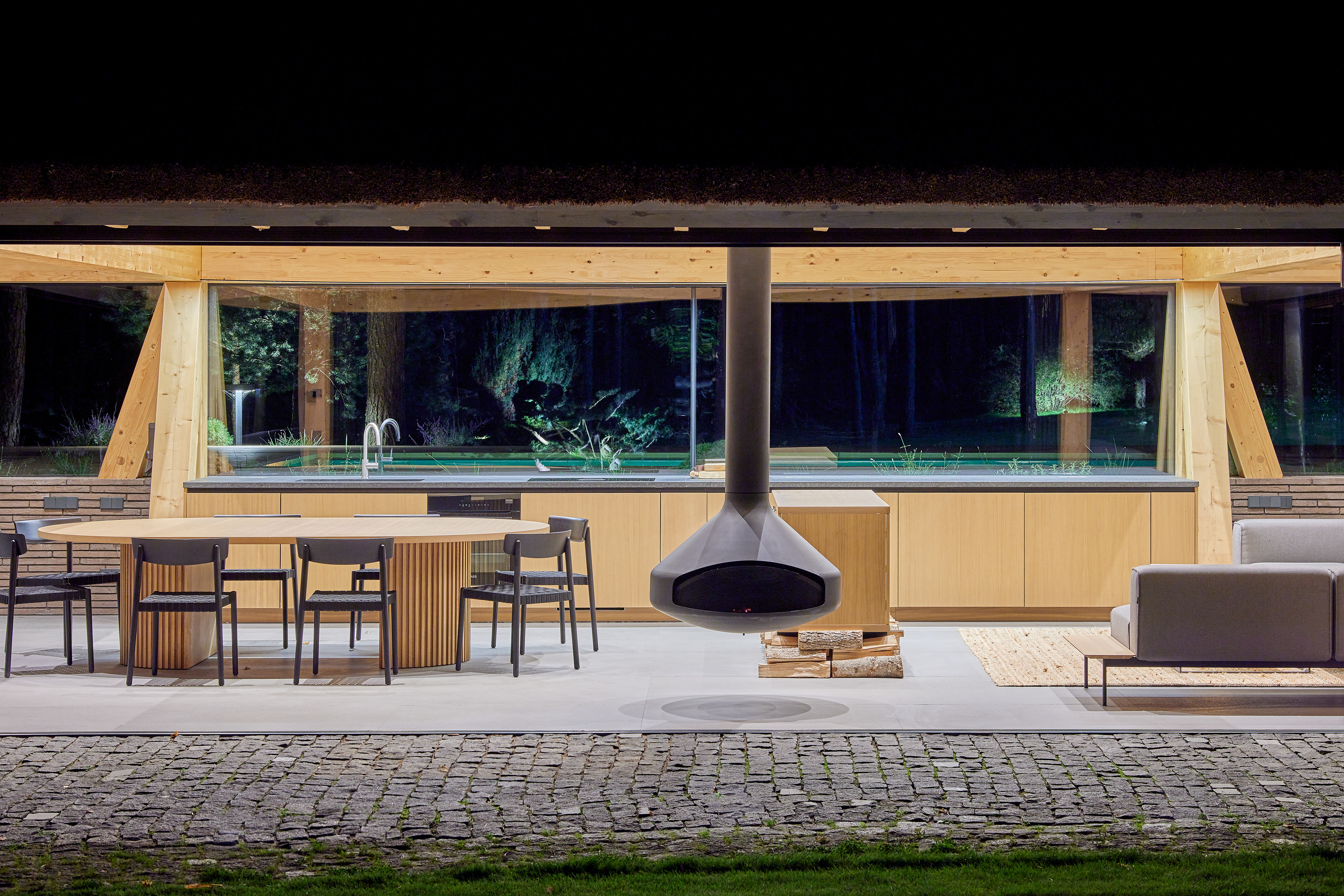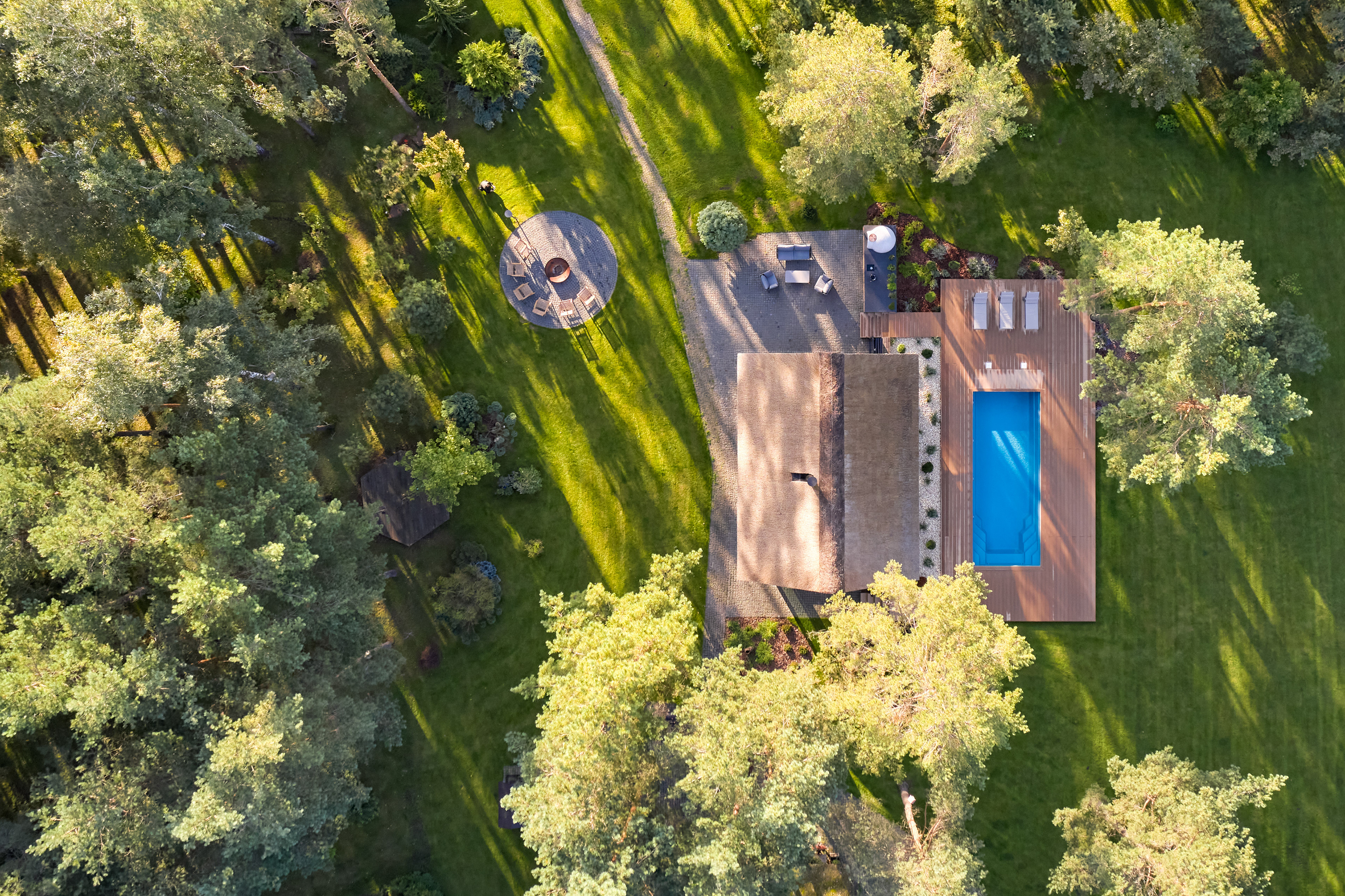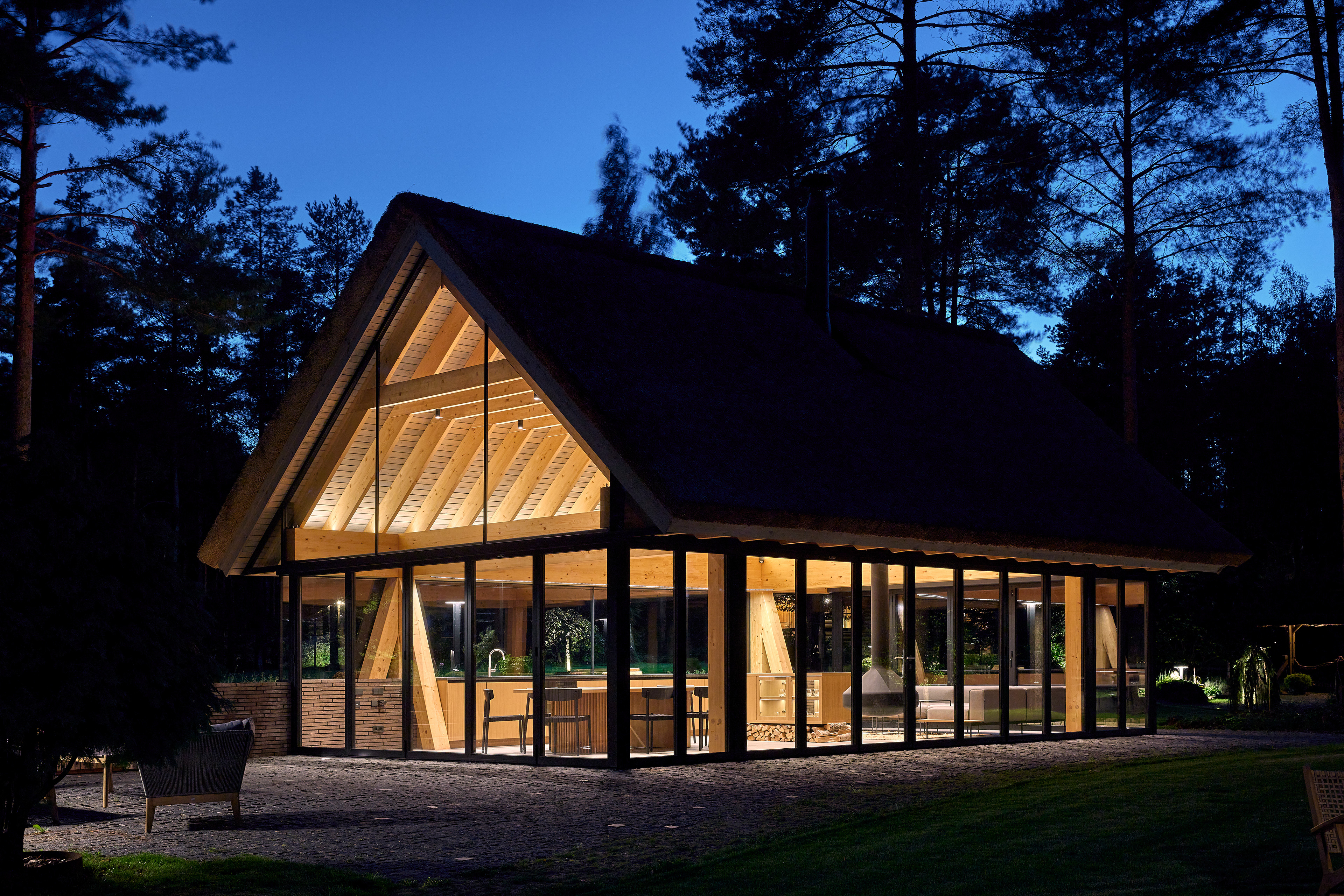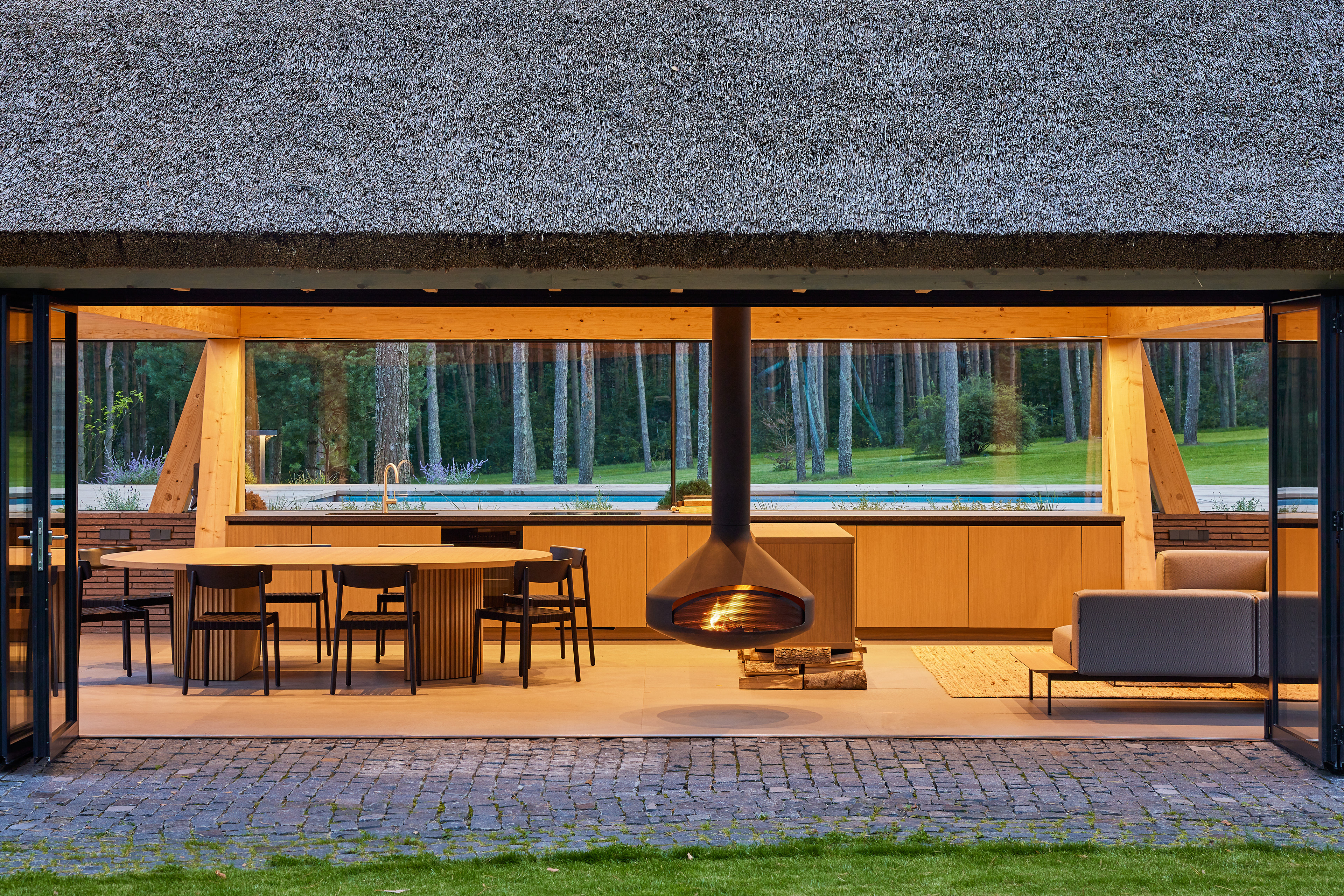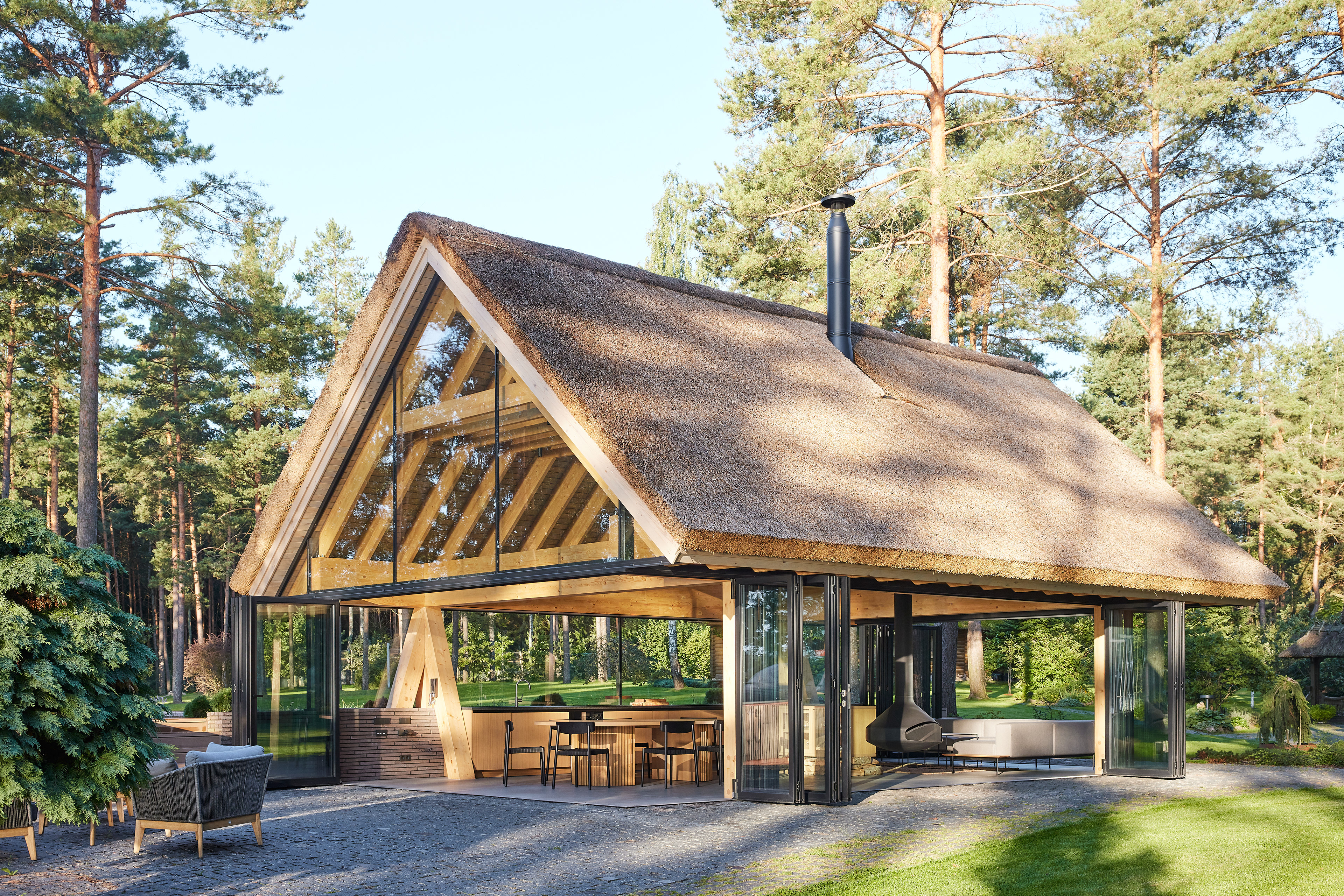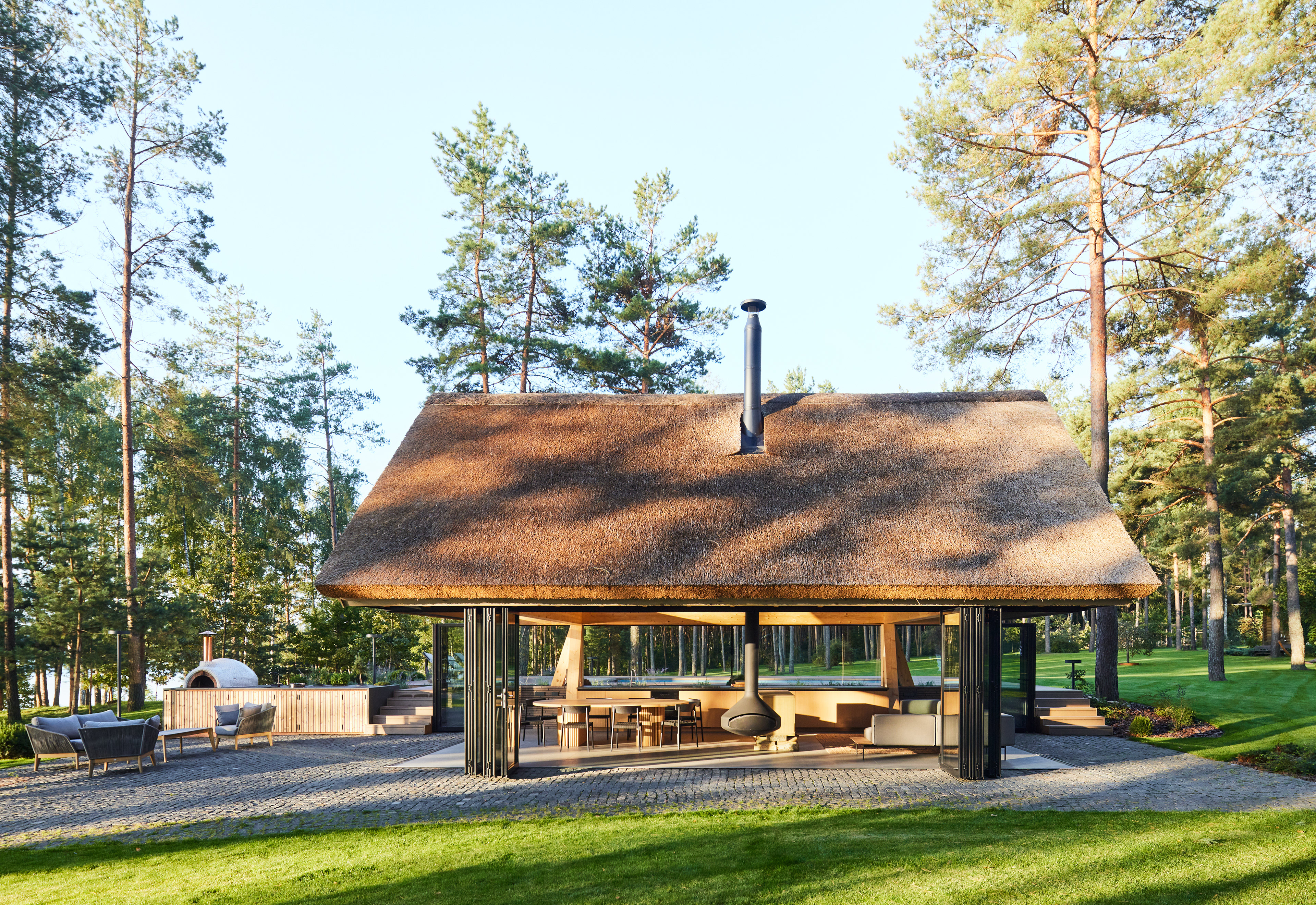 Surrounded by forest, a pool house is built near the lake. It complements the existing complex of several houses. The surrounding landscape clearly dictates the architectural form of the Lithuanian rural hut. The archetypal double sloped roof acts as an interior element and contrasts with the large windows that create a sense of transparency. The compact rectangular perimeter blends naturally into the landscape, respecting the surrounding environment. Two different silhouettes of this building can be seen throughout the day and night. The goal of the day vision is to blend this space into the context of surrounding nature as smoothly as possible. Night vision reveals the contemporary inside of the building. The dark outside contrast with illuminated see-through interior spaces emphasizing furniture shapes and textures. The exterior is formed via natural materials and colors - reed roof, paths of granite and wooden space surrounding the pool. The grey-brown color palette of the building follows “no-boundary with nature” idea. Internal spaces contrasting with the modest external shapes are revealed through a modern interior that follows the same color-material motif. On the one hand, the close-to-the-nature wood theme and large wide-opening windows let the line between outside and inside fade, on the other – creates a glassy, weightlessness, openness feeling that is more common to modern interiors. Glass partitions are also useful during seasonal changes. People can enjoy using the pool house all year round. One of the most unique elements of the pool house is the exposed wooden structure, which dominates the interior space. Massive tripod columns, 60-centimetre height beams and repetitive roof trusses not only create an atmosphere for the inside but also remind of ethnic Lithuanian house building tradition. The adjacent swimming pool complements the construction of the house. The higher poolside horizon line creates an empty space feeling as none of the furniture elements can be seen while swimming.