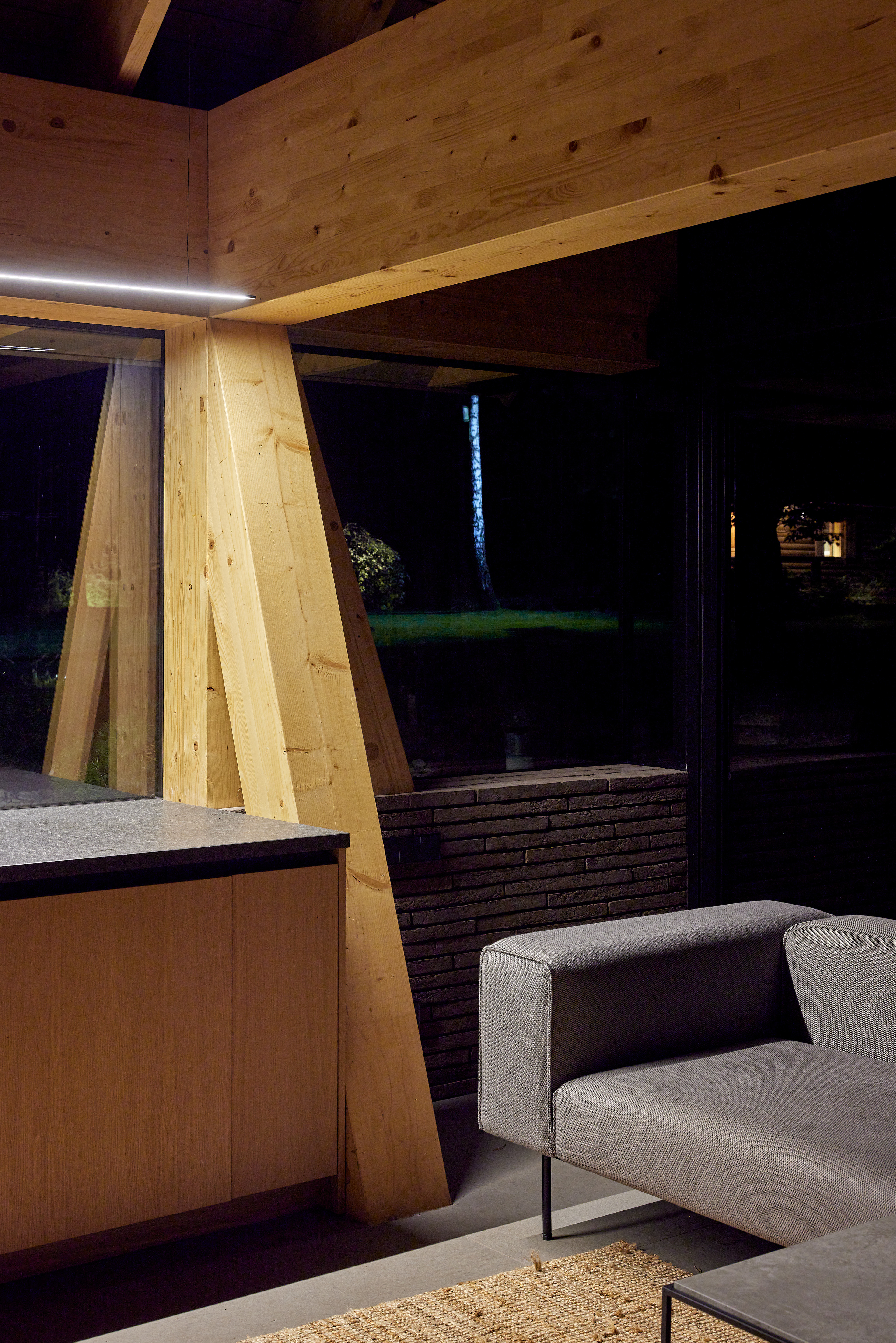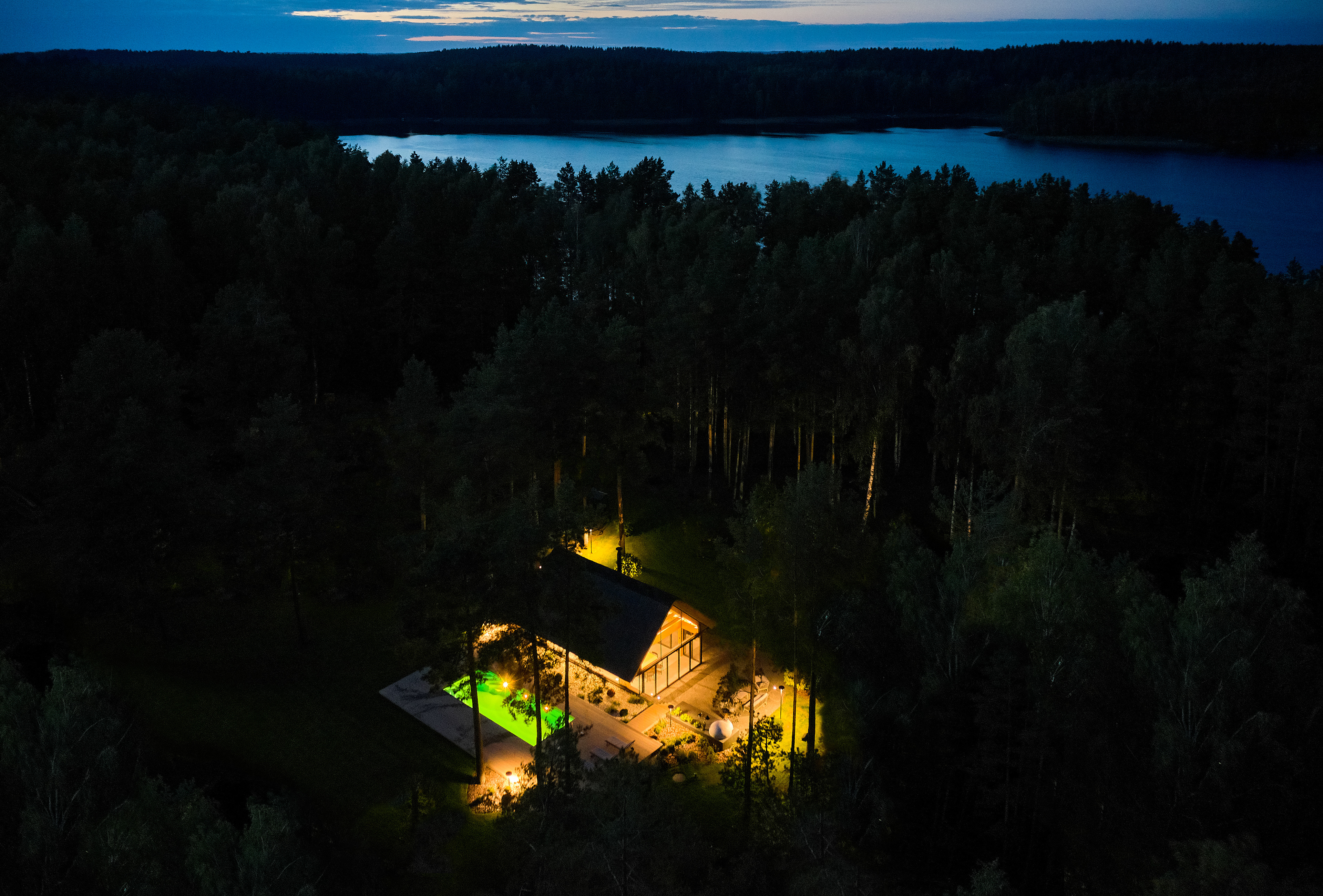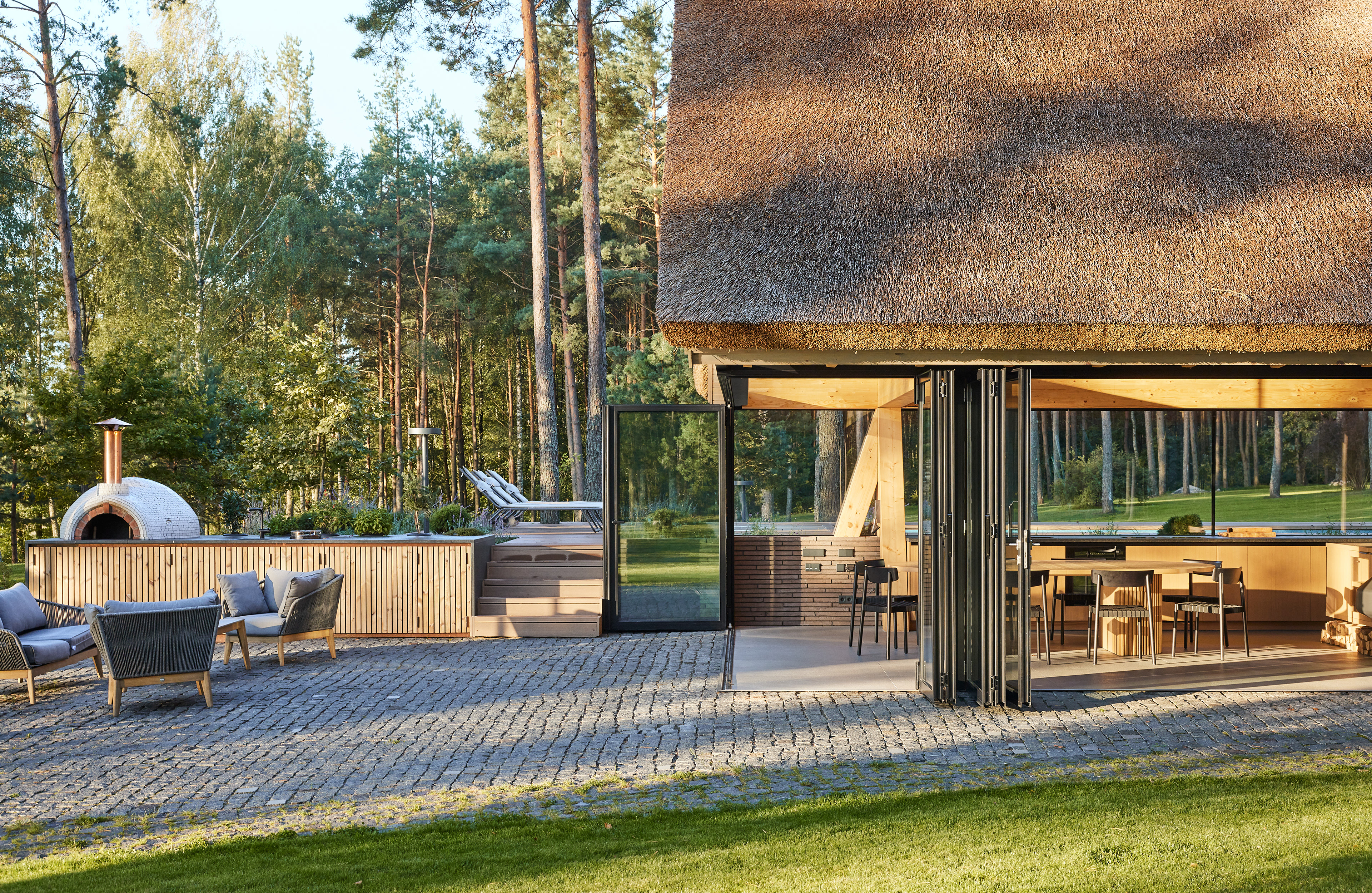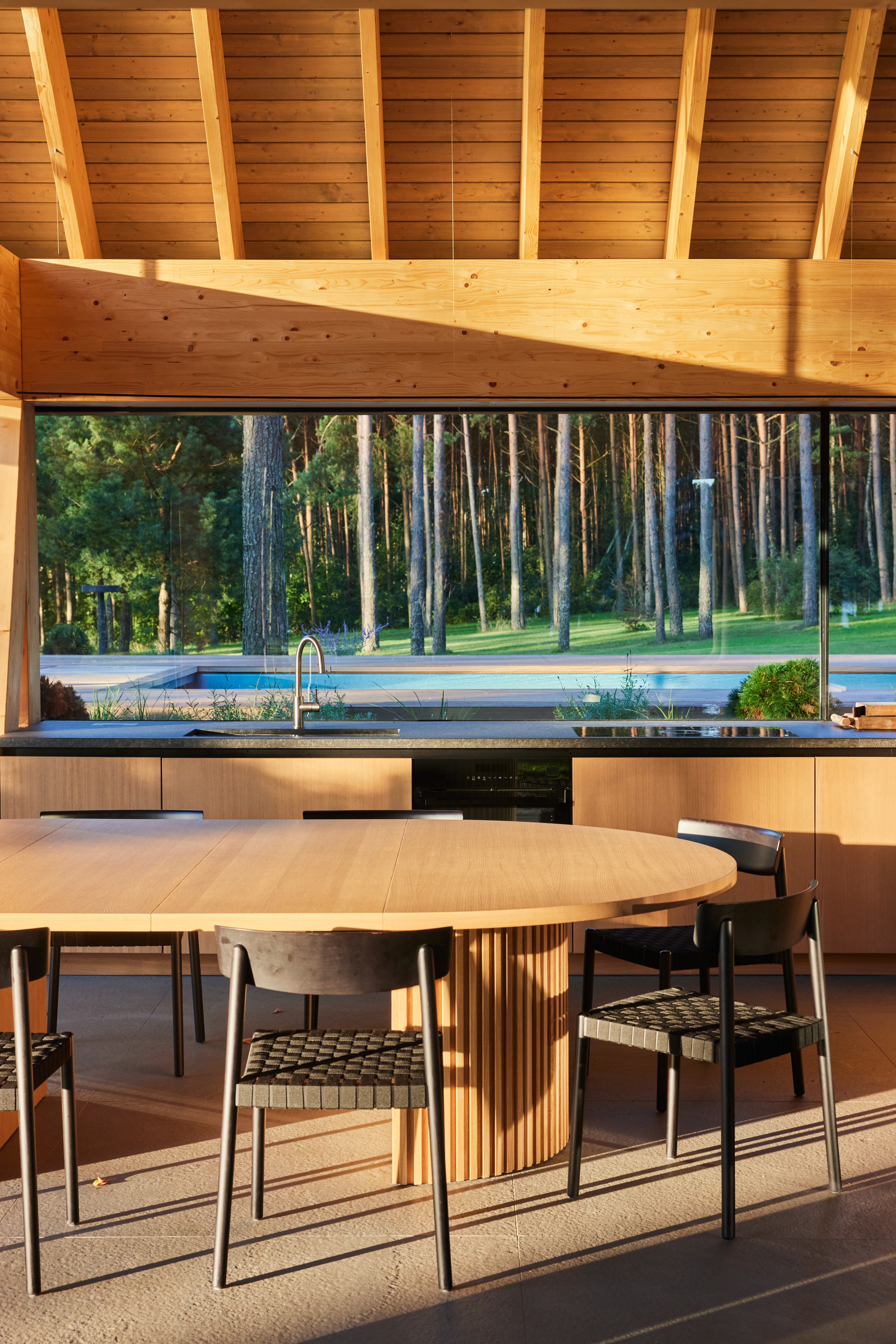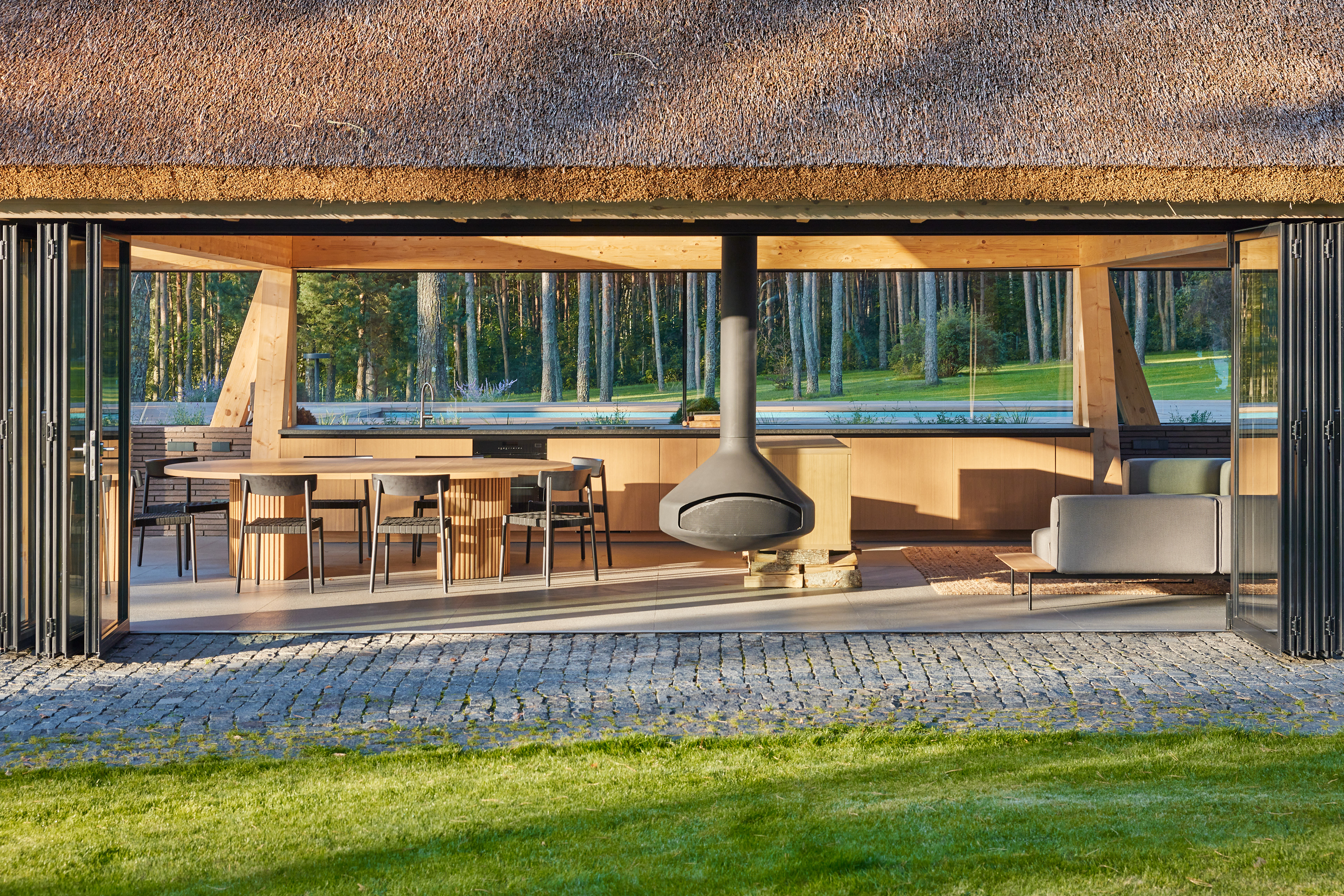 Surrounded by forest, a pool house is built near the lake. It complements the existing complex of several houses. The surrounding landscape clearly dictates the architectural form of the Lithuanian rural hut. The archetypal double sloped roof acts as an interior element and contrasts with the large windows that create a sense of transparency. The compact rectangular perimeter blends naturally into the landscape, respecting the surrounding environment. Two different silhouettes of this building can be seen throughout the day and night. The goal of the day vision is to blend this space into the context of surrounding nature as smoothly as possible. Night vision reveals the contemporary inside of the building. The dark outside contrast with illuminated see-through interior spaces emphasizing furniture shapes and textures. The exterior is formed via natural materials and colors - reed roof, paths of granite and wooden space surrounding the pool. The grey-brown color palette of the building follows “no-boundary with nature” idea. Internal spaces contrasting with the modest external shapes are revealed through a modern interior that follows the same color-material motif. On the one hand, the close-to-the-nature wood theme and large wide-opening windows let the line between outside and inside fade, on the other – creates a glassy, weightlessness, openness feeling that is more common to modern interiors. Glass partitions are also useful during seasonal changes. People can enjoy using the pool house all year round. One of the most unique elements of the pool house is the exposed wooden structure, which dominates the interior space. Massive tripod columns, 60-centimetre height beams and repetitive roof trusses not only create an atmosphere for the inside but also remind of ethnic Lithuanian house building tradition. The adjacent swimming pool complements the construction of the house. The higher poolside horizon line creates an empty space feeling as none of the furniture elements can be seen while swimming.
