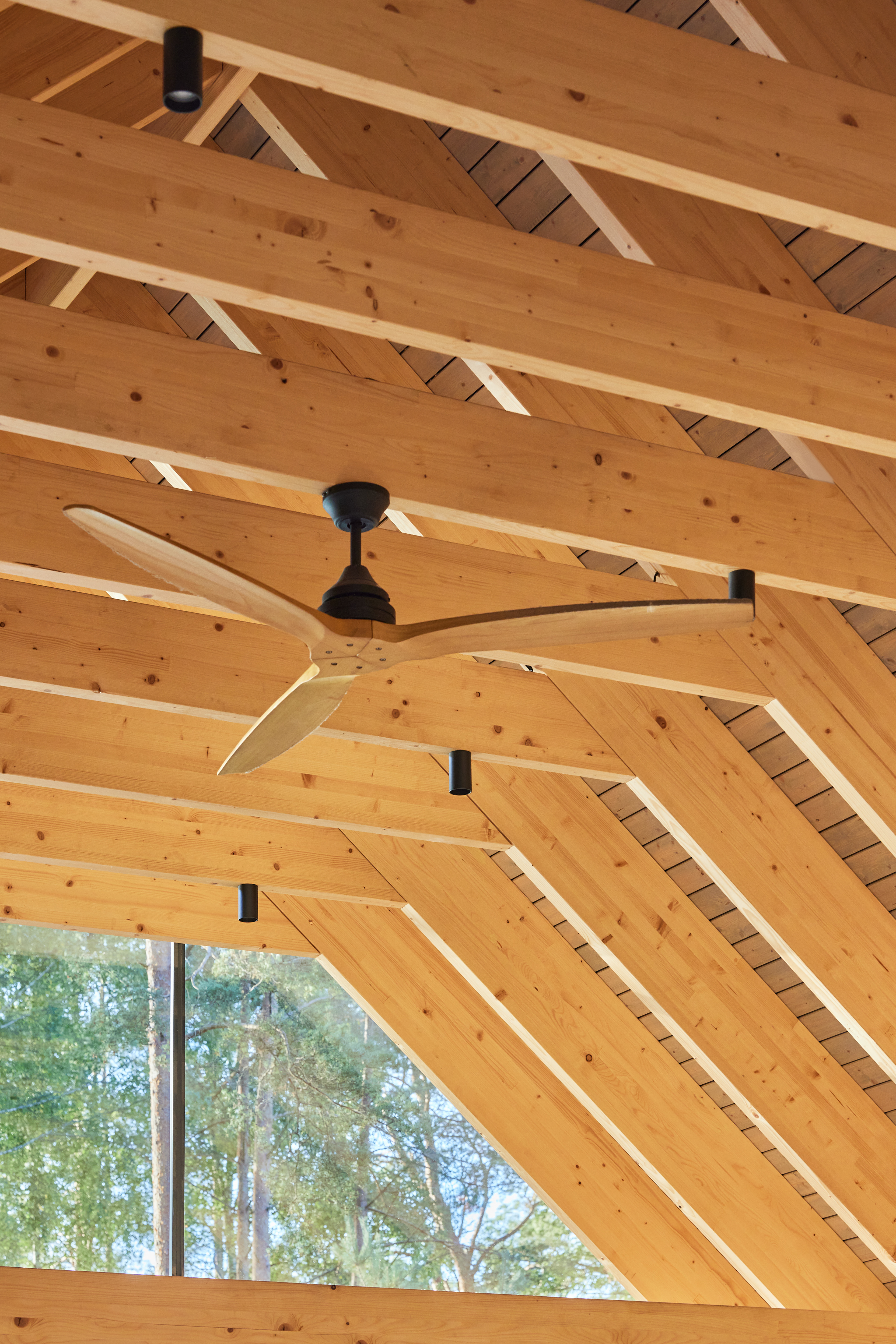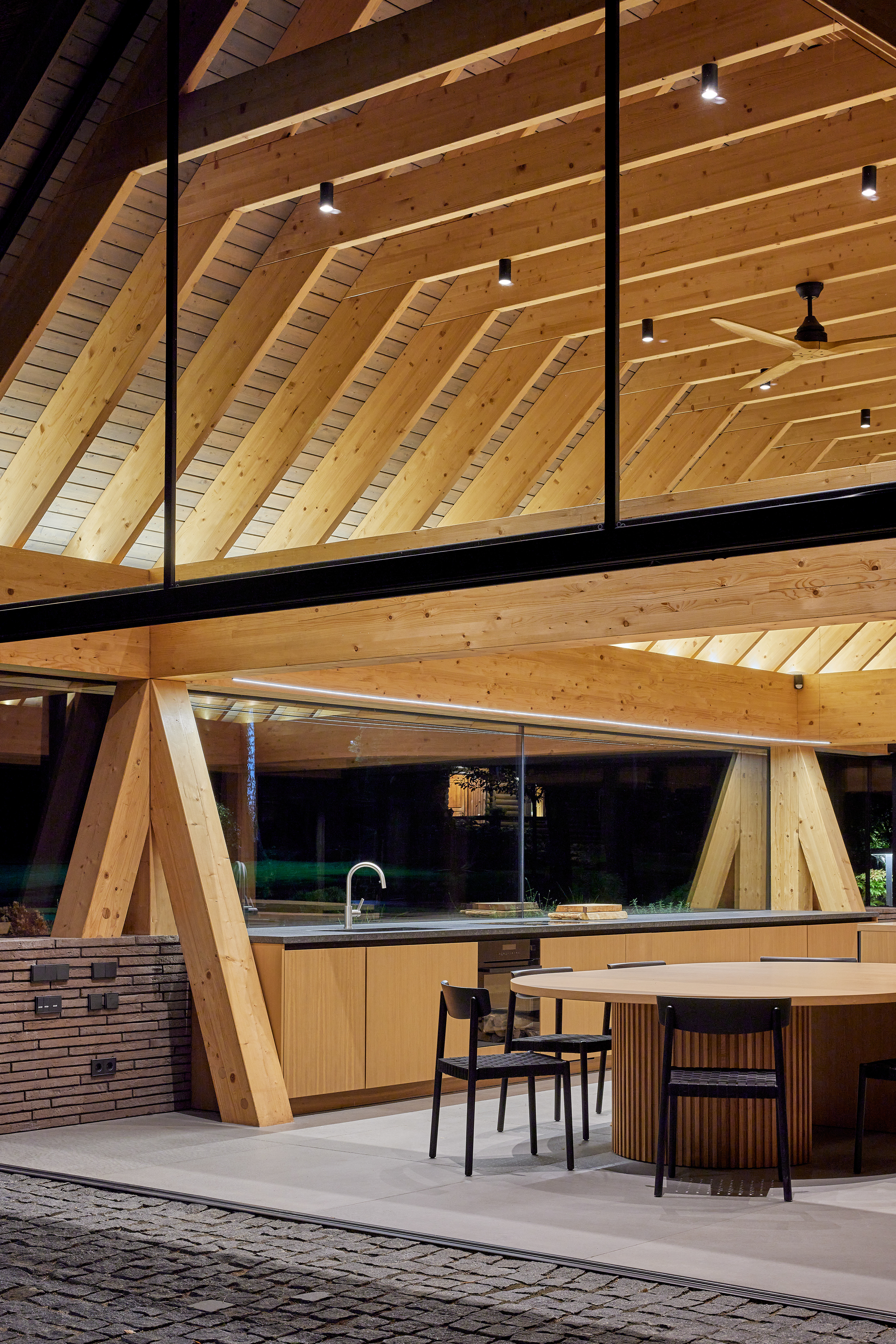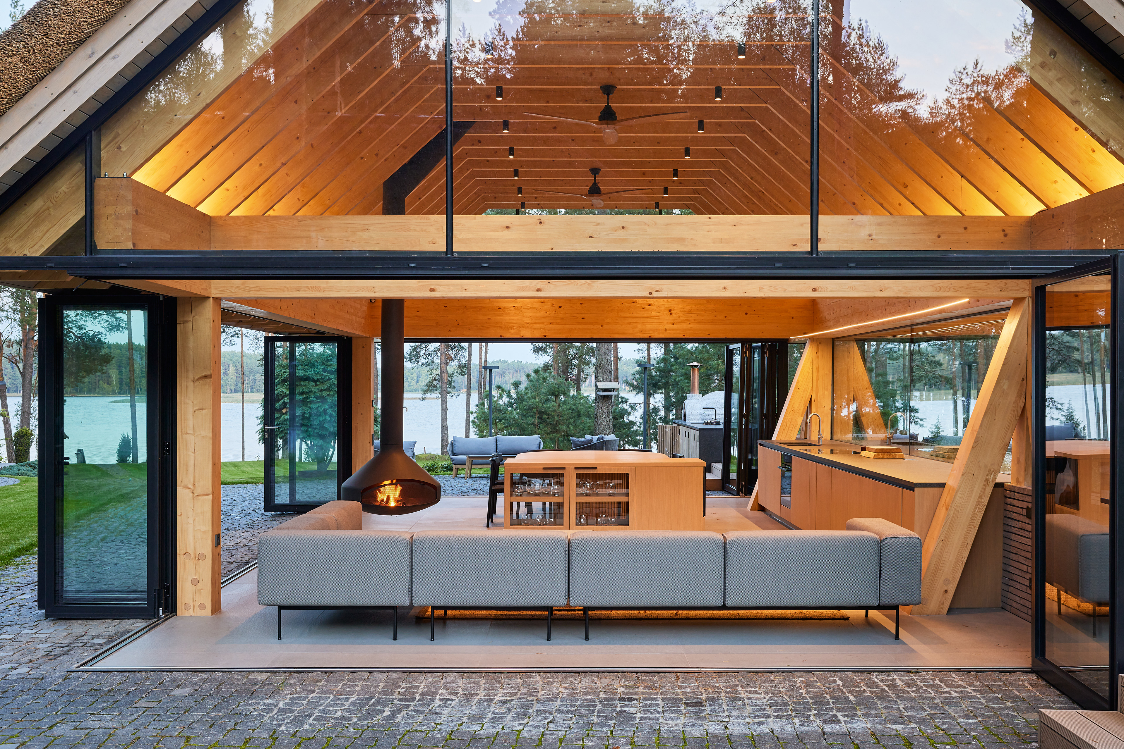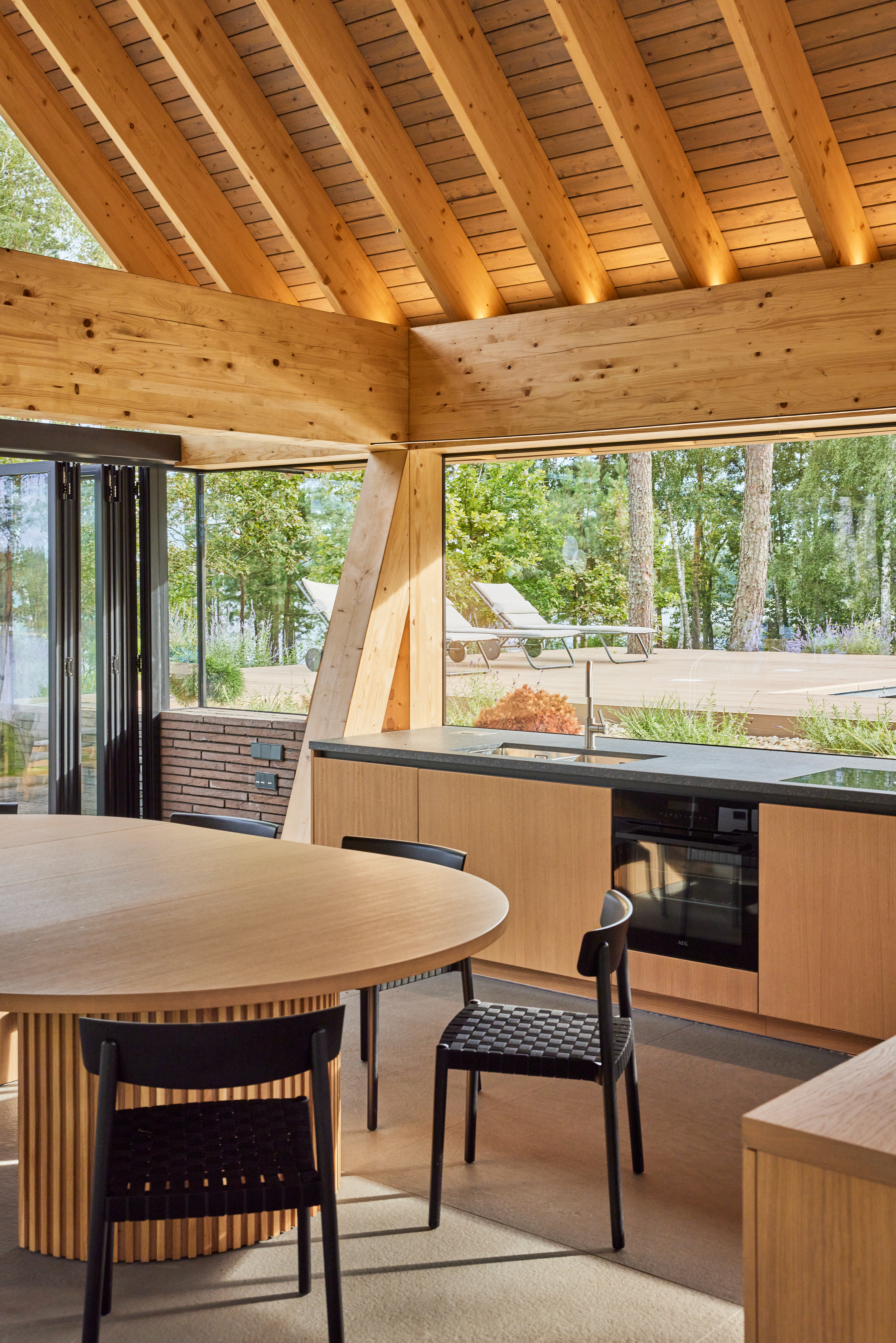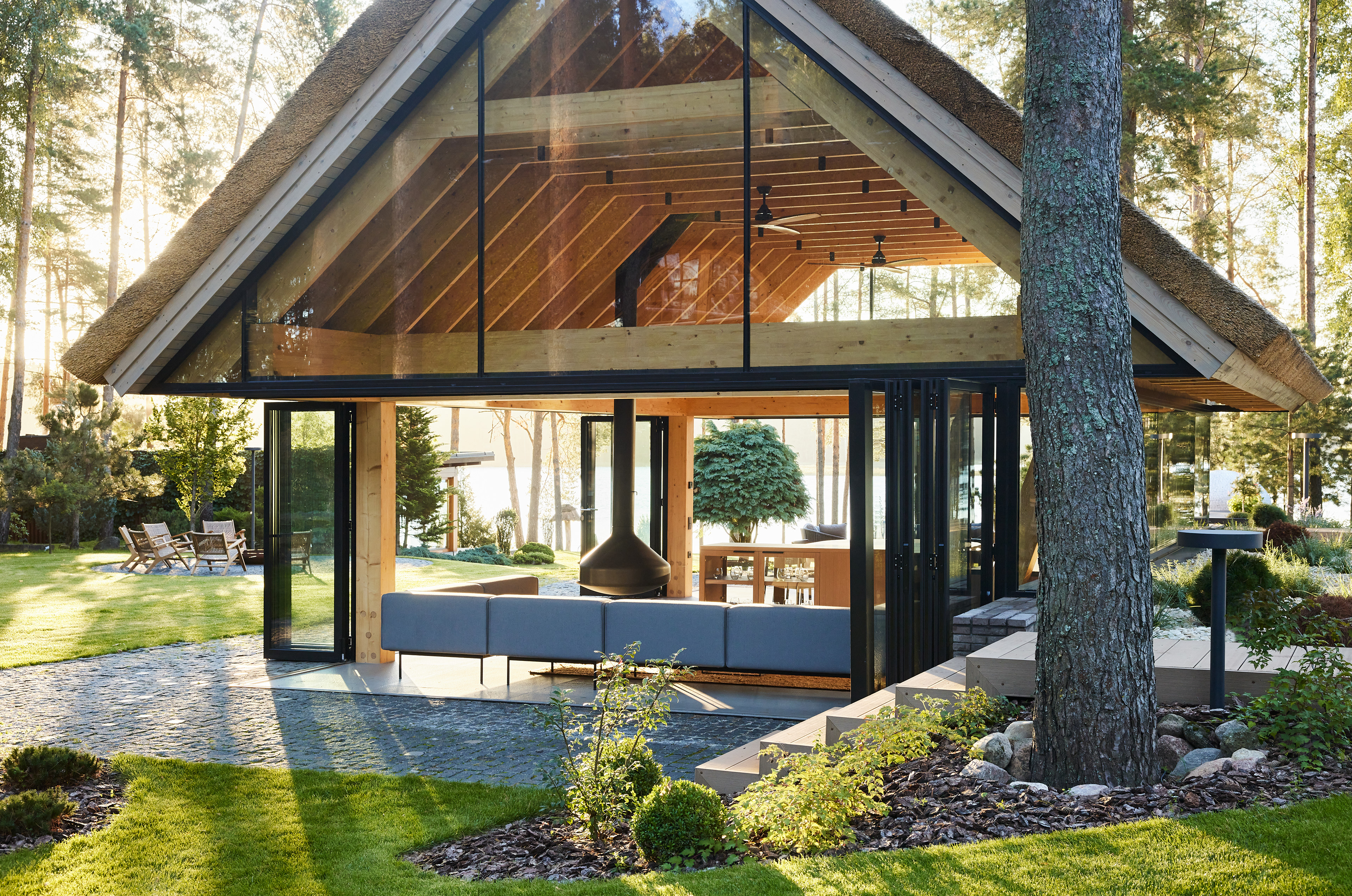 Surrounded by forest, a pool house is built near the lake. It complements the existing complex of several houses. The surrounding landscape clearly dictates the architectural form of the Lithuanian rural hut. The archetypal double sloped roof acts as an interior element and contrasts with the large windows that create a sense of transparency. The compact rectangular perimeter blends naturally into the landscape, respecting the surrounding environment. Two different silhouettes of this building can be seen throughout the day and night. The goal of the day vision is to blend this space into the context of surrounding nature as smoothly as possible. Night vision reveals the contemporary inside of the building. The dark outside contrast with illuminated see-through interior spaces emphasizing furniture shapes and textures. The exterior is formed via natural materials and colors - reed roof, paths of granite and wooden space surrounding the pool. The grey-brown color palette of the building follows “no-boundary with nature” idea. Internal spaces contrasting with the modest external shapes are revealed through a modern interior that follows the same color-material motif. On the one hand, the close-to-the-nature wood theme and large wide-opening windows let the line between outside and inside fade, on the other – creates a glassy, weightlessness, openness feeling that is more common to modern interiors. Glass partitions are also useful during seasonal changes. People can enjoy using the pool house all year round. One of the most unique elements of the pool house is the exposed wooden structure, which dominates the interior space. Massive tripod columns, 60-centimetre height beams and repetitive roof trusses not only create an atmosphere for the inside but also remind of ethnic Lithuanian house building tradition. The adjacent swimming pool complements the construction of the house. The higher poolside horizon line creates an empty space feeling as none of the furniture elements can be seen while swimming.