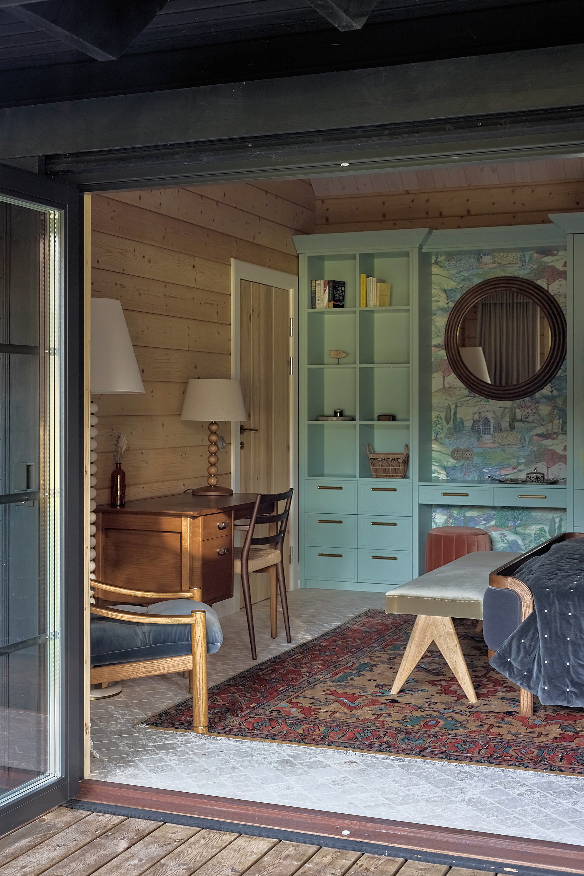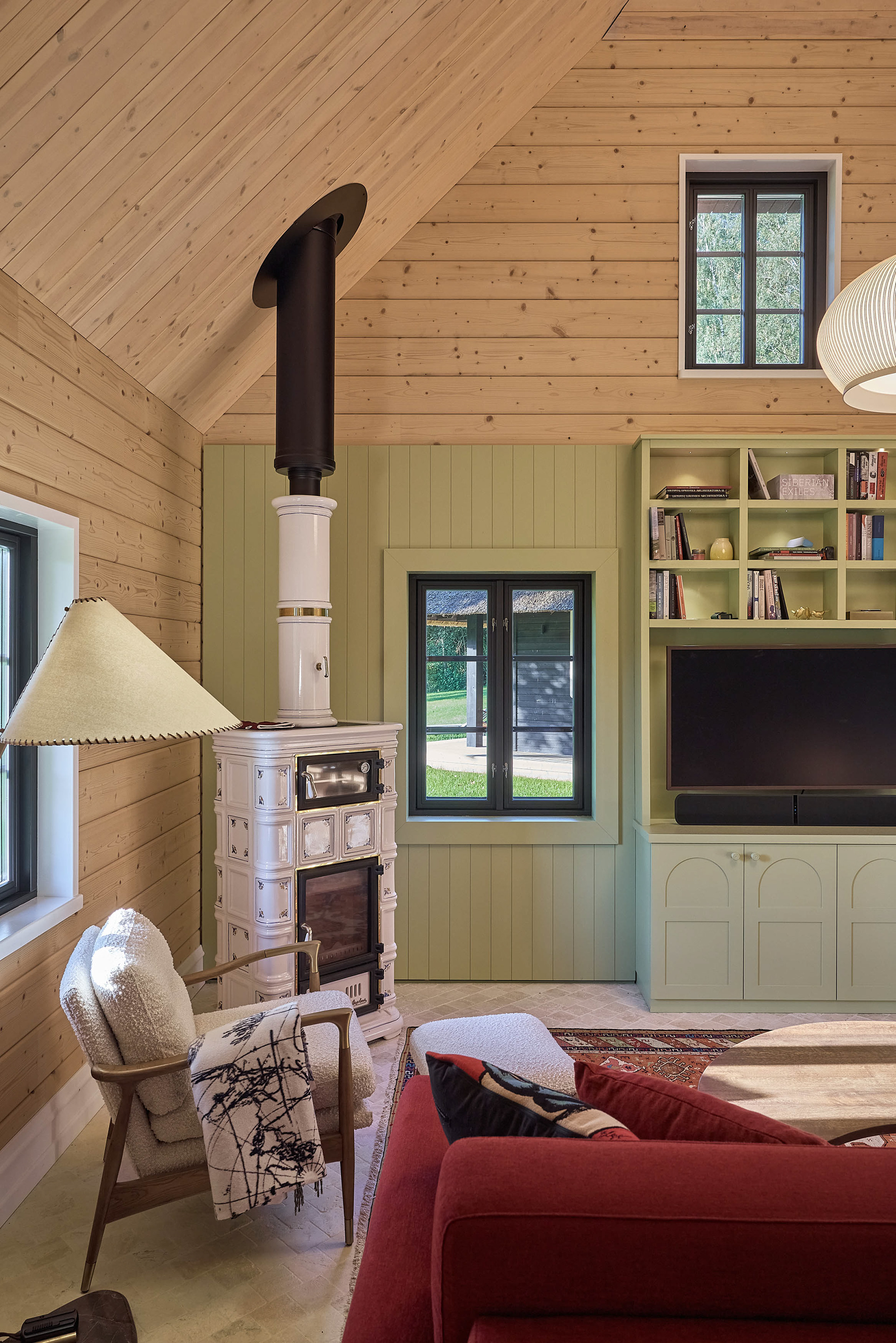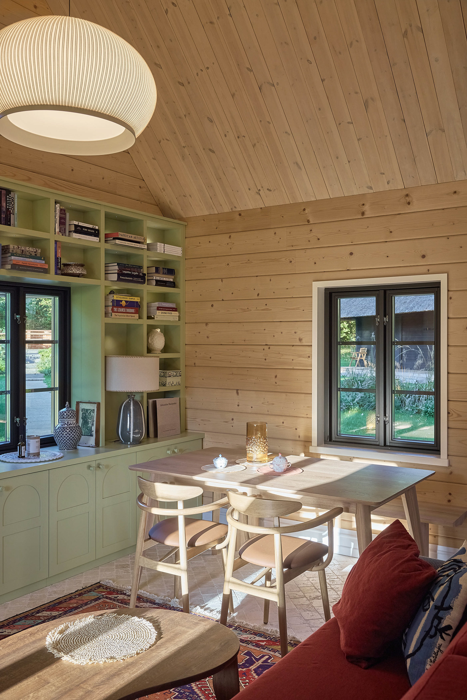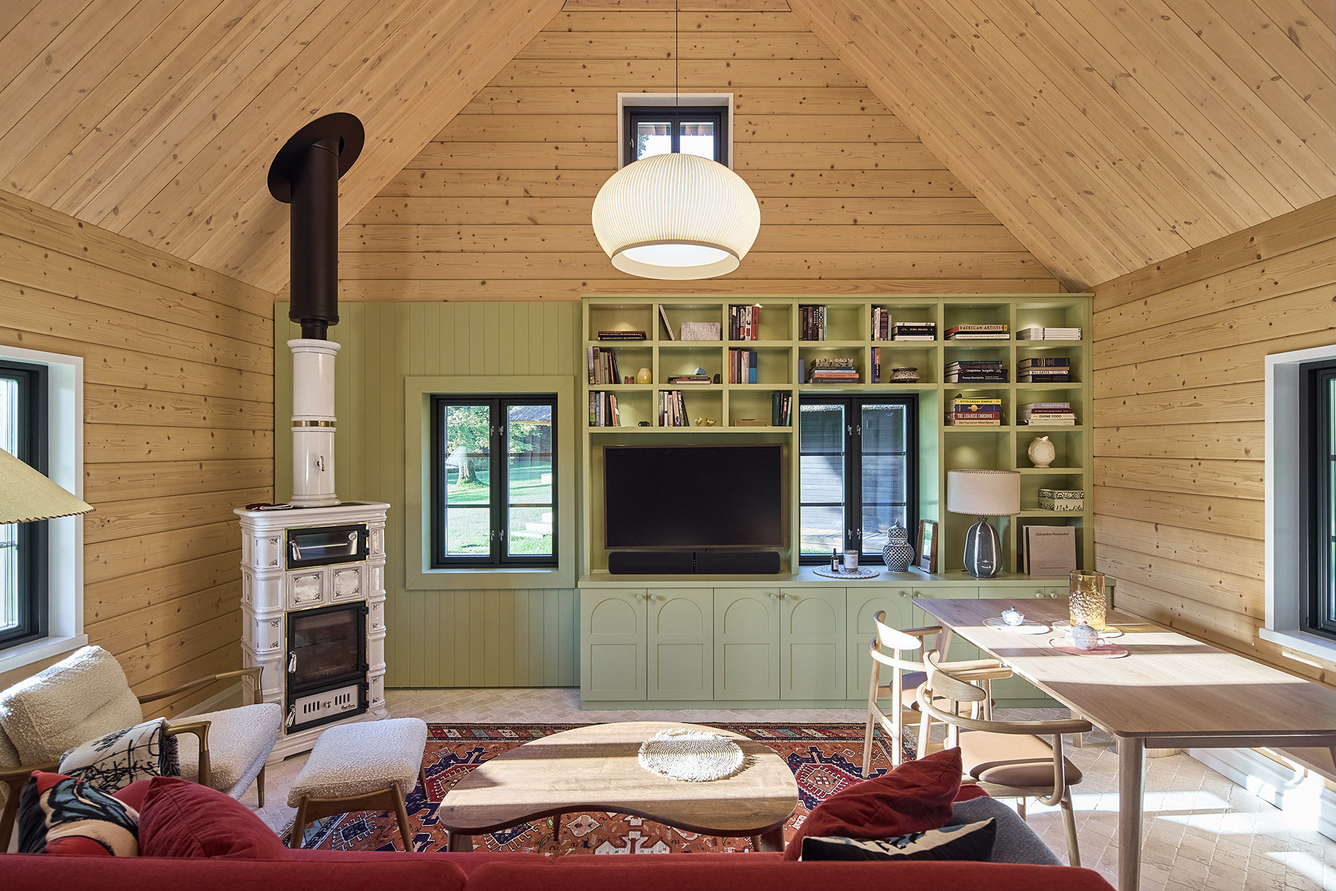 The country house interior seamlessly blends mid-century design with eclectic elements, creating a warm and inviting atmosphere. The space is characterized by its abundant use of natural wood, adding a sense of warmth and texture throughout. Vernacular details, such as handcrafted joinery and traditional motifs, pay homage to the local heritage, while vibrant, colorful accents introduce a playful and contemporary touch. The eclectic mix of furnishings and décor combines modernist shapes with rustic charm, resulting in a space that feels both timeless and cozy. This harmonious blend of styles makes the home a welcoming retreat that celebrates comfort and creativity.