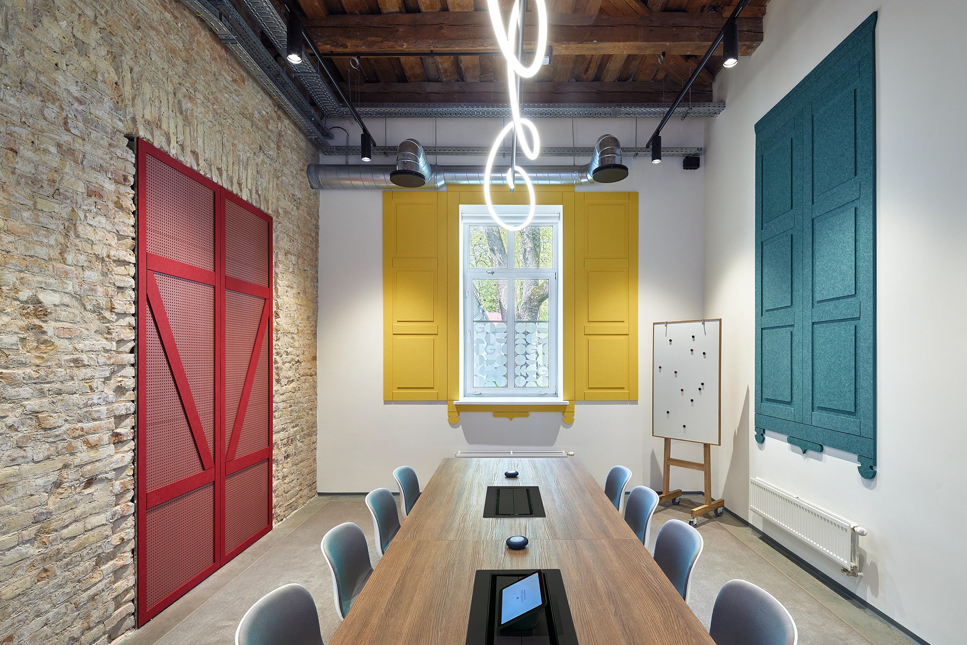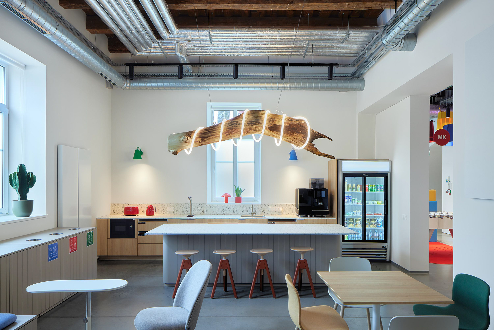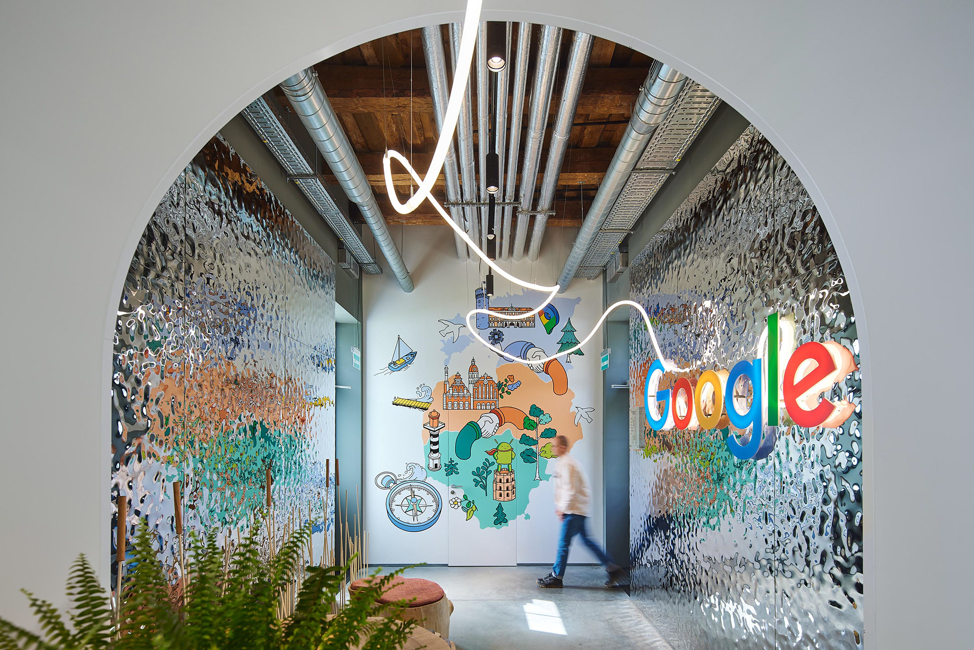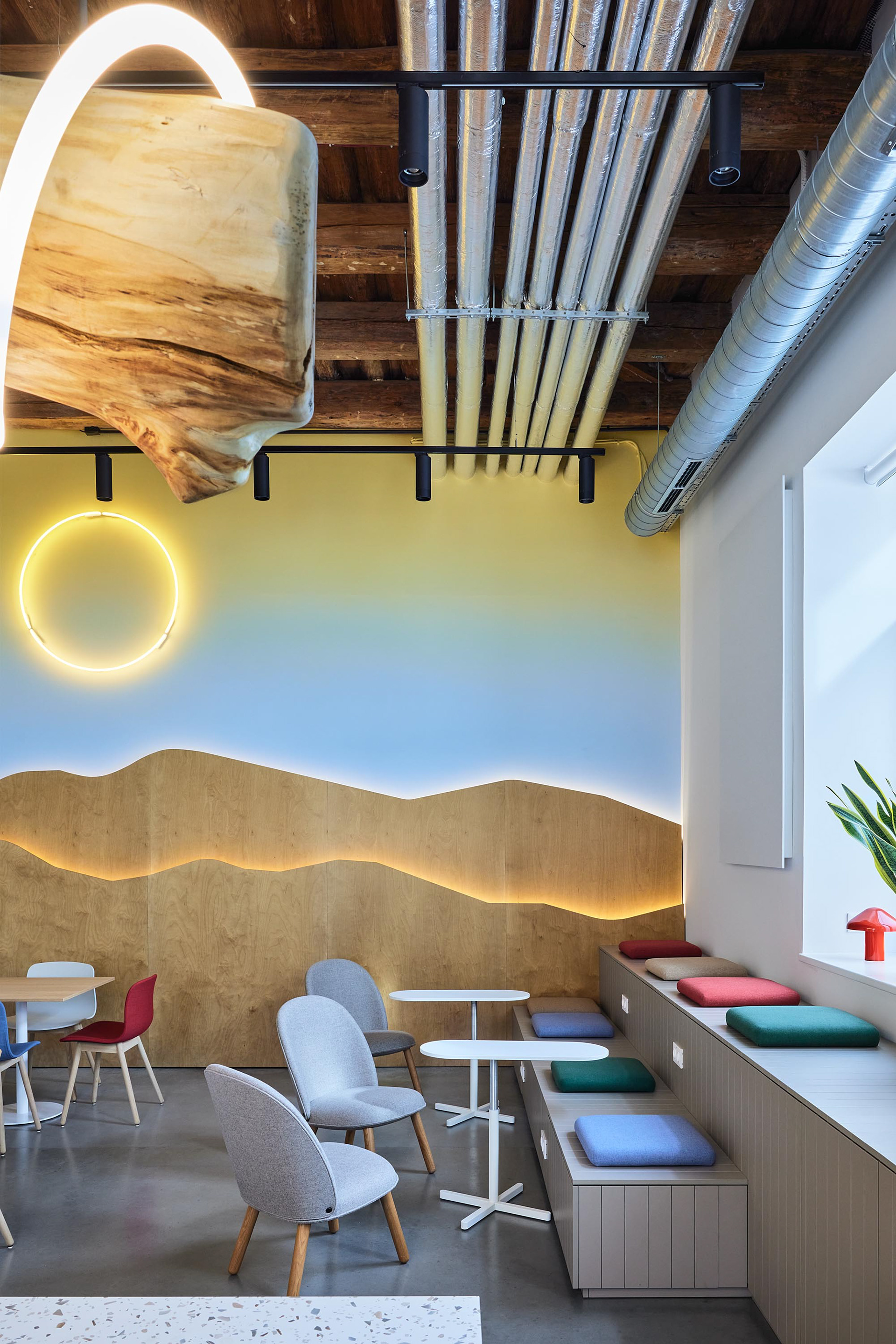 Google Baltics office is located within the historic Sapiegu Park complex in Antakalnis in Vilnius. Designed by the architecture studio Heima, office interior blends Google’s colorful identity with the theme of the Baltic countries' nature elements. This space not only caters to the needs of the Google team but also harmoniously embraces the rich heritage of its unique location. The office is designed with the potential for additional workspaces, emphasizing versatile meeting areas, including six meeting rooms of varying sizes along with three phone booths. Additionally, the design incorporates relaxation and informal work areas, a play zone, and a spacious kitchen that hosts all employees during communal gatherings. The reception area serves as the focal point of the office - the first space encountered upon entering. Main accents - walls that are covered in corrugated metal sheets, the reception desk crafted from a fallen tree, and decorative reeds. These design elements allude to the marshlands, rippling water reflections, and fallen trees typical of the Baltic's wild nature. A graphic composition on the back wall of the reception illustrates key architectural and natural elements from Lithuania, Latvia, and Estonia, symbolizing the unity and friendship of the Baltic countries. Each of the three large meeting rooms has a distinct theme. The biggest one is an interpretation of a historical shed, where traditional architectural elements are reimagined with modern materials. The middle meeting room reflects an old forest, dominated by moss and natural wood colors, creating a serene and organic atmosphere. The smallest of the three, named "Speigas," represents the region's winter. Here, the attention is drawn to the frost-like ceiling and walls painted in gradient colors of a sunny winter sky. In contrast to the bright meeting rooms, the common workspaces are designed to be calmer, with authentic wooden ceilings, brick walls, decorative plants, and subtle Google color elements as the main highlights. Cozy kitchen interior—a space designed to nurture Google's communication culture. Here, another natural wonder of our region is revealed—the dunes of the Curonian Spit and the Baltic Sea landscape. The back wall symbolizes the sun setting behind the dunes into the sea, and the cabinetry resembles paths of wooden planks and ambers washed ashore. An accent light hangs above the kitchen island, crafted from a linden branch that broke during a storm in Vilnius, coinciding with the construction work. As part of Sapiegu Park, Google shares a serene courtyard with the city’s residents. Here, androids adorned in vibrant Baltic colors gracefully blend into the historic surroundings, subtly hinting at the company's presence.