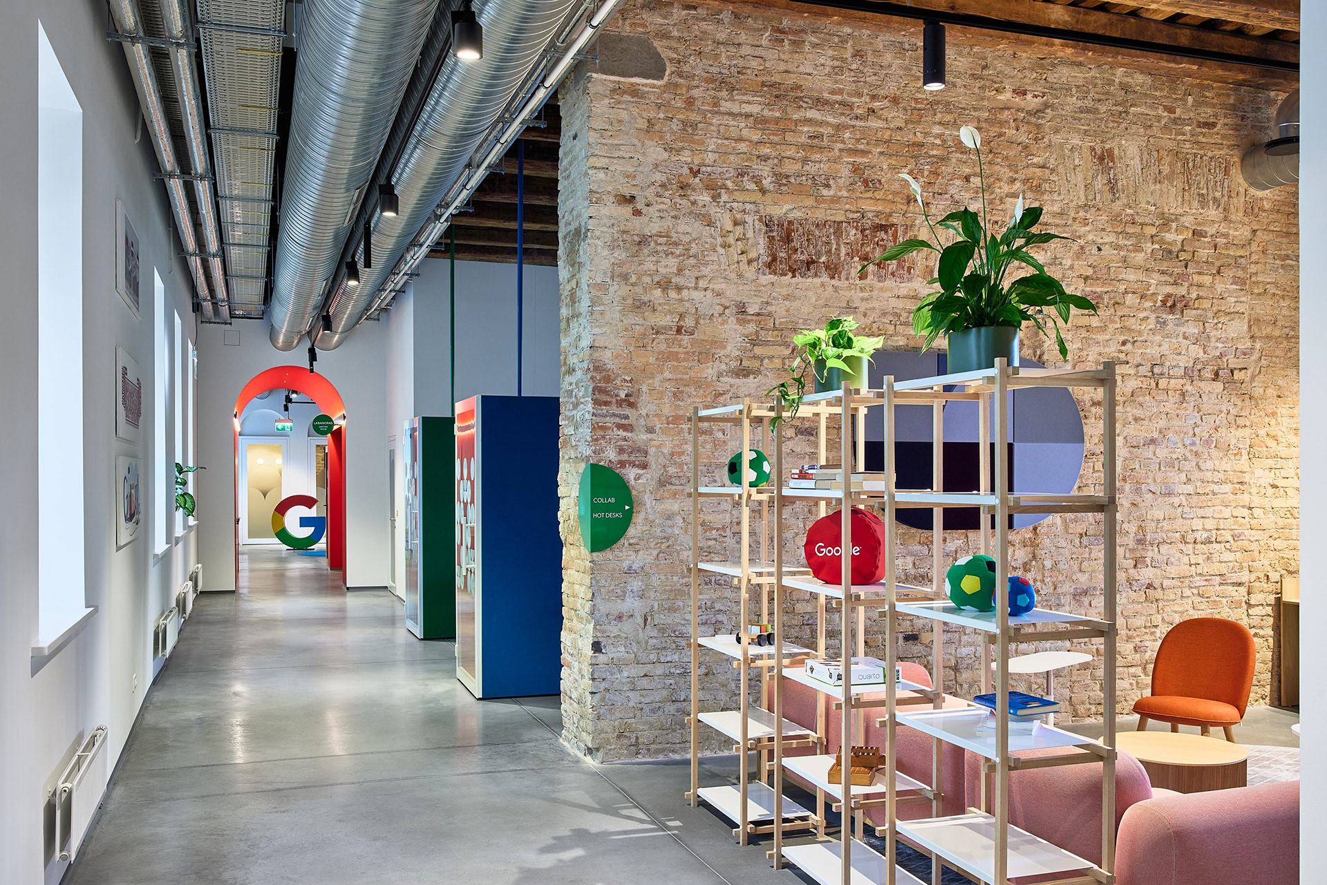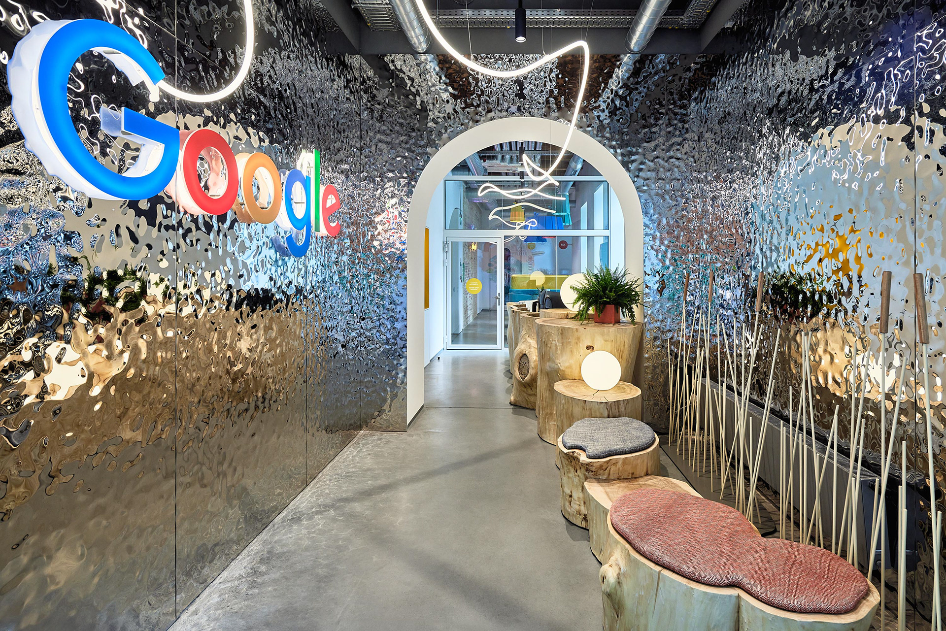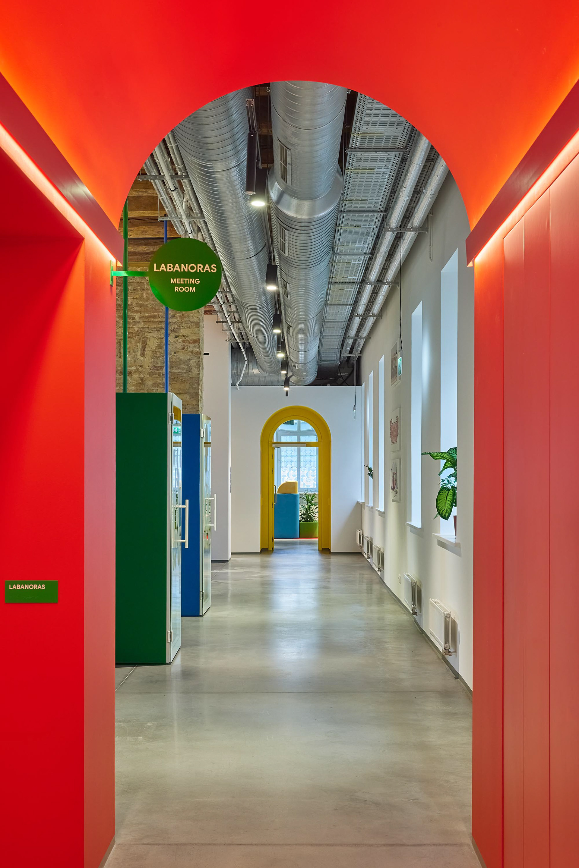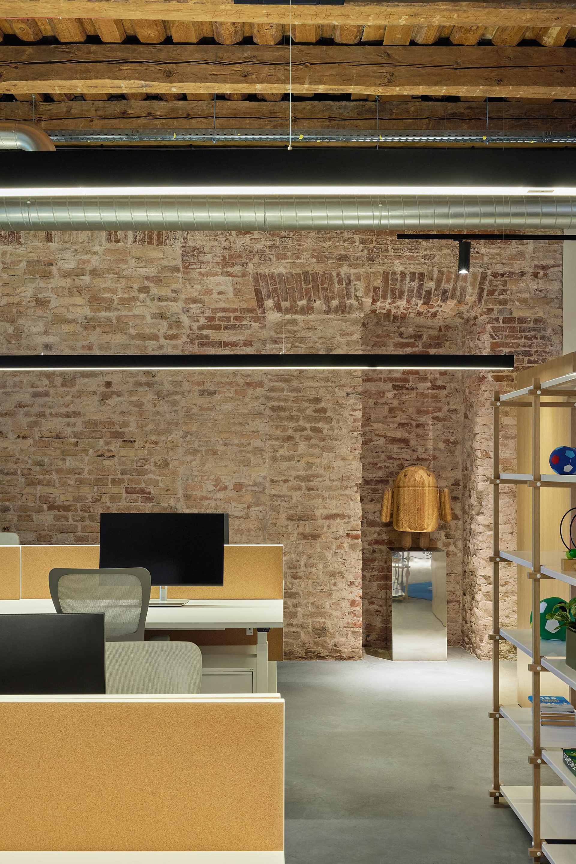 Google Baltics office is located within the historic Sapiegu Park complex in Antakalnis in Vilnius. Designed by the architecture studio Heima, office interior blends Google’s colorful identity with the theme of the Baltic countries' nature elements. This space not only caters to the needs of the Google team but also harmoniously embraces the rich heritage of its unique location. The office is designed with the potential for additional workspaces, emphasizing versatile meeting areas, including six meeting rooms of varying sizes along with three phone booths. Additionally, the design incorporates relaxation and informal work areas, a play zone, and a spacious kitchen that hosts all employees during communal gatherings. The reception area serves as the focal point of the office - the first space encountered upon entering. Main accents - walls that are covered in corrugated metal sheets, the reception desk crafted from a fallen tree, and decorative reeds. These design elements allude to the marshlands, rippling water reflections, and fallen trees typical of the Baltic's wild nature. A graphic composition on the back wall of the reception illustrates key architectural and natural elements from Lithuania, Latvia, and Estonia, symbolizing the unity and friendship of the Baltic countries. Each of the three large meeting rooms has a distinct theme. The biggest one is an interpretation of a historical shed, where traditional architectural elements are reimagined with modern materials. The middle meeting room reflects an old forest, dominated by moss and natural wood colors, creating a serene and organic atmosphere. The smallest of the three, named "Speigas," represents the region's winter. Here, the attention is drawn to the frost-like ceiling and walls painted in gradient colors of a sunny winter sky. In contrast to the bright meeting rooms, the common workspaces are designed to be calmer, with authentic wooden ceilings, brick walls, decorative plants, and subtle Google color elements as the main highlights. Cozy kitchen interior—a space designed to nurture Google's communication culture. Here, another natural wonder of our region is revealed—the dunes of the Curonian Spit and the Baltic Sea landscape. The back wall symbolizes the sun setting behind the dunes into the sea, and the cabinetry resembles paths of wooden planks and ambers washed ashore. An accent light hangs above the kitchen island, crafted from a linden branch that broke during a storm in Vilnius, coinciding with the construction work. As part of Sapiegu Park, Google shares a serene courtyard with the city’s residents. Here, androids adorned in vibrant Baltic colors gracefully blend into the historic surroundings, subtly hinting at the company's presence.