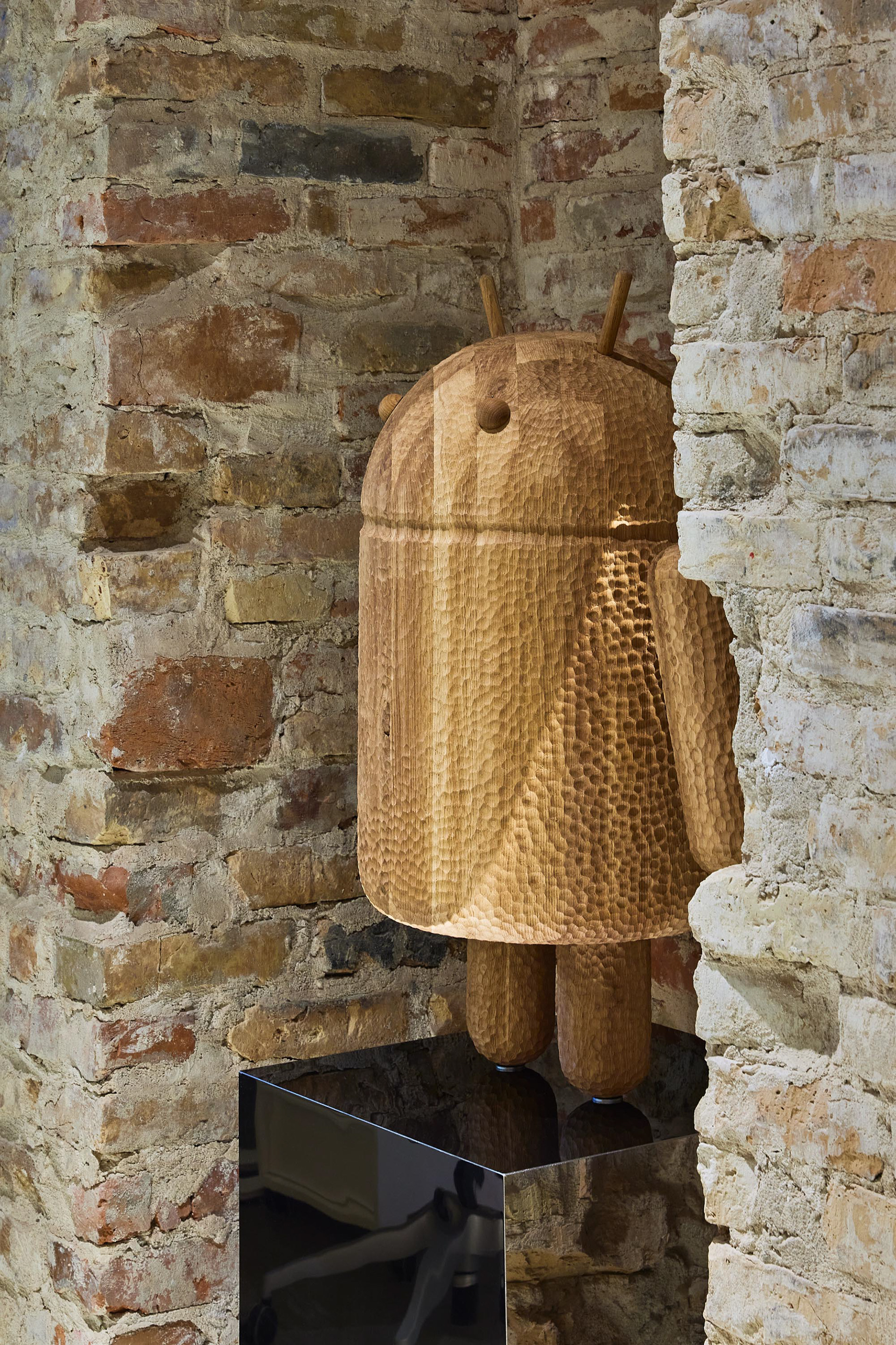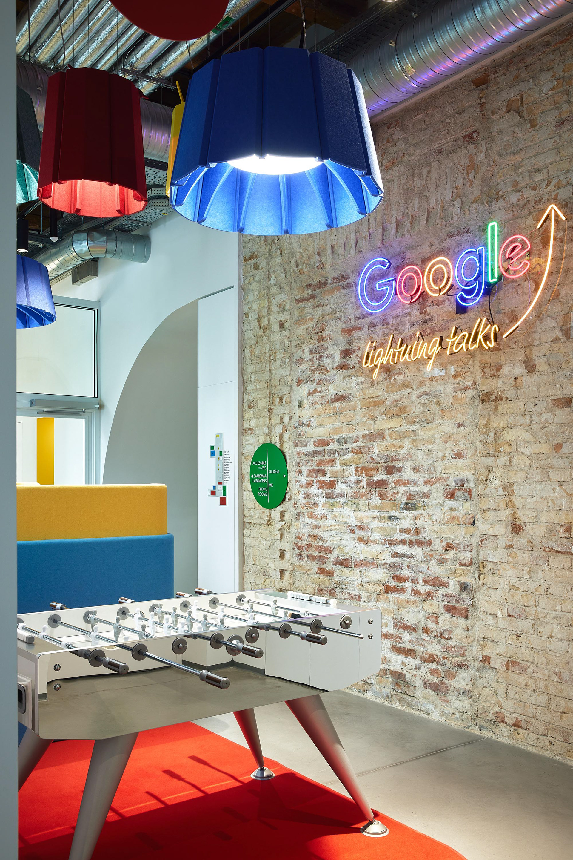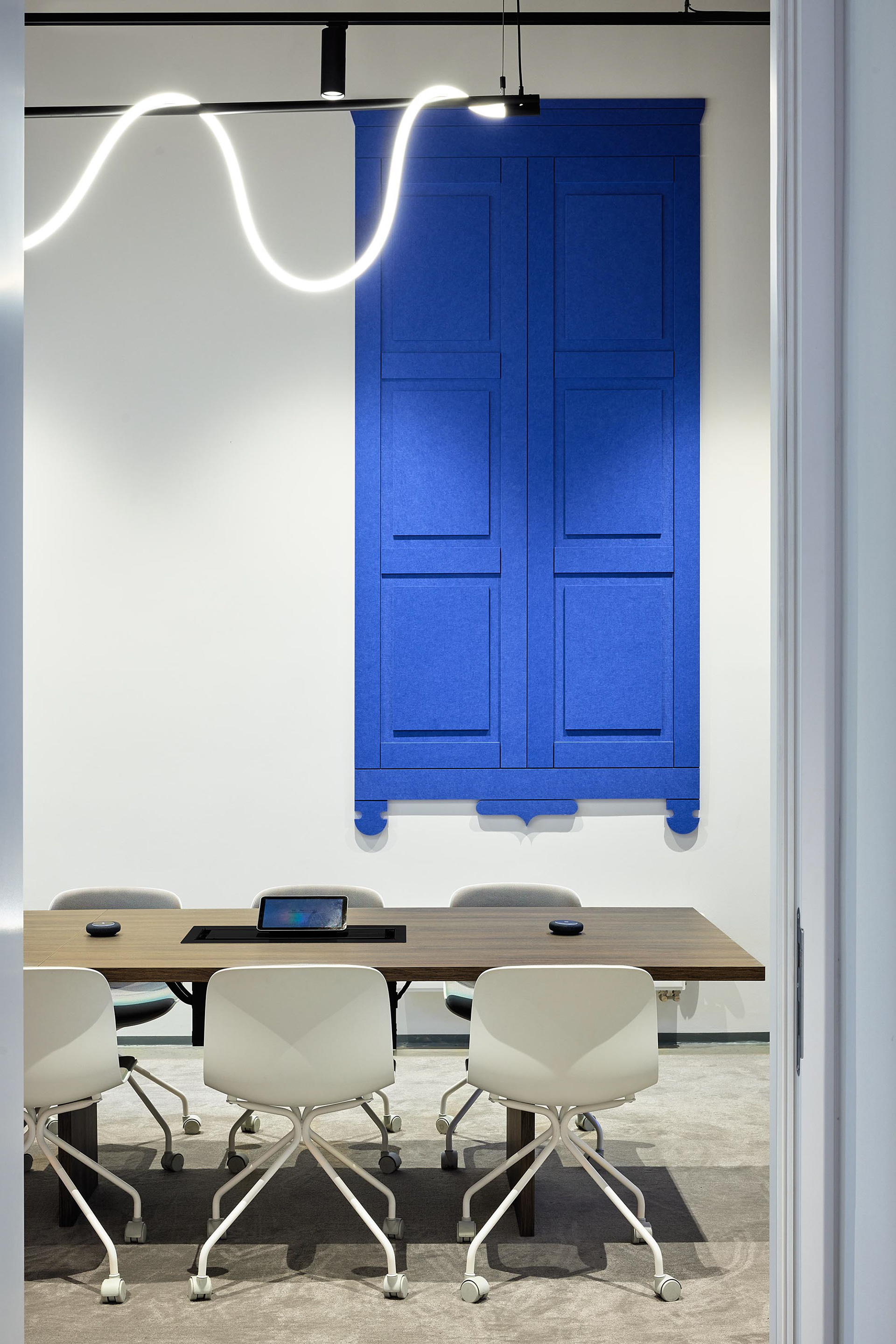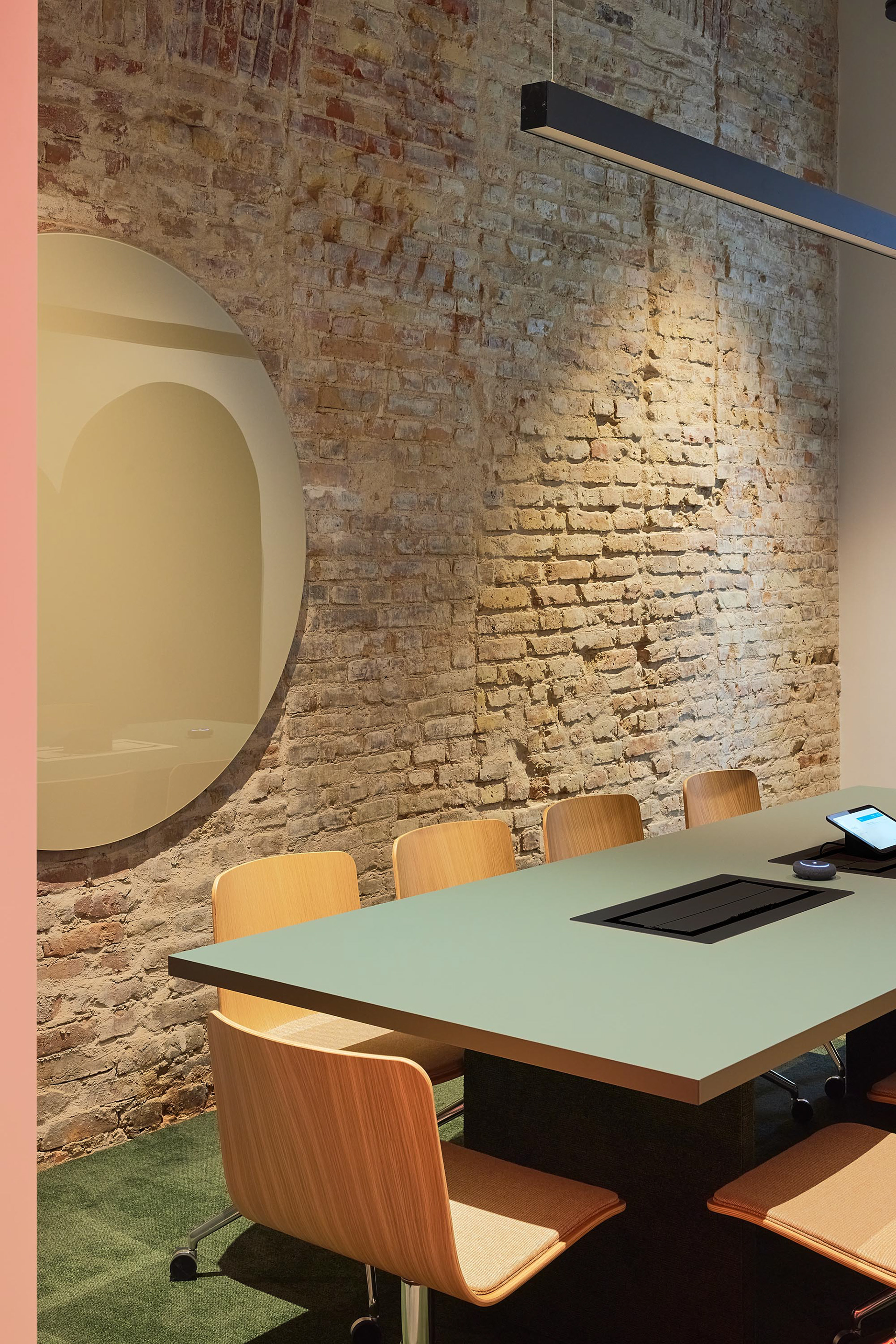 Google Baltics office is located within the historic Sapiegu Park complex in Antakalnis in Vilnius. Designed by the architecture studio Heima, office interior blends Google’s colorful identity with the theme of the Baltic countries' nature elements. This space not only caters to the needs of the Google team but also harmoniously embraces the rich heritage of its unique location. The office is designed with the potential for additional workspaces, emphasizing versatile meeting areas, including six meeting rooms of varying sizes along with three phone booths. Additionally, the design incorporates relaxation and informal work areas, a play zone, and a spacious kitchen that hosts all employees during communal gatherings. The reception area serves as the focal point of the office - the first space encountered upon entering. Main accents - walls that are covered in corrugated metal sheets, the reception desk crafted from a fallen tree, and decorative reeds. These design elements allude to the marshlands, rippling water reflections, and fallen trees typical of the Baltic's wild nature. A graphic composition on the back wall of the reception illustrates key architectural and natural elements from Lithuania, Latvia, and Estonia, symbolizing the unity and friendship of the Baltic countries. Each of the three large meeting rooms has a distinct theme. The biggest one is an interpretation of a historical shed, where traditional architectural elements are reimagined with modern materials. The middle meeting room reflects an old forest, dominated by moss and natural wood colors, creating a serene and organic atmosphere. The smallest of the three, named "Speigas," represents the region's winter. Here, the attention is drawn to the frost-like ceiling and walls painted in gradient colors of a sunny winter sky. In contrast to the bright meeting rooms, the common workspaces are designed to be calmer, with authentic wooden ceilings, brick walls, decorative plants, and subtle Google color elements as the main highlights. Cozy kitchen interior—a space designed to nurture Google's communication culture. Here, another natural wonder of our region is revealed—the dunes of the Curonian Spit and the Baltic Sea landscape. The back wall symbolizes the sun setting behind the dunes into the sea, and the cabinetry resembles paths of wooden planks and ambers washed ashore. An accent light hangs above the kitchen island, crafted from a linden branch that broke during a storm in Vilnius, coinciding with the construction work. As part of Sapiegu Park, Google shares a serene courtyard with the city’s residents. Here, androids adorned in vibrant Baltic colors gracefully blend into the historic surroundings, subtly hinting at the company's presence.