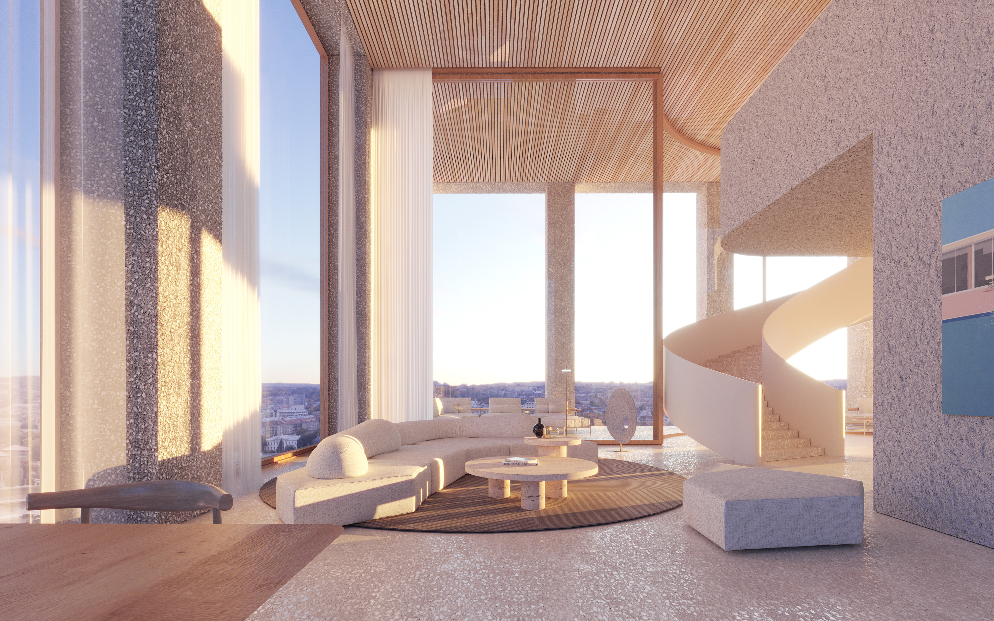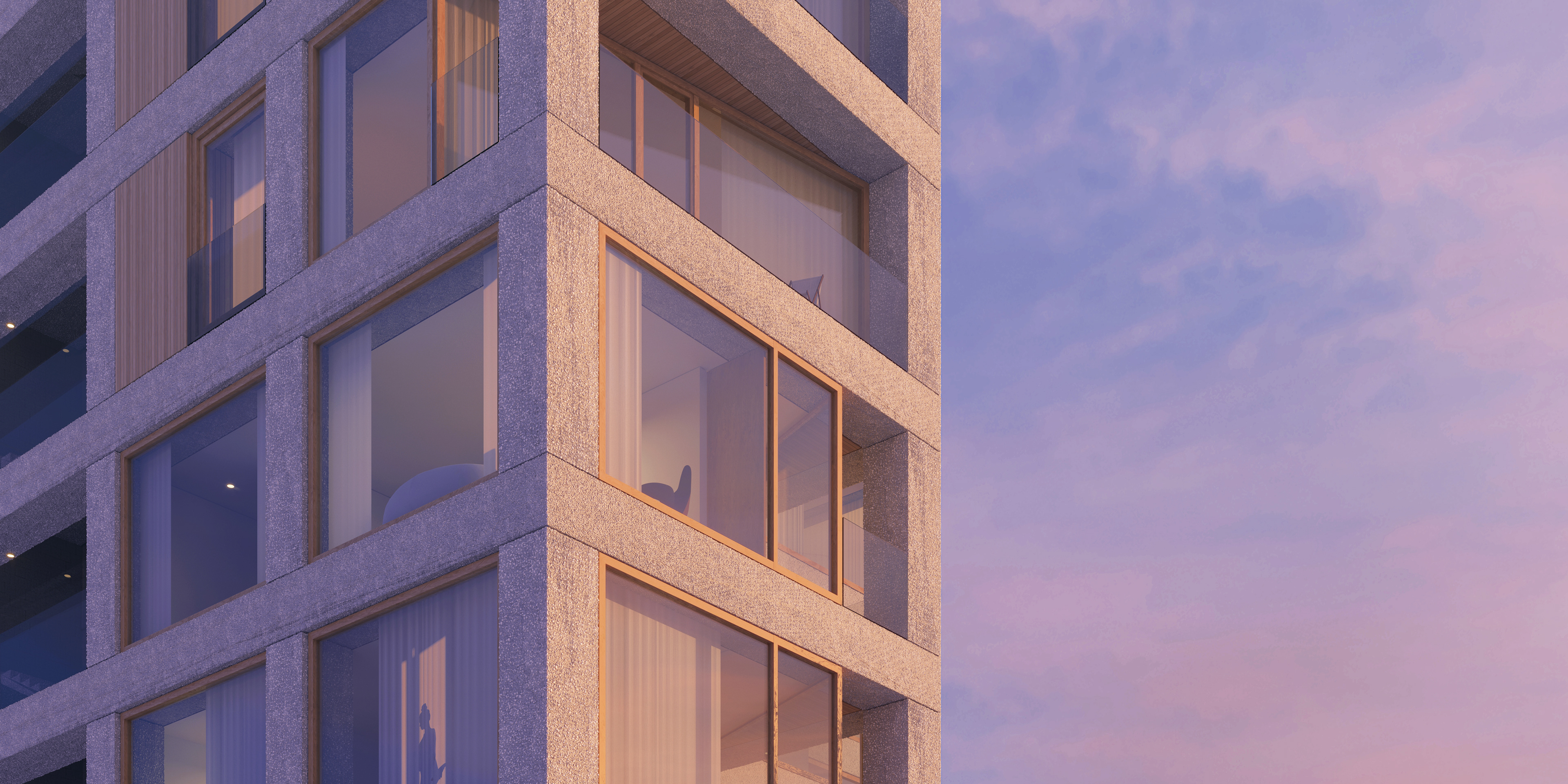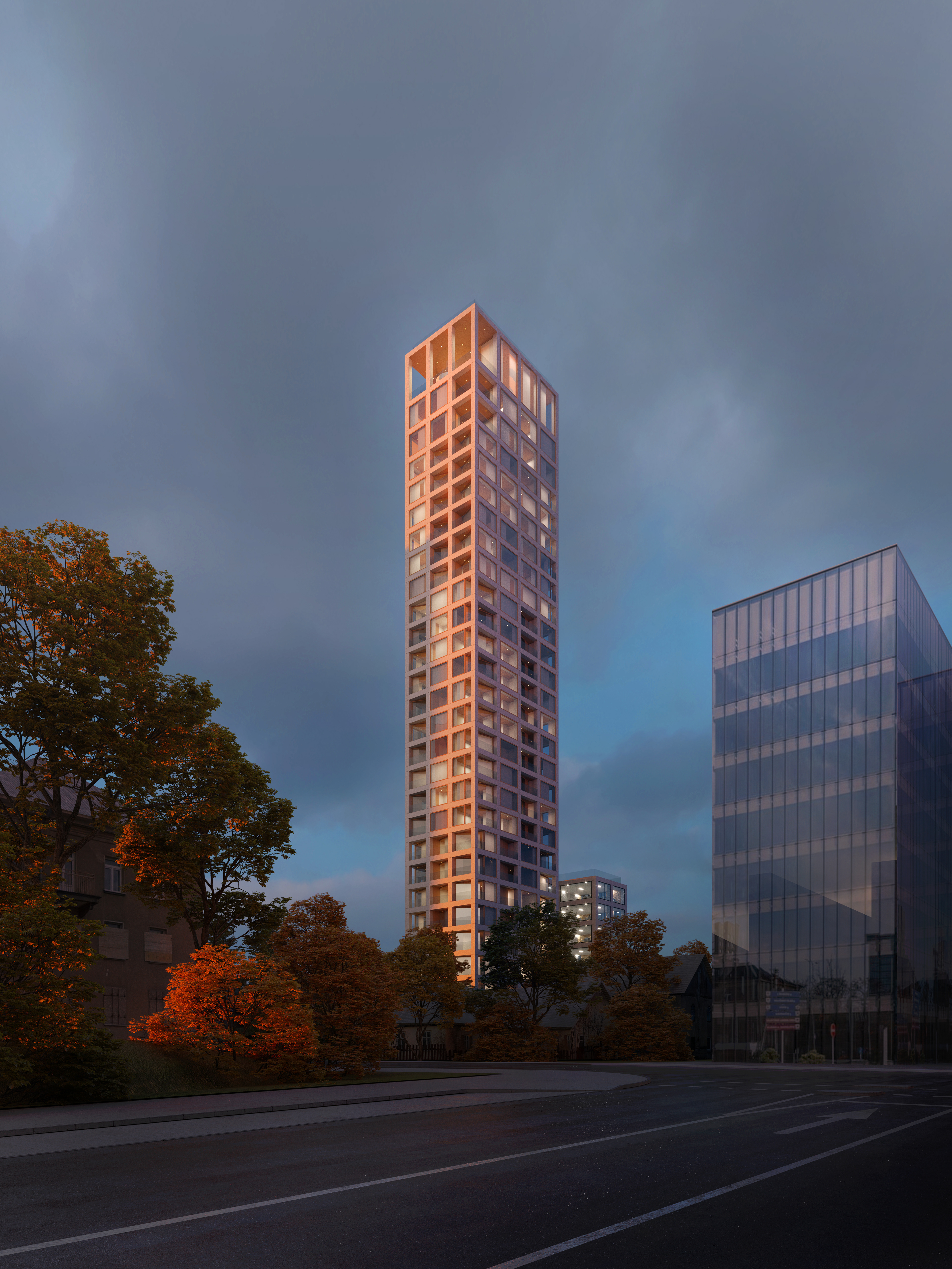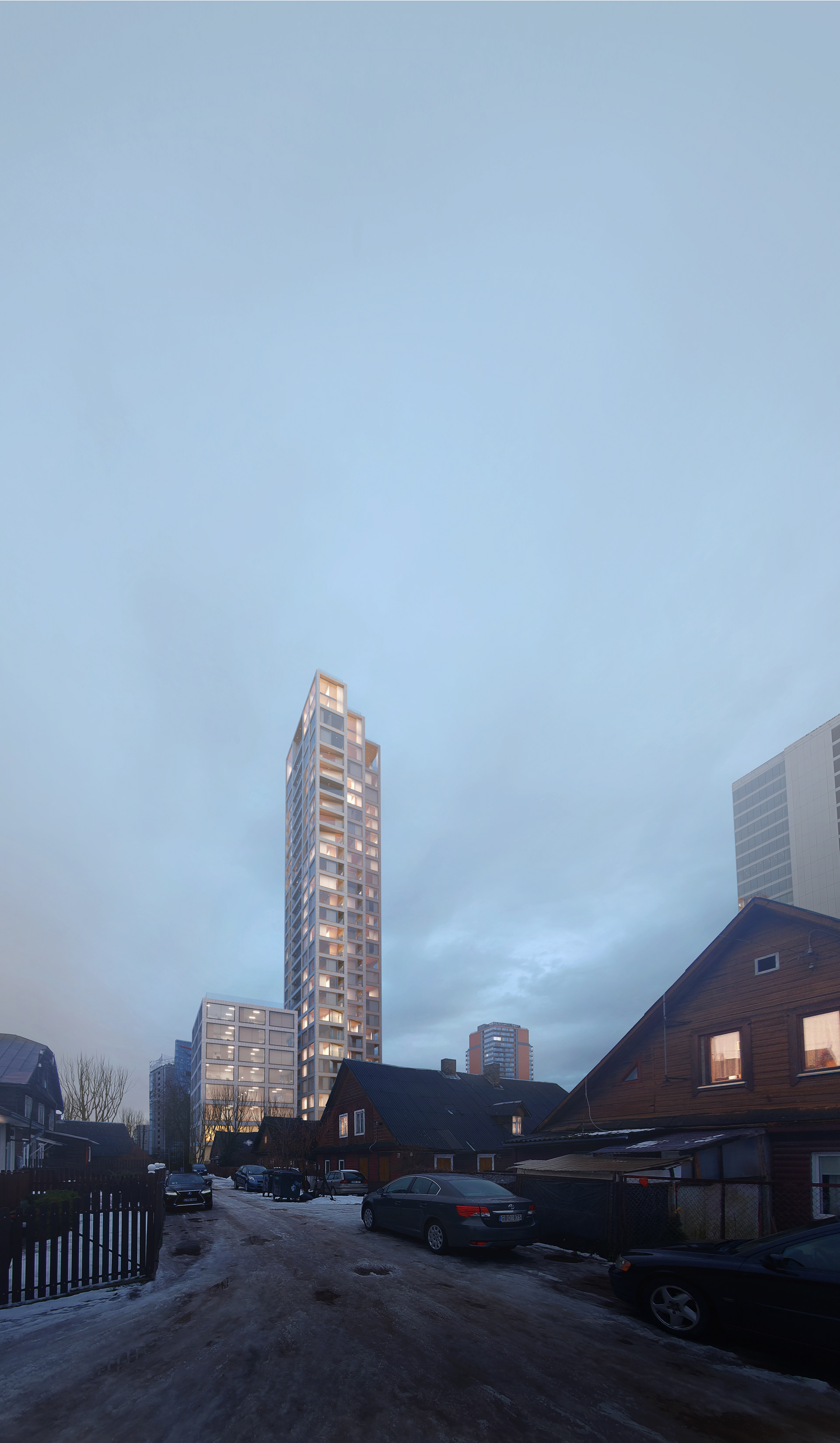 The planned plots of Krokuvos st. 24, 26 are the historical territory of changing Šnipiskes, district, which will soon become part of the new business centre of Vilnius City. The surrounding area of the plots is extremely contrasting. On the Neris side, the rapidly developing new Vilnius center is creating one of the most modern Northern European business regions. On the northern side, the plots border on the traditional wooden, rather abandoned homestead architecture of Šnipiškės, the future of which is still unclear. The planned high-rise mixed-use complex will not only strengthen the idea of Urban Hill, but will also create a new Skansen work-life-leisure center, which will significantly contribute to the further development of the area. The building, which has three different typologies, is united by a single façade structure. The residential purpose of the facade grid is distinguished by architectural details and material solutions. Each apartment has a balcony, which gives a sense of vitality to the neat structure of the facade. The apartments in different layouts are planned with different shapes and sizes of balconies, which give the whole building a lively playfulness. The composition of the upper part is crowned by panoramic apartments with windows over two floors of the building. The residential building offers human-scale architectural elements ensuring home feeling: wooden, windows divided more densily, while at that time, the office building had aluminum, monumental partition facades, creating a modern business environment. The shape of the high-rise residential building takes into account the orientation of the plot and the amount of sun. The trimmed southwest corner allows all the apartments on each floor to receive sunlight. The shape of the office building is adjusted on the same principle: the cut-out opens up visual corridors for residents on the north side of the building, and for office workers - additional perspectives on the nearby park. These context-based architectural solutions not only make the most of the program, but also create exceptional courtyard spaces with a uniform volume solution.