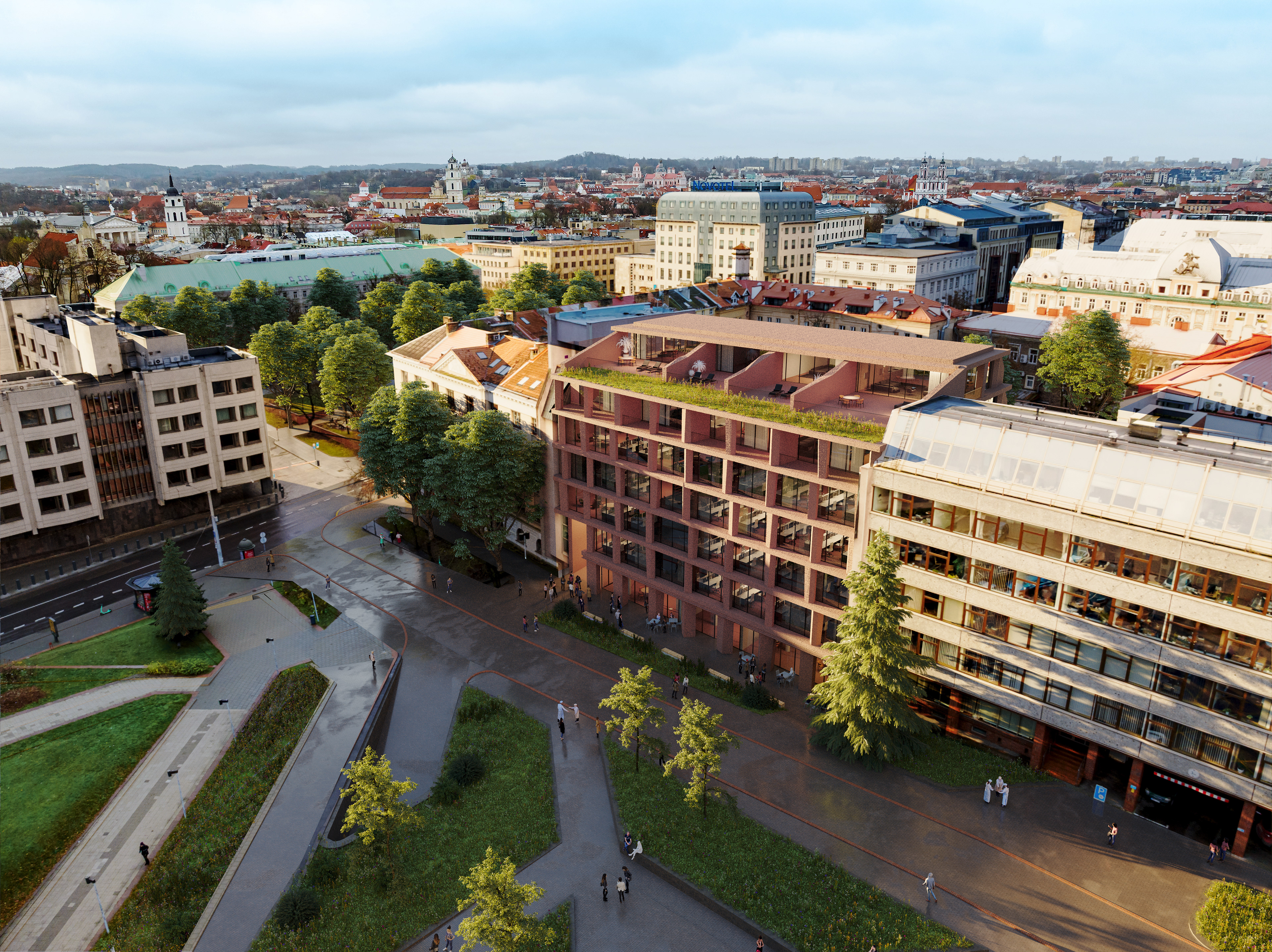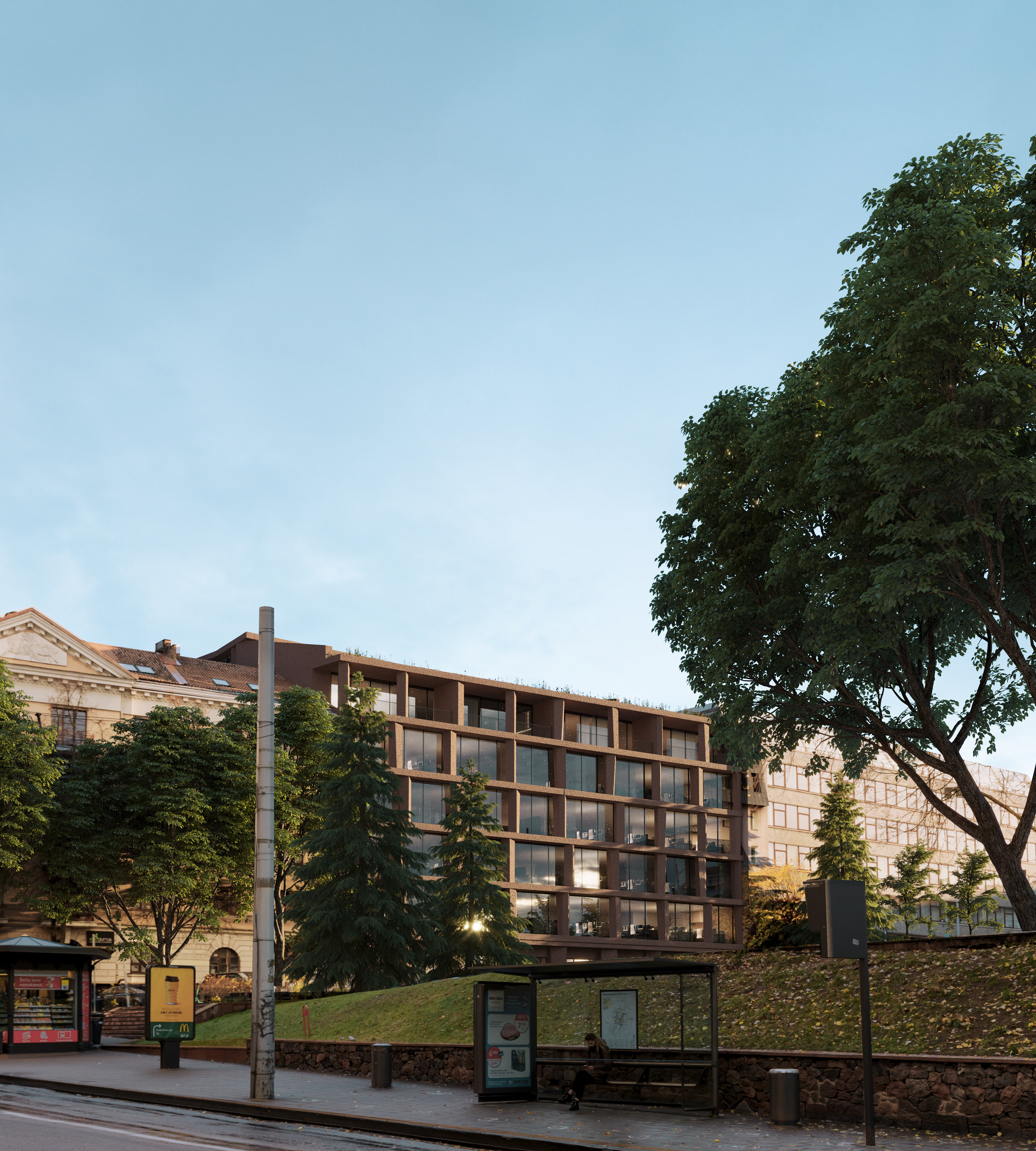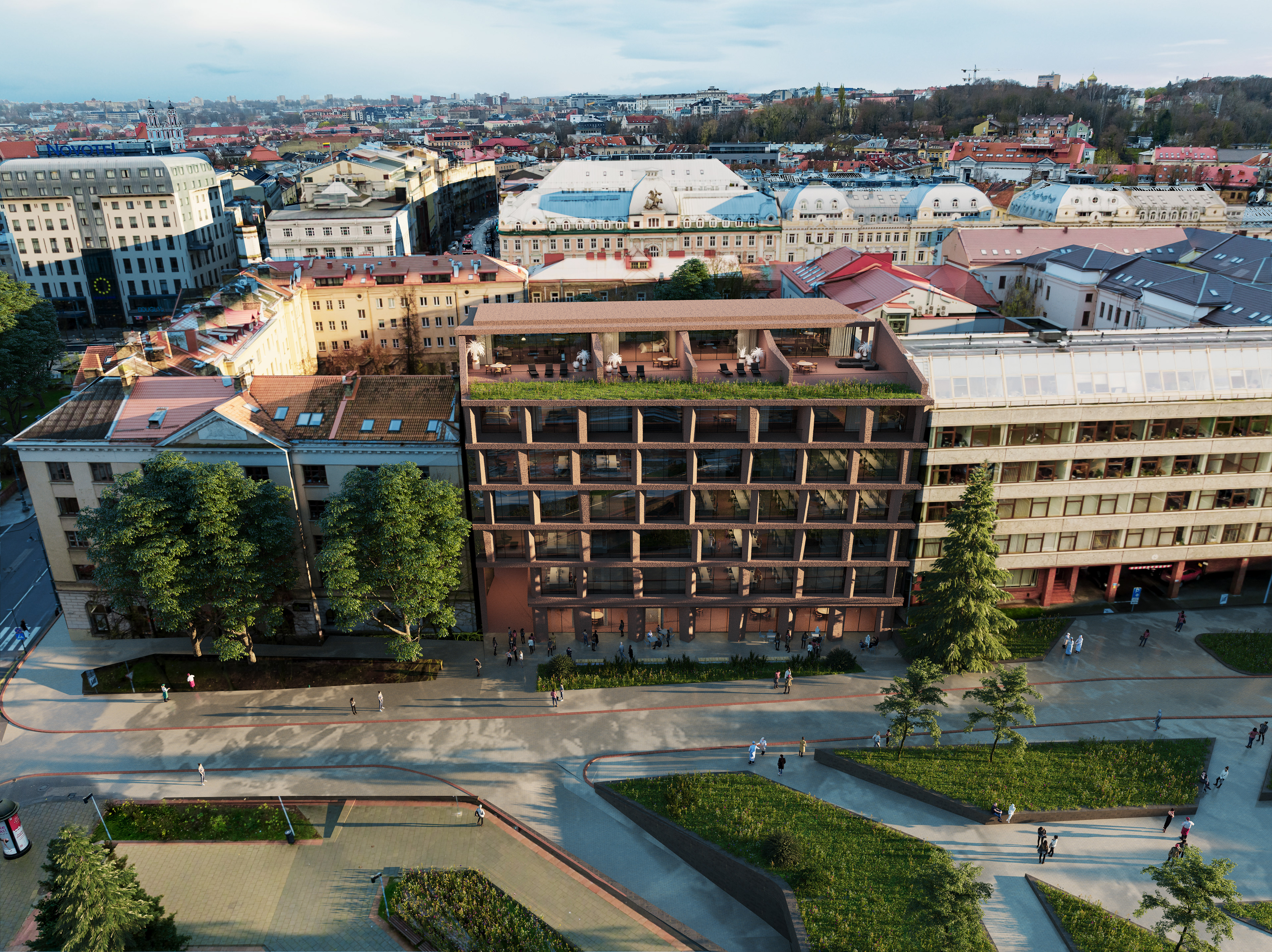 The building is designed to be maximally open to both the north and south sides. In the northern part, you can see not only the opera and ballet theater, but also the Neris embankment, the beginning of Šnipiškės, and the CBD of the city of Vilnius. In the south, there is a huge courtyard of a multi-level block, the existing Ąžuoliukas Music School, and the upper floors of buildings on Gediminas Avenue are visible. The glass facades are included; their horizontality is divided vertically by sculptural columns. The sculptural form of the columns gives softness to the rhythm of the facade, making it no longer strict, but quivering, like a sketch line drawn by hand. The columns of the first floor are larger, thus creating a separation of the plinth from the rest of the facade. In the composition of the adjacent buildings, although by different means, the isolation of the plinth part is also visible.