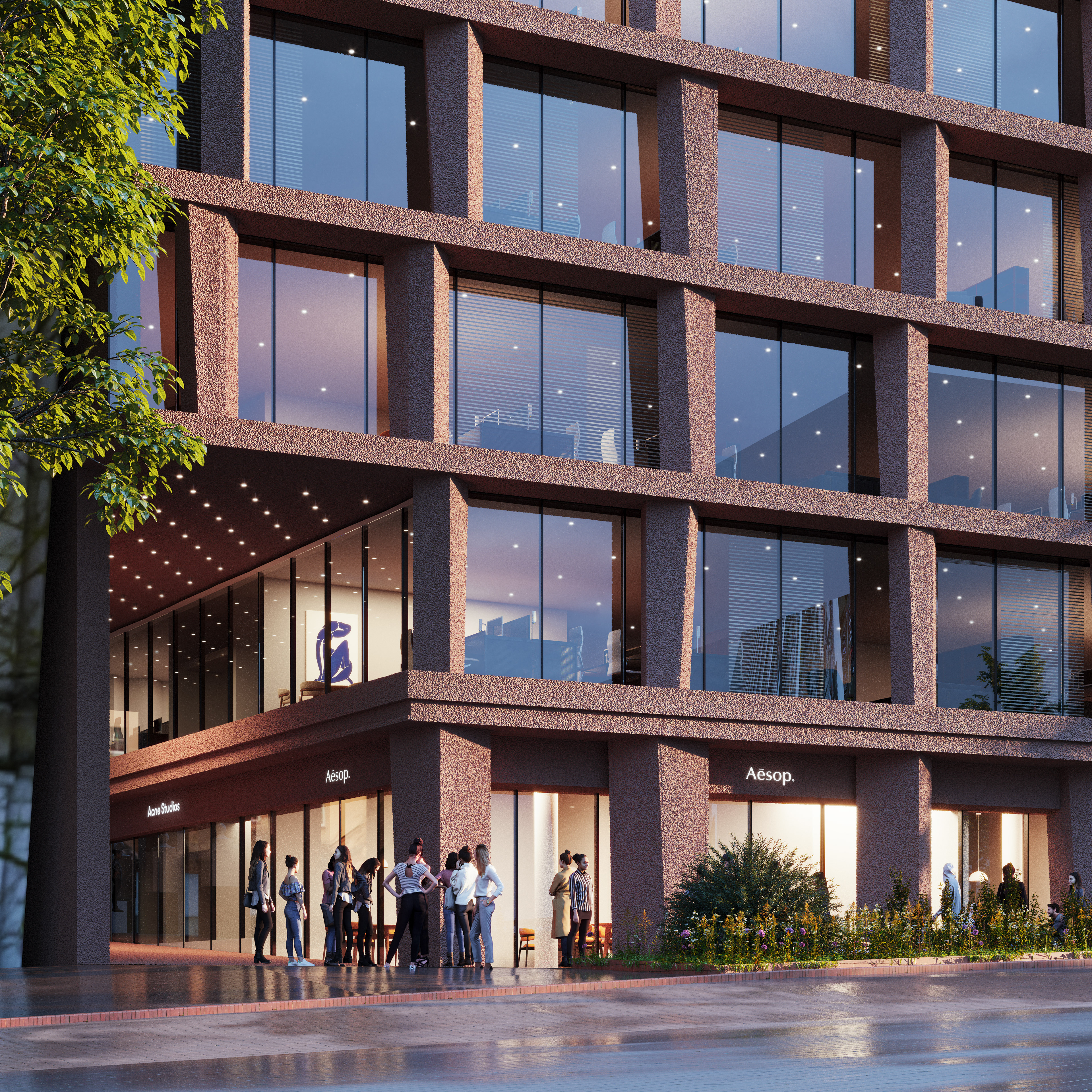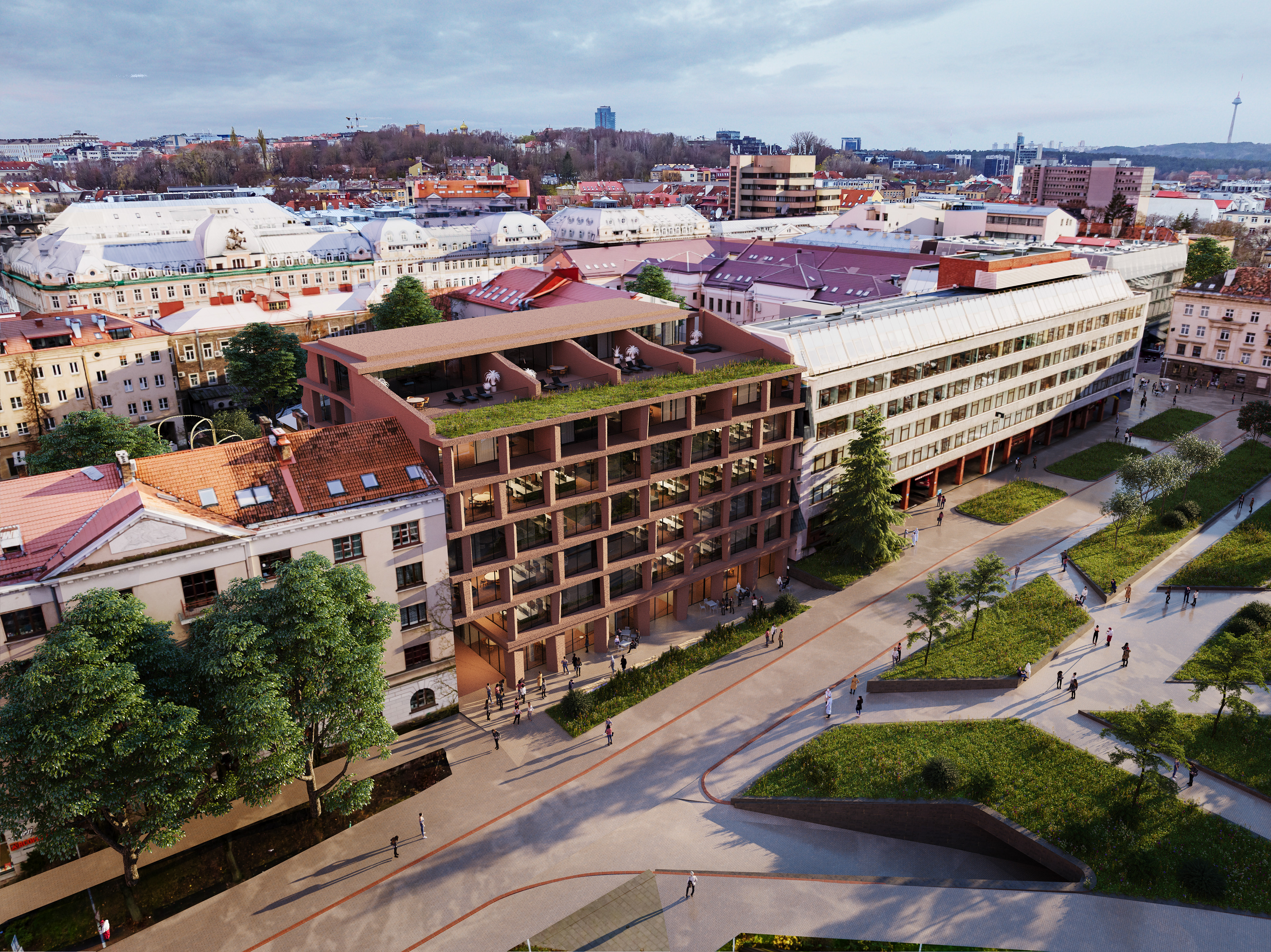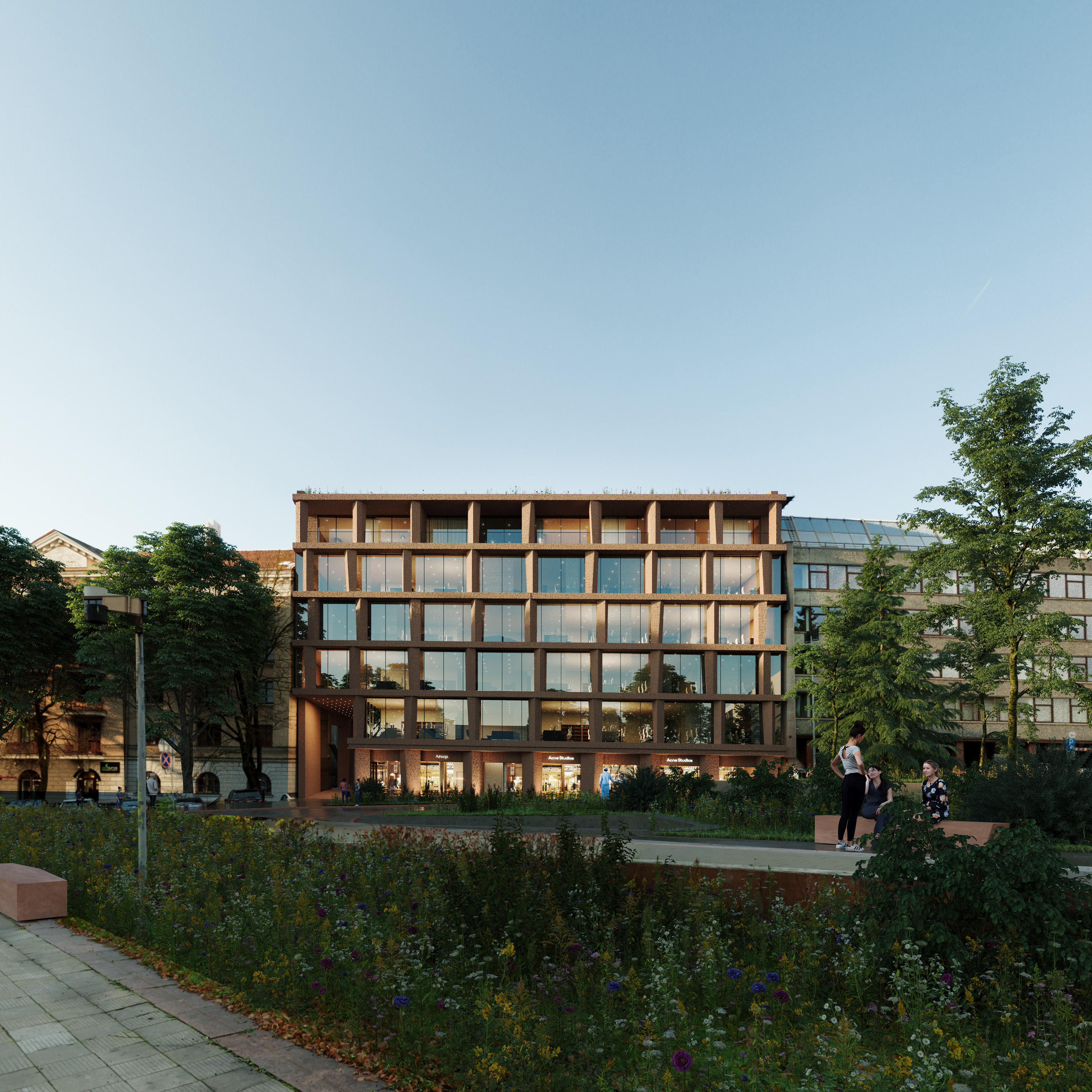 The building is designed to be maximally open to both the north and south sides. In the northern part, you can see not only the opera and ballet theater, but also the Neris embankment, the beginning of Šnipiškės, and the CBD of the city of Vilnius. In the south, there is a huge courtyard of a multi-level block, the existing Ąžuoliukas Music School, and the upper floors of buildings on Gediminas Avenue are visible. The glass facades are included; their horizontality is divided vertically by sculptural columns. The sculptural form of the columns gives softness to the rhythm of the facade, making it no longer strict, but quivering, like a sketch line drawn by hand. The columns of the first floor are larger, thus creating a separation of the plinth from the rest of the facade. In the composition of the adjacent buildings, although by different means, the isolation of the plinth part is also visible.