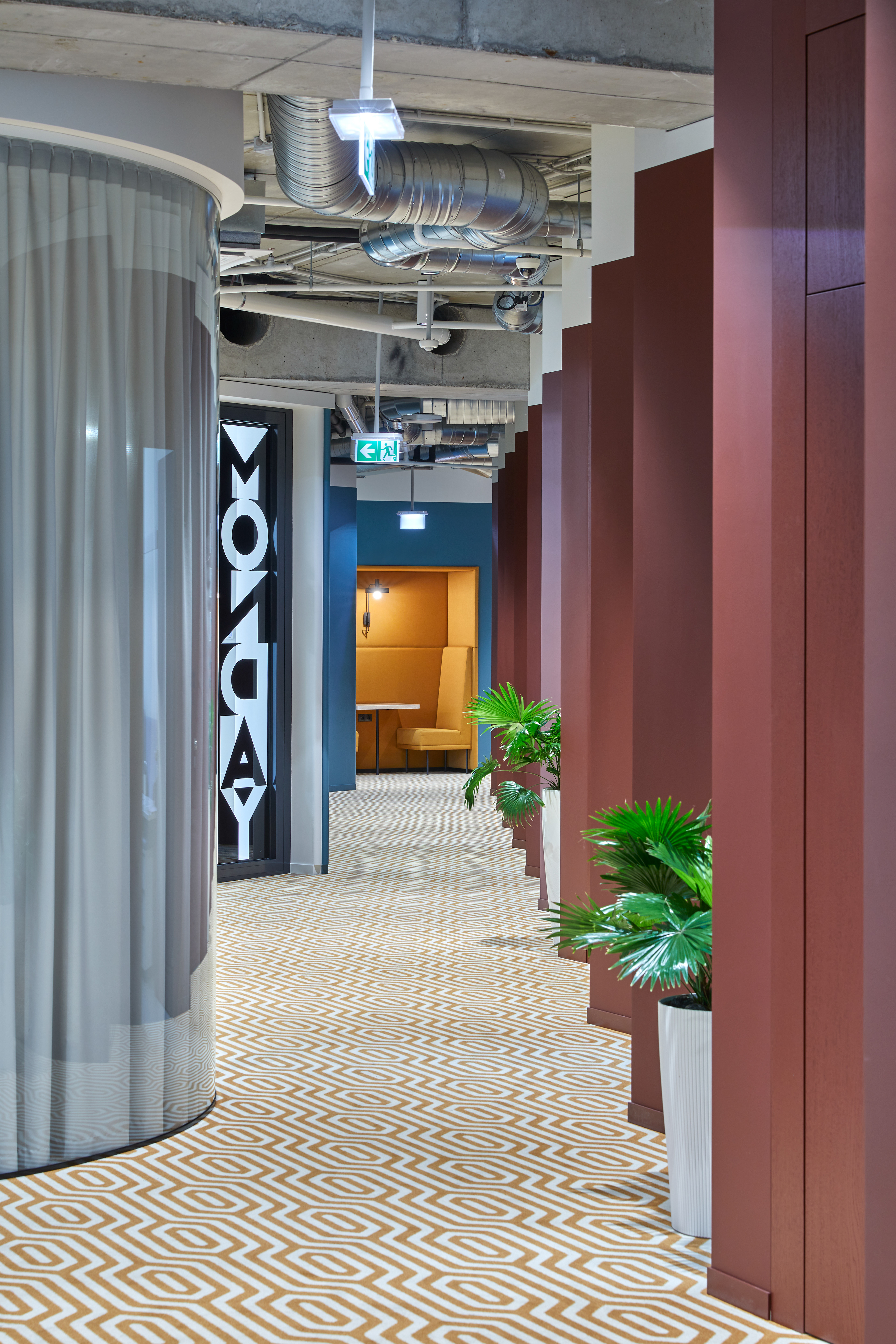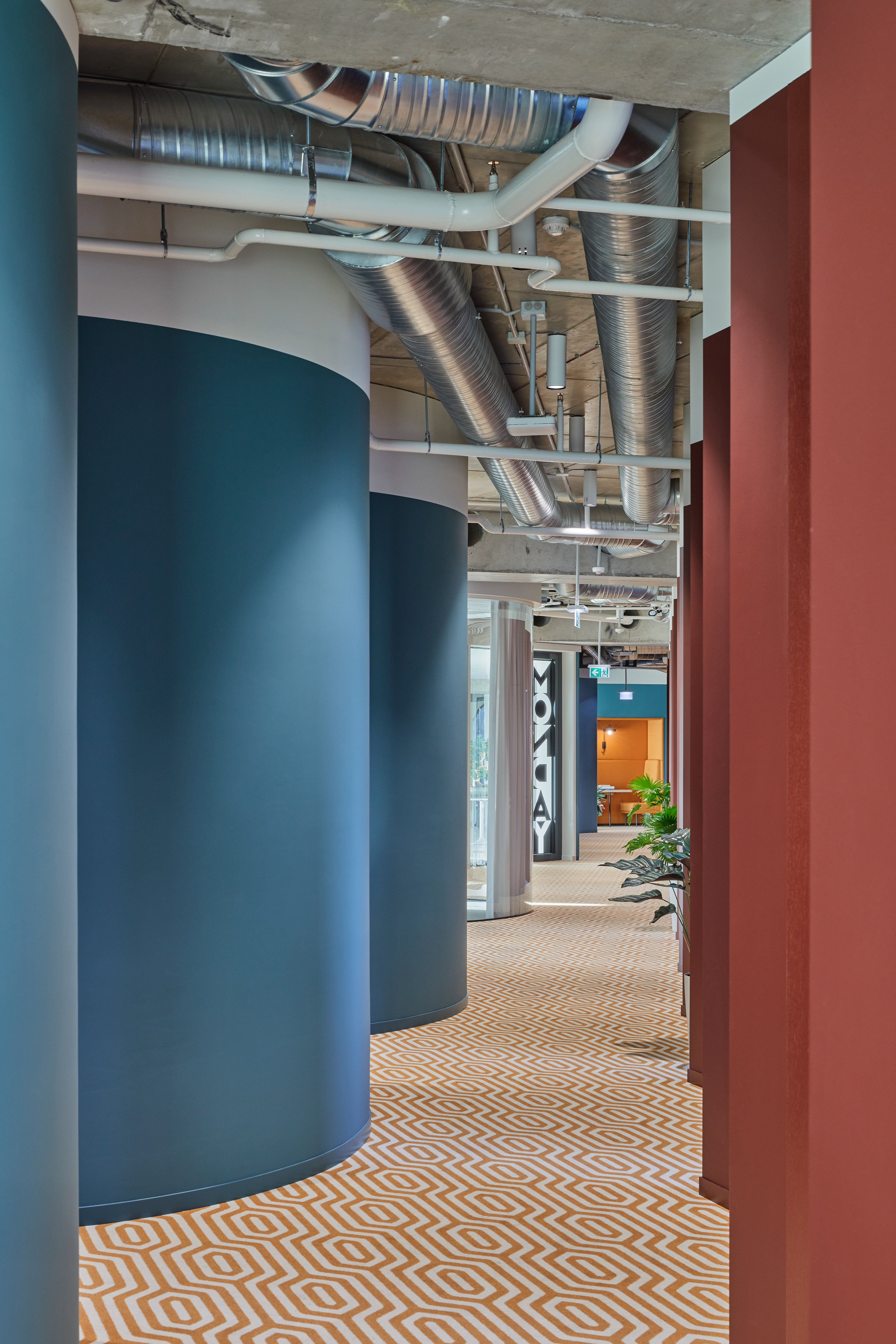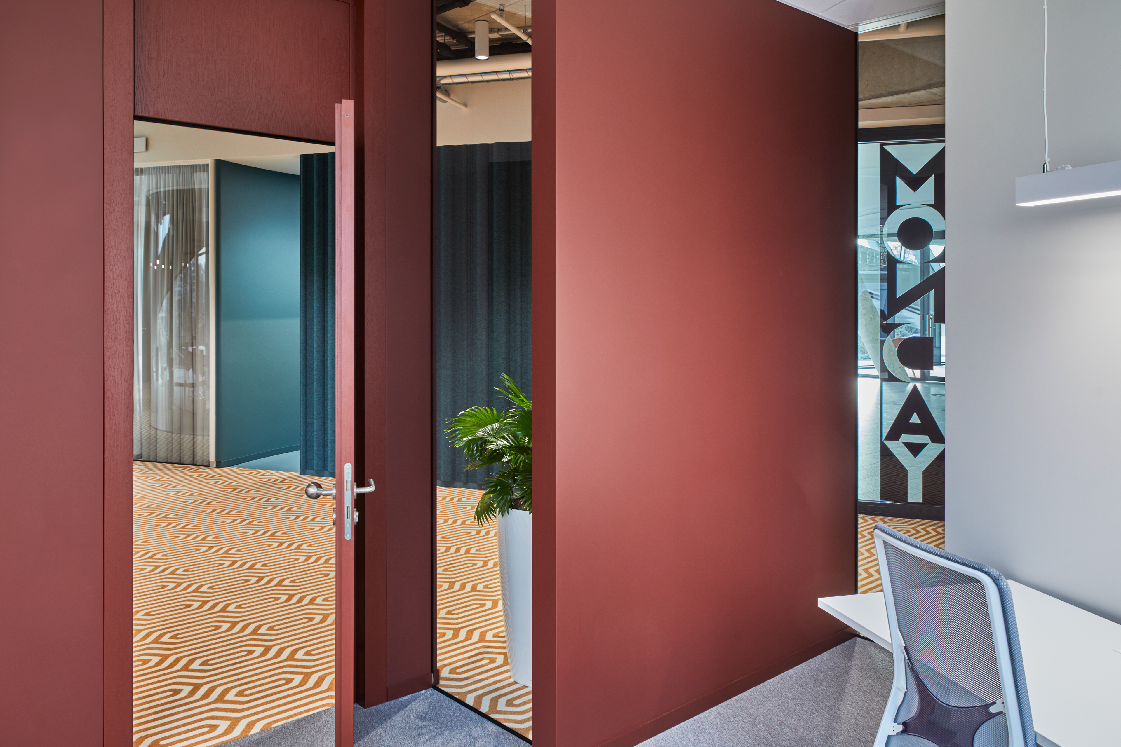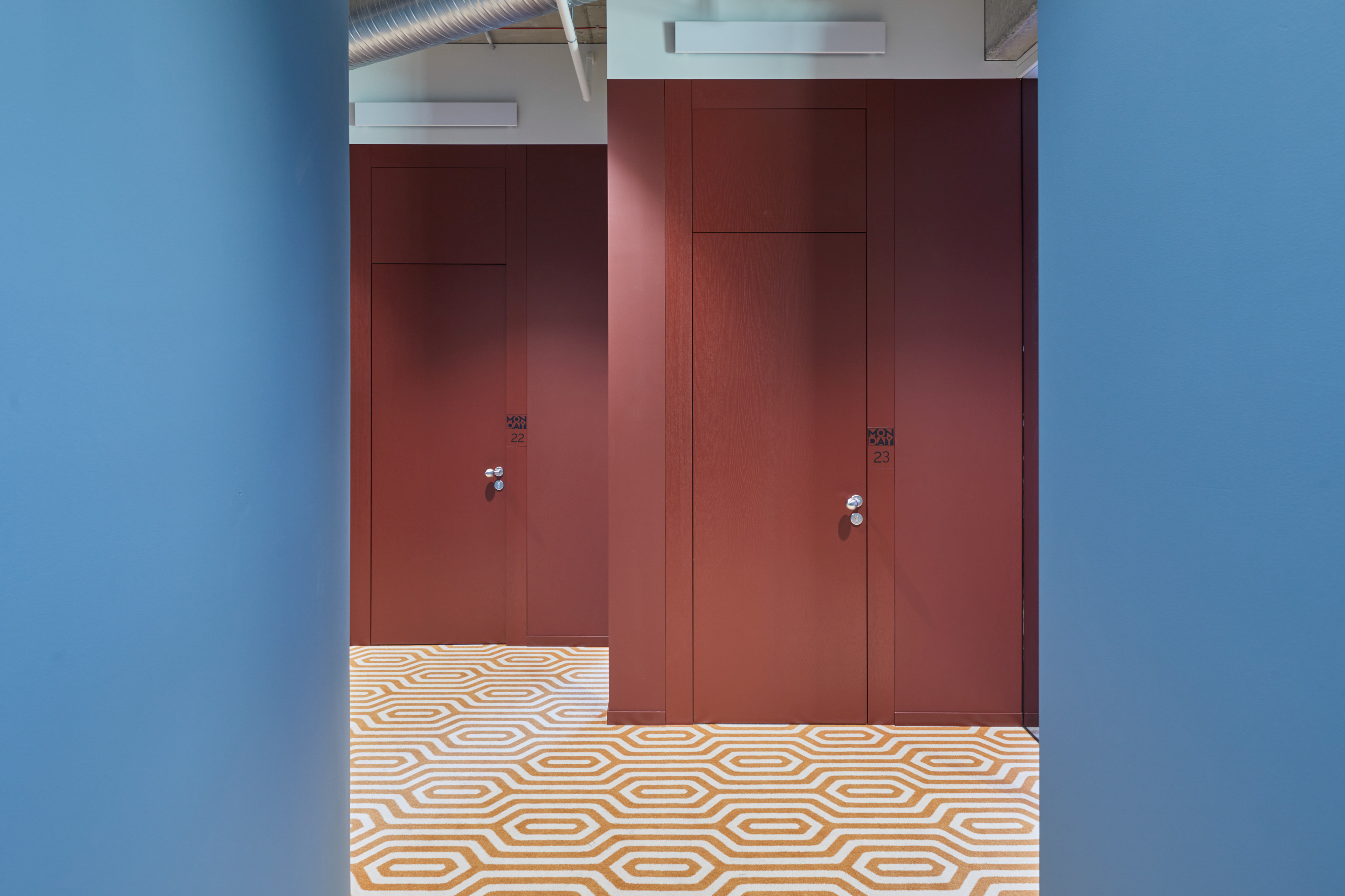 "Monday Office" is a 460 sq. m. co-working space, located on the ground floor of Green Hall 3 business centre in Vilnius, Lithuania. Colorful, bold and incentive, it re-thinks the very concept of shared workplace meeting the demand of social distancing due to the recent pandemic circumstances. The second “Monday Office” remained loyal to its philosophy which proved itself very relevant in the times of Covid 19 pandemic- private, equipped and fully serviced small offices accommodating small teams from 1 to 5 persons. Premises consists of 16 such offices, 2 meeting rooms, kitchenette, coffee point, private and semi-private phone booths, informal leisure area filled with natural daylight and single armchairs scattered through the space. The layout rejects an outdated straight corridor corporate image by positioning partitions in an orthogonal system corresponding the structural grid of the building and not aligning them with the external facades. This solution allowed to create a dynamic silhouette for the main axis of the space which was emphasized by diversifying opposite sides of it. One side was designed using perpendicular straight elements, while curvy silhouette meanders along it on the other side. Contrasting and bright colors plays a key role in the interior. The intention from the beginning was to create a brave and inviting space representing future residents of the office- ambitious, daring, appreciating quality and identity. Calm and neutral tones are used for the interior of the working studios.