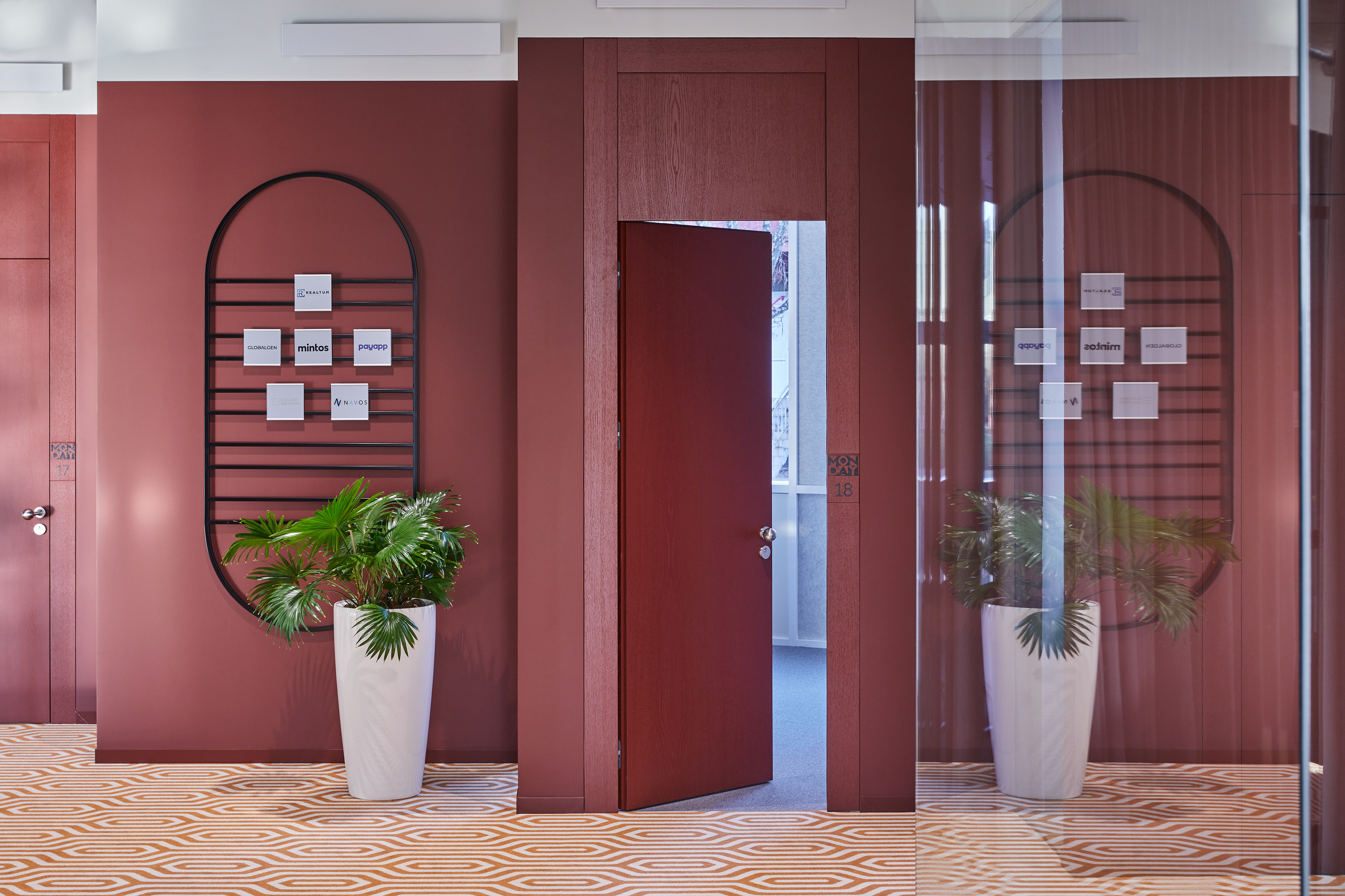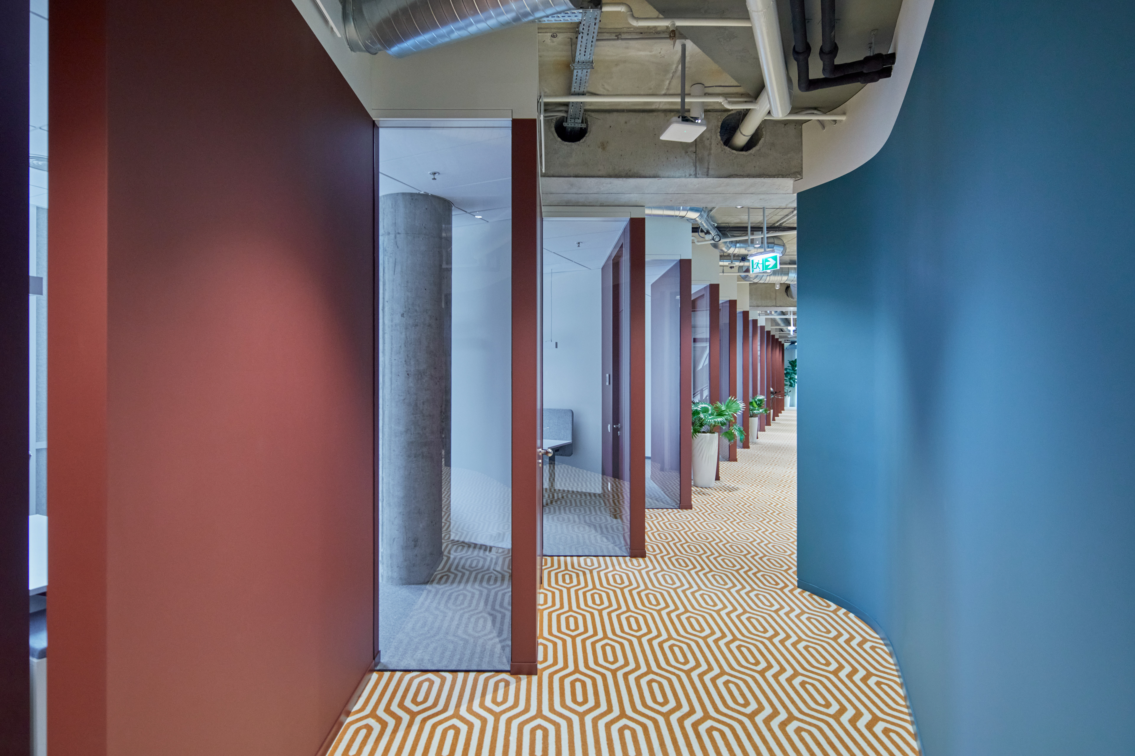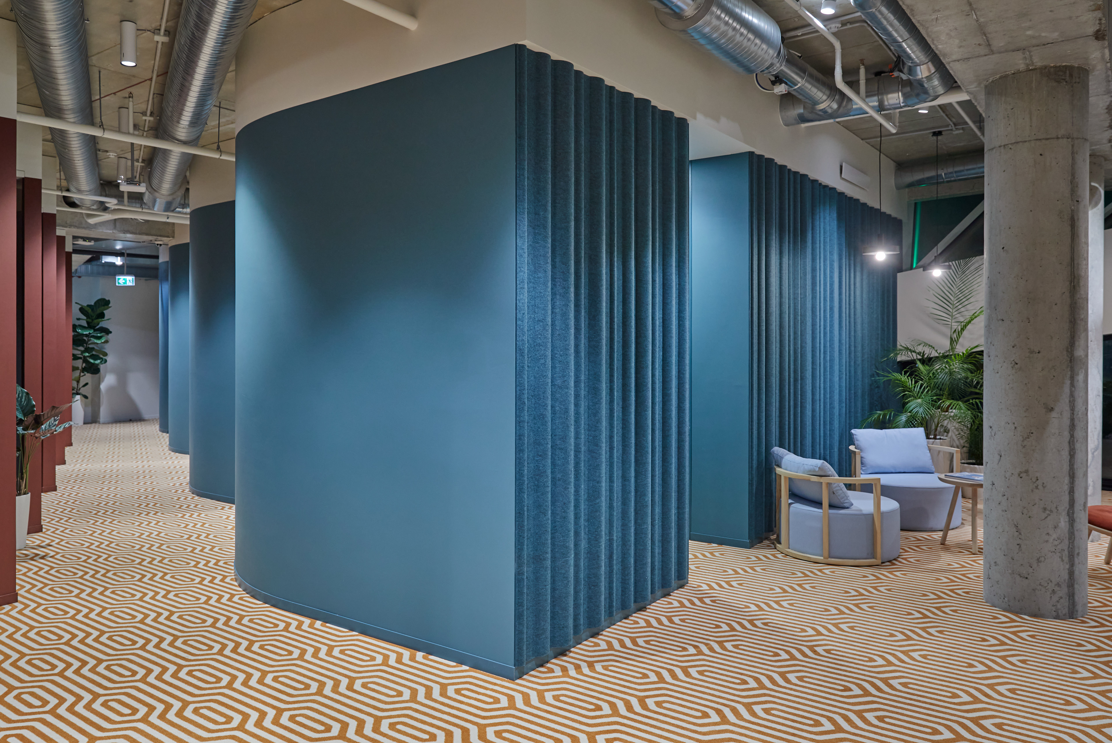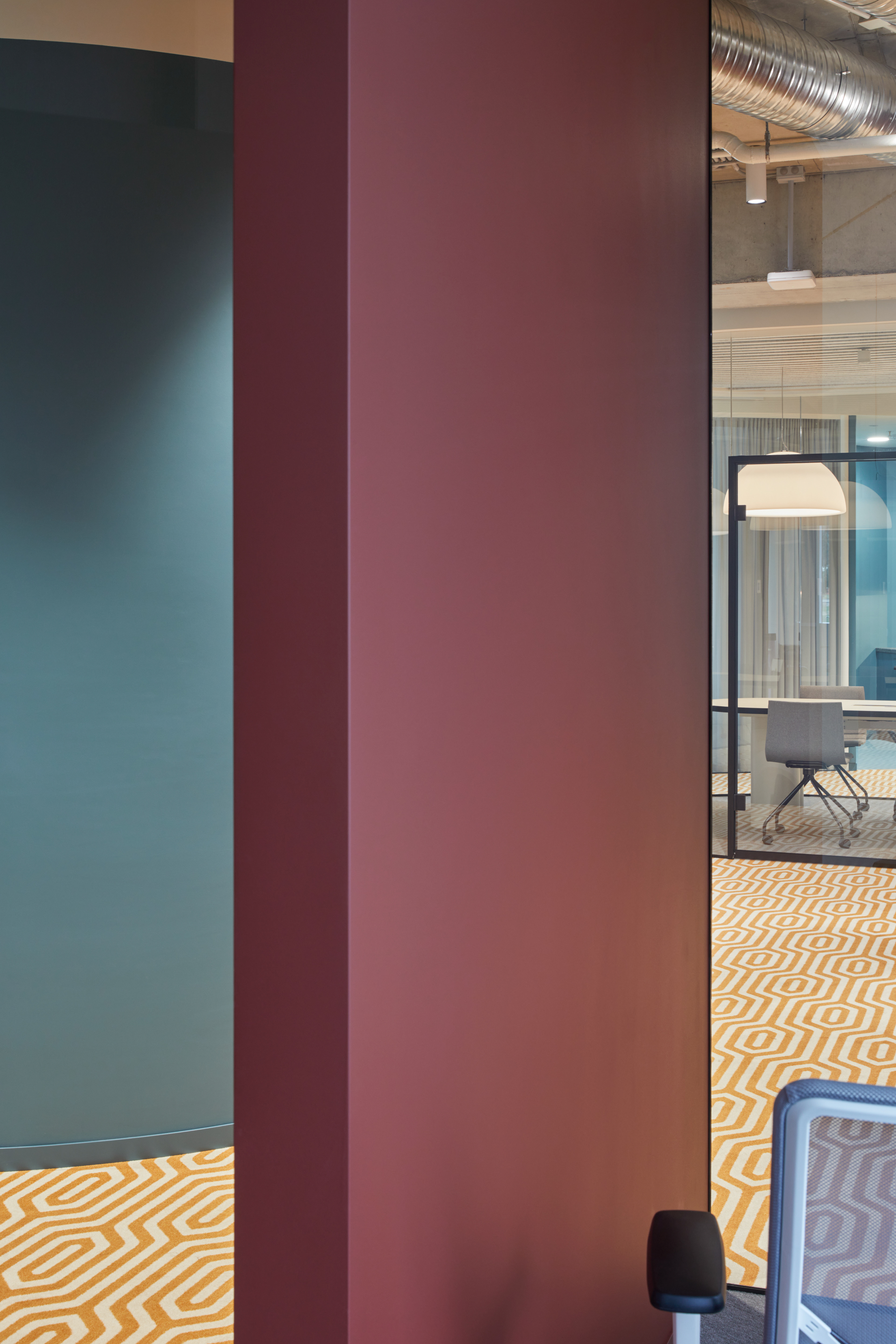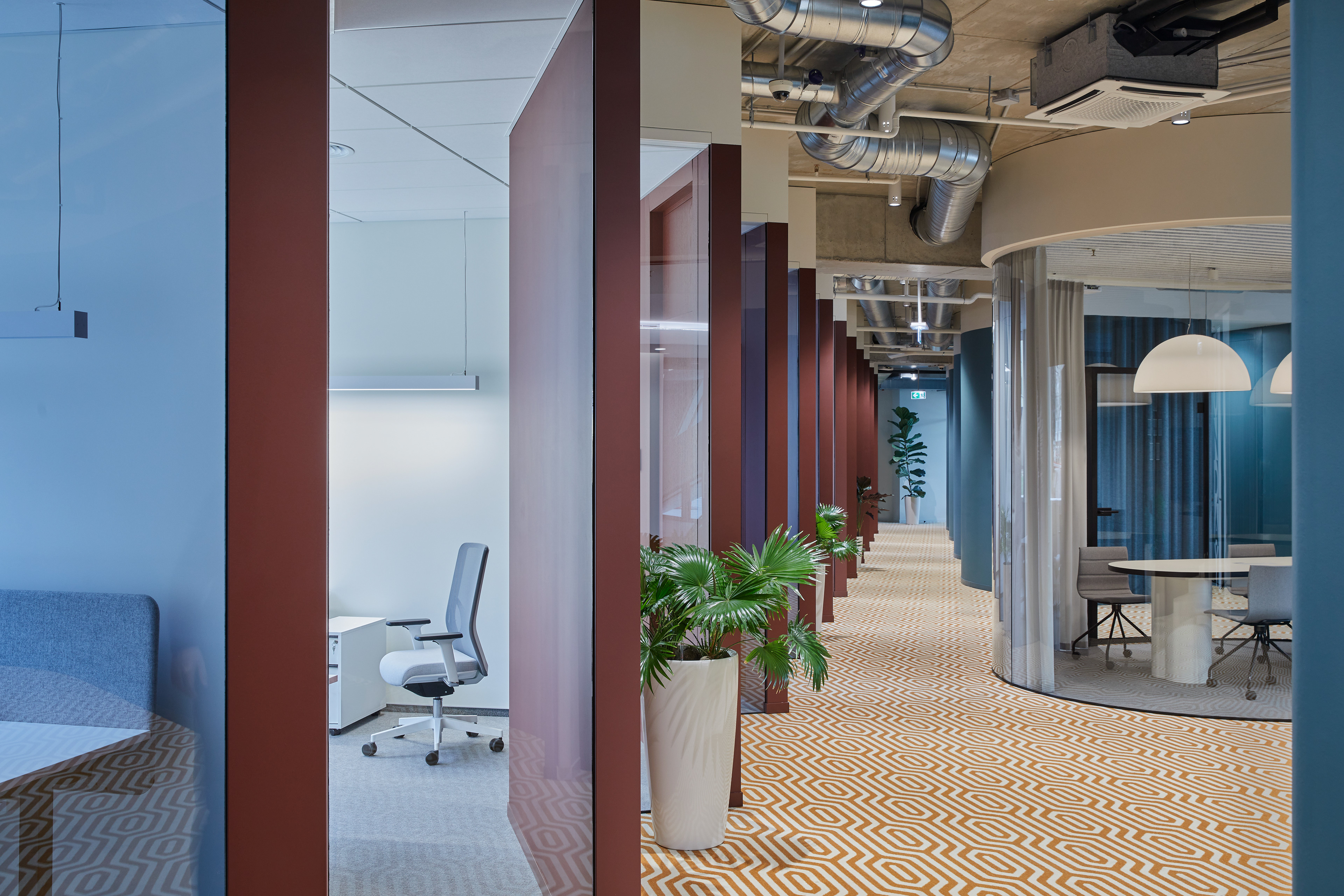 "Monday Office" is a 460 sq. m. co-working space, located on the ground floor of Green Hall 3 business centre in Vilnius, Lithuania. Colorful, bold and incentive, it re-thinks the very concept of shared workplace meeting the demand of social distancing due to the recent pandemic circumstances. The second “Monday Office” remained loyal to its philosophy which proved itself very relevant in the times of Covid 19 pandemic- private, equipped and fully serviced small offices accommodating small teams from 1 to 5 persons. Premises consists of 16 such offices, 2 meeting rooms, kitchenette, coffee point, private and semi-private phone booths, informal leisure area filled with natural daylight and single armchairs scattered through the space. The layout rejects an outdated straight corridor corporate image by positioning partitions in an orthogonal system corresponding the structural grid of the building and not aligning them with the external facades. This solution allowed to create a dynamic silhouette for the main axis of the space which was emphasized by diversifying opposite sides of it. One side was designed using perpendicular straight elements, while curvy silhouette meanders along it on the other side. Contrasting and bright colors plays a key role in the interior. The intention from the beginning was to create a brave and inviting space representing future residents of the office- ambitious, daring, appreciating quality and identity. Calm and neutral tones are used for the interior of the working studios.