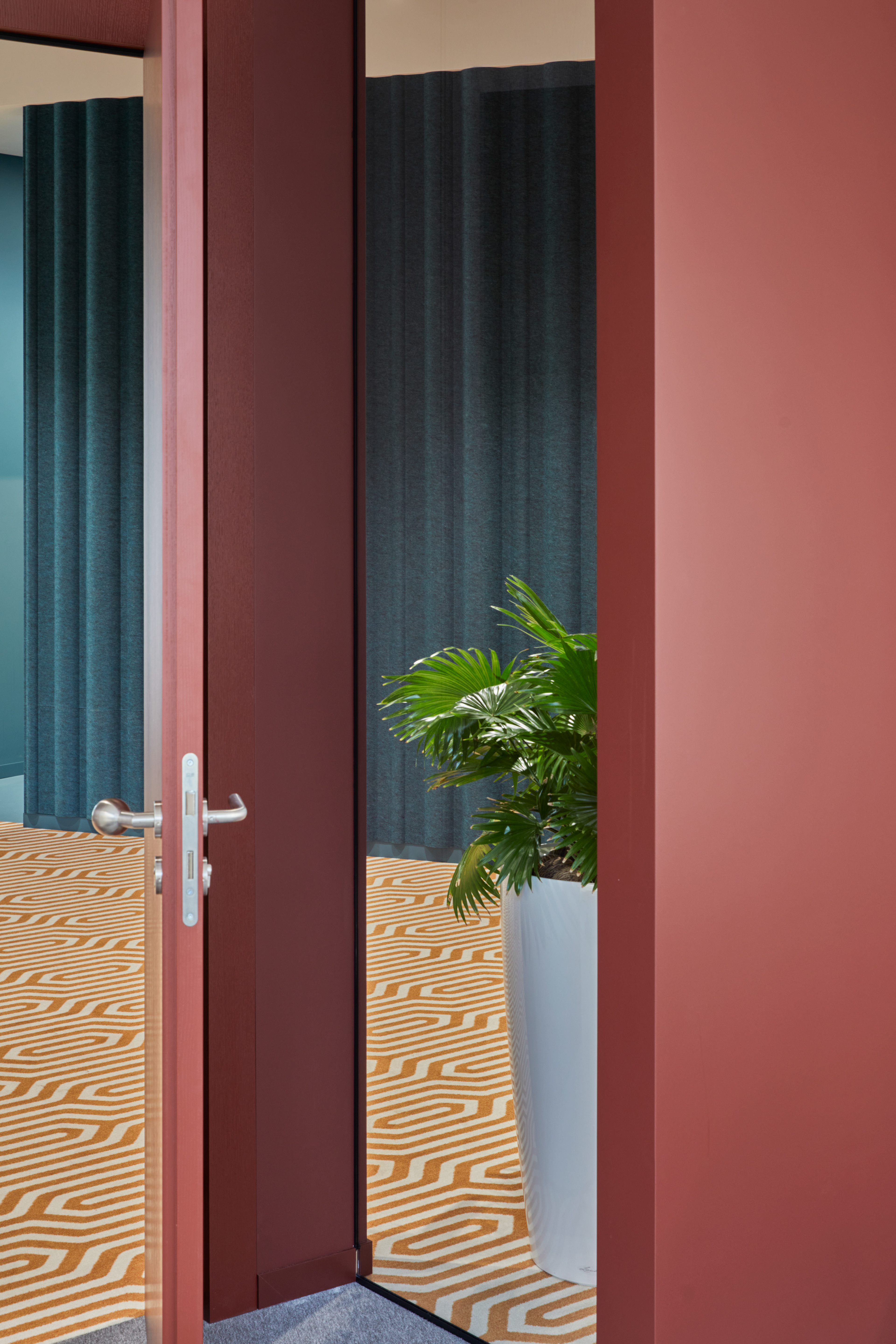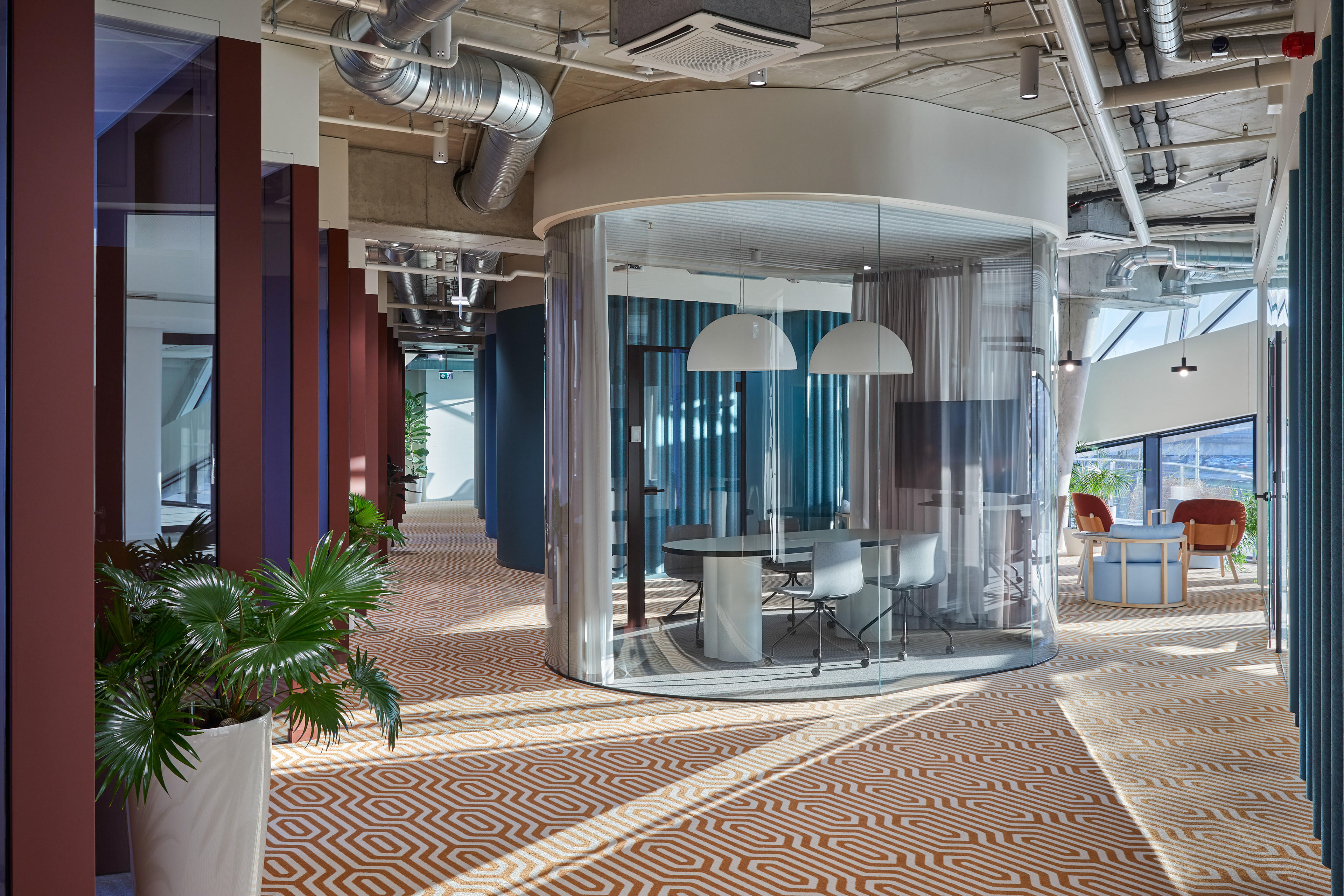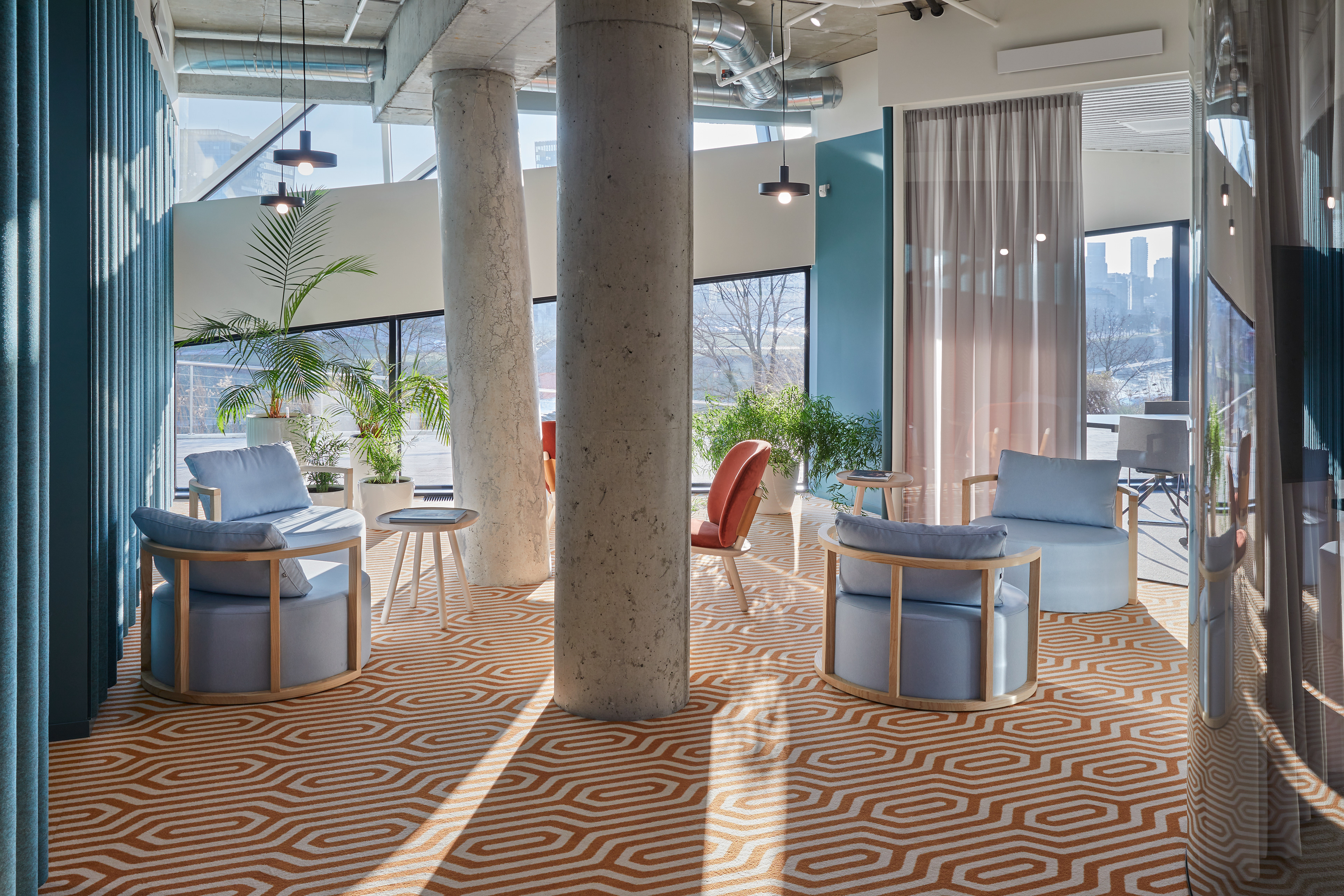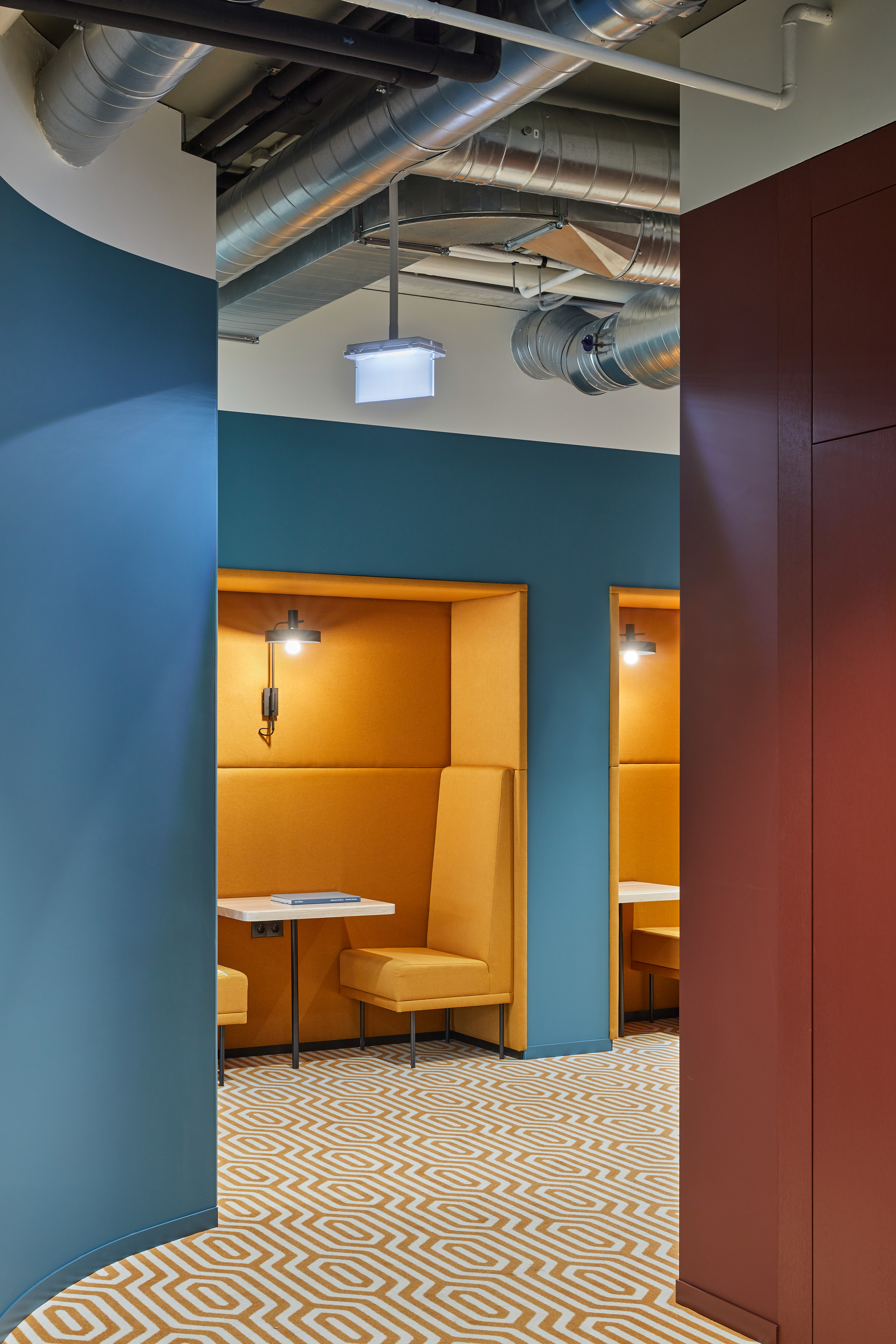 "Monday Office" is a 460 sq. m. co-working space, located on the ground floor of Green Hall 3 business centre in Vilnius, Lithuania. Colorful, bold and incentive, it re-thinks the very concept of shared workplace meeting the demand of social distancing due to the recent pandemic circumstances. The second “Monday Office” remained loyal to its philosophy which proved itself very relevant in the times of Covid 19 pandemic- private, equipped and fully serviced small offices accommodating small teams from 1 to 5 persons. Premises consists of 16 such offices, 2 meeting rooms, kitchenette, coffee point, private and semi-private phone booths, informal leisure area filled with natural daylight and single armchairs scattered through the space. The layout rejects an outdated straight corridor corporate image by positioning partitions in an orthogonal system corresponding the structural grid of the building and not aligning them with the external facades. This solution allowed to create a dynamic silhouette for the main axis of the space which was emphasized by diversifying opposite sides of it. One side was designed using perpendicular straight elements, while curvy silhouette meanders along it on the other side. Contrasting and bright colors plays a key role in the interior. The intention from the beginning was to create a brave and inviting space representing future residents of the office- ambitious, daring, appreciating quality and identity. Calm and neutral tones are used for the interior of the working studios.