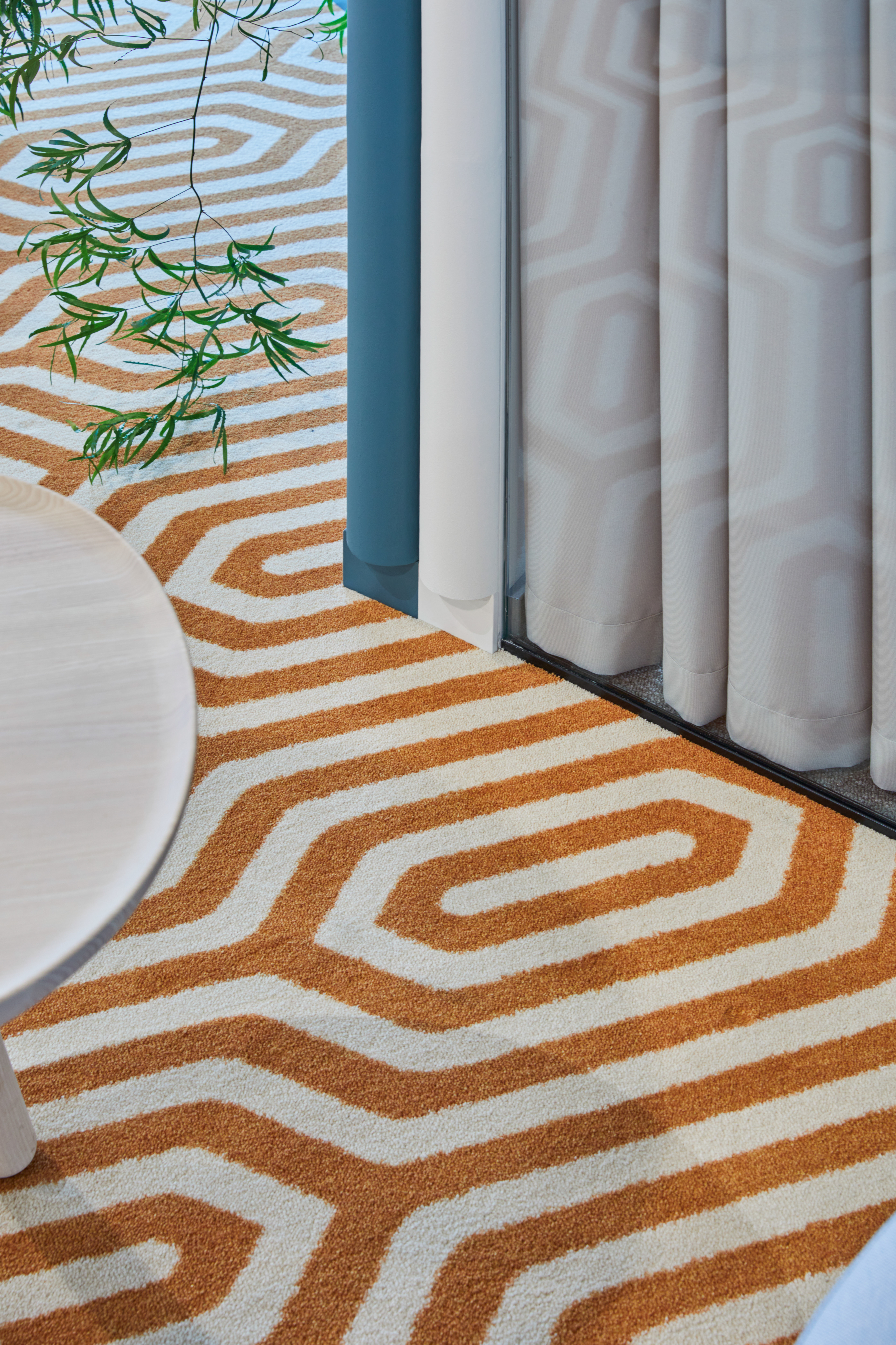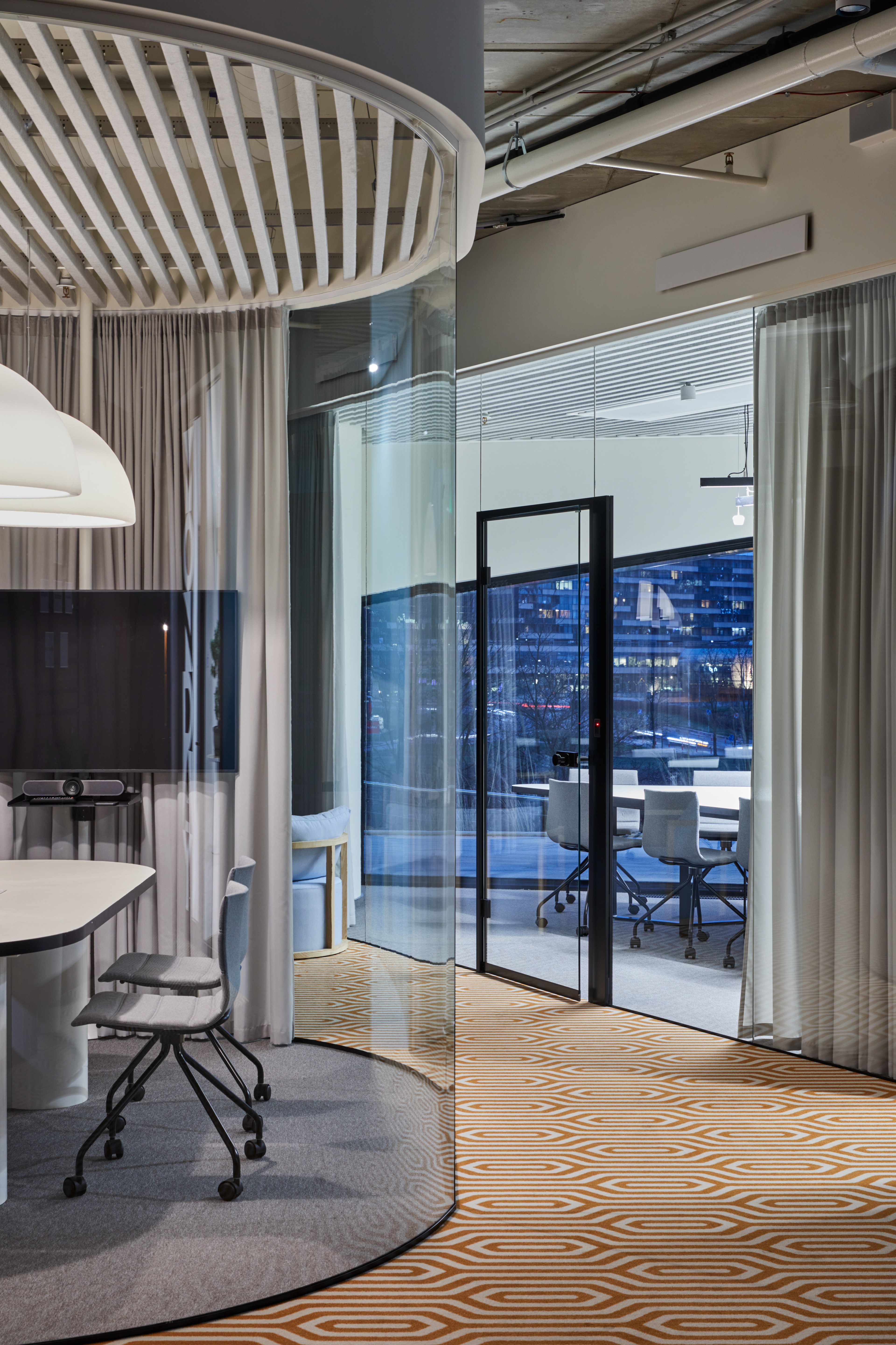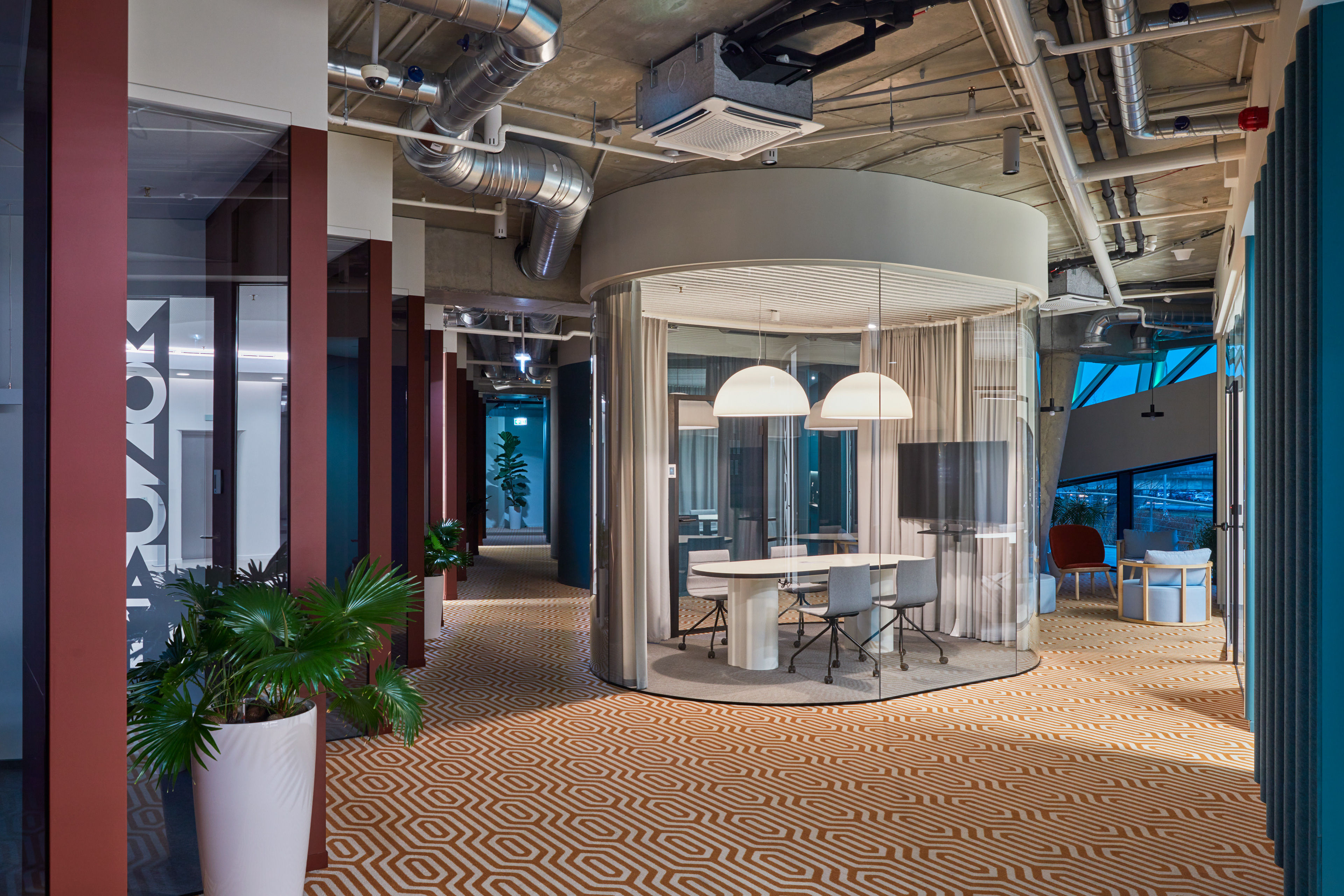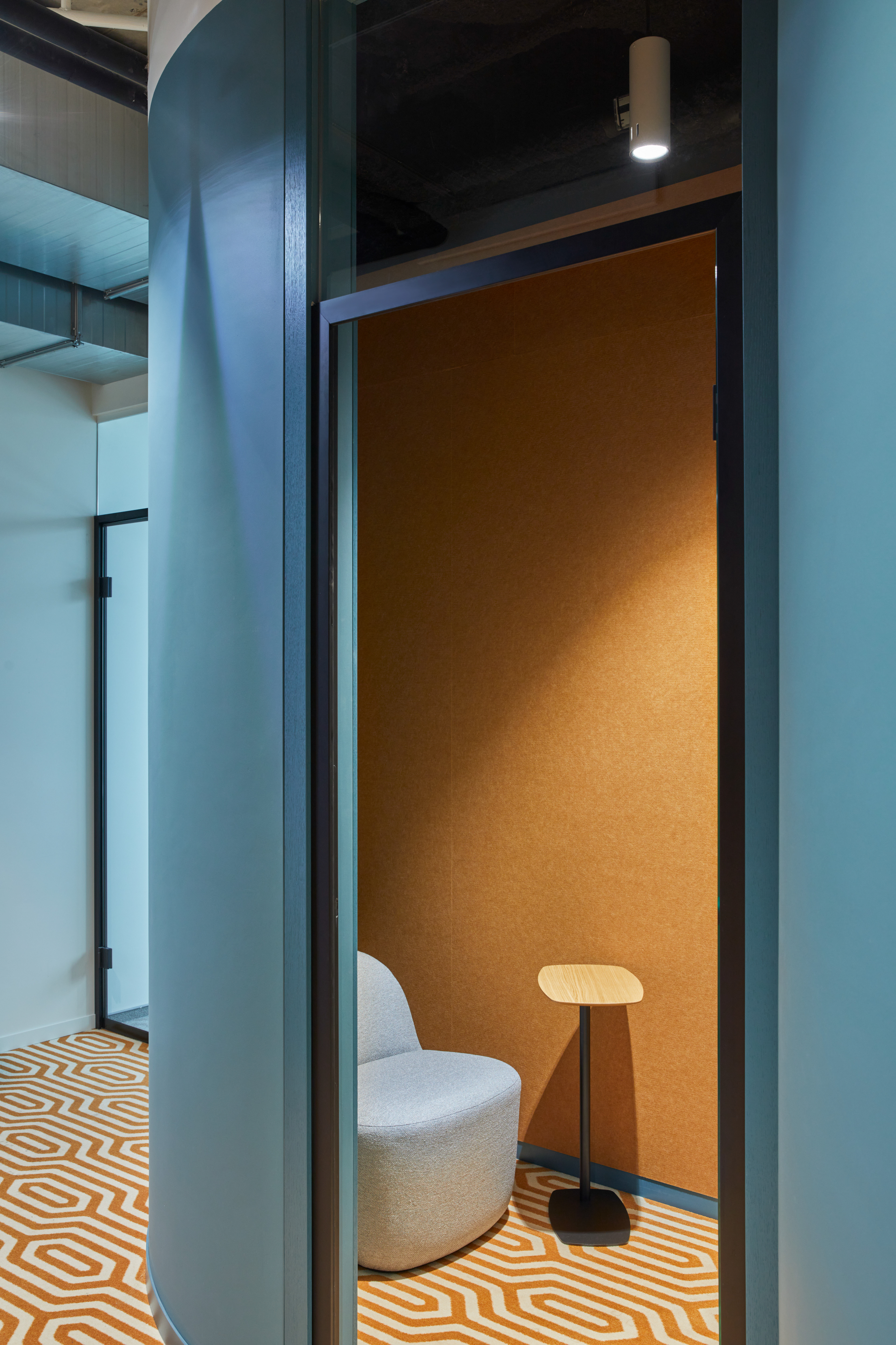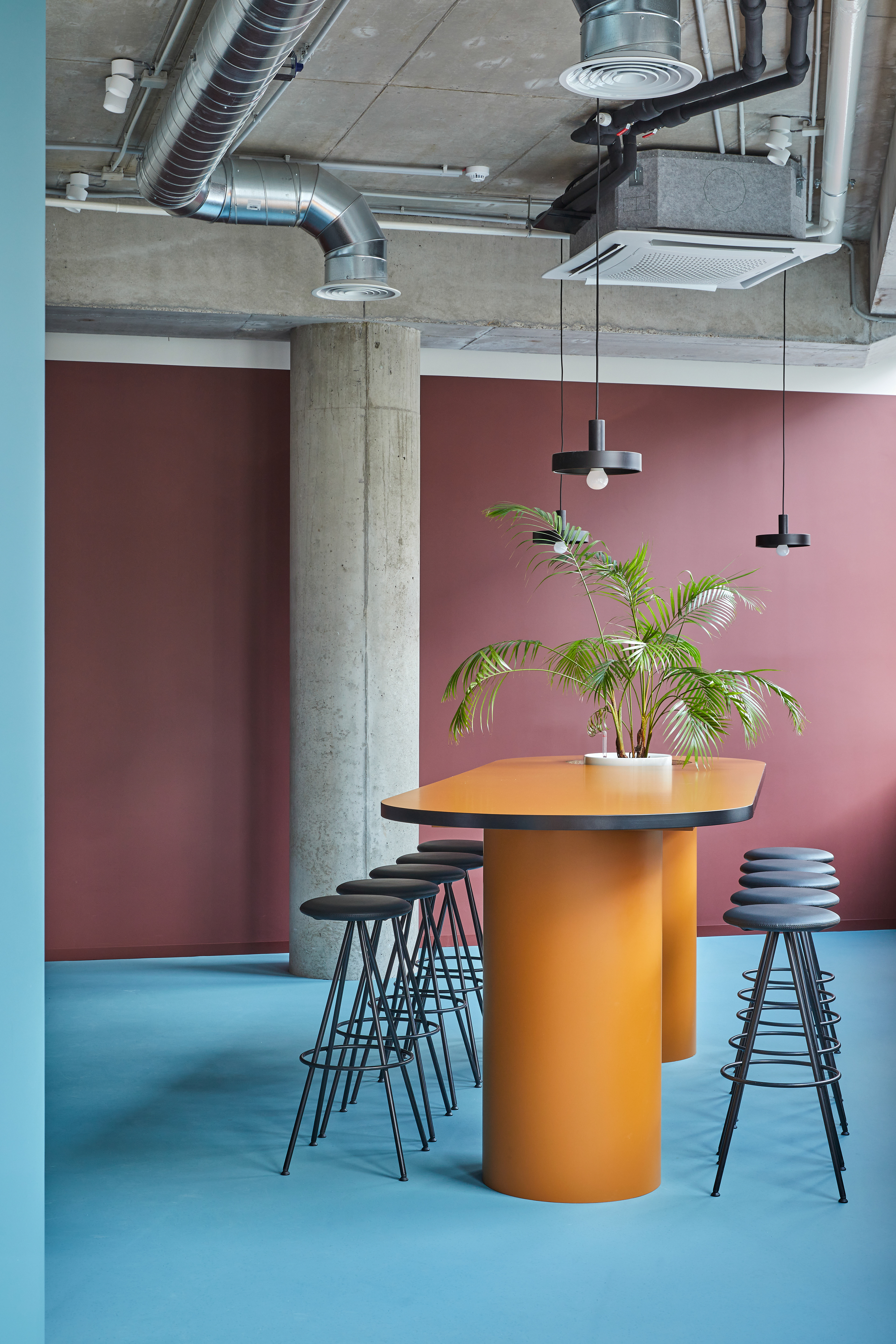 "Monday Office" is a 460 sq. m. co-working space, located on the ground floor of Green Hall 3 business centre in Vilnius, Lithuania. Colorful, bold and incentive, it re-thinks the very concept of shared workplace meeting the demand of social distancing due to the recent pandemic circumstances. The second “Monday Office” remained loyal to its philosophy which proved itself very relevant in the times of Covid 19 pandemic- private, equipped and fully serviced small offices accommodating small teams from 1 to 5 persons. Premises consists of 16 such offices, 2 meeting rooms, kitchenette, coffee point, private and semi-private phone booths, informal leisure area filled with natural daylight and single armchairs scattered through the space. The layout rejects an outdated straight corridor corporate image by positioning partitions in an orthogonal system corresponding the structural grid of the building and not aligning them with the external facades. This solution allowed to create a dynamic silhouette for the main axis of the space which was emphasized by diversifying opposite sides of it. One side was designed using perpendicular straight elements, while curvy silhouette meanders along it on the other side. Contrasting and bright colors plays a key role in the interior. The intention from the beginning was to create a brave and inviting space representing future residents of the office- ambitious, daring, appreciating quality and identity. Calm and neutral tones are used for the interior of the working studios.