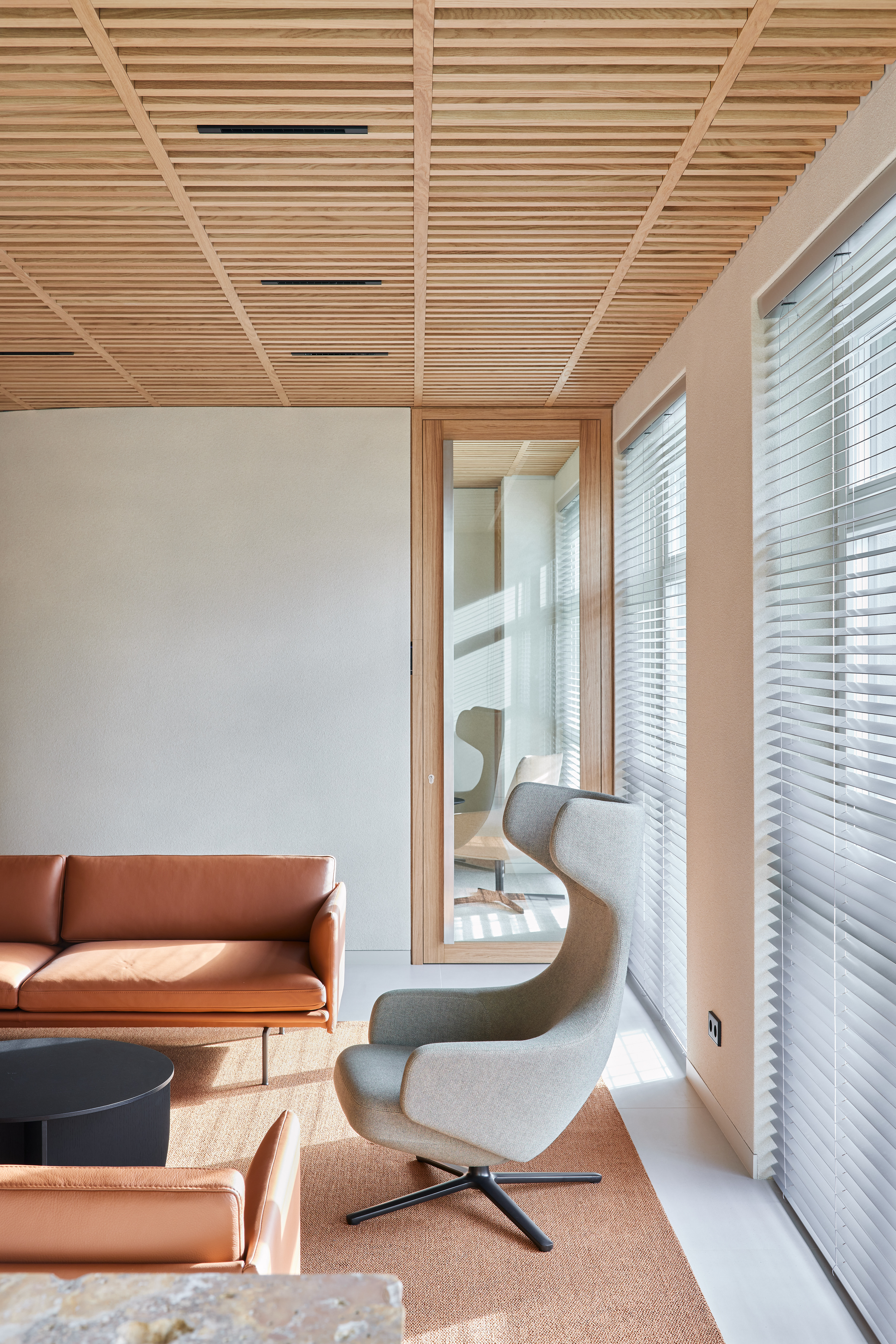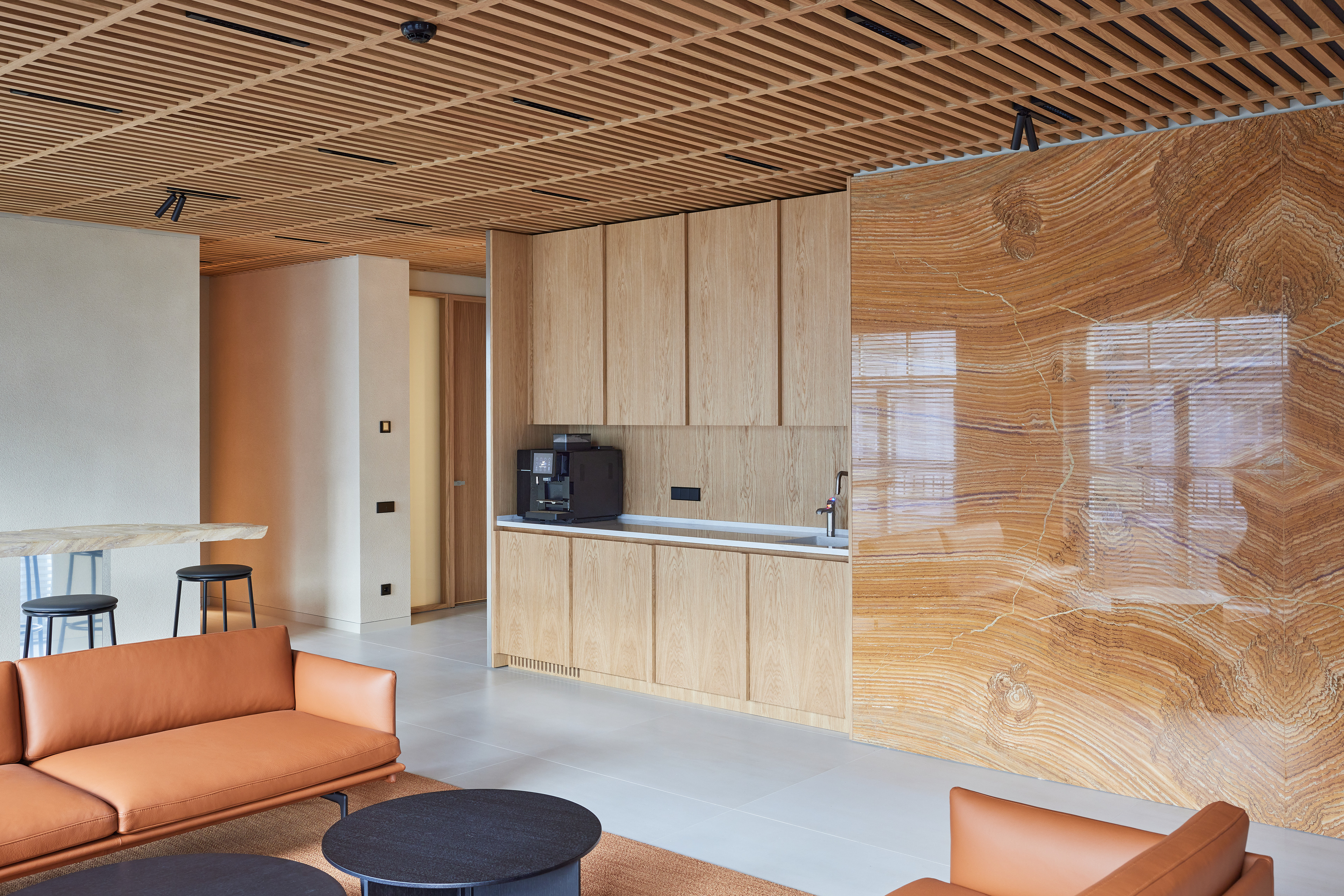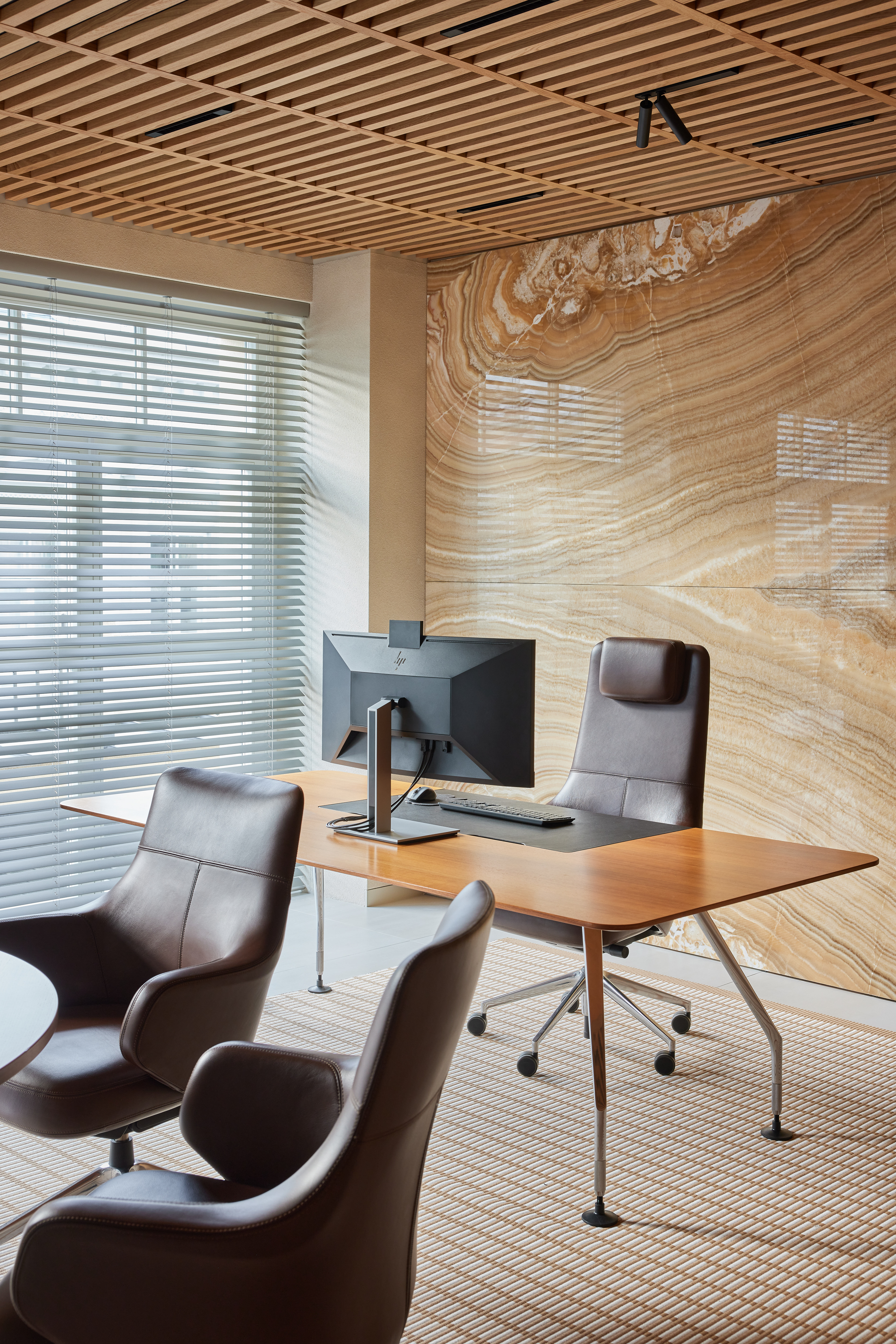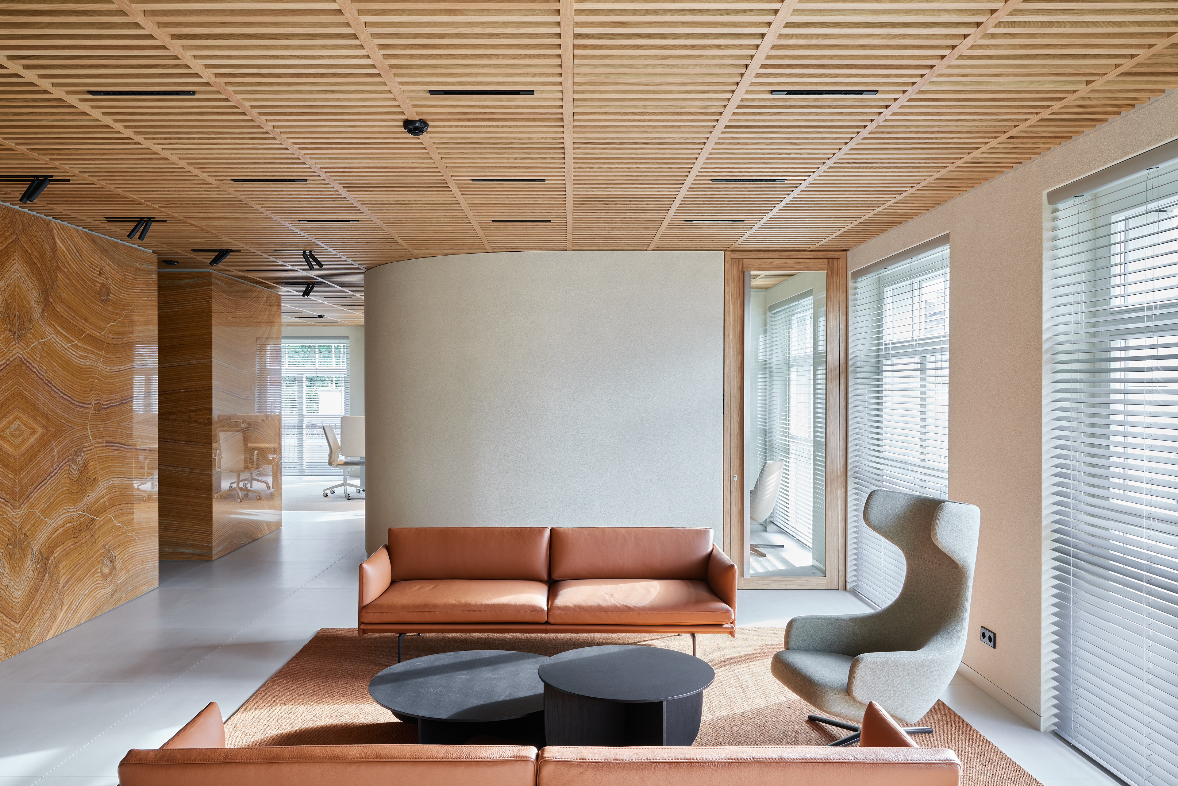 This office interior is designed for a small management team. It has three main spaces - offices for individual work and meetings, an open working space for the rest of the staff and a place to relax. The straight, sharp lines of the interior are distinguished by curved elements that divide the spaces and give them a sculptural-like image. All the elements are united by a ceiling of finely split oak beams. Wood and stone, natural materials with similar shades, dominate the office. Neutral grey walls and flooring emphasizes them even more. Small spaces, warm colors and natural, non-conflicting materials give this office a cozy feeling.