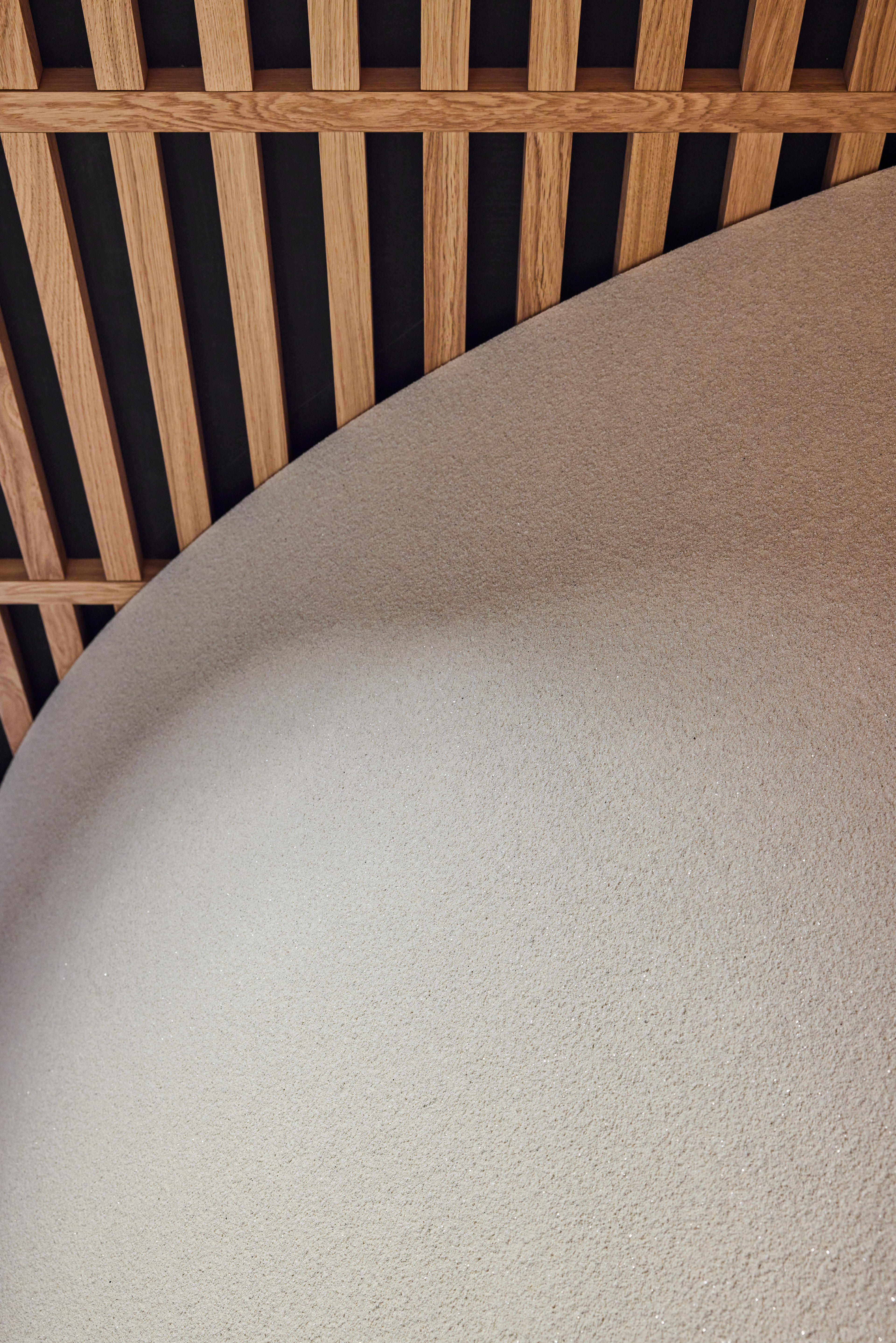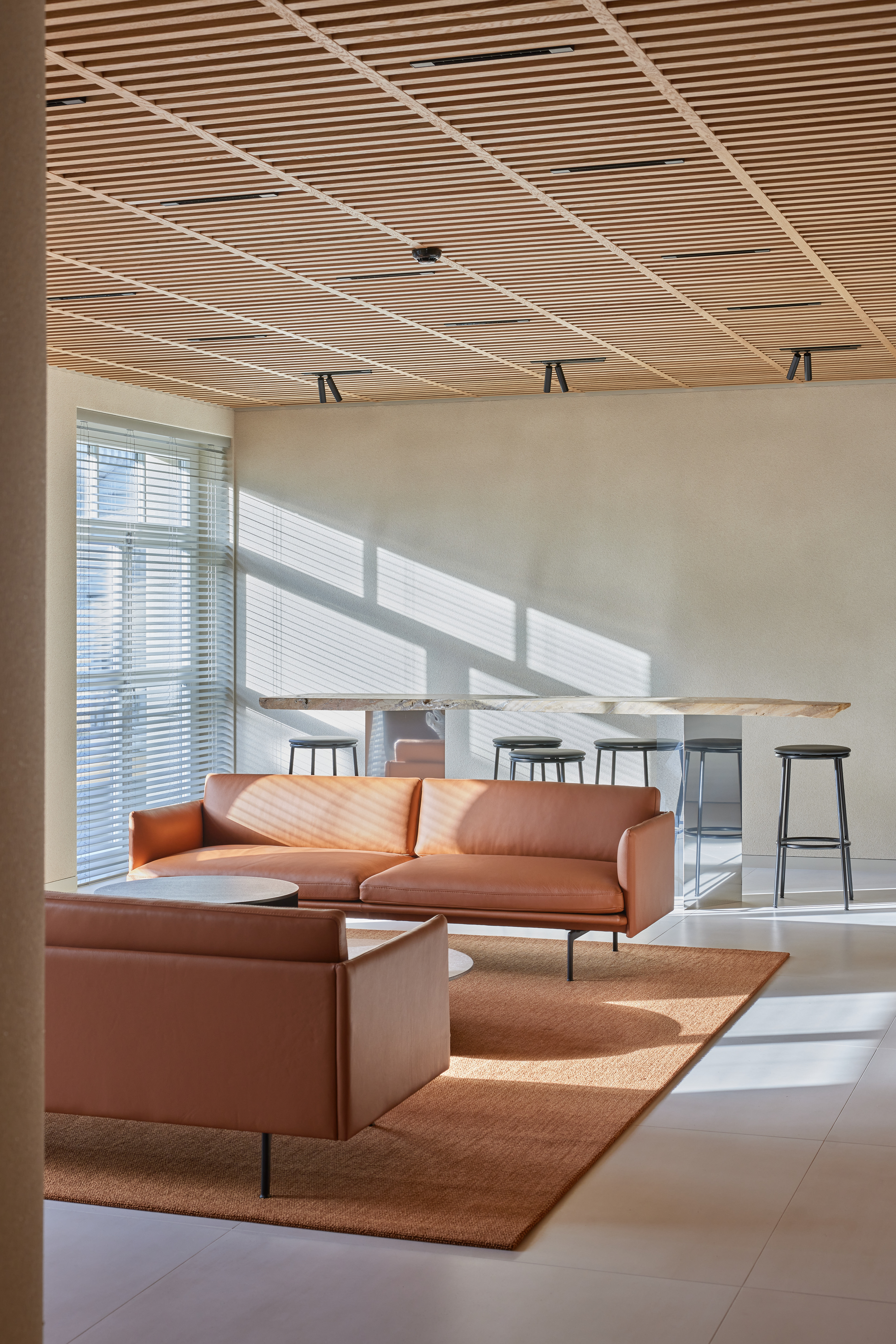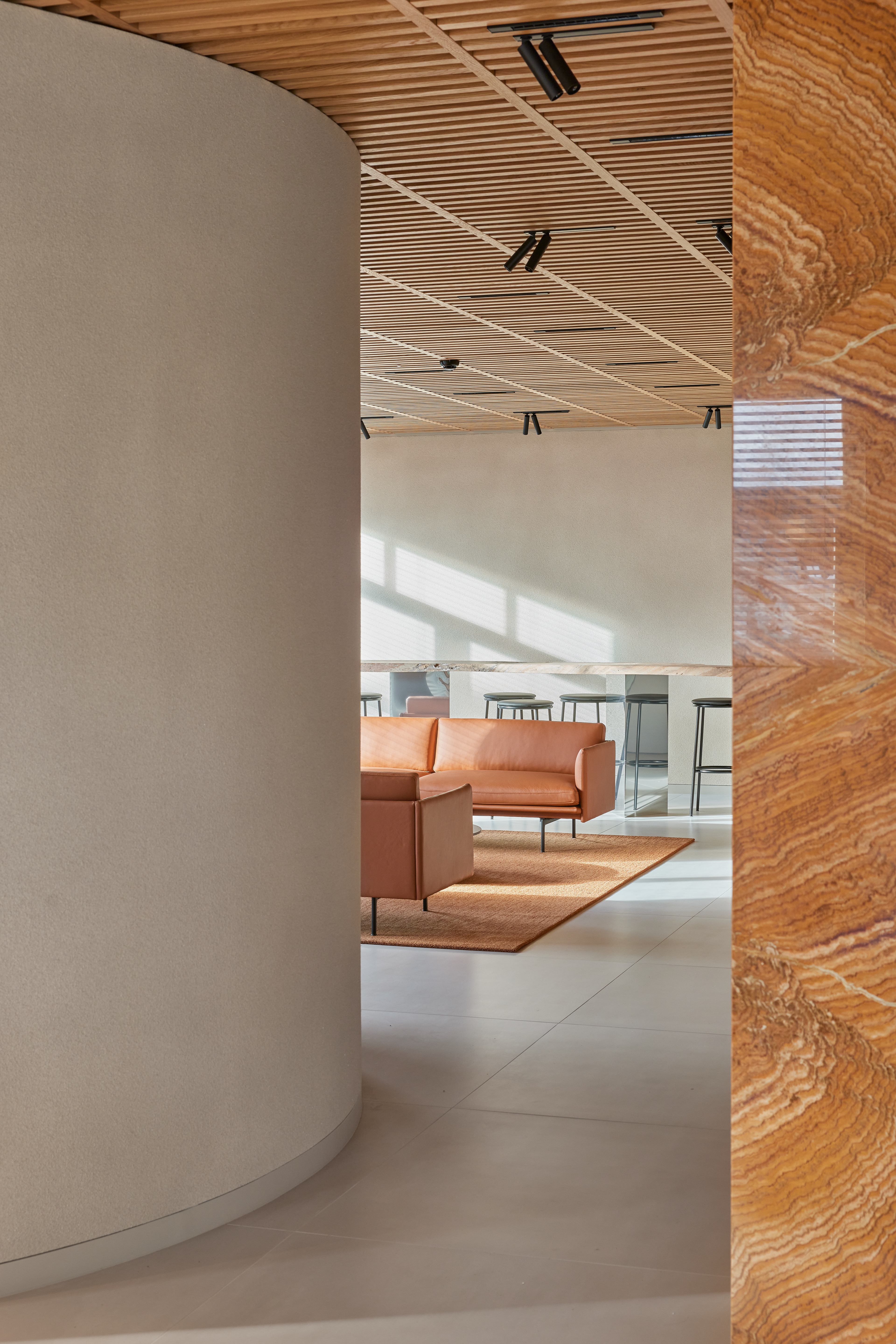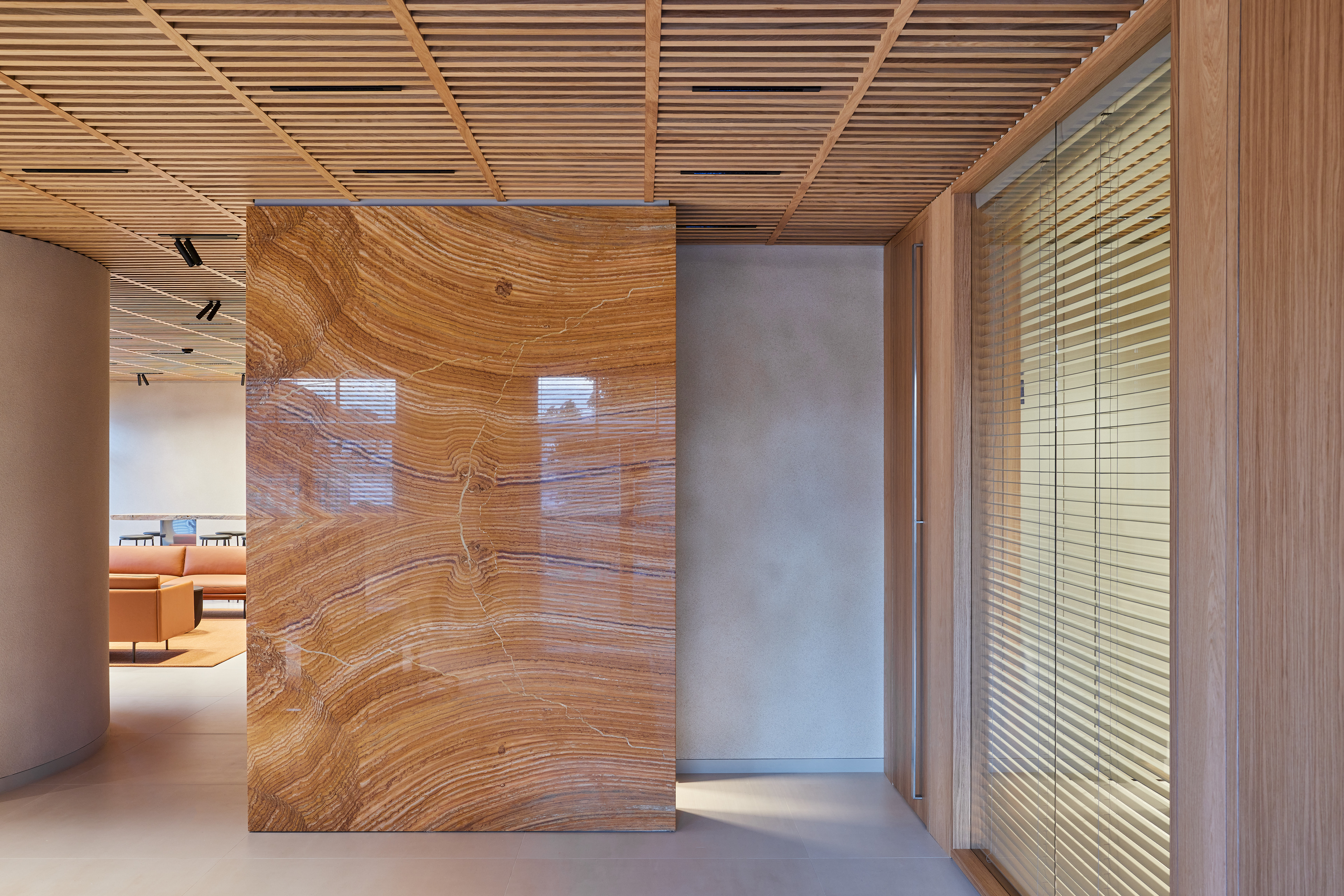 This office interior is designed for a small management team. It has three main spaces - offices for individual work and meetings, an open working space for the rest of the staff and a place to relax. The straight, sharp lines of the interior are distinguished by curved elements that divide the spaces and give them a sculptural-like image. All the elements are united by a ceiling of finely split oak beams. Wood and stone, natural materials with similar shades, dominate the office. Neutral grey walls and flooring emphasizes them even more. Small spaces, warm colors and natural, non-conflicting materials give this office a cozy feeling.