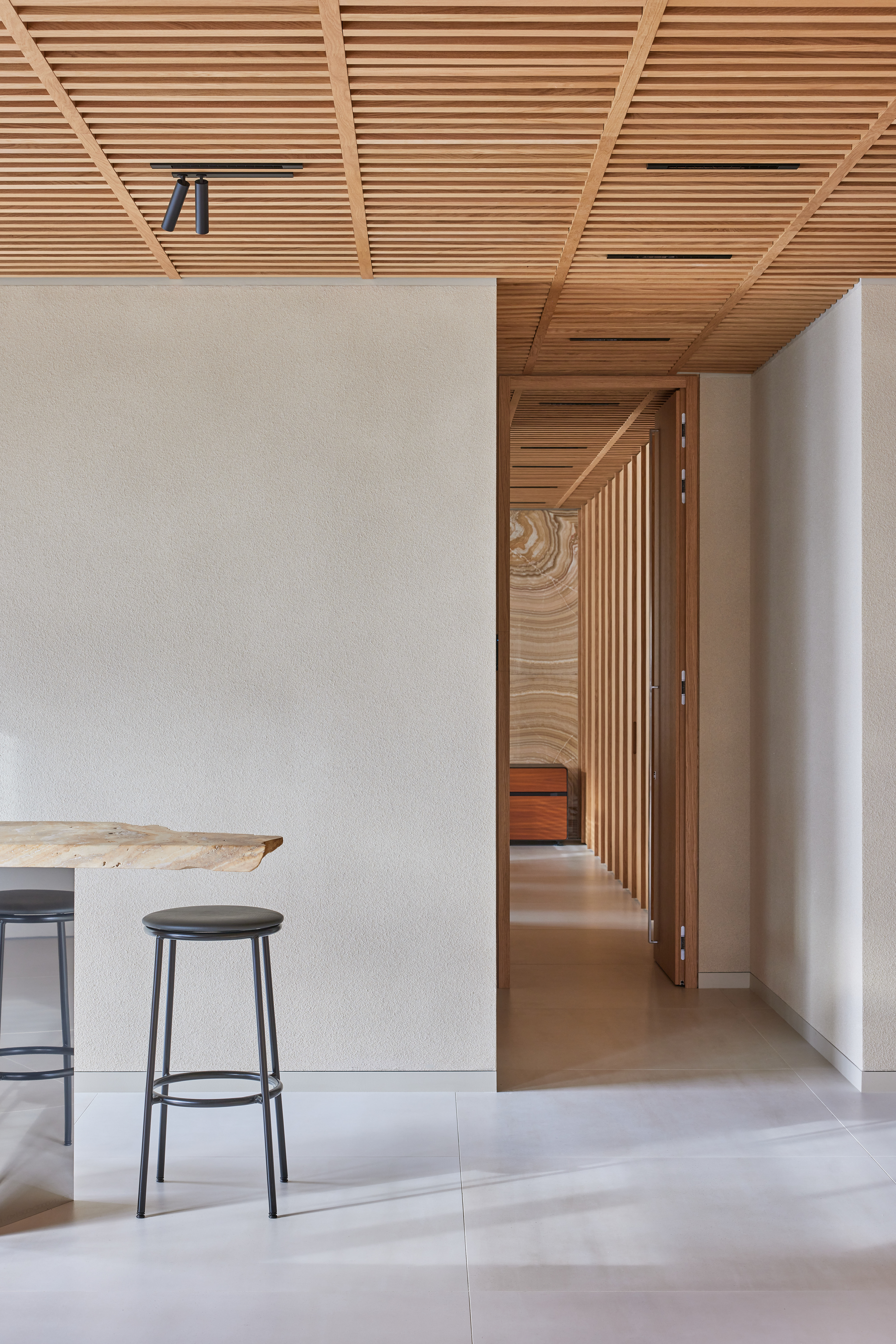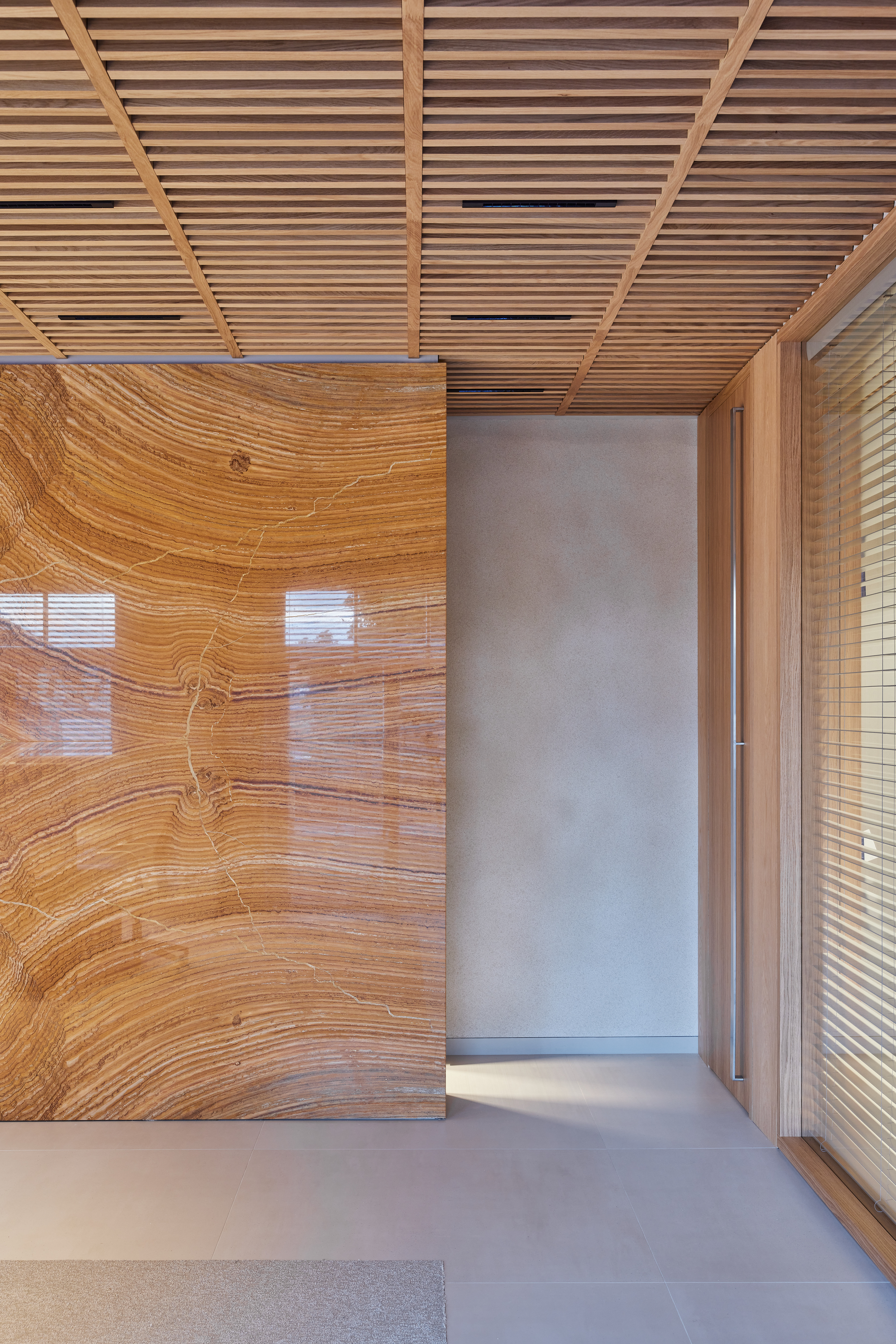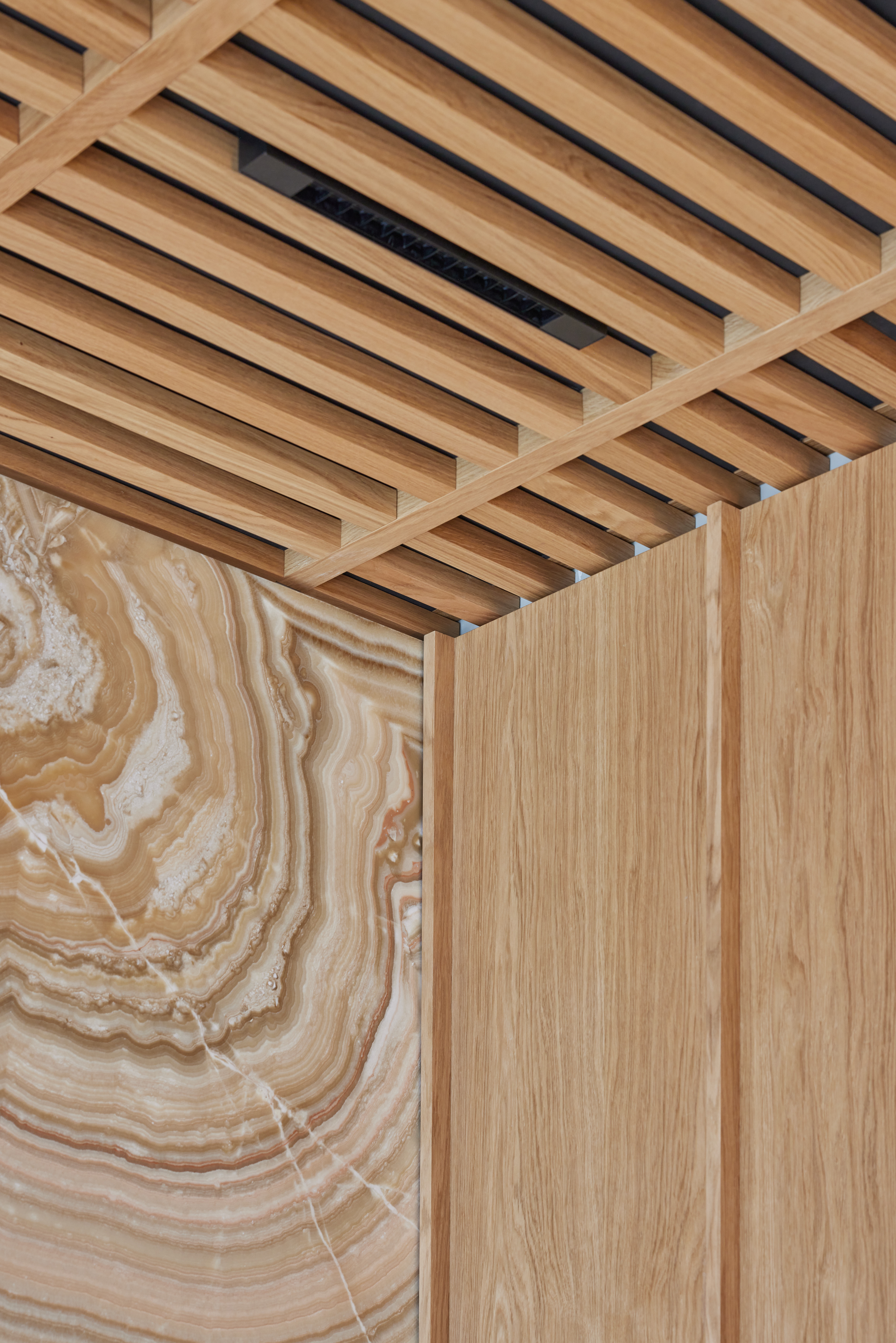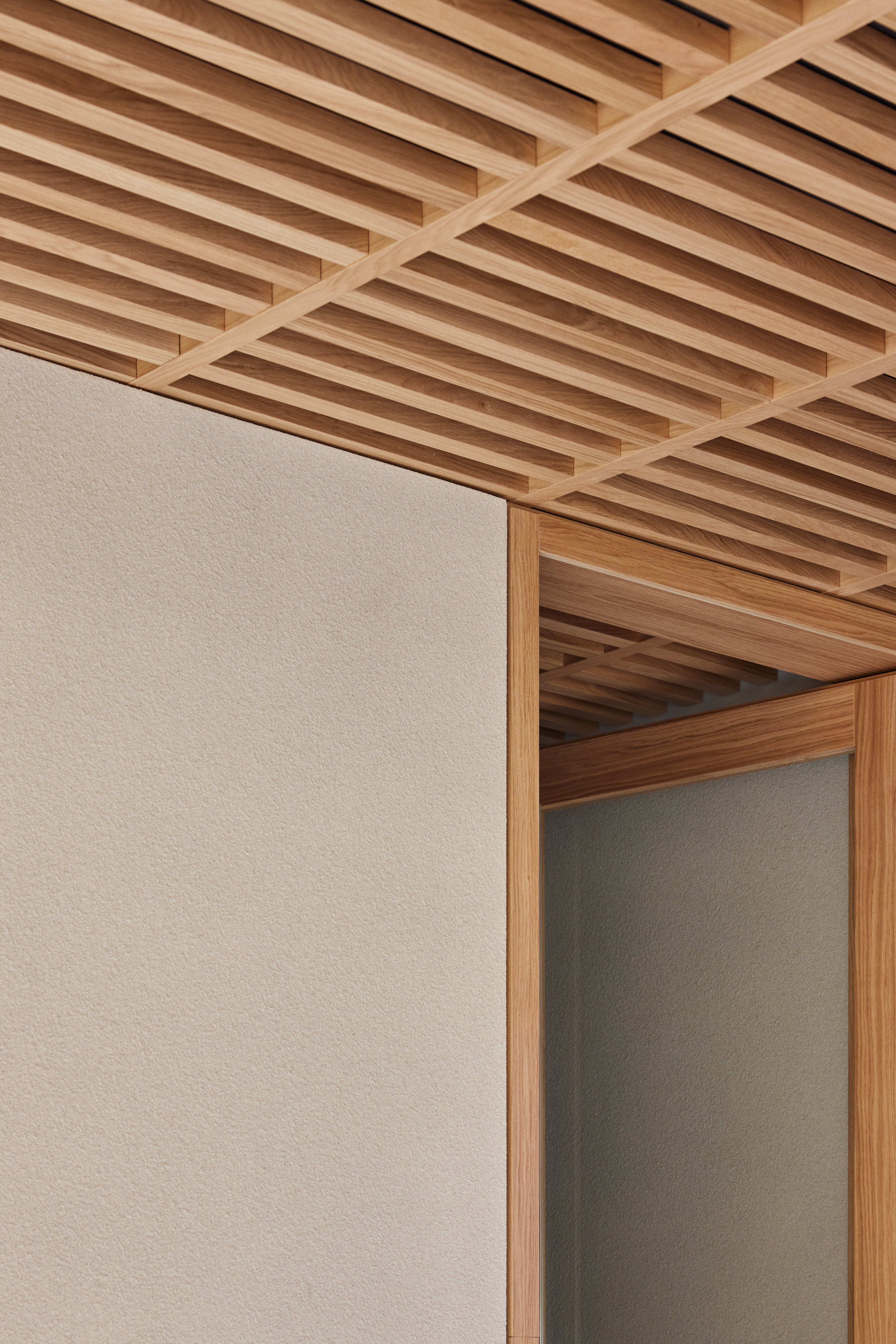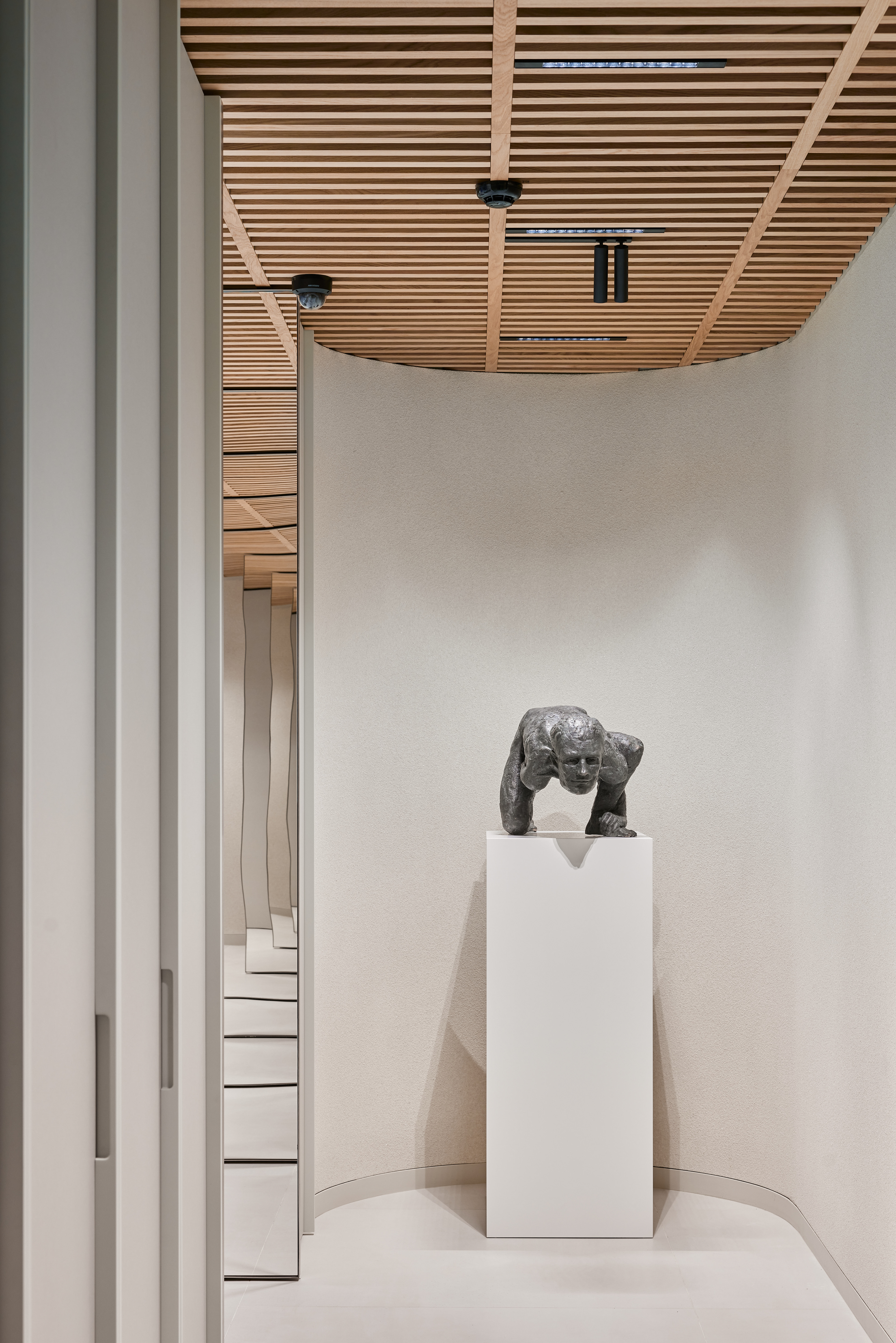 This office interior is designed for a small management team. It has three main spaces - offices for individual work and meetings, an open working space for the rest of the staff and a place to relax. The straight, sharp lines of the interior are distinguished by curved elements that divide the spaces and give them a sculptural-like image. All the elements are united by a ceiling of finely split oak beams. Wood and stone, natural materials with similar shades, dominate the office. Neutral grey walls and flooring emphasizes them even more. Small spaces, warm colors and natural, non-conflicting materials give this office a cozy feeling.