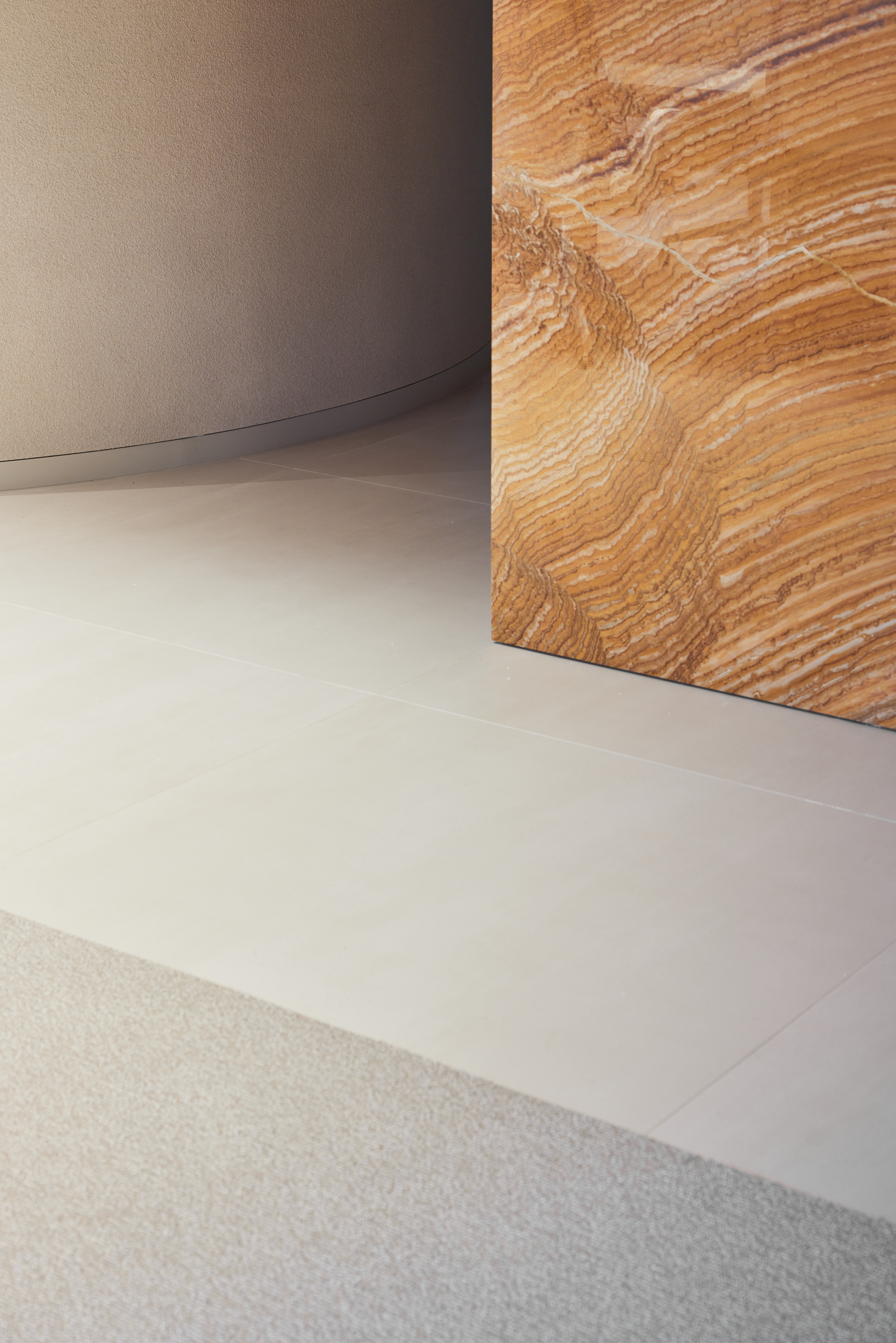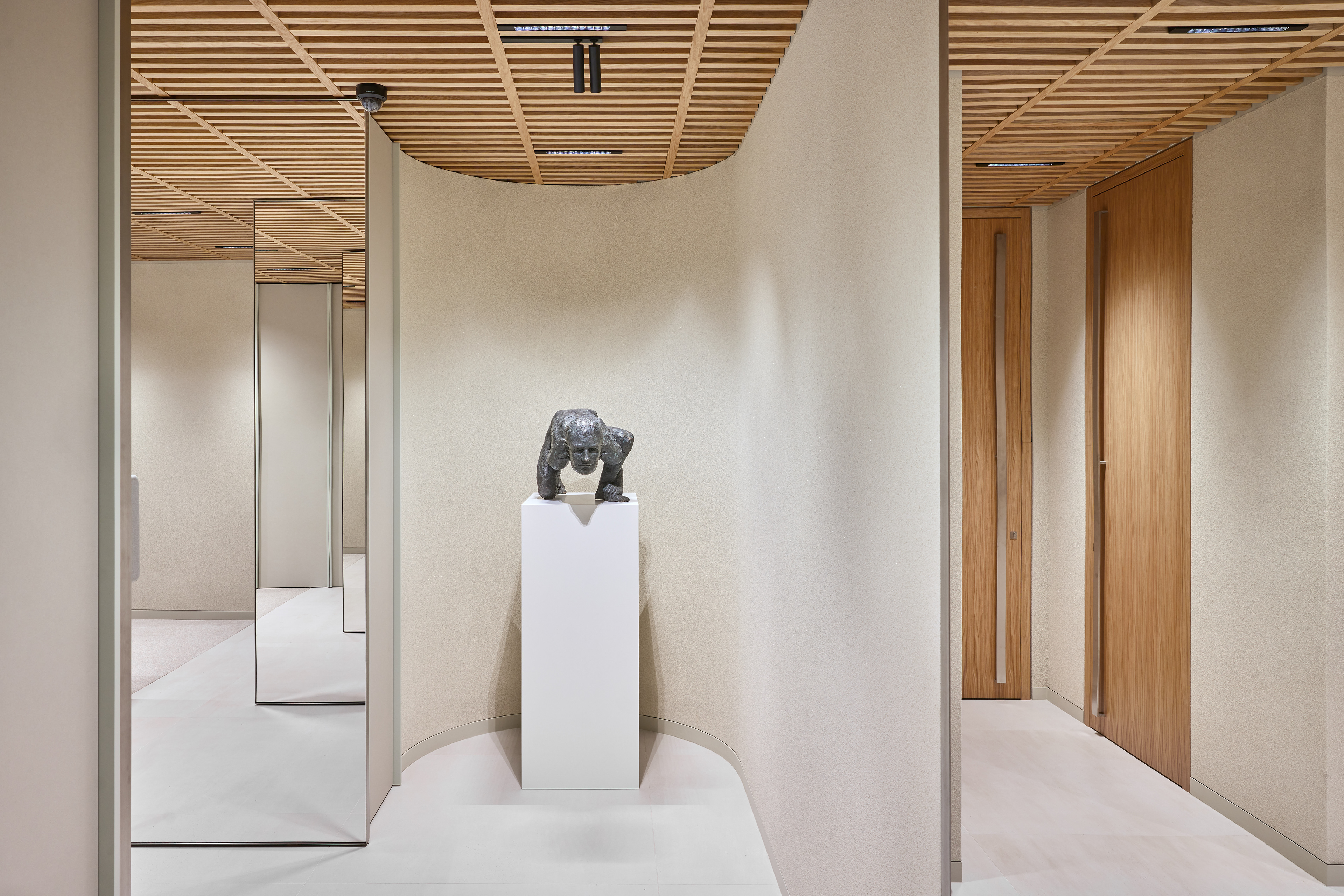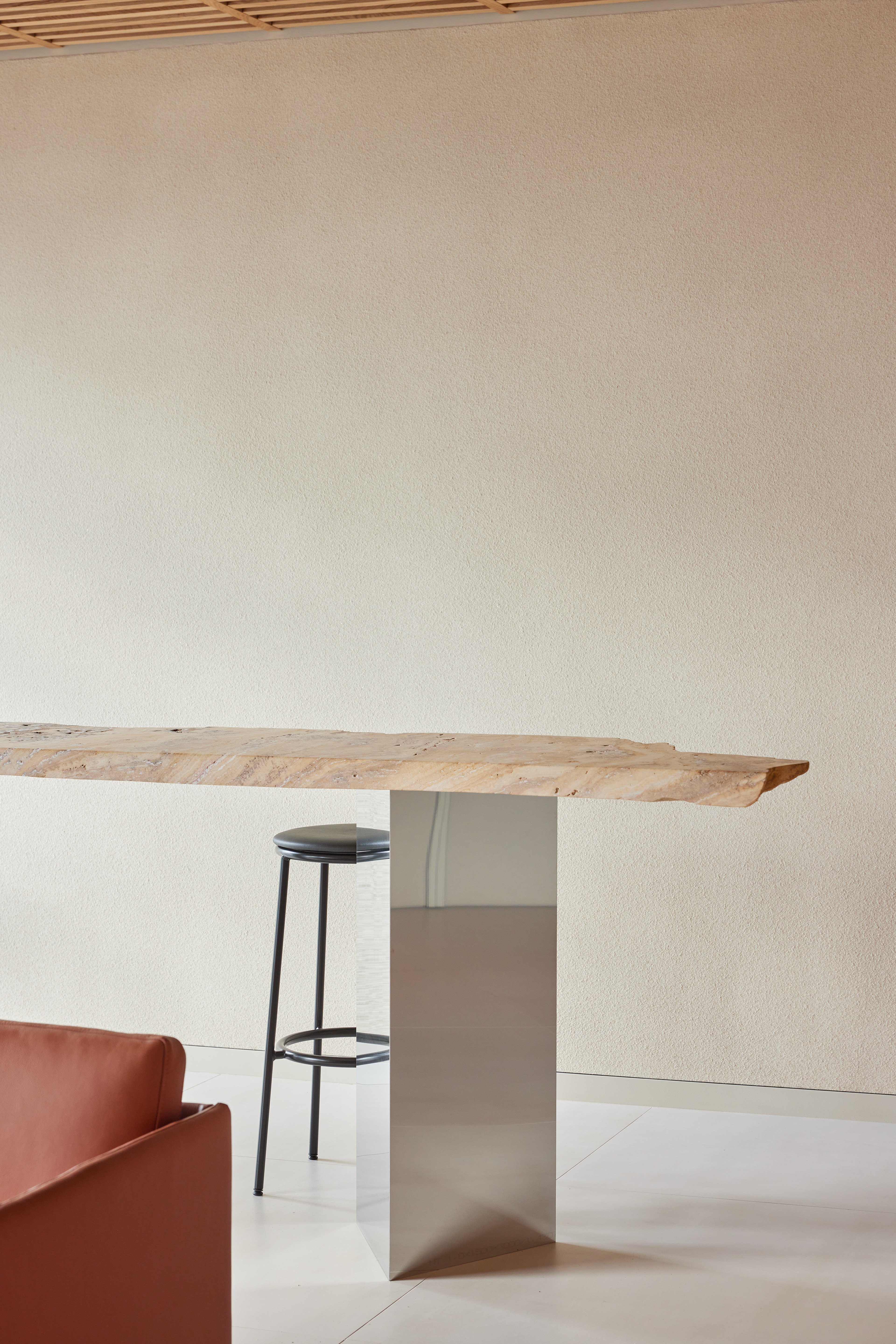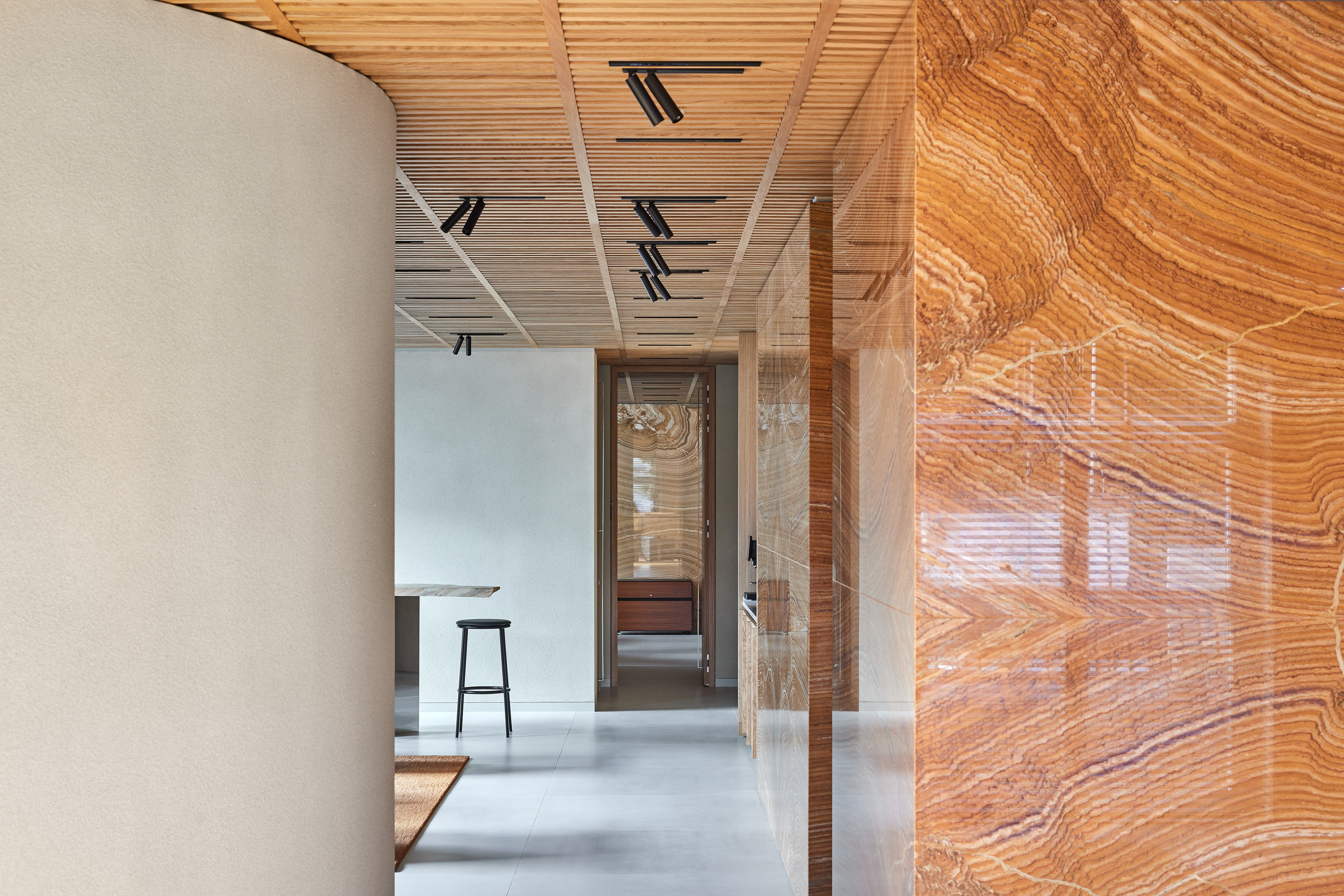This office interior is designed for a small management team. It has three main spaces - offices for individual work and meetings, an open working space for the rest of the staff and a place to relax. The straight, sharp lines of the interior are distinguished by curved elements that divide the spaces and give them a sculptural-like image. All the elements are united by a ceiling of finely split oak beams. Wood and stone, natural materials with similar shades, dominate the office. Neutral grey walls and flooring emphasizes them even more. Small spaces, warm colors and natural, non-conflicting materials give this office a cozy feeling.