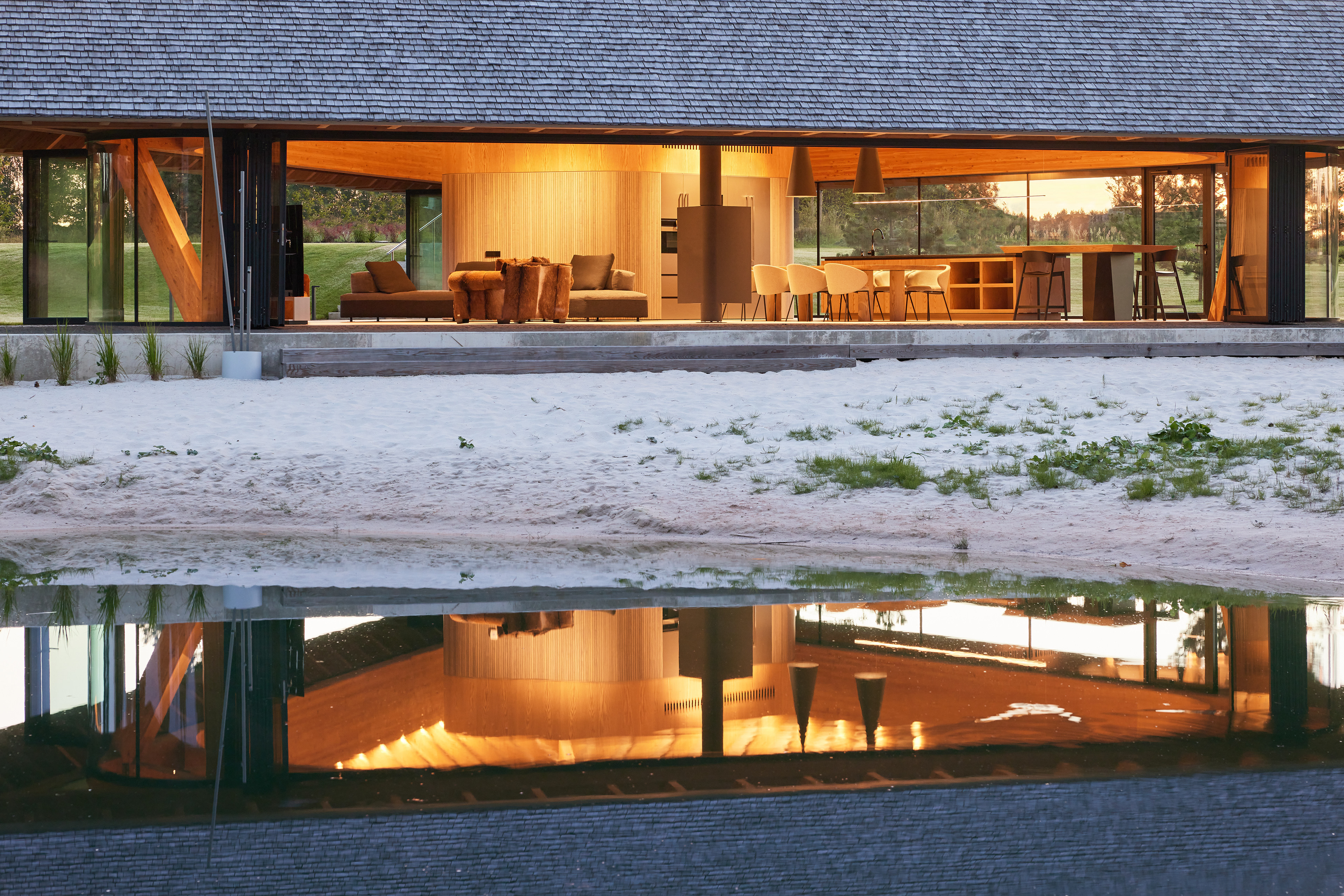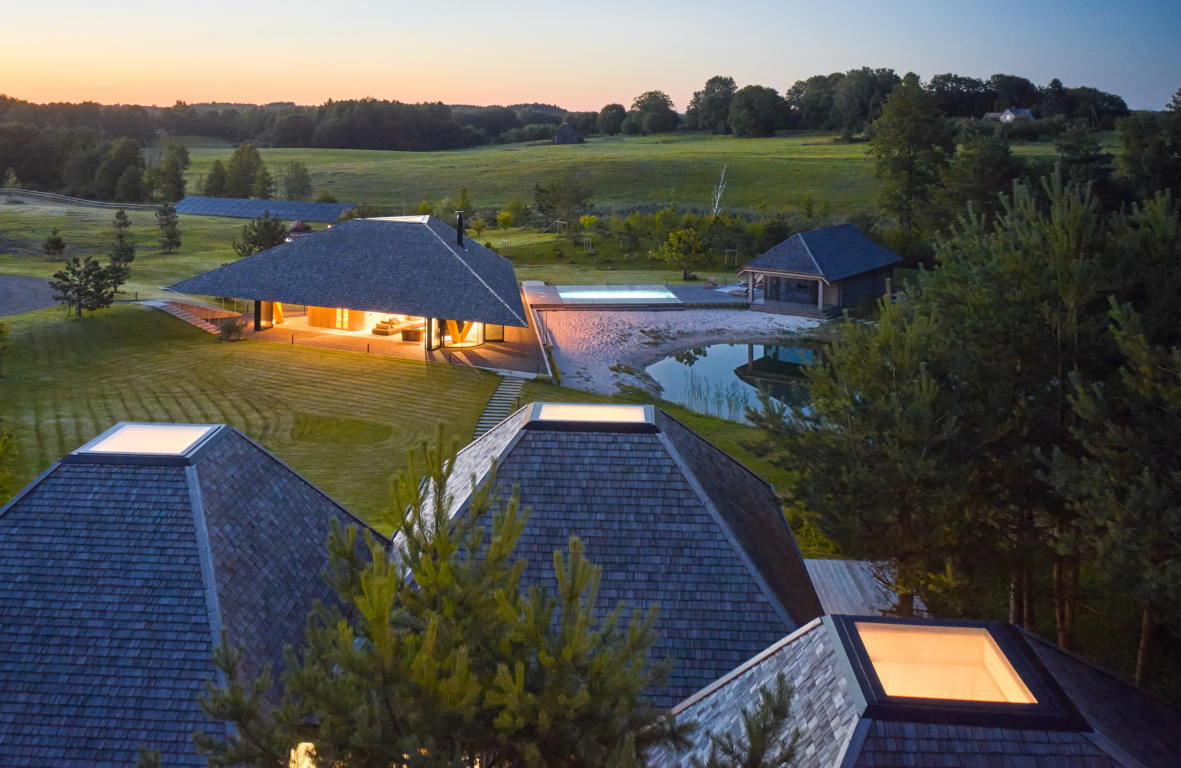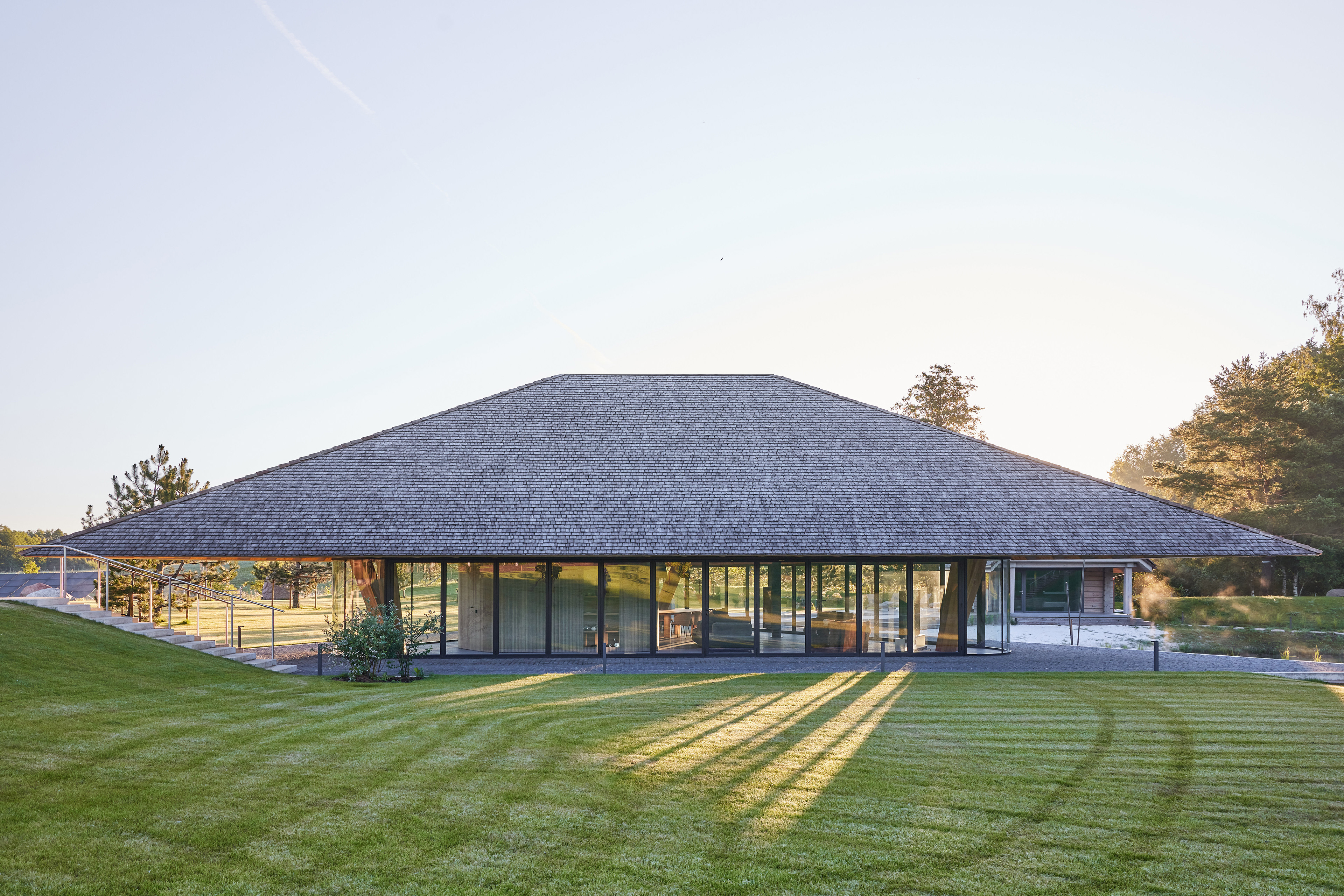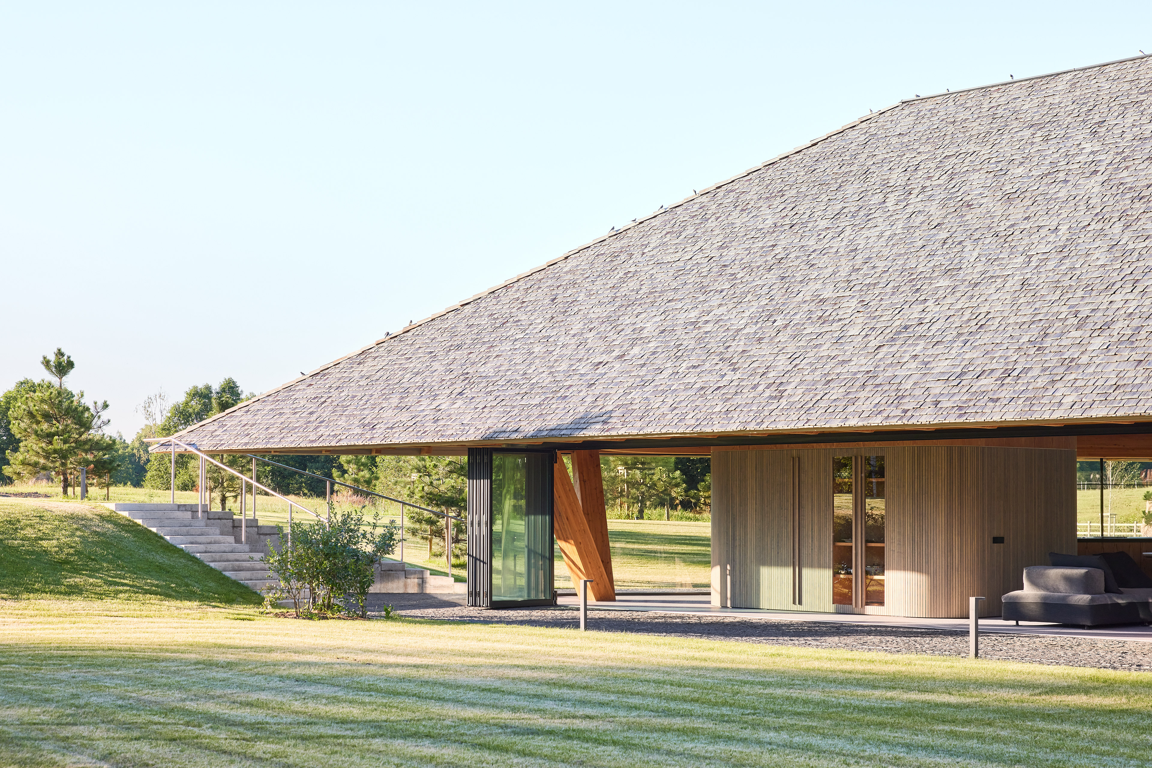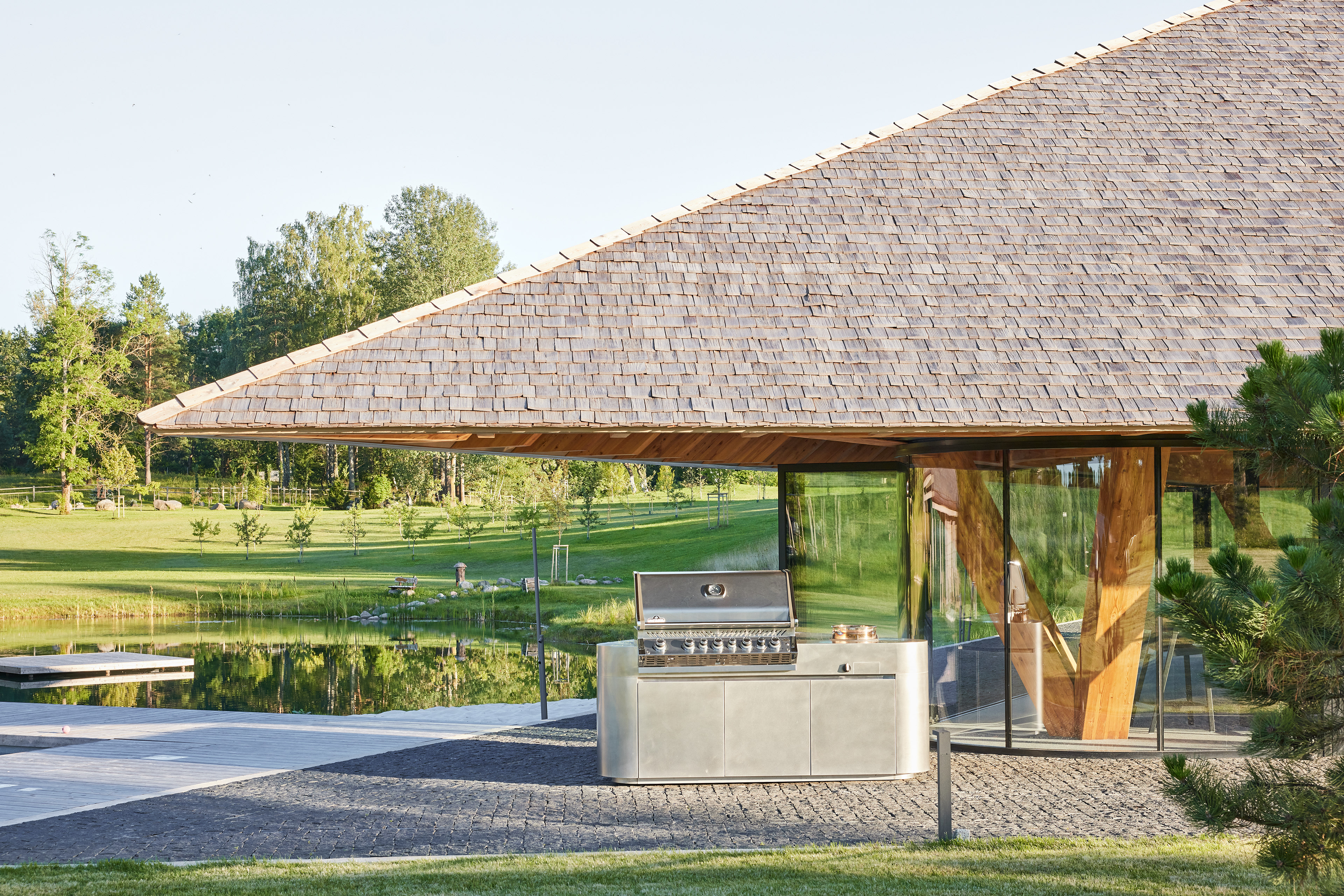 Poolhouse is a part of a larger complex of recreational buildings. The location of it was chosen slightly away from the rest of the complex, in the central part of a hilly valley near an existing basin. The location of the site partly dictates the architectural expression - the triangular building responds to all the natural views around it. The main element of this house - the heavy archetypal roof which contrasts with the shop windows. The transparency of the windows around the entire perimeter creates the impression of the roof hanging in the air. The structure supporting the roof is made up of three wooden columns, which are not only load-bearing, but also serve as interior details. From the inside of the poolhouse wooden roof comes into notice. With a skylight in the center it provides additional natural light. The movement inside happens around three elements - the fireplace, the kitchen island and the central volume of the utility rooms, leaving the perimeter of the building completely free. Large windows and a relaxing interior allow the building and its surroundings to be enjoyed throughout all seasons.