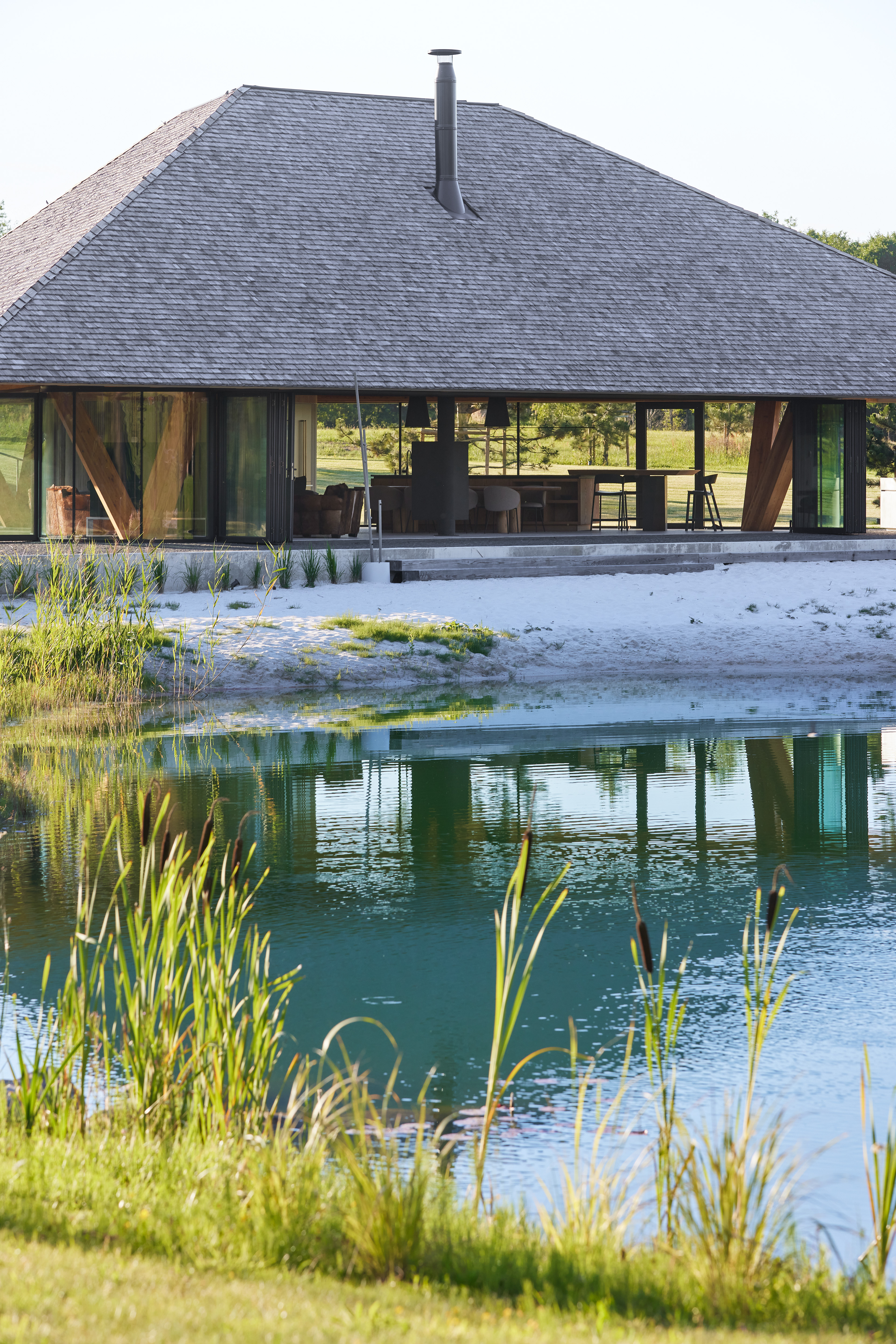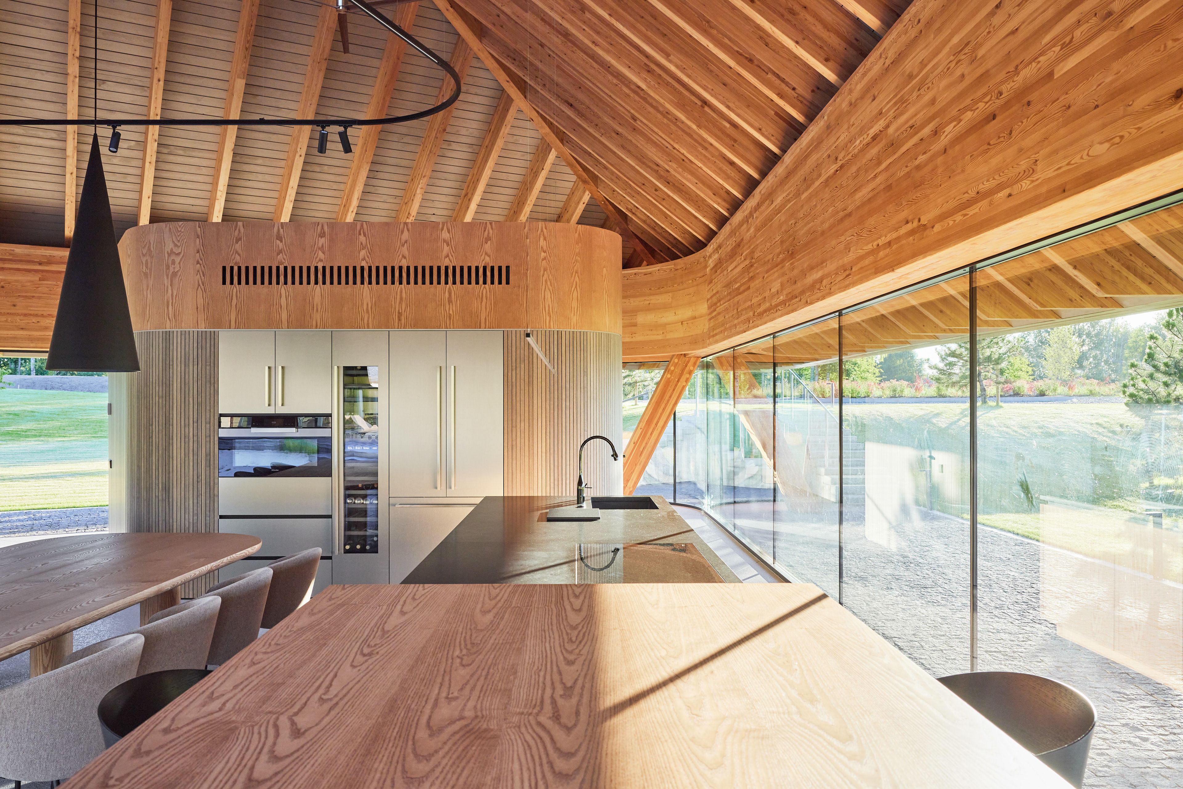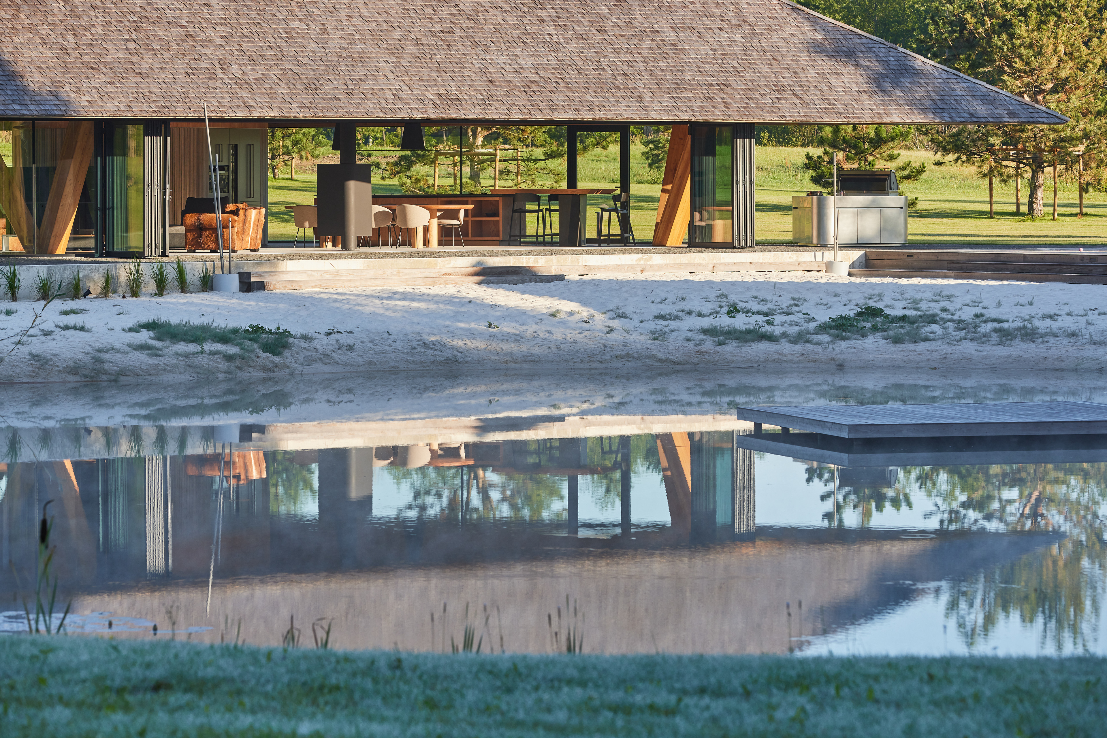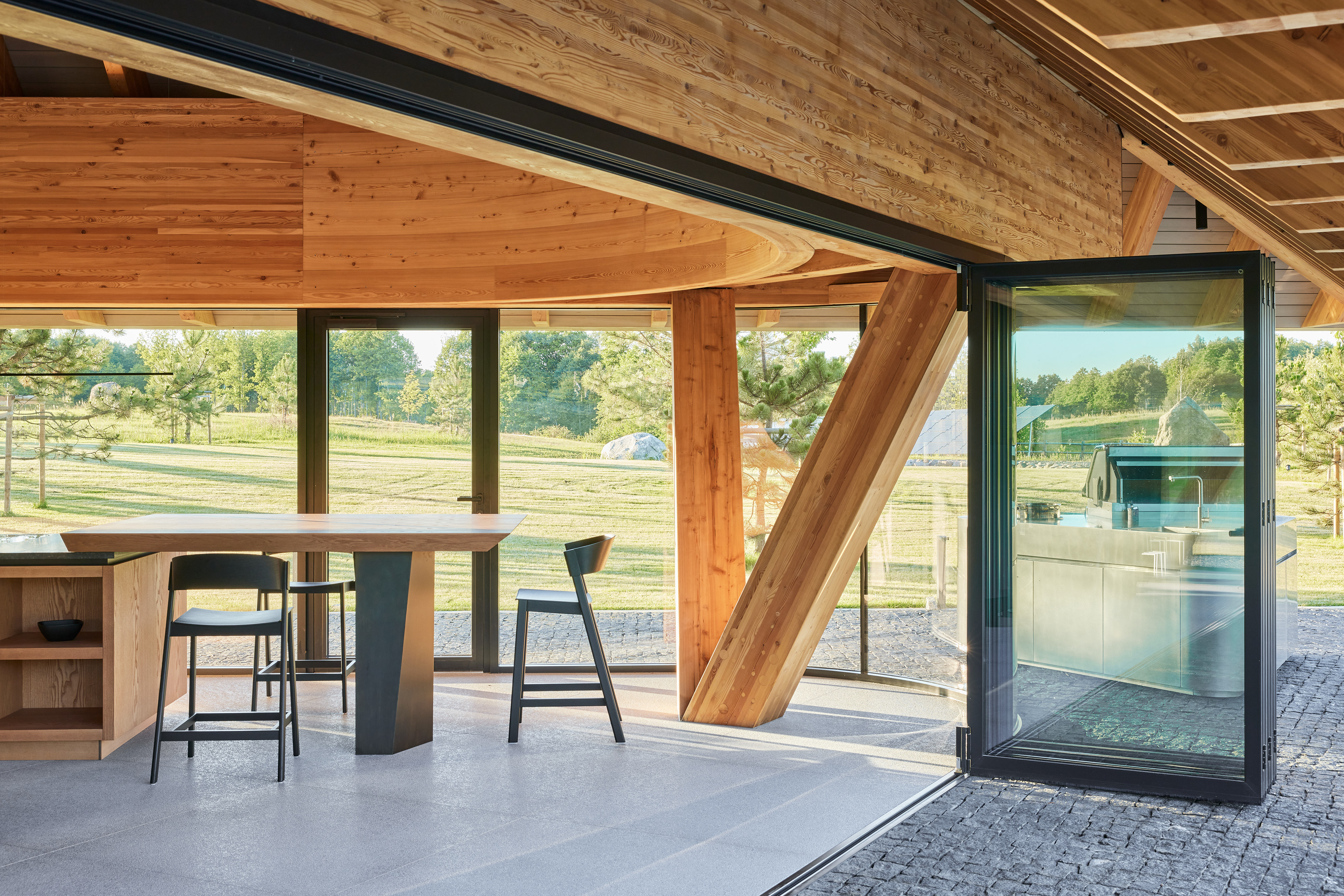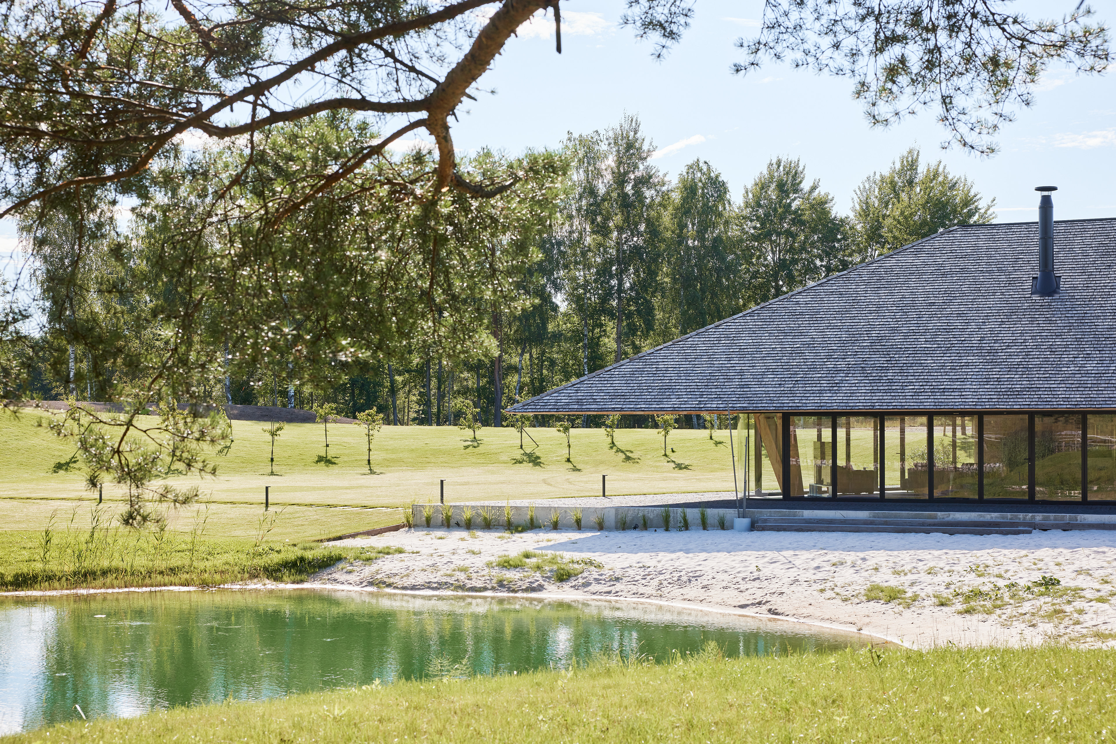 Poolhouse is a part of a larger complex of recreational buildings. The location of it was chosen slightly away from the rest of the complex, in the central part of a hilly valley near an existing basin. The location of the site partly dictates the architectural expression - the triangular building responds to all the natural views around it. The main element of this house - the heavy archetypal roof which contrasts with the shop windows. The transparency of the windows around the entire perimeter creates the impression of the roof hanging in the air. The structure supporting the roof is made up of three wooden columns, which are not only load-bearing, but also serve as interior details. From the inside of the poolhouse wooden roof comes into notice. With a skylight in the center it provides additional natural light. The movement inside happens around three elements - the fireplace, the kitchen island and the central volume of the utility rooms, leaving the perimeter of the building completely free. Large windows and a relaxing interior allow the building and its surroundings to be enjoyed throughout all seasons.