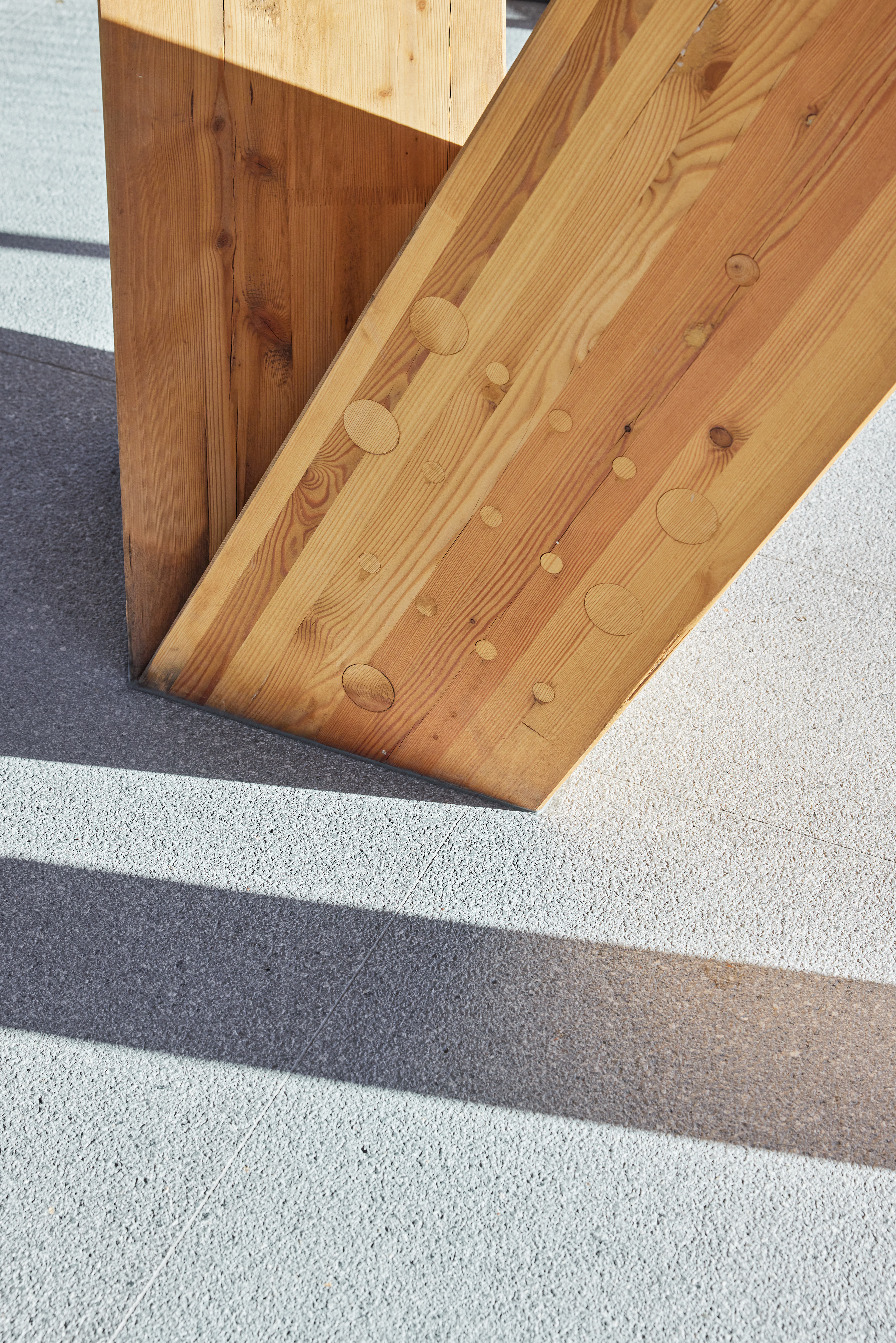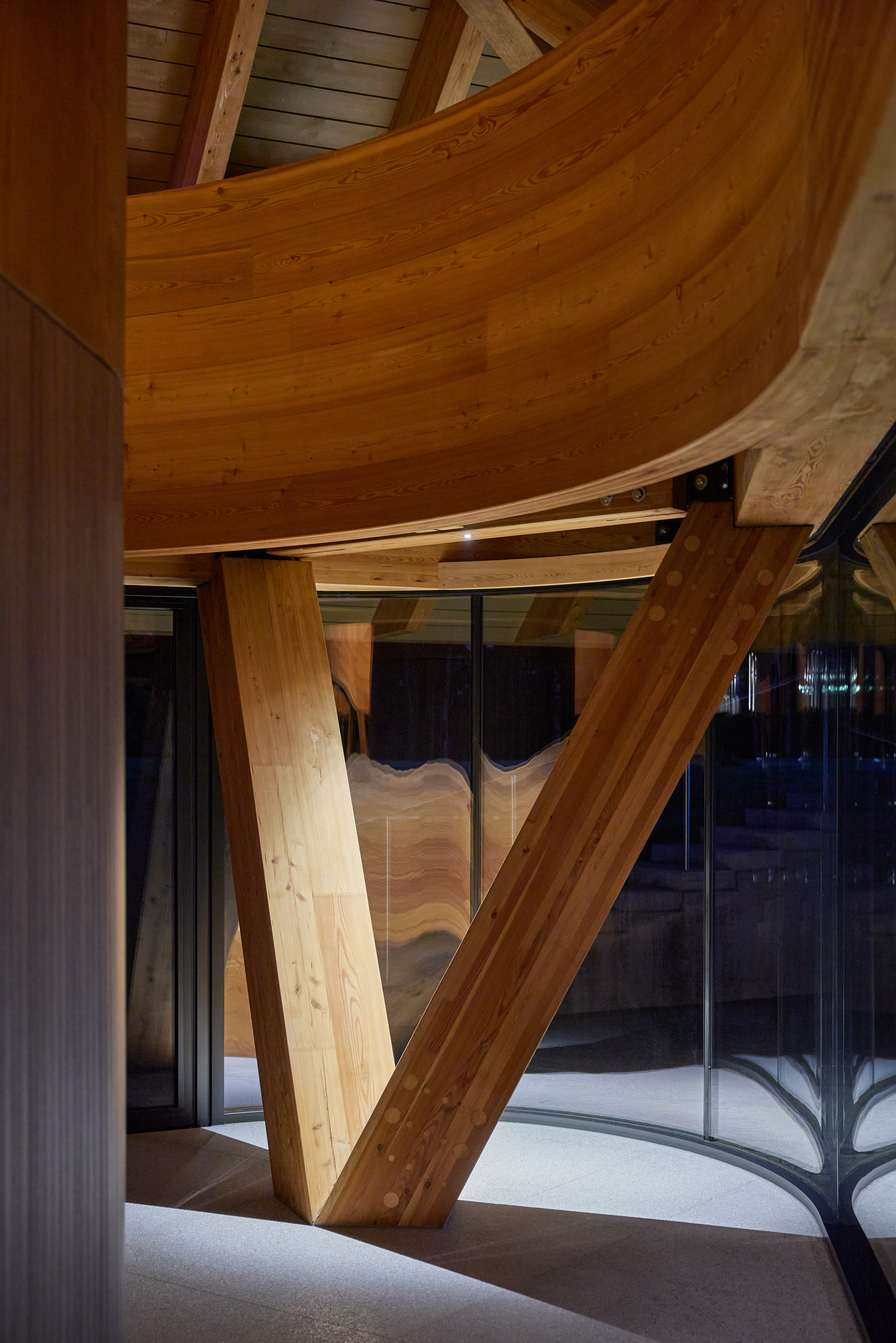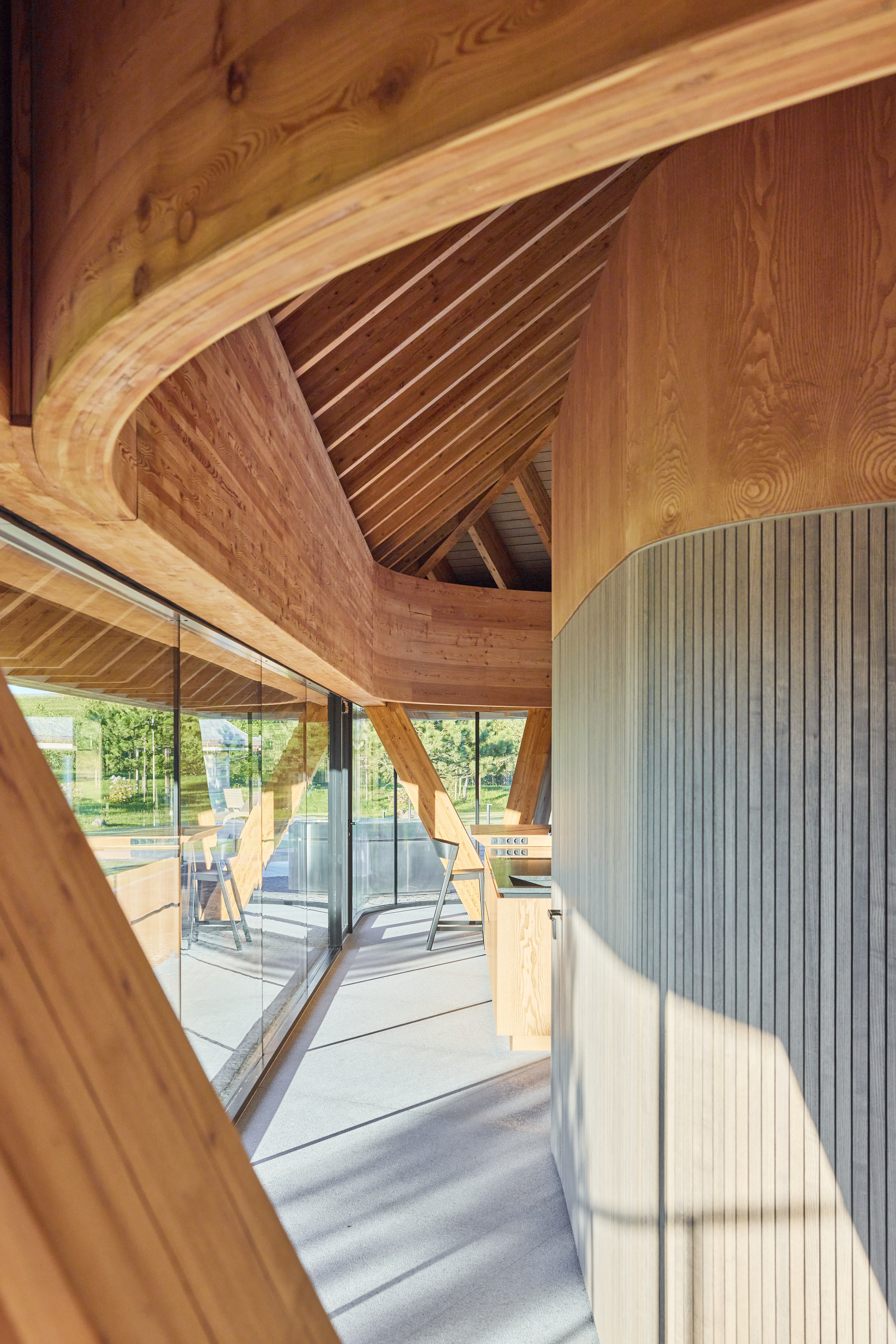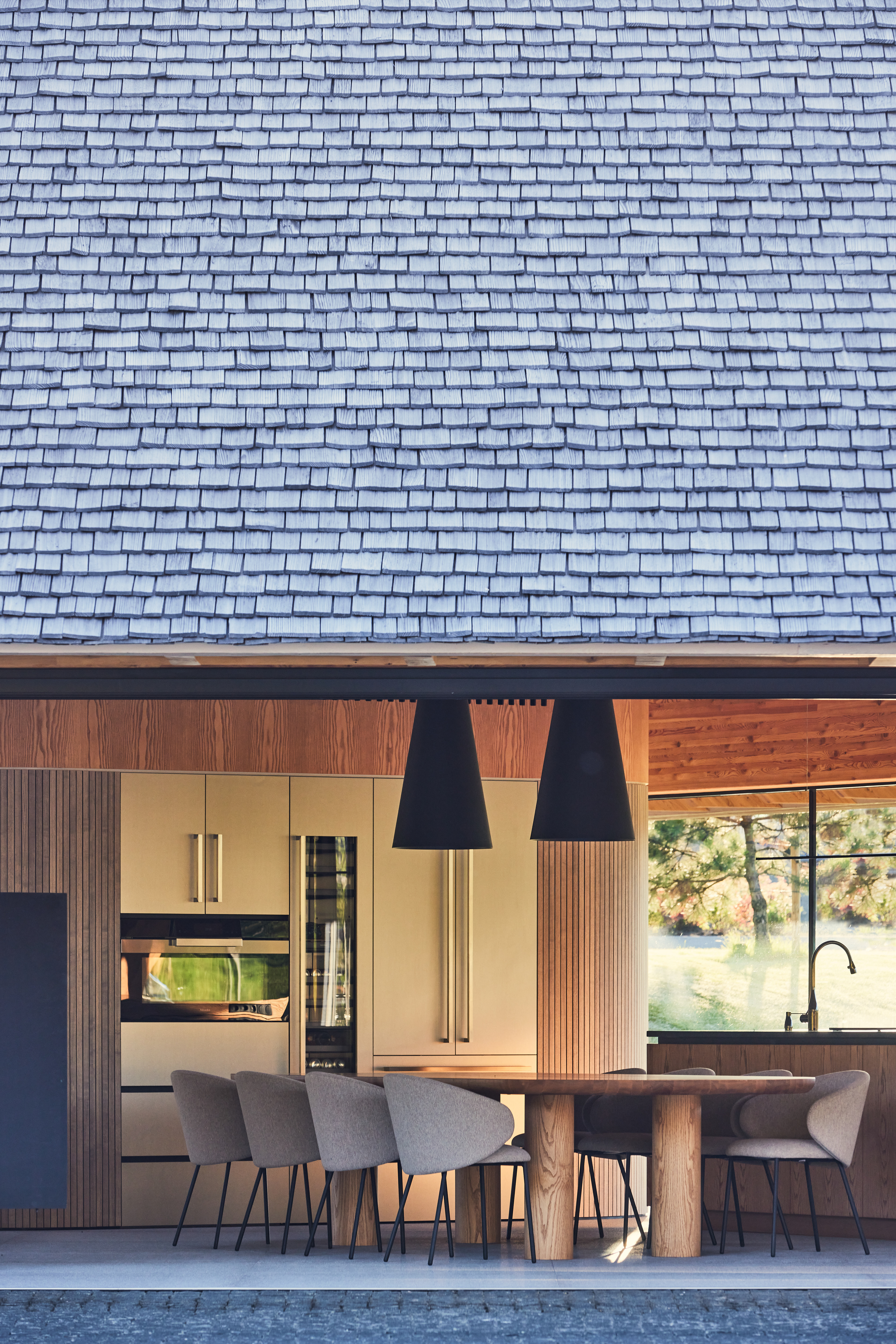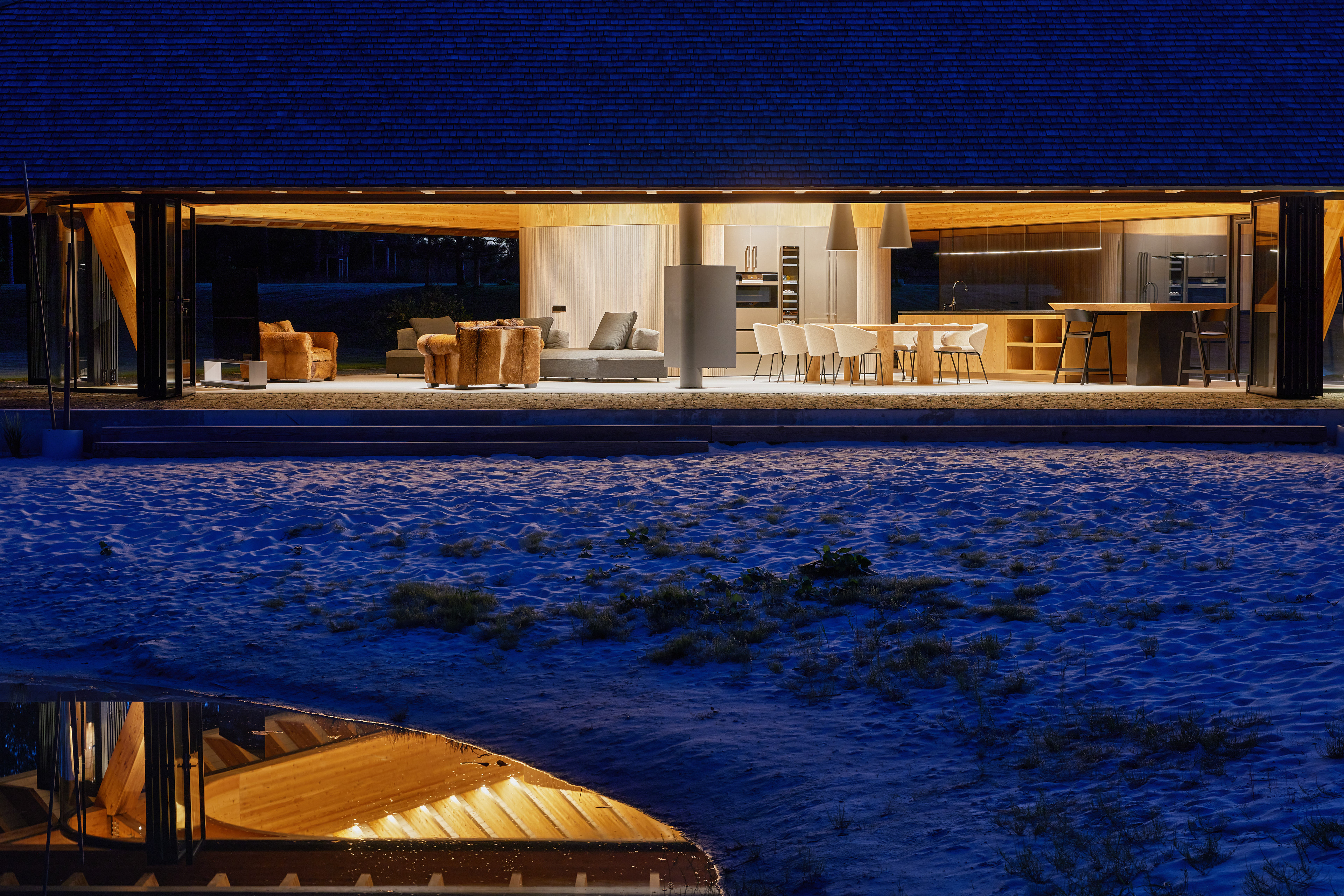 Poolhouse is a part of a larger complex of recreational buildings. The location of it was chosen slightly away from the rest of the complex, in the central part of a hilly valley near an existing basin. The location of the site partly dictates the architectural expression - the triangular building responds to all the natural views around it. The main element of this house - the heavy archetypal roof which contrasts with the shop windows. The transparency of the windows around the entire perimeter creates the impression of the roof hanging in the air. The structure supporting the roof is made up of three wooden columns, which are not only load-bearing, but also serve as interior details. From the inside of the poolhouse wooden roof comes into notice. With a skylight in the center it provides additional natural light. The movement inside happens around three elements - the fireplace, the kitchen island and the central volume of the utility rooms, leaving the perimeter of the building completely free. Large windows and a relaxing interior allow the building and its surroundings to be enjoyed throughout all seasons.