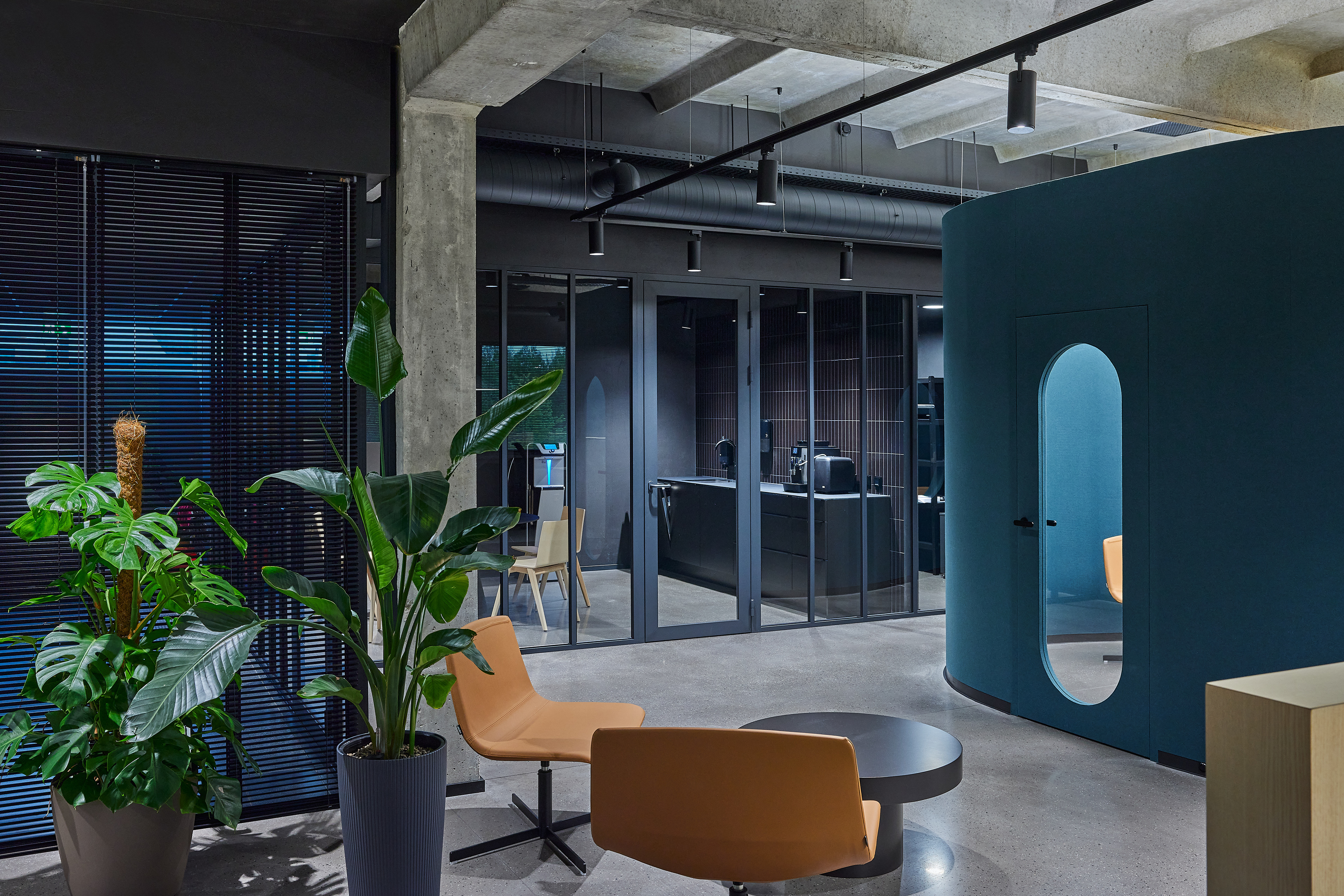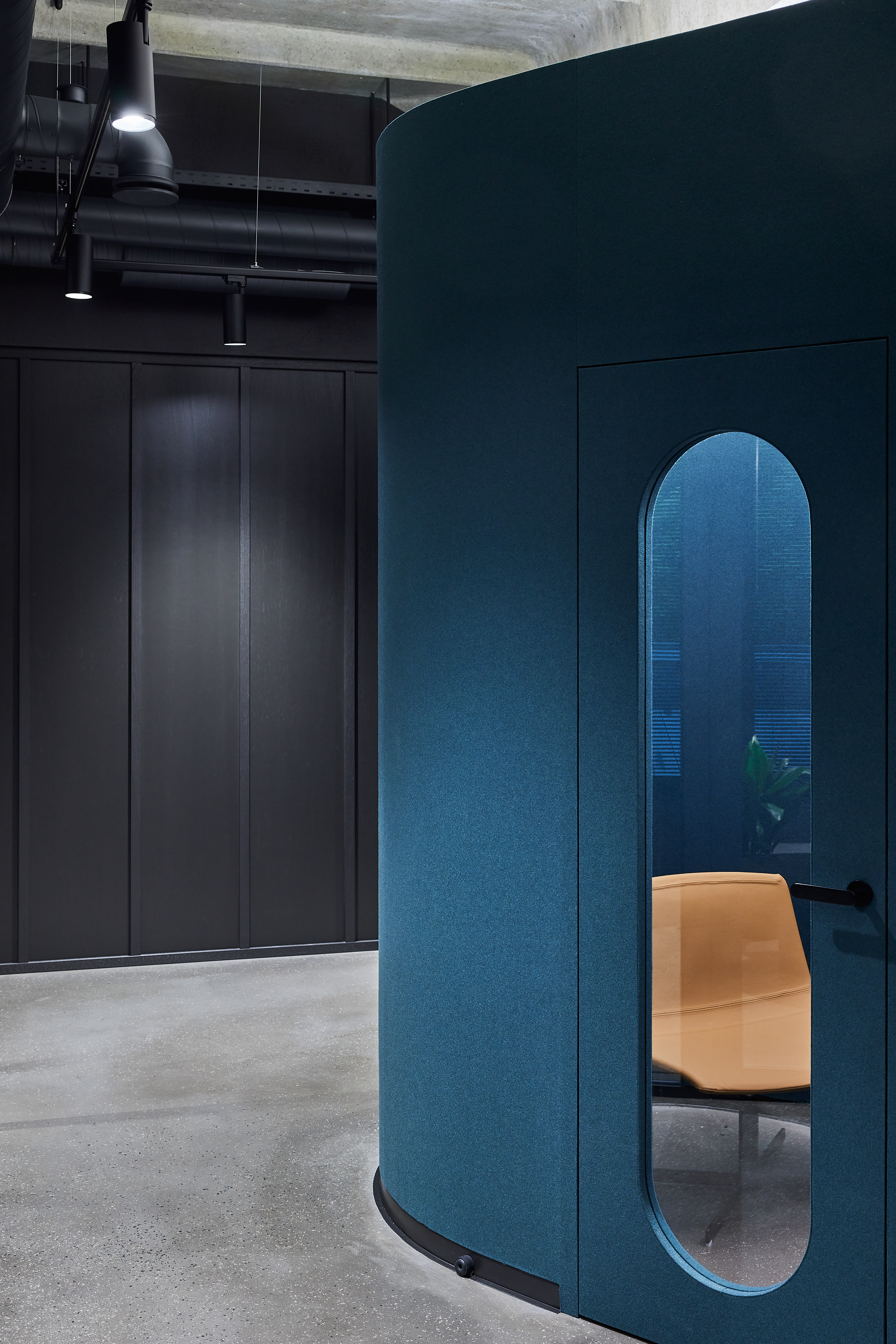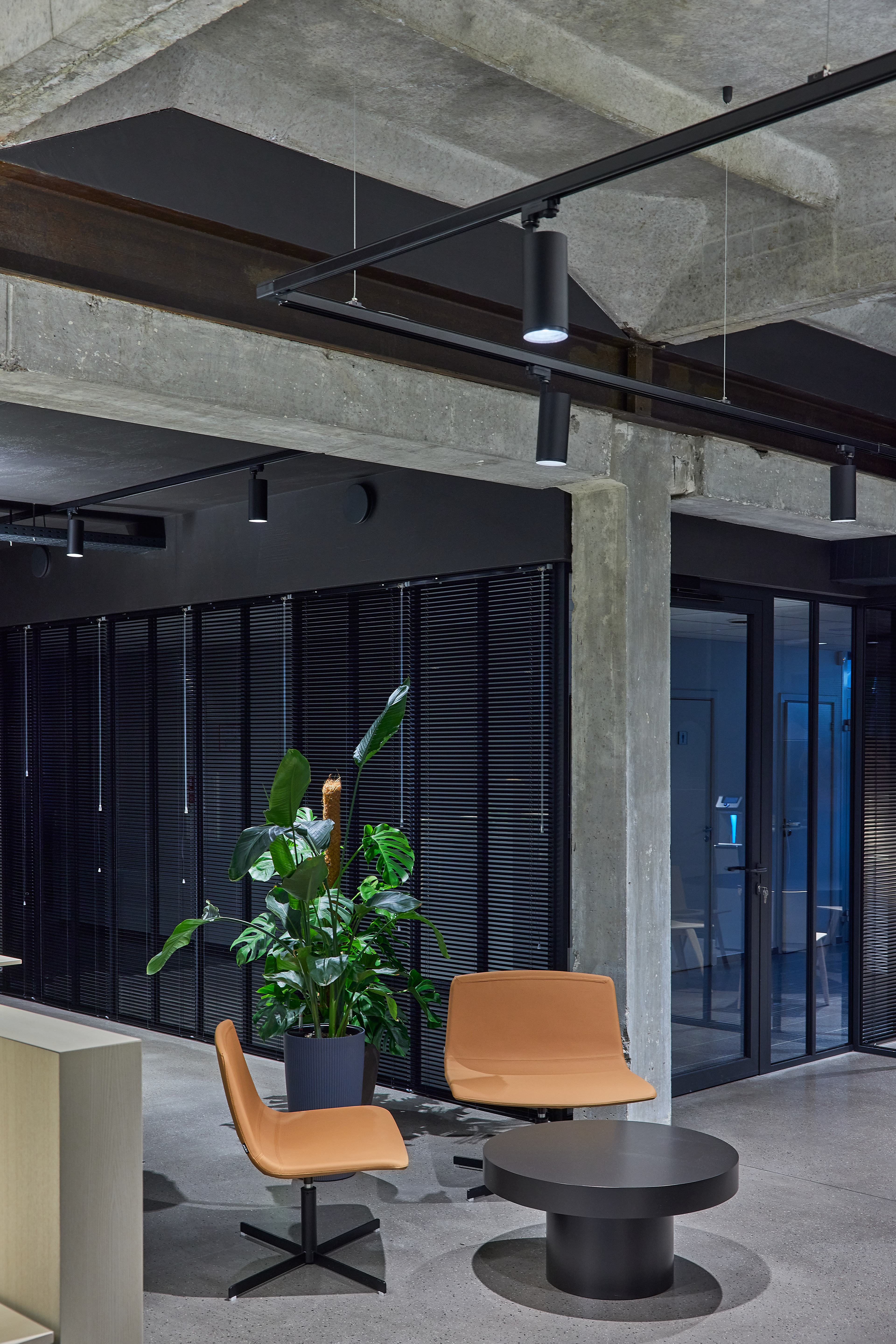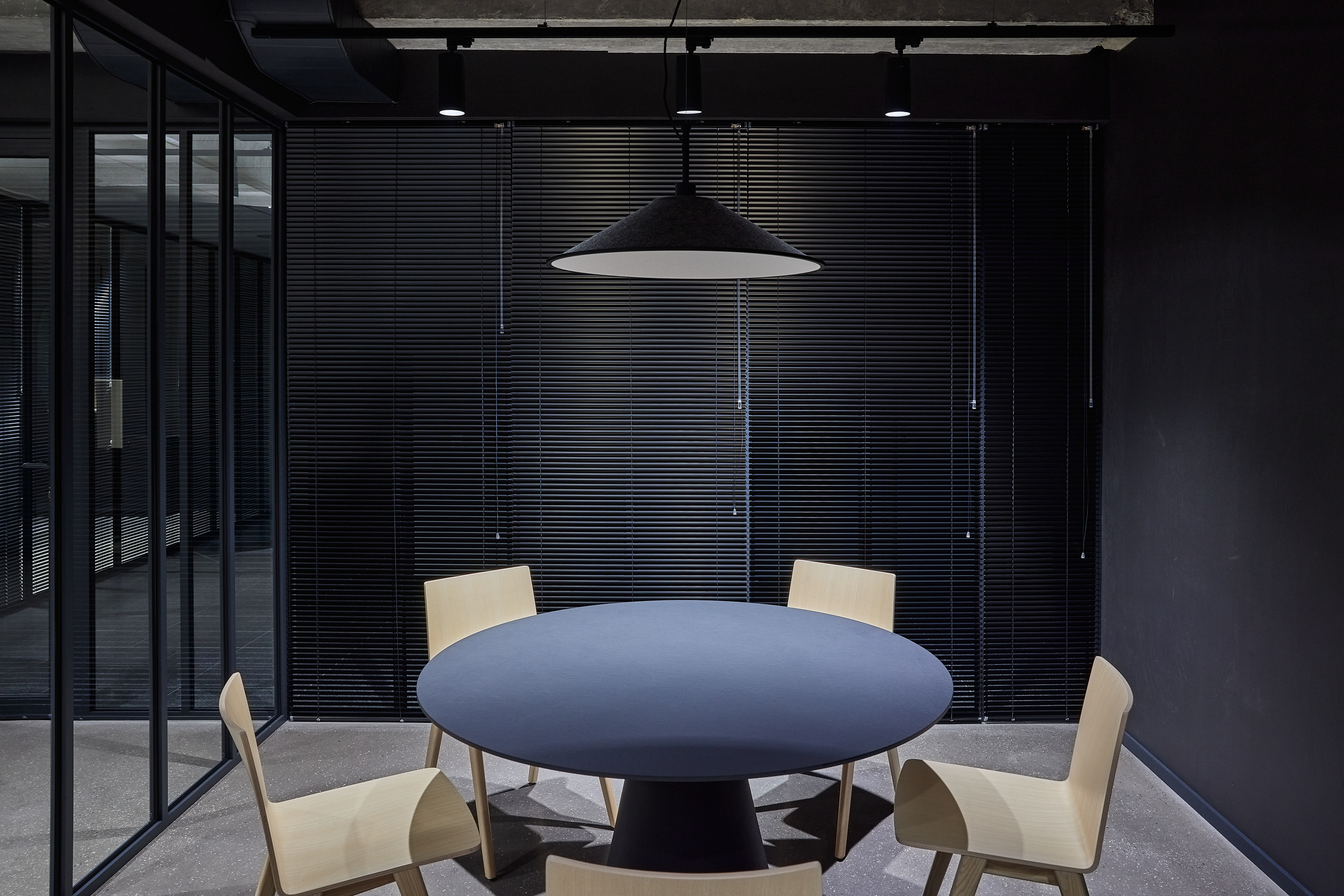 This compact office was designed in the SKUBA headquarters building, in an industrial part of Vilnius. The existing plan determined that the working spaces would be placed along the perimeter – near the windows, creating a meeting space in the center. Here was placed a blob-shaped volume – the core of the office. It accommodates meeting rooms and works as the main accent and space shaping element. The sleek lines of it complement and soften the rigid concrete construction and glass partition grid. Moving around this central volume is organic – there are no sharp turns, no long corridors. The felt finishing of its walls also soften the character of the office and works as an acoustic element. The meeting rooms inside it seem to be right out of a science fiction movie – no right angles, evenly illuminated ceiling, round windows. Darker color palette for interior required some brighter accents to avoid everything blending into one mass. Lighting plays an important role in every interior, but especially in a dark one. Track lighting with spotlights was chosen for the general lighting. Workplace lights have a narrower angle than usual – the light only hits the worktop. The workplace lights and the top of the central volume emit upward light highlighting the concrete ceiling structure. The light is dimmed in the work space, concentrated only in the functional areas. Meanwhile, the meeting rooms are very well lit by the illuminated ceiling.