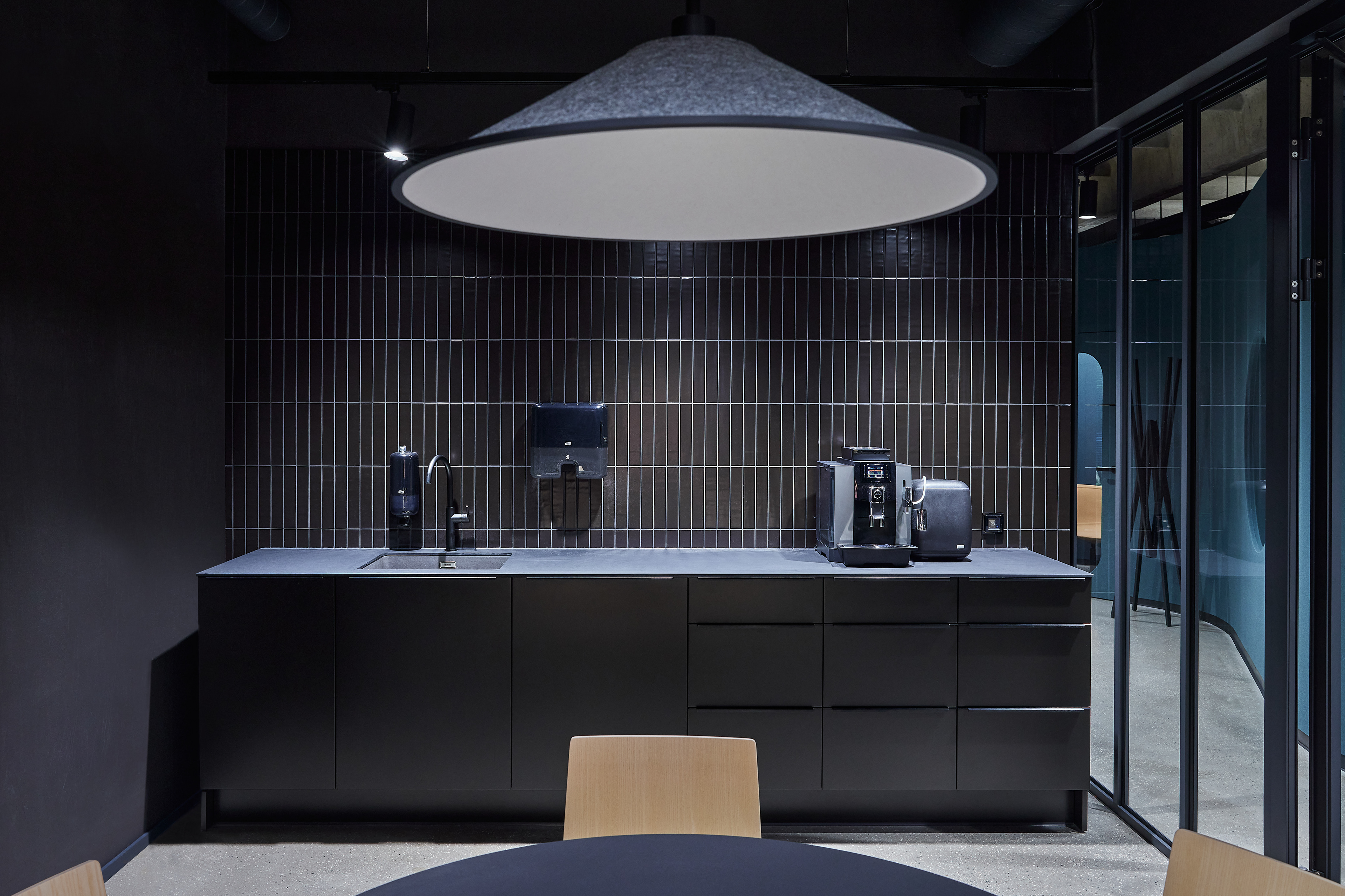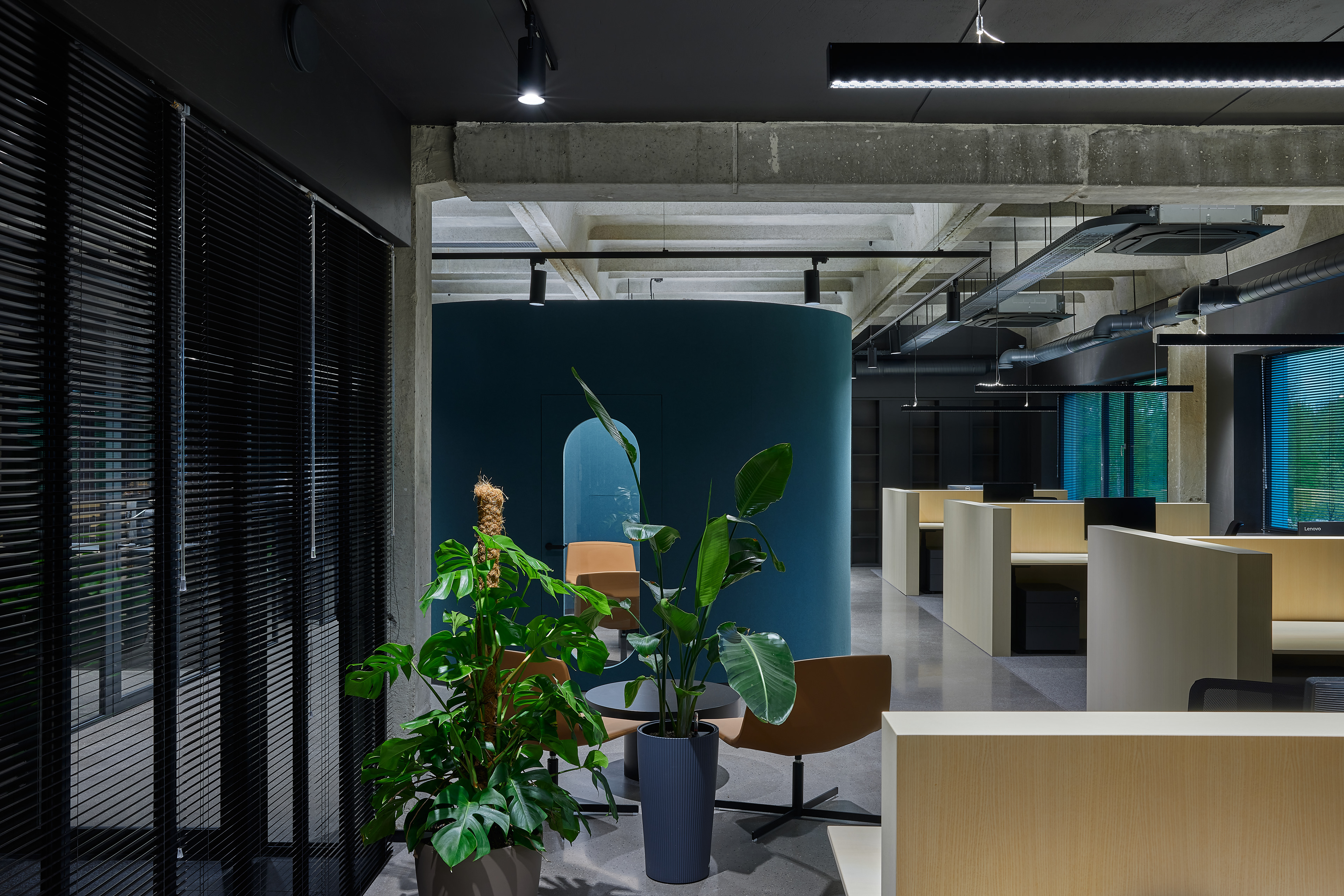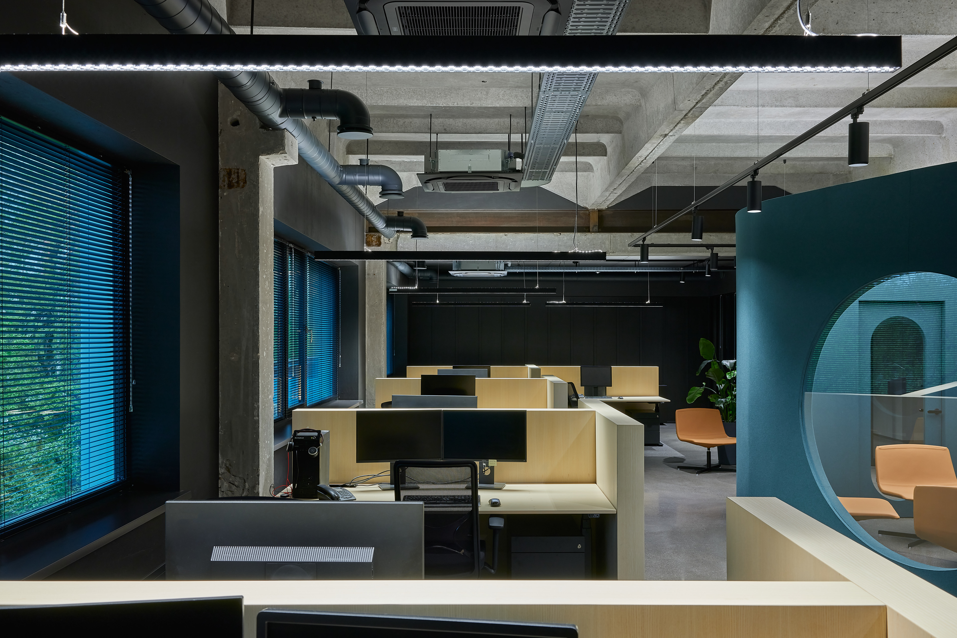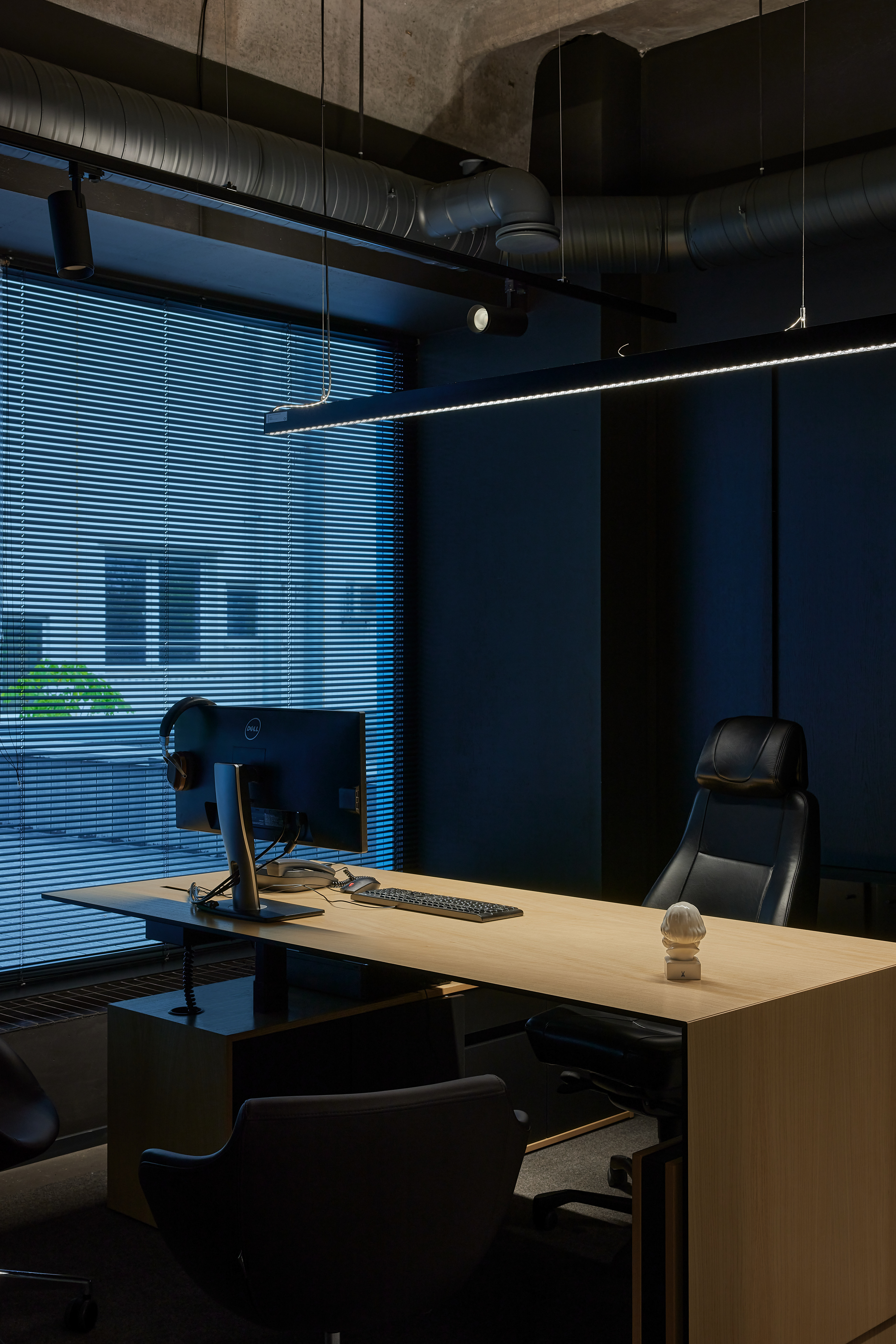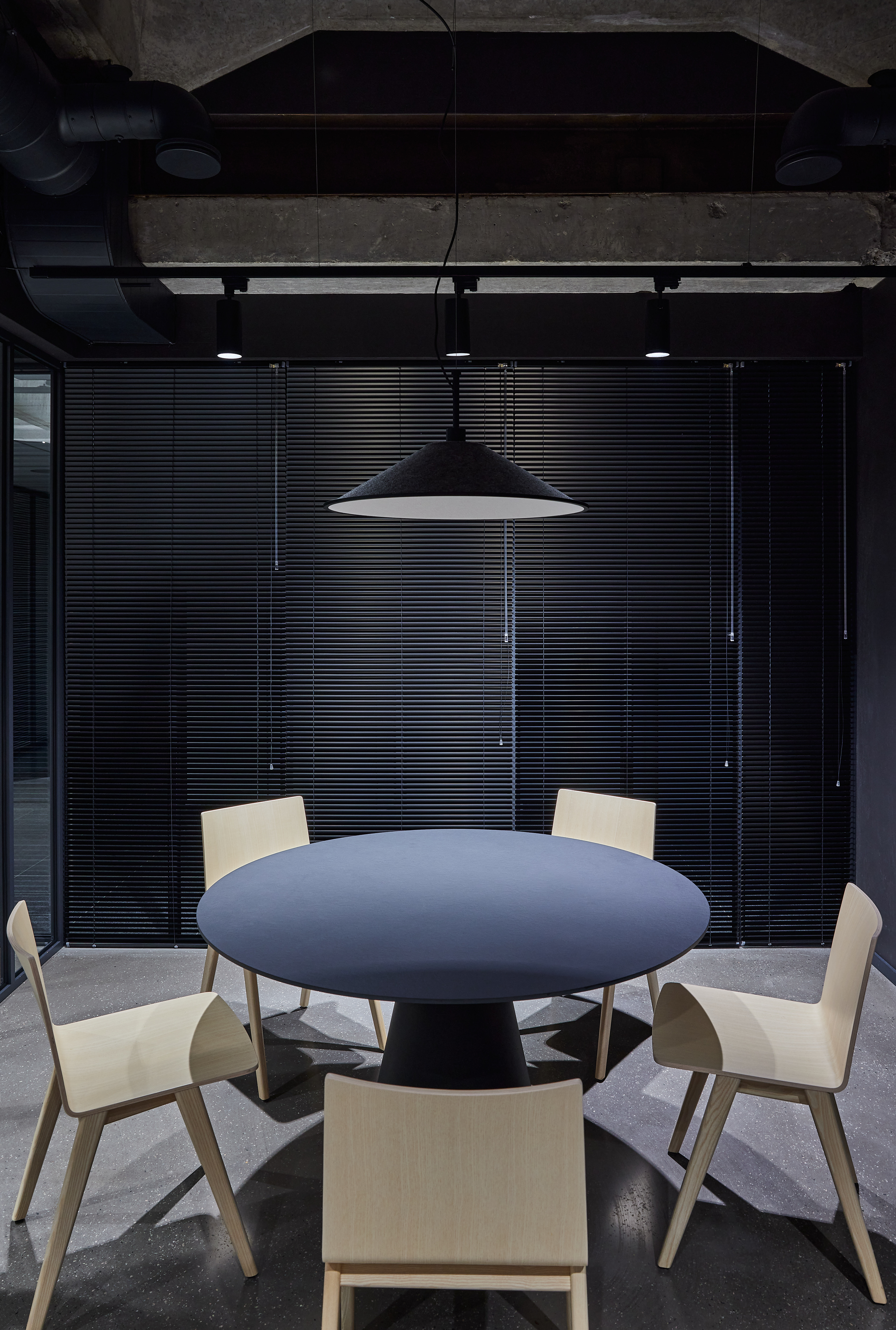 This compact office was designed in the SKUBA headquarters building, in an industrial part of Vilnius. The existing plan determined that the working spaces would be placed along the perimeter – near the windows, creating a meeting space in the center. Here was placed a blob-shaped volume – the core of the office. It accommodates meeting rooms and works as the main accent and space shaping element. The sleek lines of it complement and soften the rigid concrete construction and glass partition grid. Moving around this central volume is organic – there are no sharp turns, no long corridors. The felt finishing of its walls also soften the character of the office and works as an acoustic element. The meeting rooms inside it seem to be right out of a science fiction movie – no right angles, evenly illuminated ceiling, round windows. Darker color palette for interior required some brighter accents to avoid everything blending into one mass. Lighting plays an important role in every interior, but especially in a dark one. Track lighting with spotlights was chosen for the general lighting. Workplace lights have a narrower angle than usual – the light only hits the worktop. The workplace lights and the top of the central volume emit upward light highlighting the concrete ceiling structure. The light is dimmed in the work space, concentrated only in the functional areas. Meanwhile, the meeting rooms are very well lit by the illuminated ceiling.