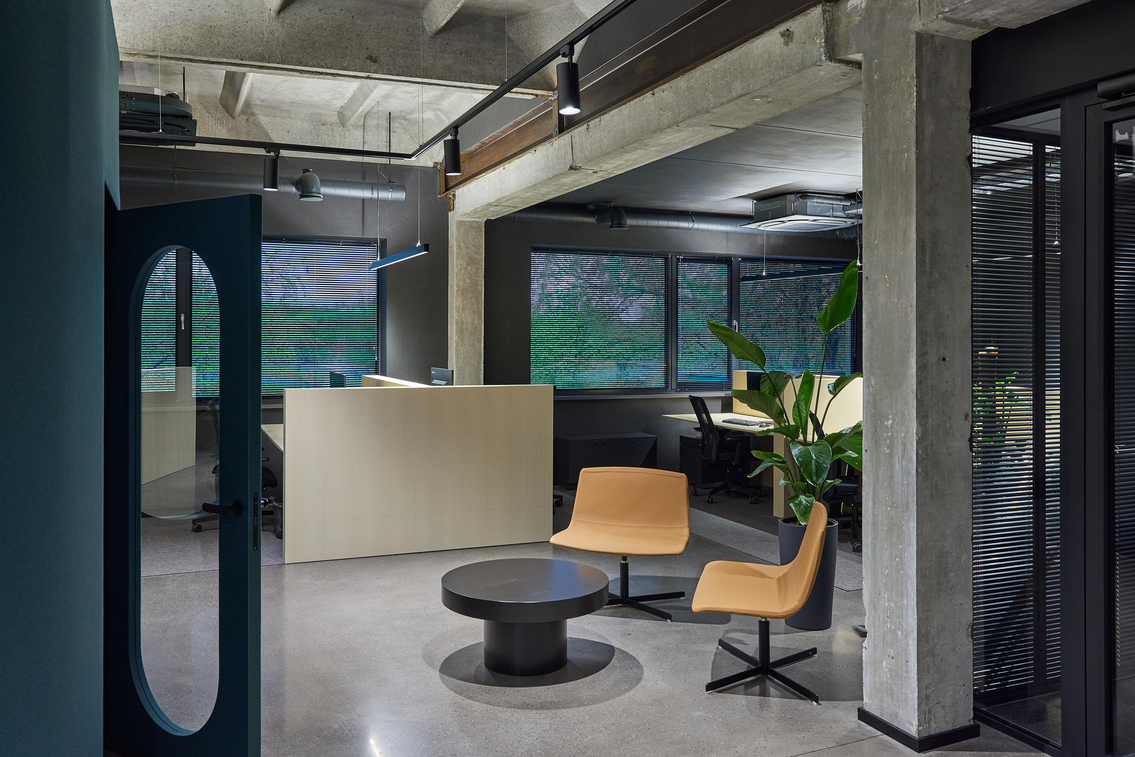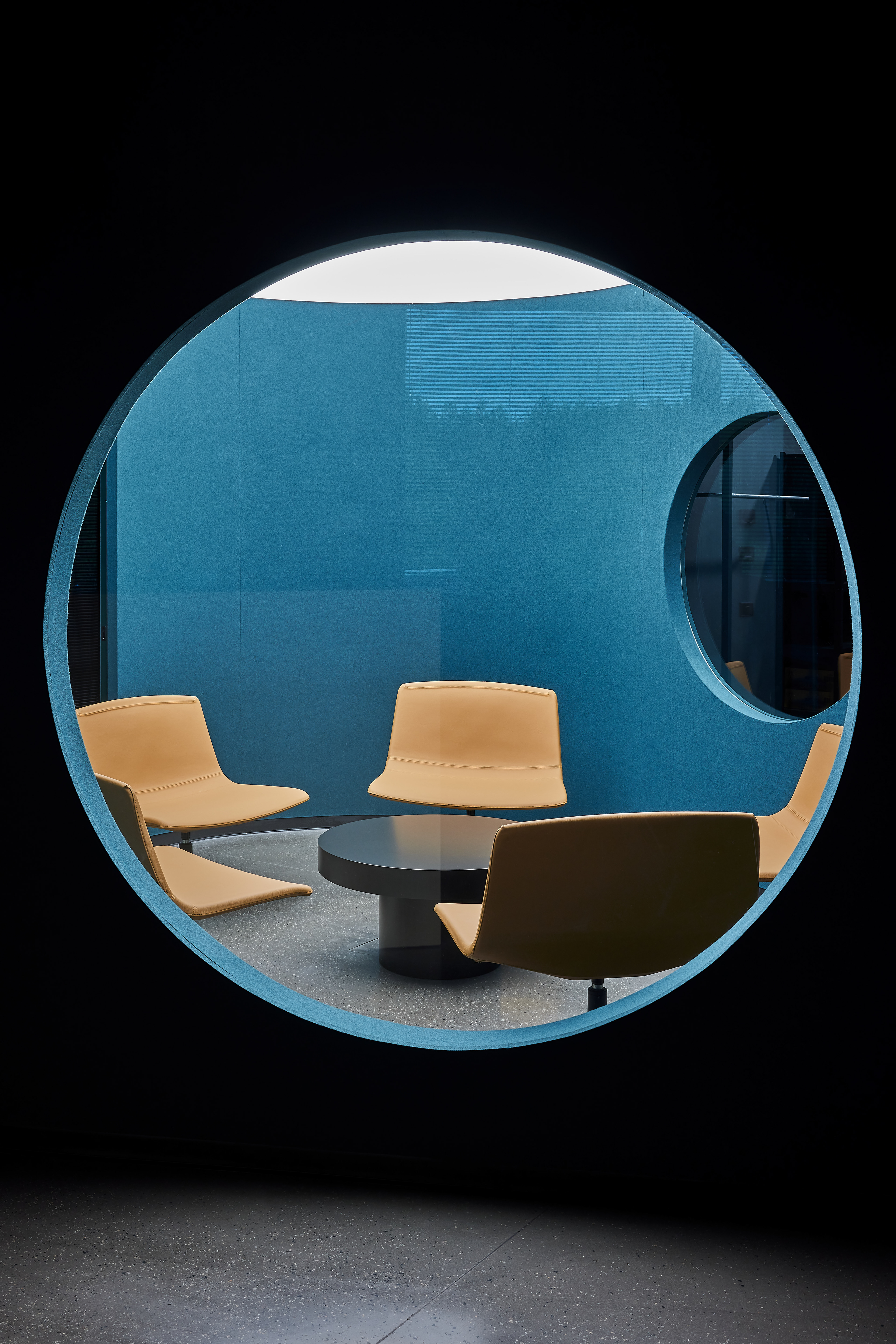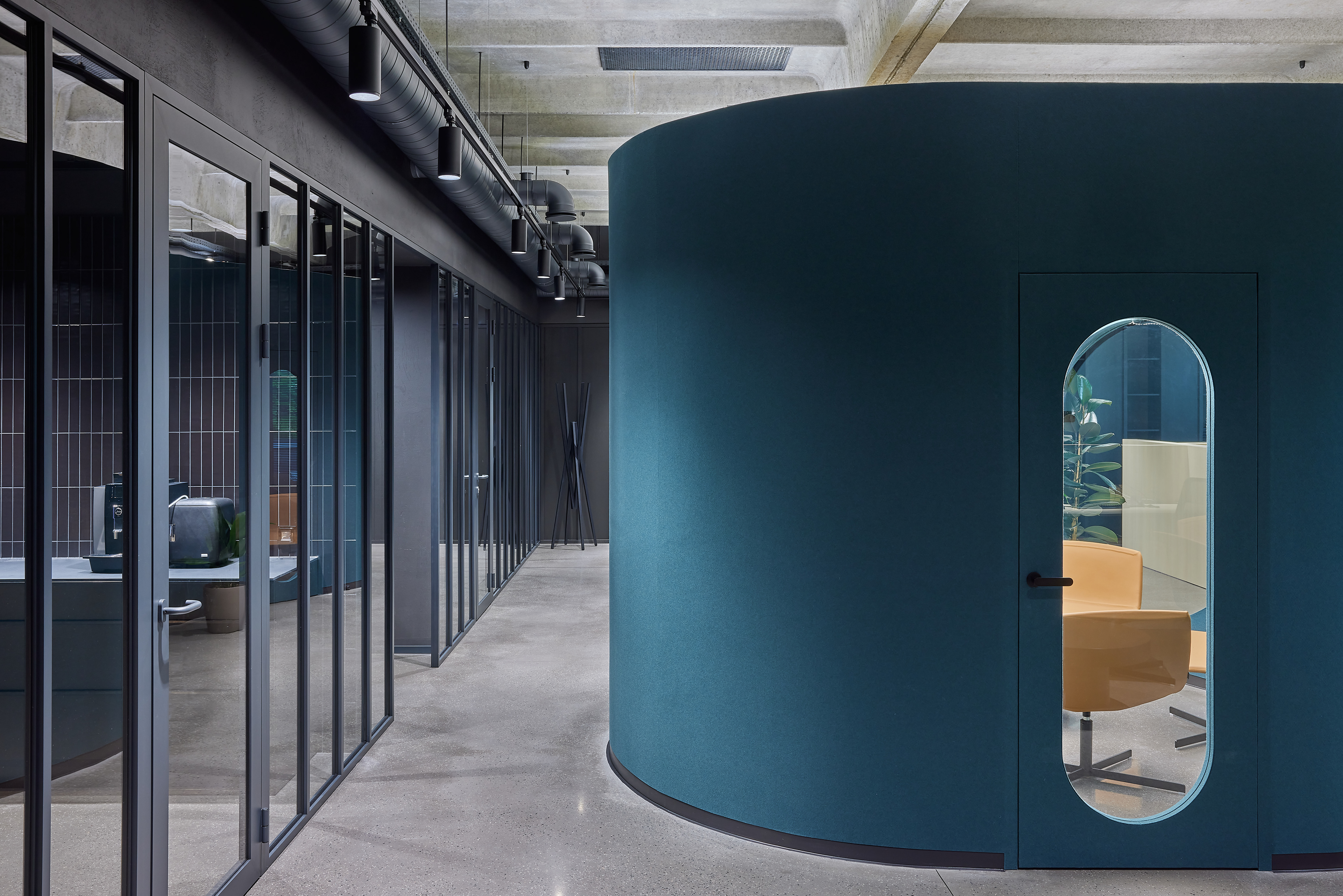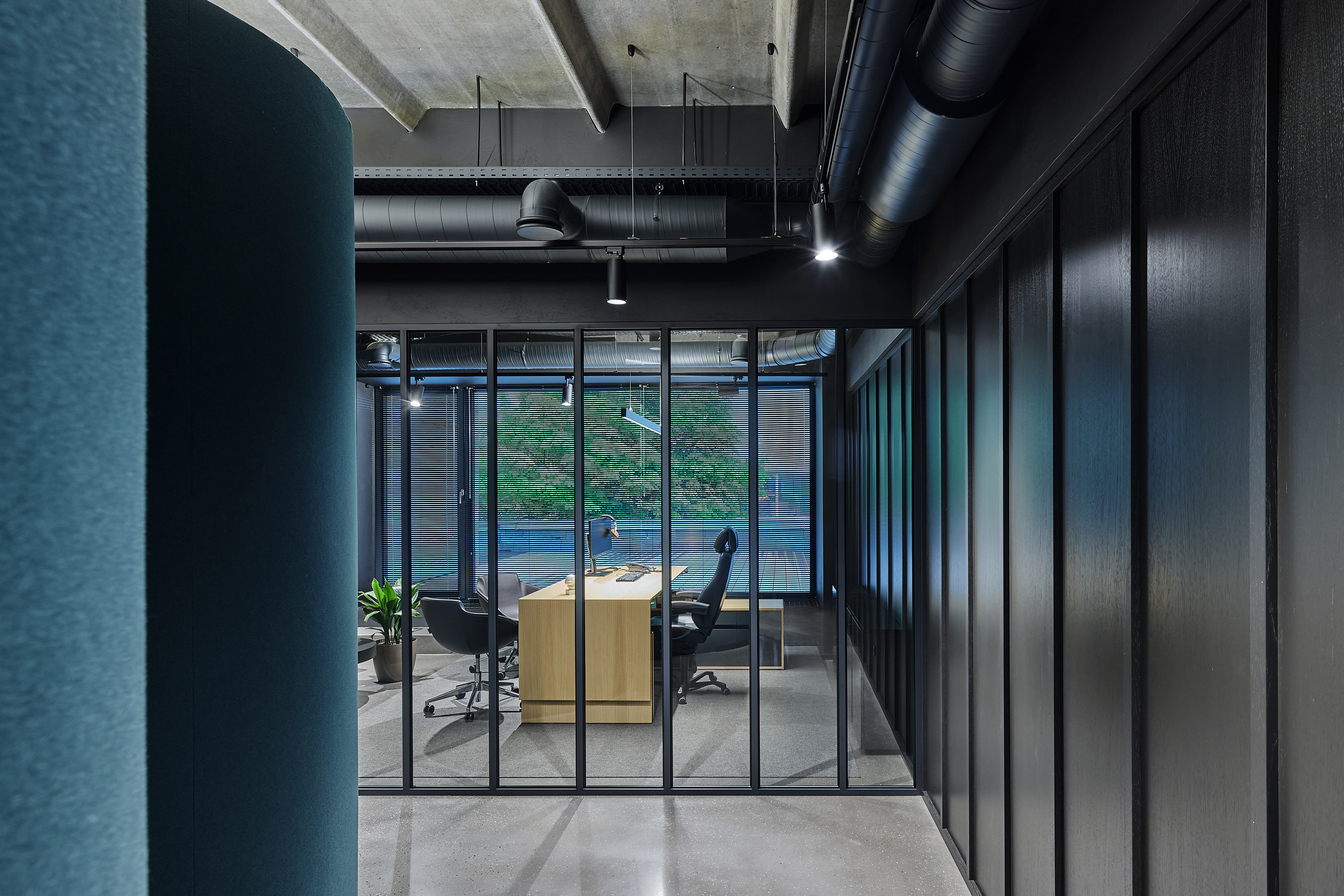 This compact office was designed in the SKUBA headquarters building, in an industrial part of Vilnius. The existing plan determined that the working spaces would be placed along the perimeter – near the windows, creating a meeting space in the center. Here was placed a blob-shaped volume – the core of the office. It accommodates meeting rooms and works as the main accent and space shaping element. The sleek lines of it complement and soften the rigid concrete construction and glass partition grid. Moving around this central volume is organic – there are no sharp turns, no long corridors. The felt finishing of its walls also soften the character of the office and works as an acoustic element. The meeting rooms inside it seem to be right out of a science fiction movie – no right angles, evenly illuminated ceiling, round windows. Darker color palette for interior required some brighter accents to avoid everything blending into one mass. Lighting plays an important role in every interior, but especially in a dark one. Track lighting with spotlights was chosen for the general lighting. Workplace lights have a narrower angle than usual – the light only hits the worktop. The workplace lights and the top of the central volume emit upward light highlighting the concrete ceiling structure. The light is dimmed in the work space, concentrated only in the functional areas. Meanwhile, the meeting rooms are very well lit by the illuminated ceiling.