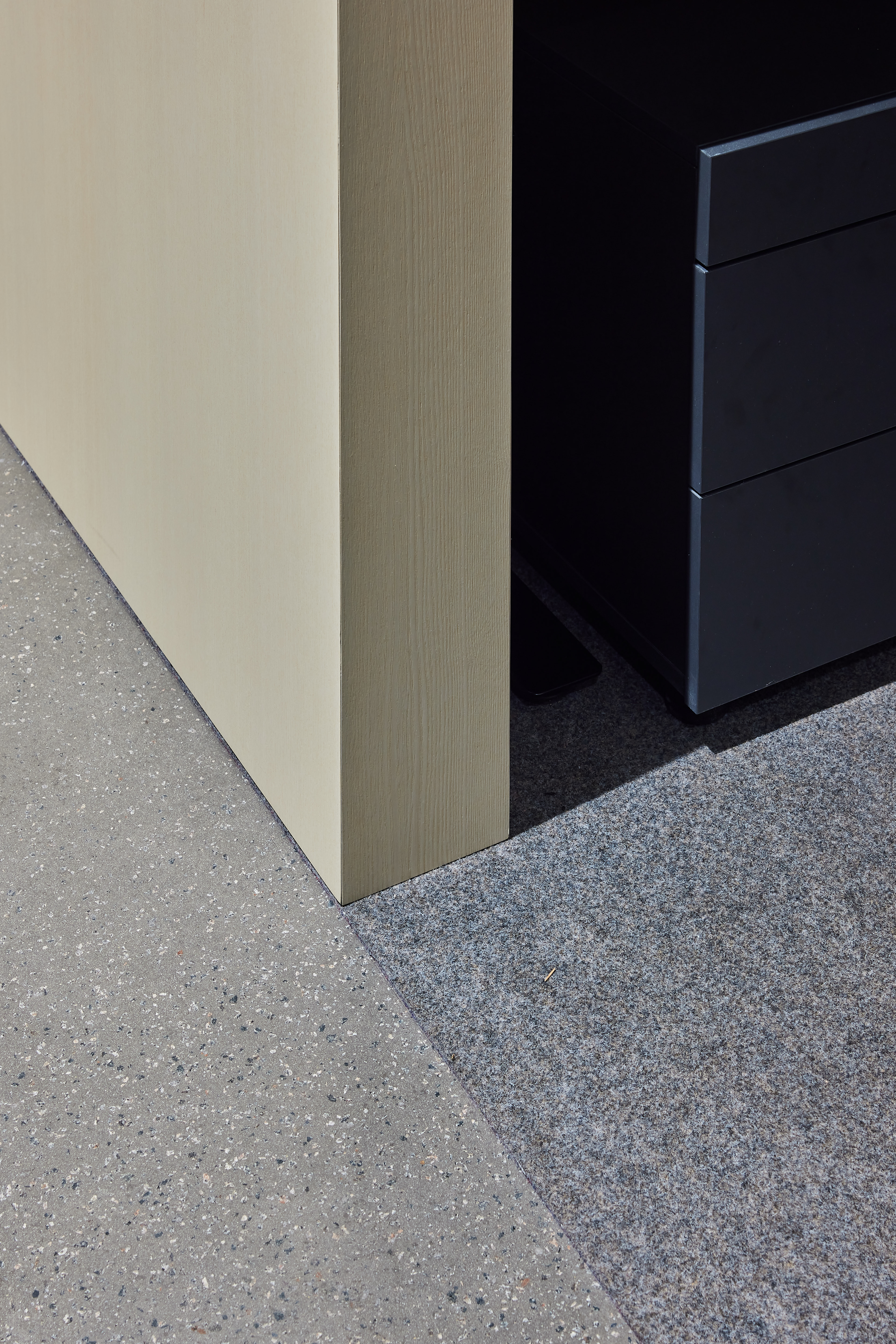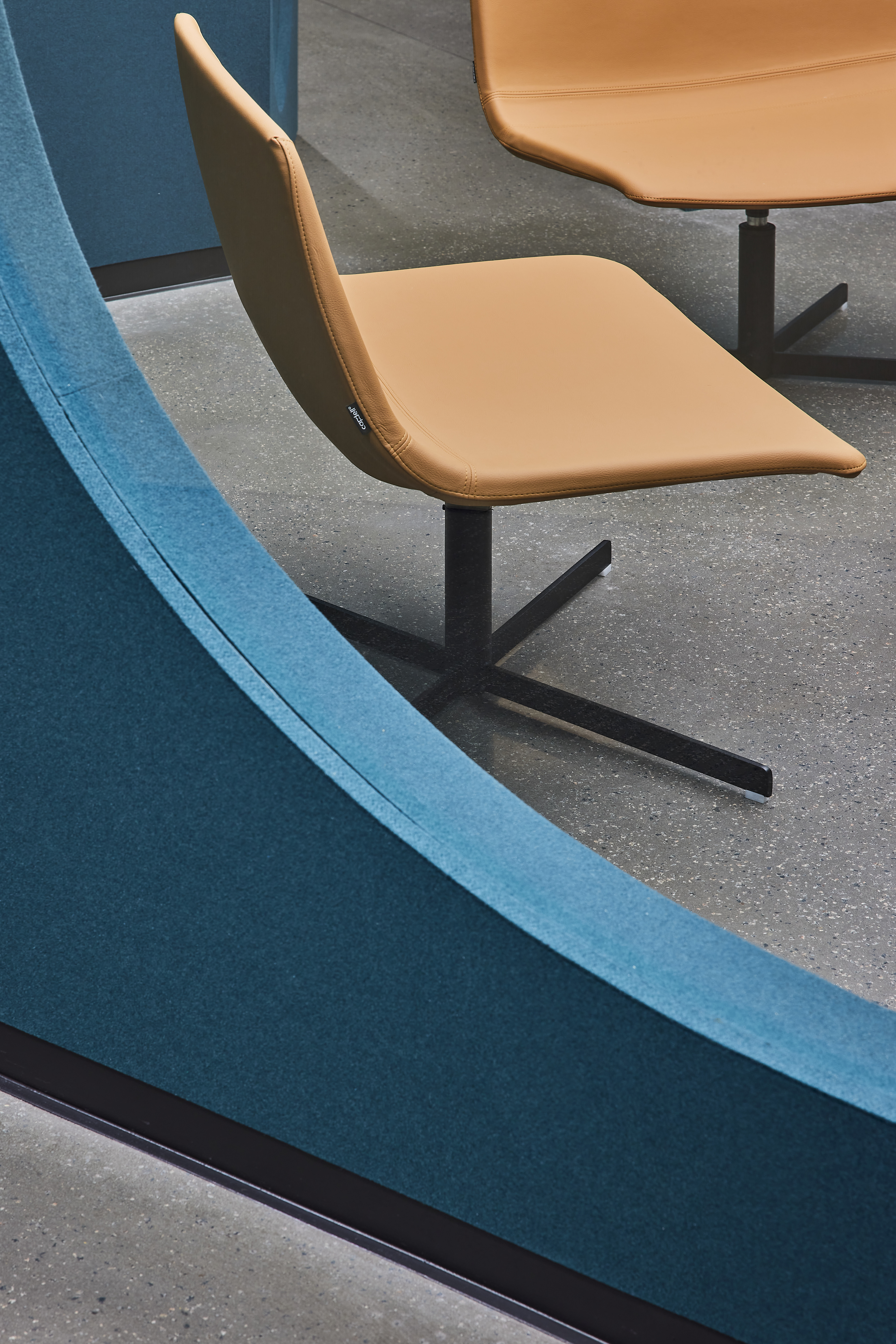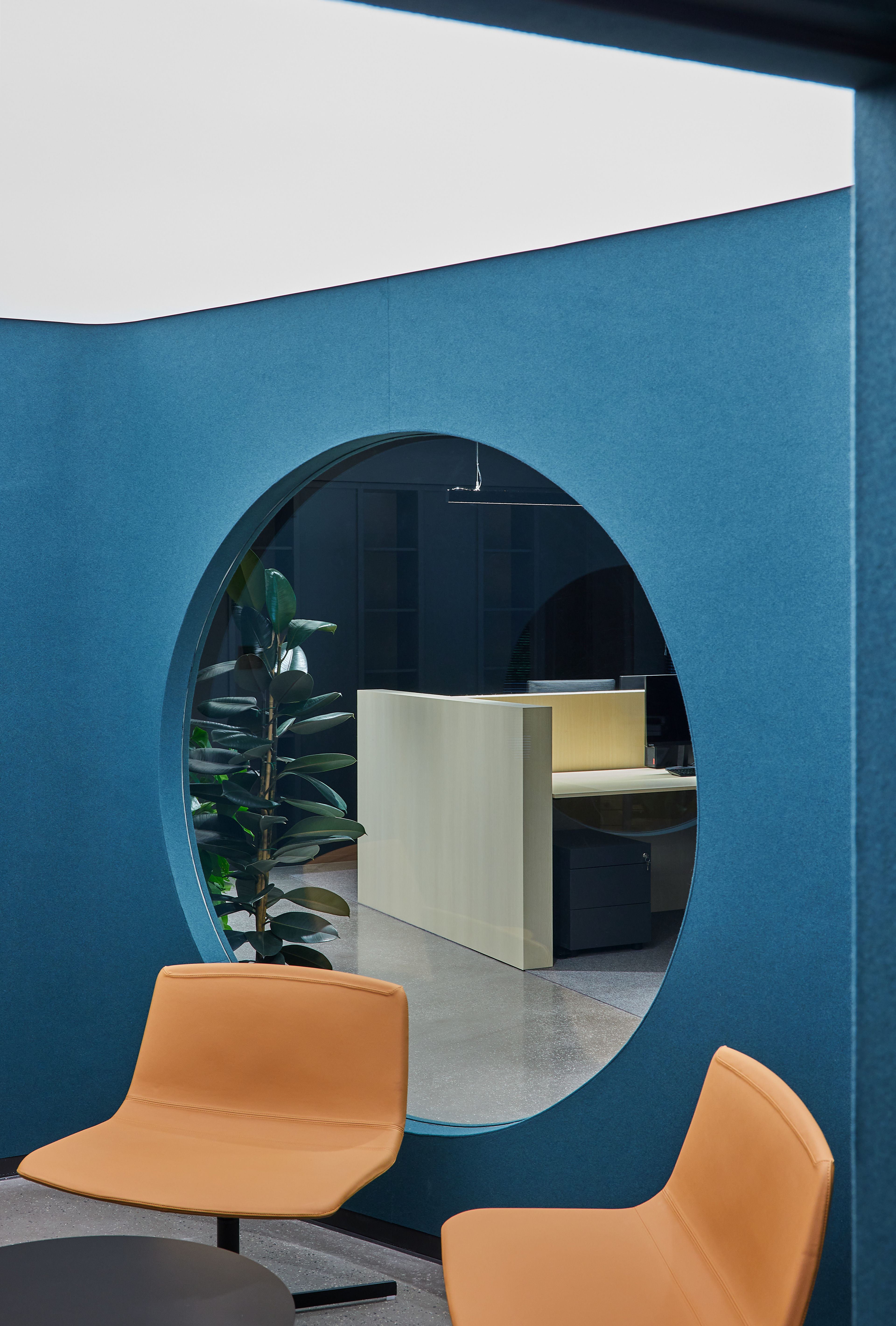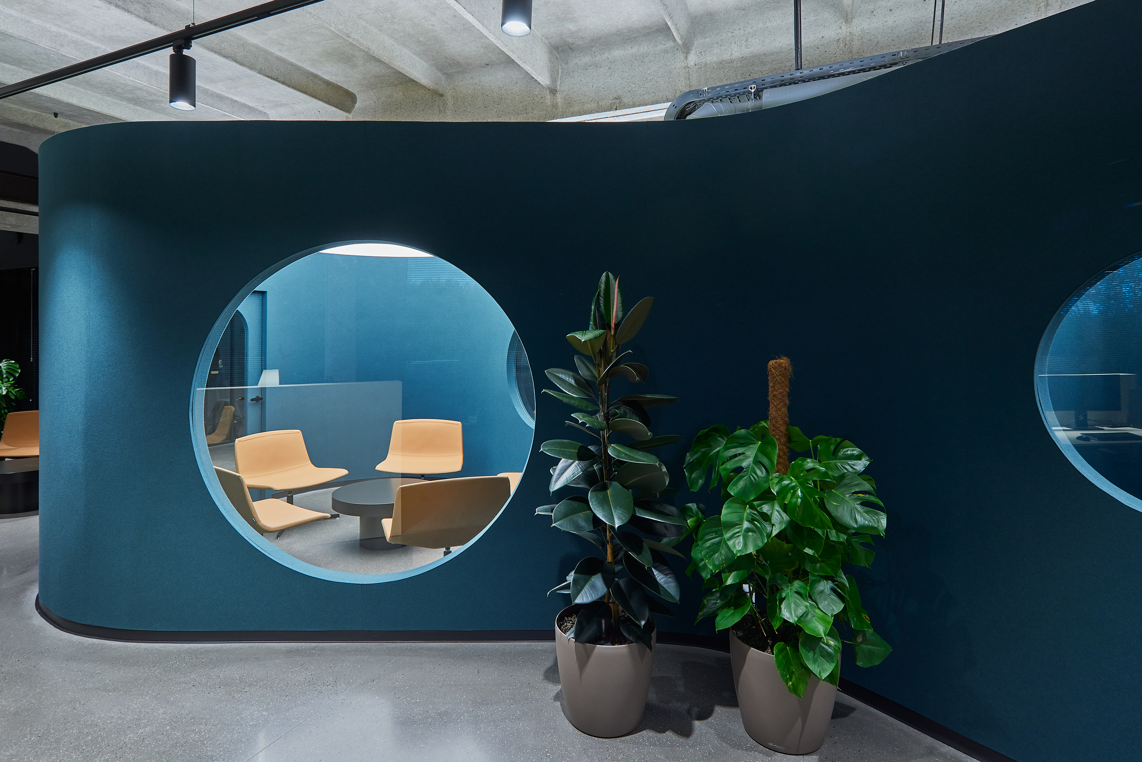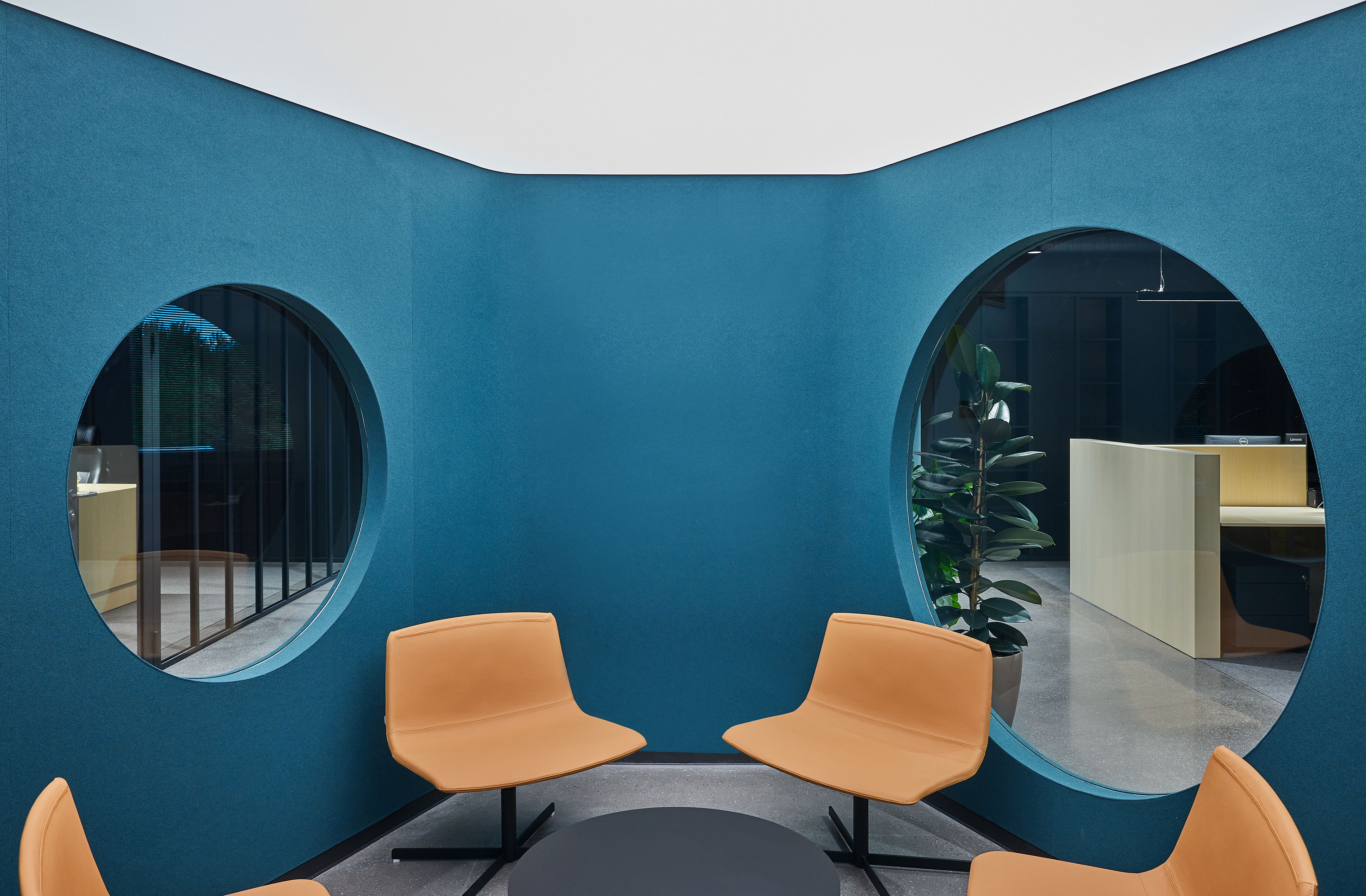 This compact office was designed in the SKUBA headquarters building, in an industrial part of Vilnius. The existing plan determined that the working spaces would be placed along the perimeter – near the windows, creating a meeting space in the center. Here was placed a blob-shaped volume – the core of the office. It accommodates meeting rooms and works as the main accent and space shaping element. The sleek lines of it complement and soften the rigid concrete construction and glass partition grid. Moving around this central volume is organic – there are no sharp turns, no long corridors. The felt finishing of its walls also soften the character of the office and works as an acoustic element. The meeting rooms inside it seem to be right out of a science fiction movie – no right angles, evenly illuminated ceiling, round windows. Darker color palette for interior required some brighter accents to avoid everything blending into one mass. Lighting plays an important role in every interior, but especially in a dark one. Track lighting with spotlights was chosen for the general lighting. Workplace lights have a narrower angle than usual – the light only hits the worktop. The workplace lights and the top of the central volume emit upward light highlighting the concrete ceiling structure. The light is dimmed in the work space, concentrated only in the functional areas. Meanwhile, the meeting rooms are very well lit by the illuminated ceiling.